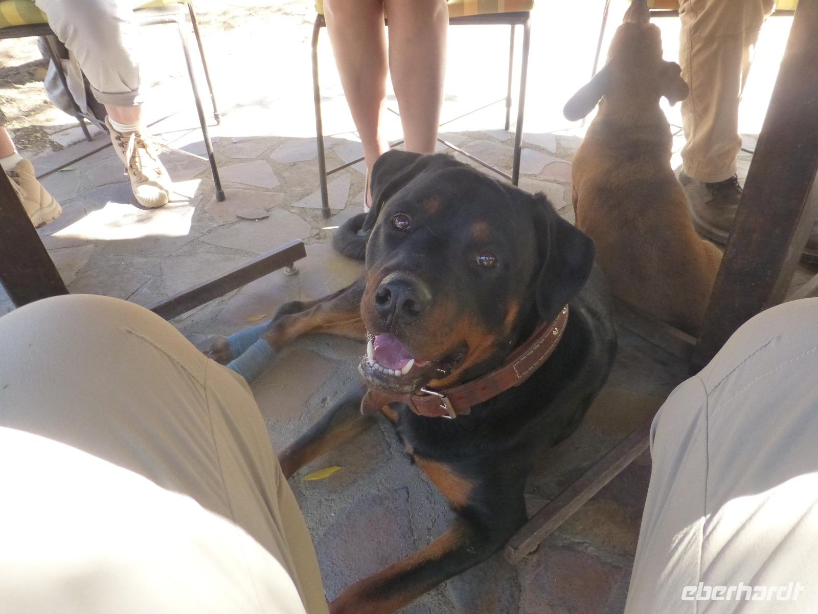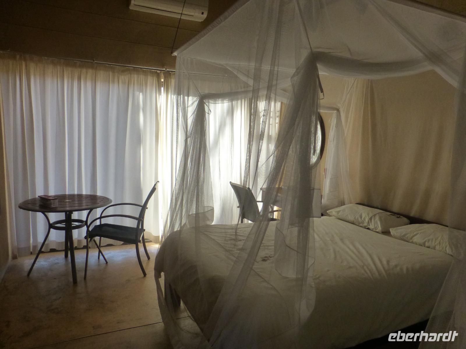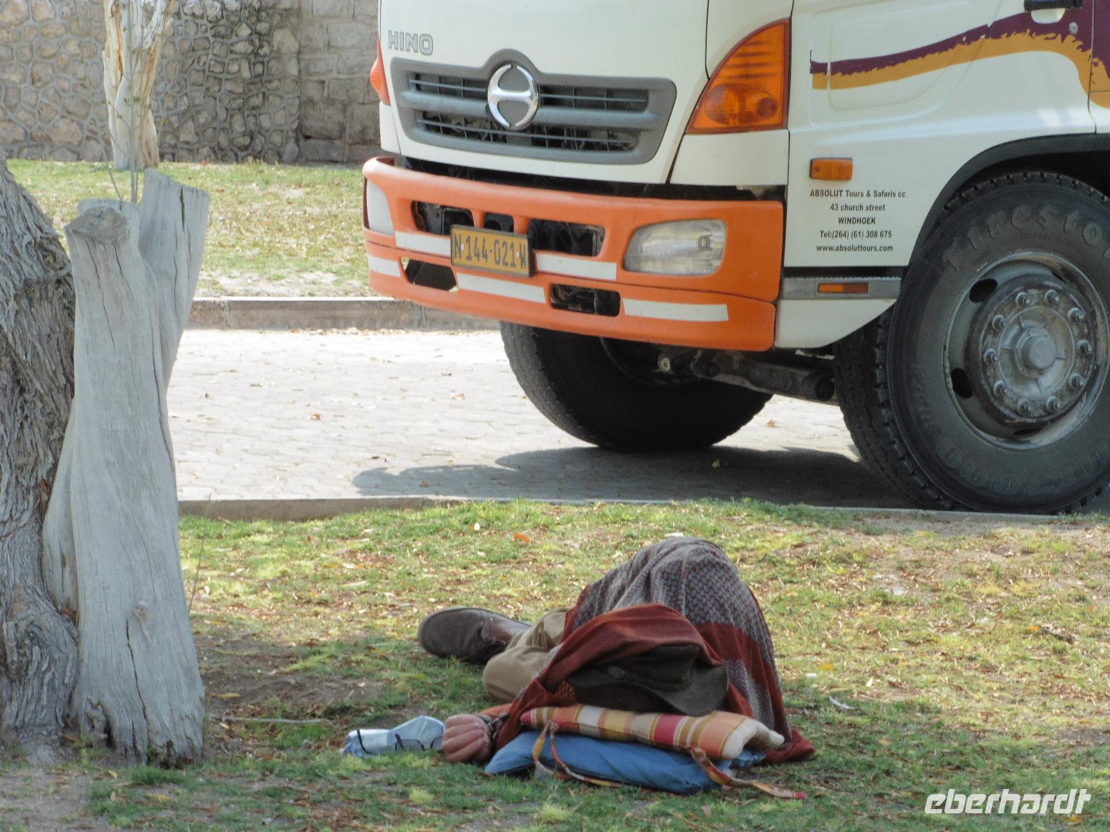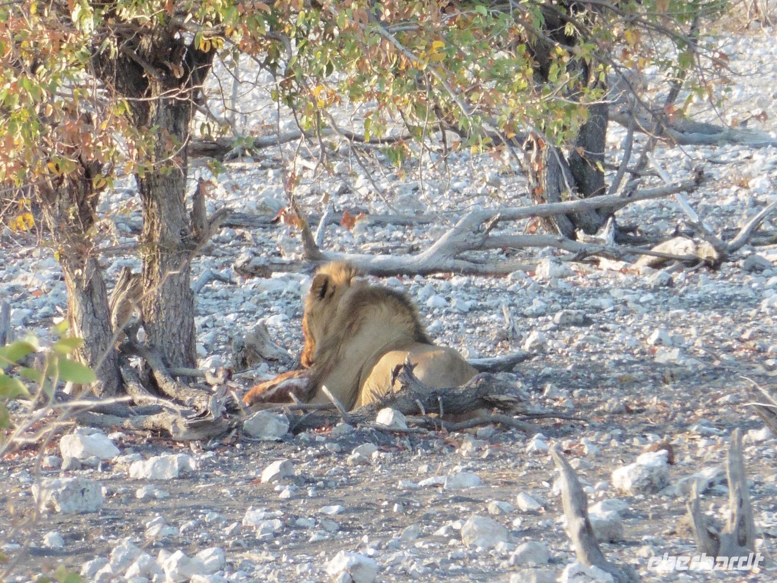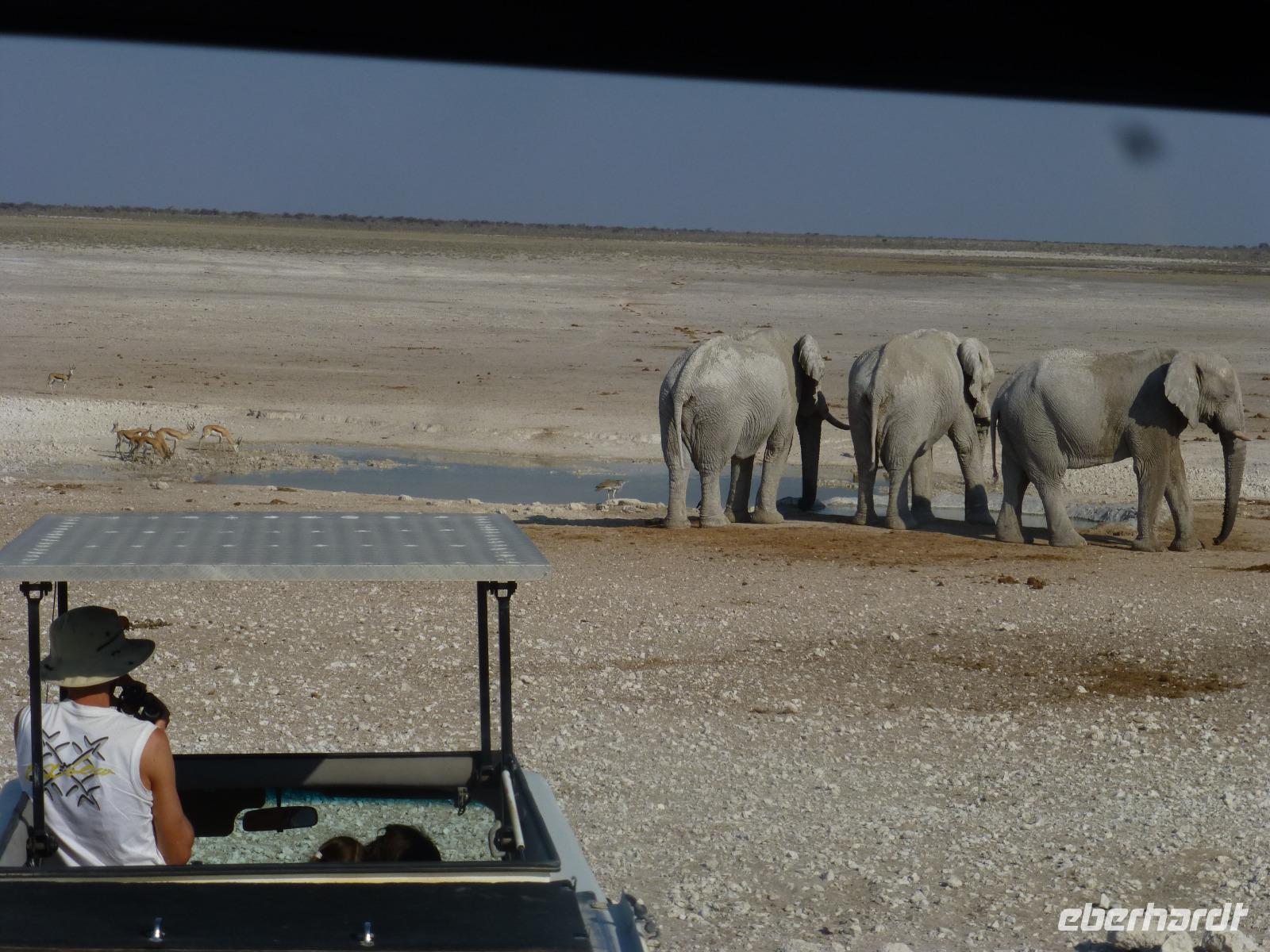 Jetzt haben wir aber Hunger, auf dem Parkplatz Lodge zum Nationalpark Eingang wollten wir picknicken. Der Platz unter einem großen, Schatten spendenden Baum war leider besetzt. Also rauf auf den Campingplatz und schattiges Plätzen suchen. Plötzlich steckte unser Truck im Sand fest. Mit vereinten Kräften schoben wir unser Gefährt aus dem Sandloch. Dann gab es endlich was zu essen. Der selbst gemachte frische Möhrensalat schmeckte bei den heißen Temperaturen besonders gut. Dann fahren wir zurück zu unserem Camp wo sich ein viele erst einmal ein kühles frischgezapftes Bier genießt. Den Nachmittag verbringt jeder nach eigenen Wünschen: das kühle Nass des Pools genießen, schlafen, lesen oder einfach die Stille der Wüste wirken lassen. Am frühen Abend wir wieder gemeinsam gekocht und gegessen. Nachdem die Dunkelheit hereingebrochen ist, erhalten wir von Ernst noch Unterricht in Sternenkunde. Er zeigt uns Milchstraße, Kreuz des Südens, Scorpion und andere Sternenbilder. Traumhaft schön...