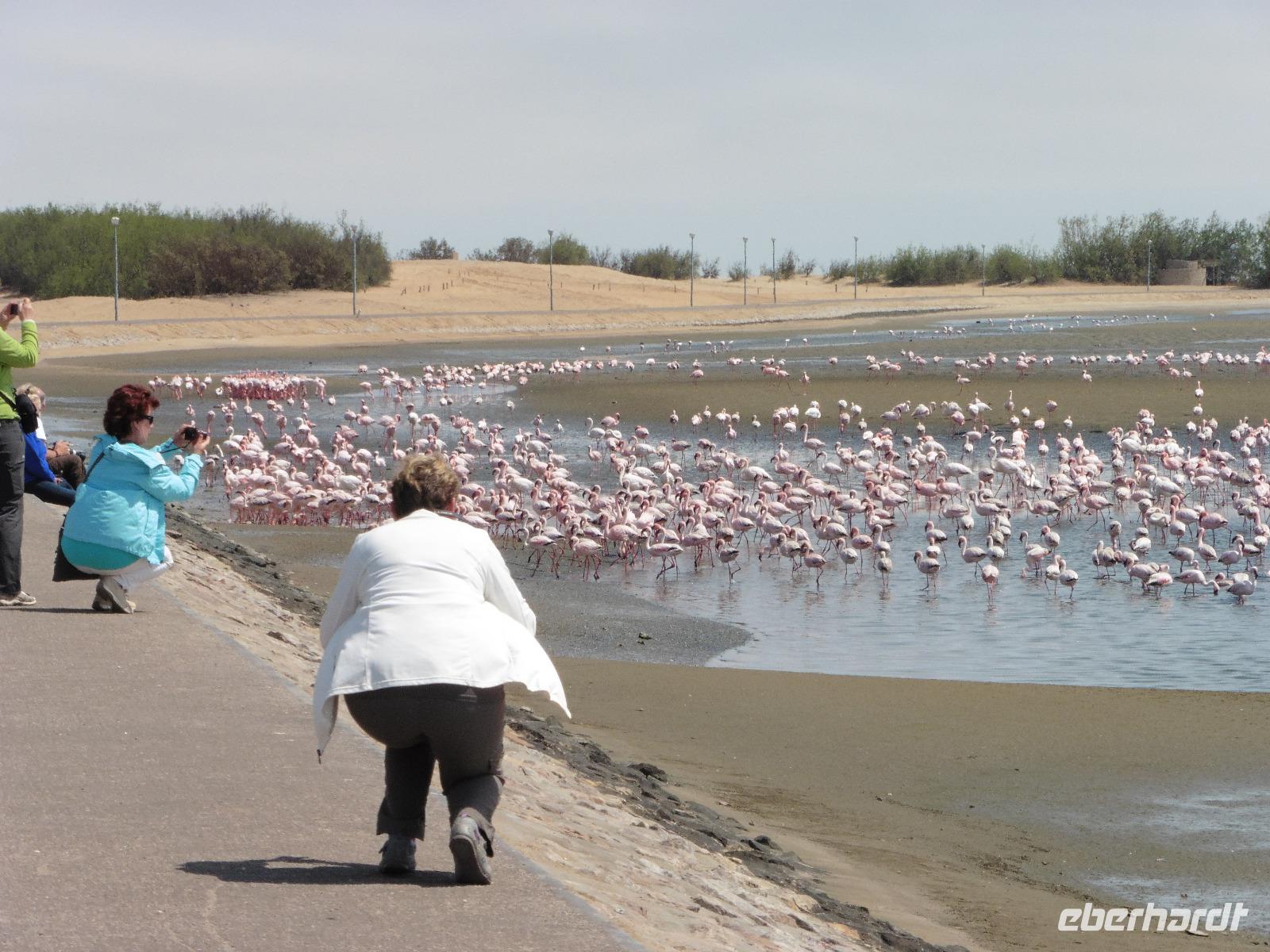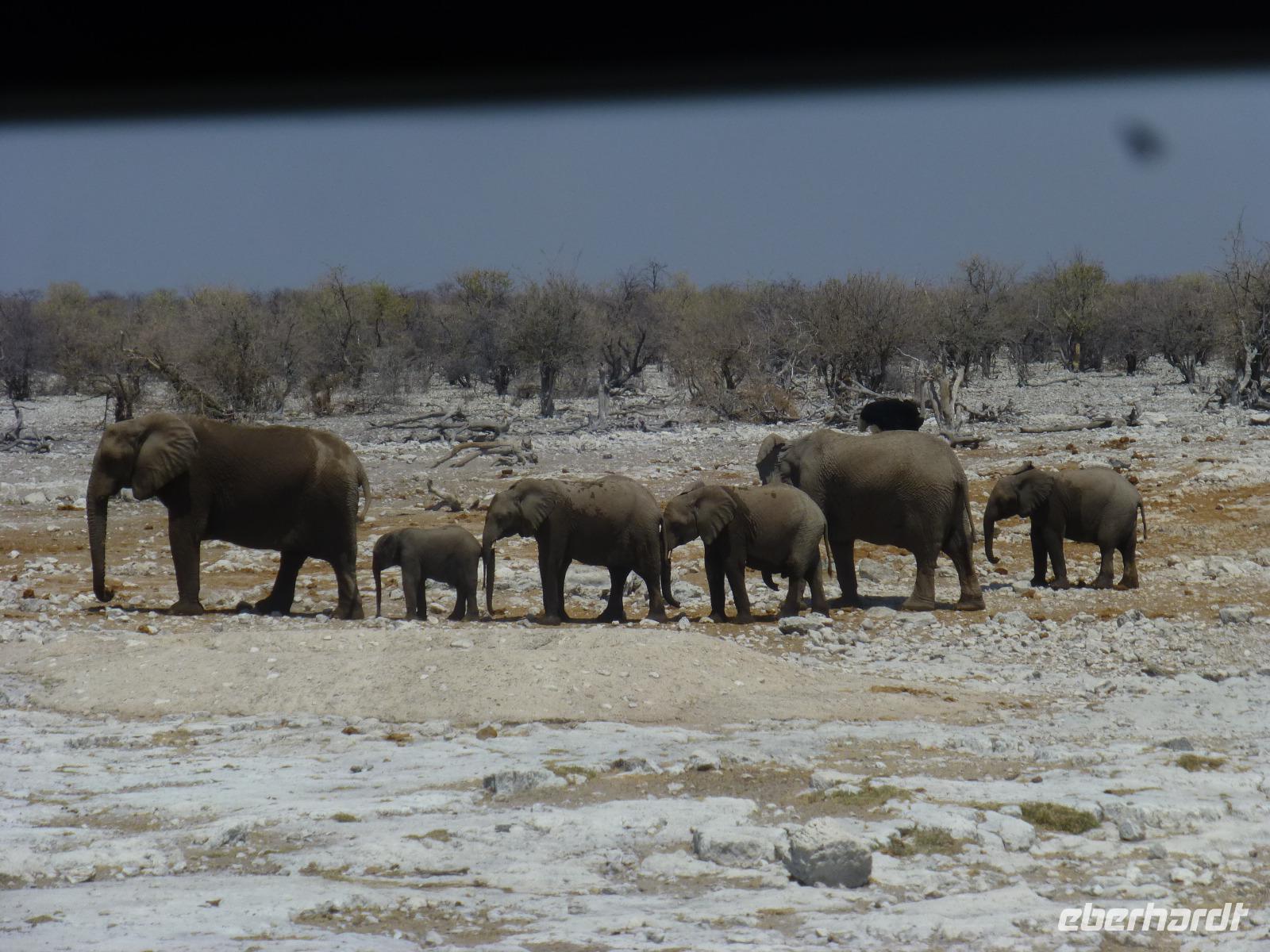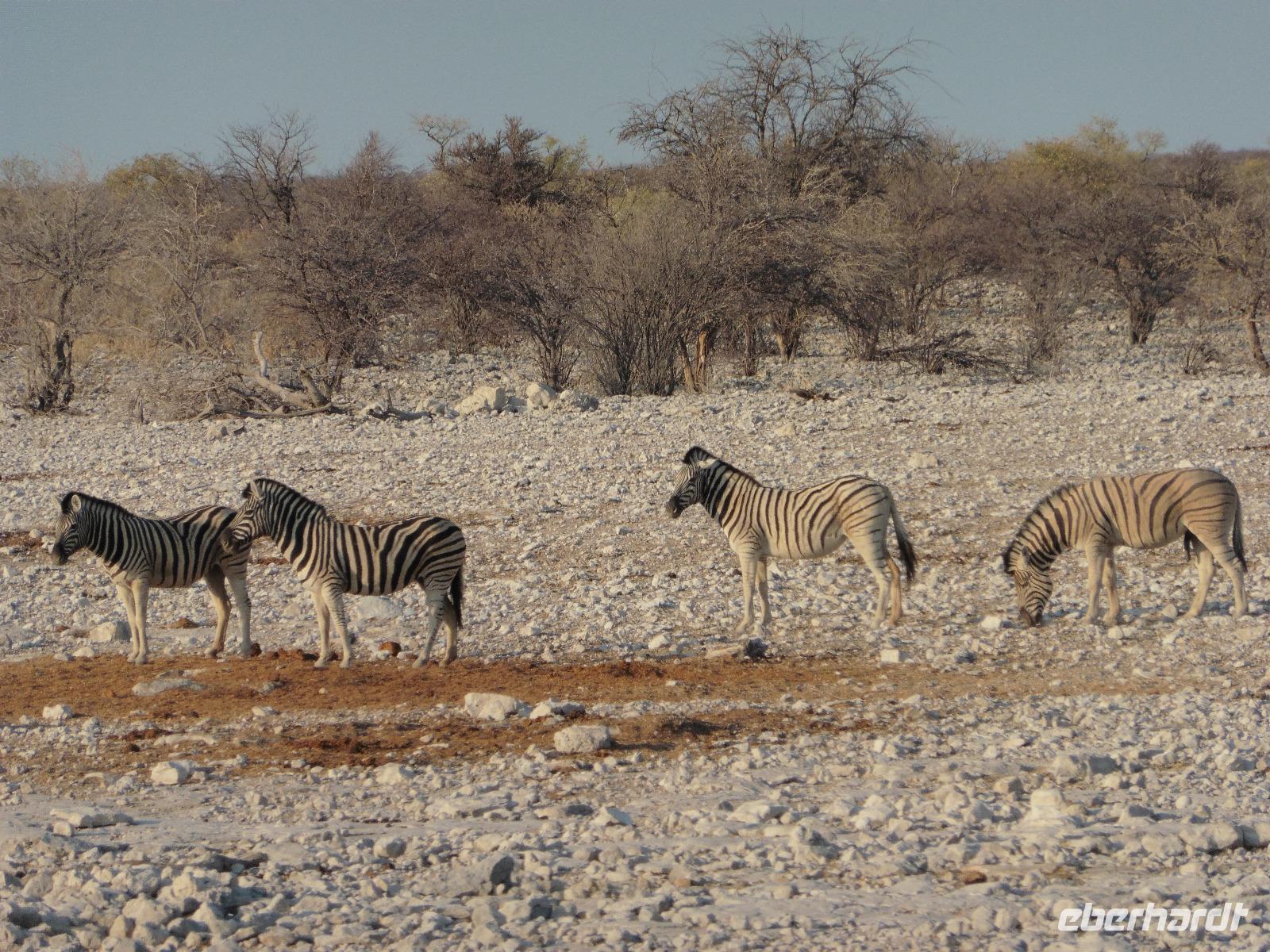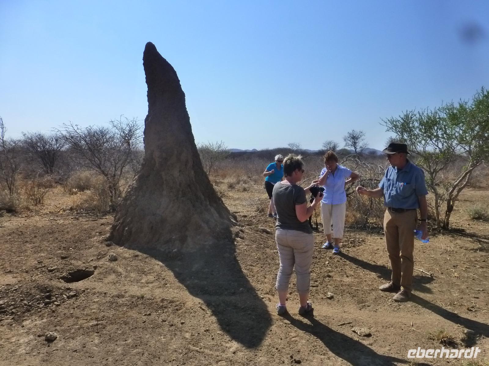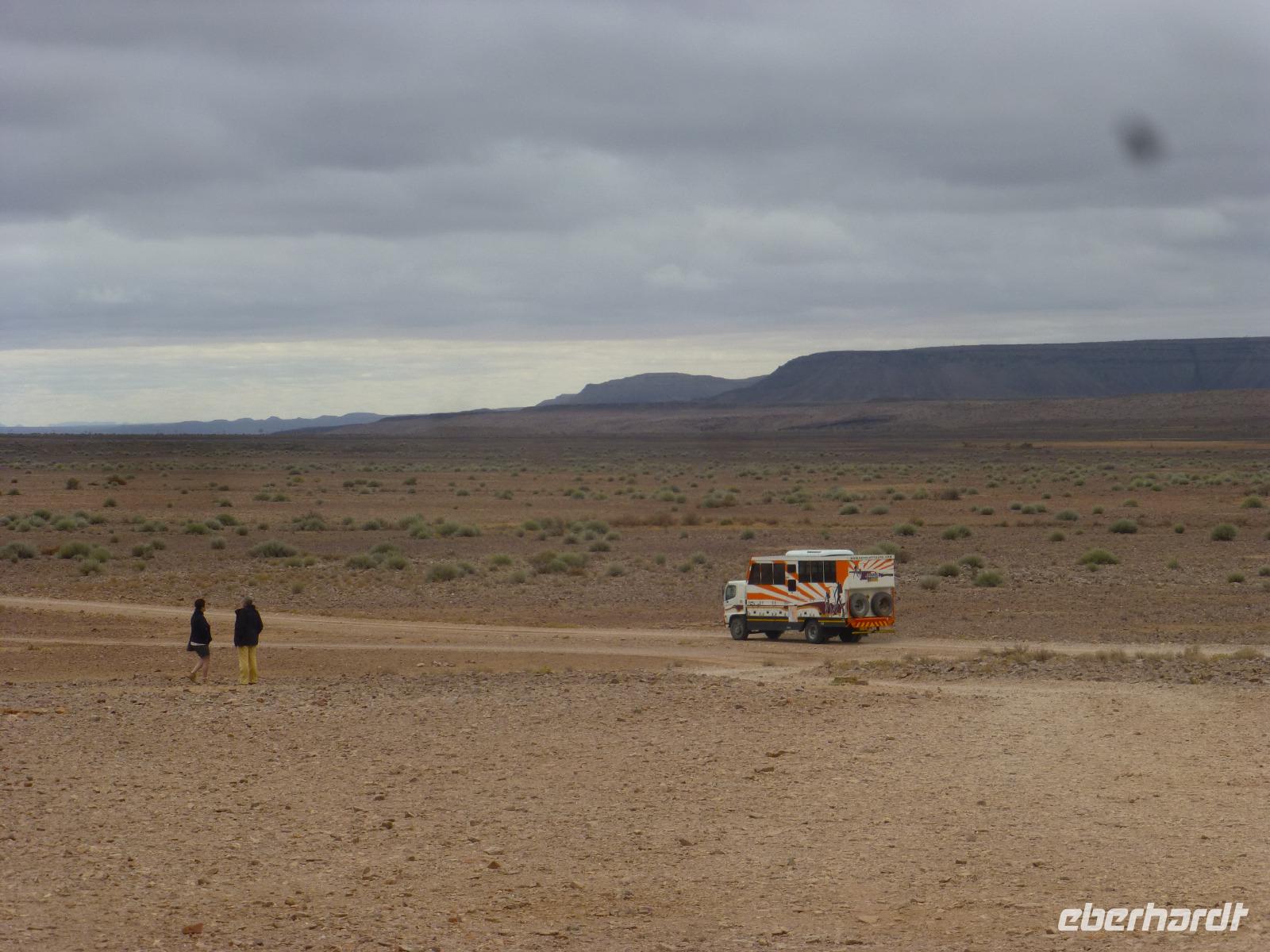 Jetzt haben wir aber Hunger, auf dem Parkplatz Lodge zum Nationalpark Eingang wollten wir picknicken. Der Platz unter einem großen, Schatten spendenden Baum war leider besetzt. Also rauf auf den Campingplatz und schattiges Plätzen suchen. Plötzlich steckte unser Truck im Sand fest. Mit vereinten Kräften schoben wir unser Gefährt aus dem Sandloch. Dann gab es endlich was zu essen. Der selbst gemachte frische Möhrensalat schmeckte bei den heißen Temperaturen besonders gut. Dann fahren wir zurück zu unserem Camp wo sich ein viele erst einmal ein kühles frischgezapftes Bier genießt. Den Nachmittag verbringt jeder nach eigenen Wünschen: das kühle Nass des Pools genießen, schlafen, lesen oder einfach die Stille der Wüste wirken lassen. Am frühen Abend wir wieder gemeinsam gekocht und gegessen. Nachdem die Dunkelheit hereingebrochen ist, erhalten wir von Ernst noch Unterricht in Sternenkunde. Er zeigt uns Milchstraße, Kreuz des Südens, Scorpion und andere Sternenbilder. Traumhaft schön...