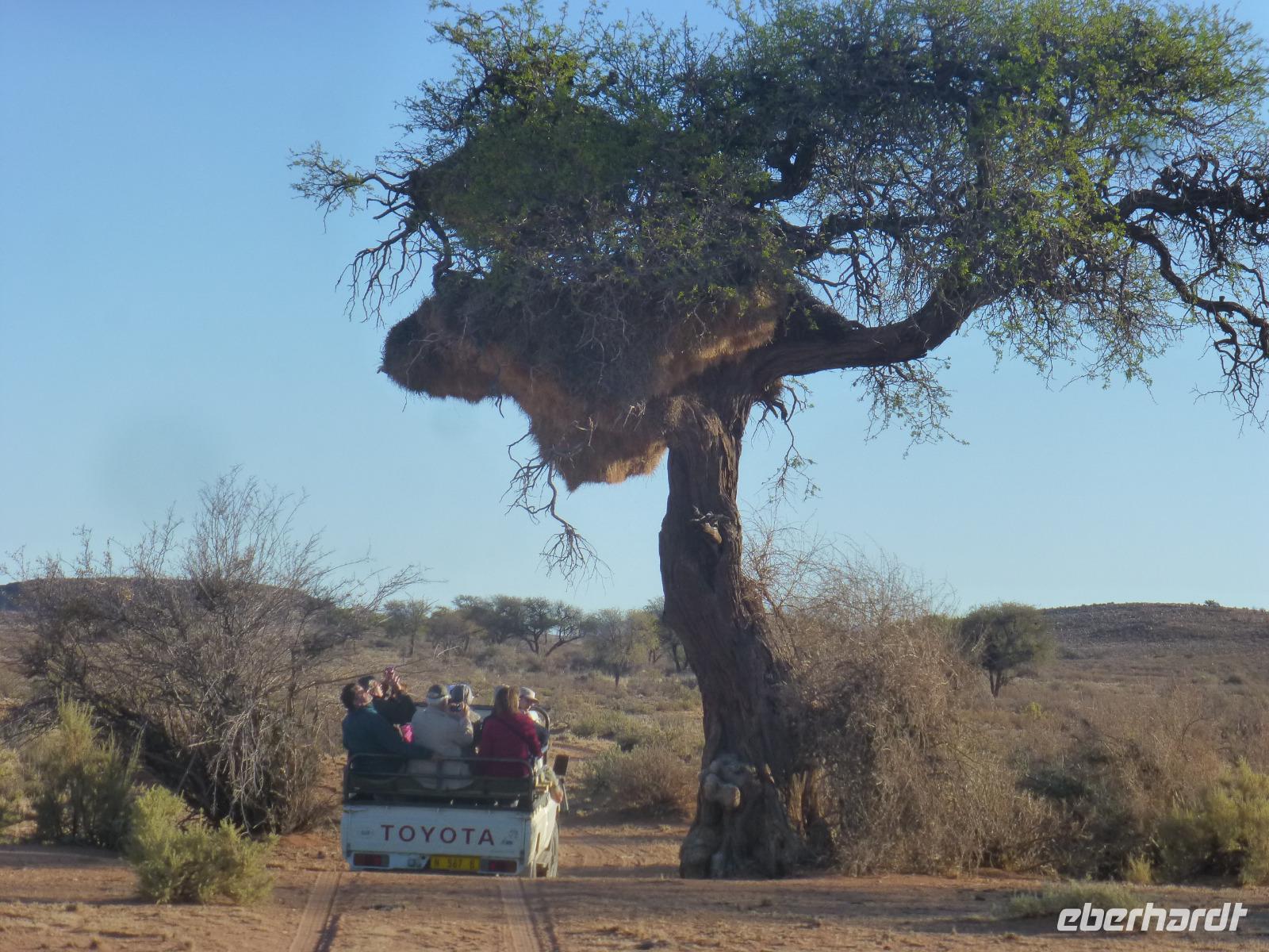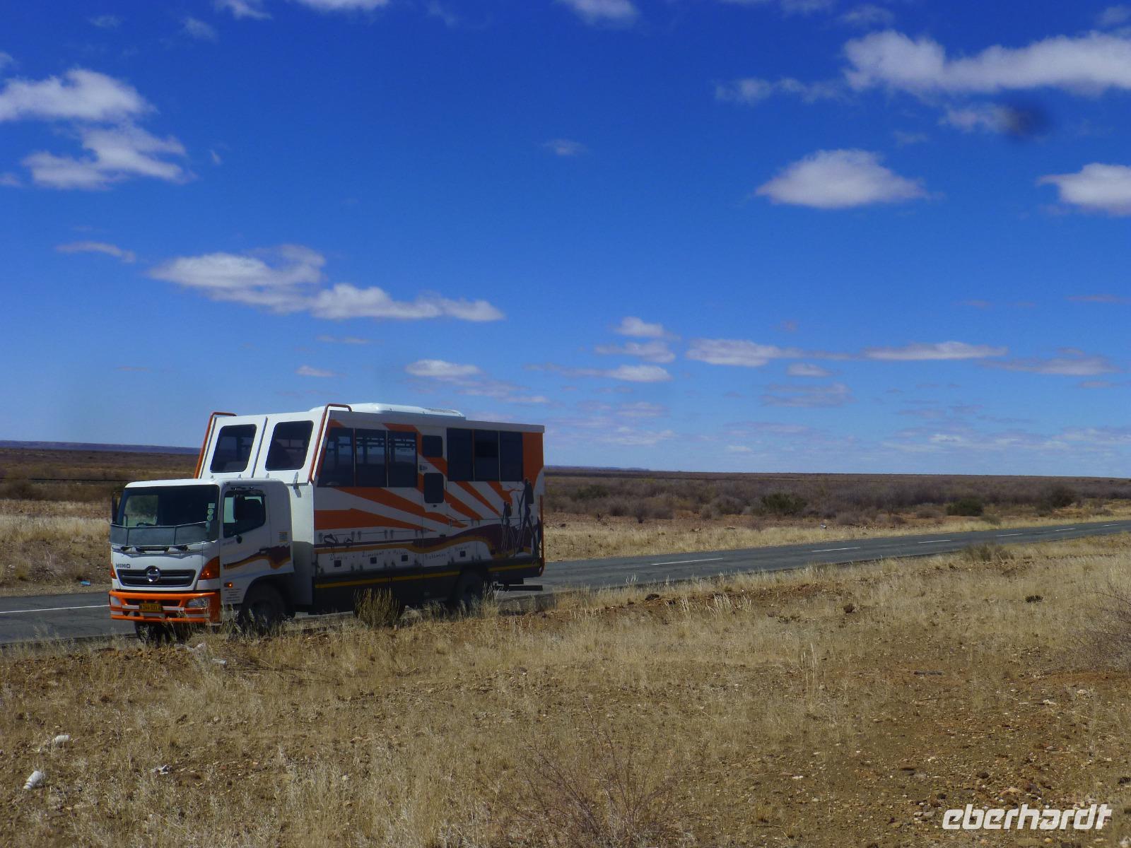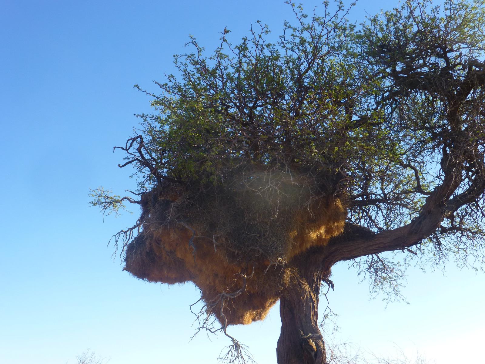 Nach dem Frühstück fuhren wir mit unserem Truck in Richtung Keetmanshoop. Unterwegs bestaunten wir Riesennester der Webervögel und sahen einzelne "Kalahari Ferraris", die durch die Wüste "rasten". Gegen Mittag wurde gemeinsam das erste Picknick zubereitet, direkt am Straßenrand mitten in der Pampe - lecker. Nachdem wir uns gestärkt und alle beim abwaschen & aufräumen geholfen hatten, setzten wir unsere Fahrt fort.