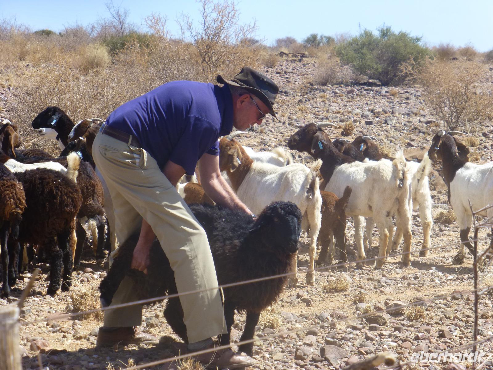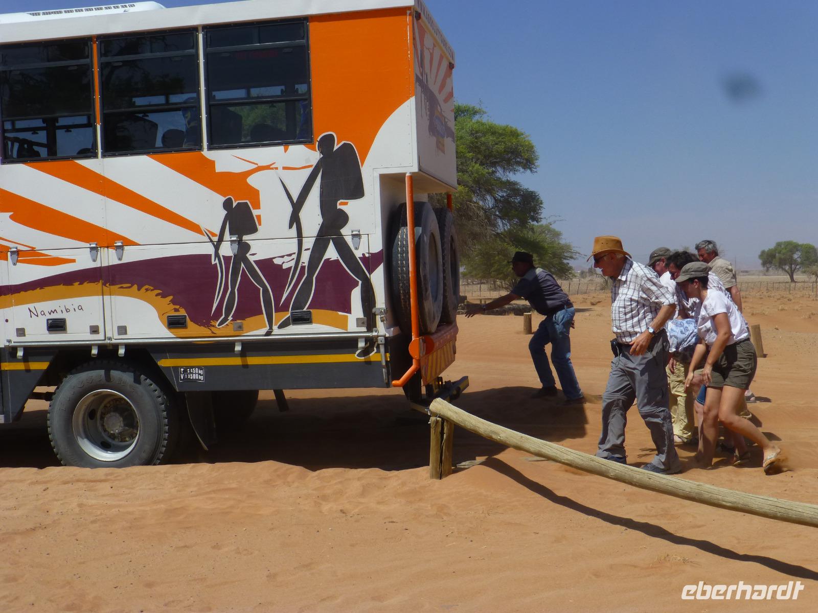 Noch vor dem Frühstück gab es heute einen ausgiebigen Morgenspaziergang zum alten Kalkofen, von denen die Ihren Namen hat. In diesen Öfen wurden früher die Kalksteine für Lüderitz. Der Betreiber der Lodge Frikki und Ernst erzählten uns einiges über das frühere Leben hier. Auch gibt es hier eine Eisenbahnstrecke, einen Zug haben wir allerdings nicht gesehen...es fährt wohl auch keiner mehr. Noch etwas Einzigartiges ist auf der Lodge zu bestaunen - Lithops. Frikki besitzt eine riesige Sammlung der berühmten „Lebenden Steine" - seltene, geschützte Wüstenpflanzen. Nachdem wir bei strahlendem Sonnenschein ausgiebig gefrühstückt hatten truckten wir weiter ins ca. 50 Kilometer entfernte Örtchen Missionarsdörfchen Bethanien. Dort besichtigten wir das Schmelenhaus, dies gehörte einem ehemaligen Pastor der eine NAMA Frau heiratete und den kleinen Missionarsfriedhof. Nach einer Mittagspause im Ortskern von Helmeringhausen (der Ort besteht aus 5 Häusern und einem Gartenrestaurant) erreichten wir am Nachmittag die Gästefarm Dabis und wurden von Farmer Jörg und seiner Familie, zu Kaffee und Zimtschnecken, ganz herzlich begrüßt. Jörg ist namibischer Farmer in der 4. Generation, vor allem Schafe sind seine Leidenschaft. Mit nachhaltigem Farmen gibt er immer wieder Denkanstösse und fördert Projekte, damit auch seine Kinder in seine Fußstapfen treten können. Anschließend starten wir zu einer Rundfahrt auf seiner riesigen Farm. Wir erfahren vieles über effektives, ökologisches nachhaltiges Farmen in dieser trockenen Gegend, über Pflanzen und natürlich über seine Schafe. Unterwegs begegneten uns, neben Schafen, auch Springböcke, Löffelhunde und Webervögel. Zum Abschluss erlebten wir einen fantastischen Sonnenuntergang, bevor wir zum Farmhouse zurück kehrten. Am offenen Grill trafen wir uns dann wieder. Während die Damen mit Wein plauschten, führten die Männer Fachgespräche rund ums Grillen von Lamm und Burenwurst. Im Farmhaus der Familie wurde in der Zwischenzeit der Tisch reichlich gedeckt. Neben den Spezialitäten vom Grill servierte uns Michelle leckere Beilagen wie Kartoffelgratin und Krautauflauf. Übrigens alles, was wir essen, kommt von der Farm. Sei es das Fleisch von den Tieren, Früchte und Gemüse aus dem Garten oder selbstgebackenes Brot. Nach diesem leckeren Essen gehen wir zu Bett und sind neugierig auf den nächsten Tag.
