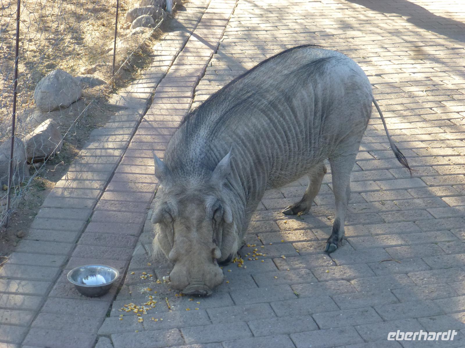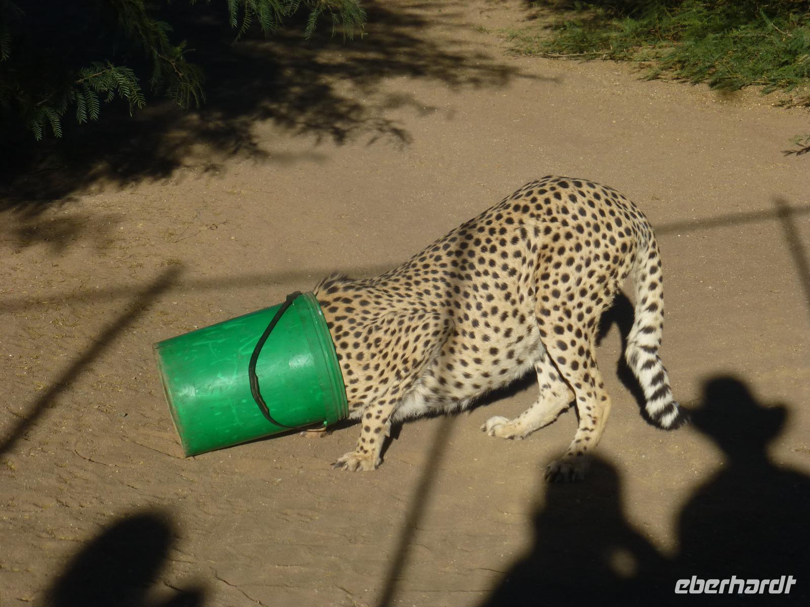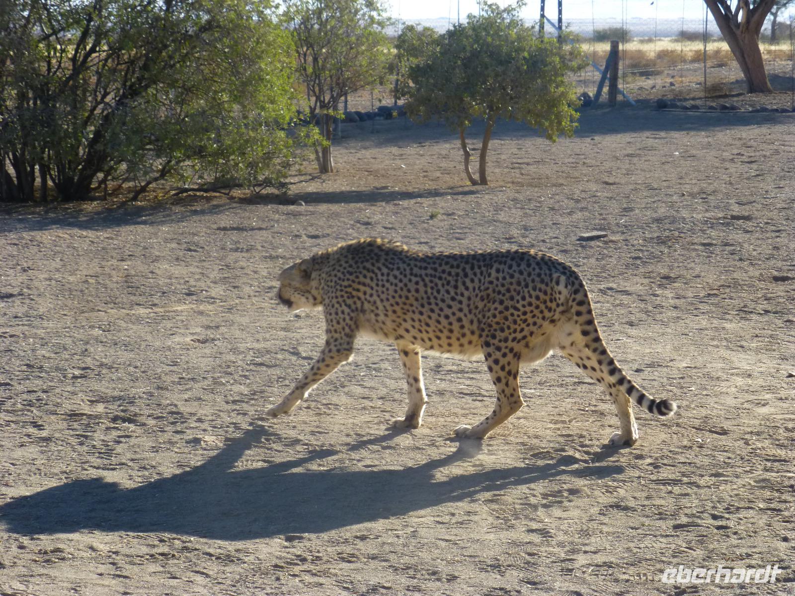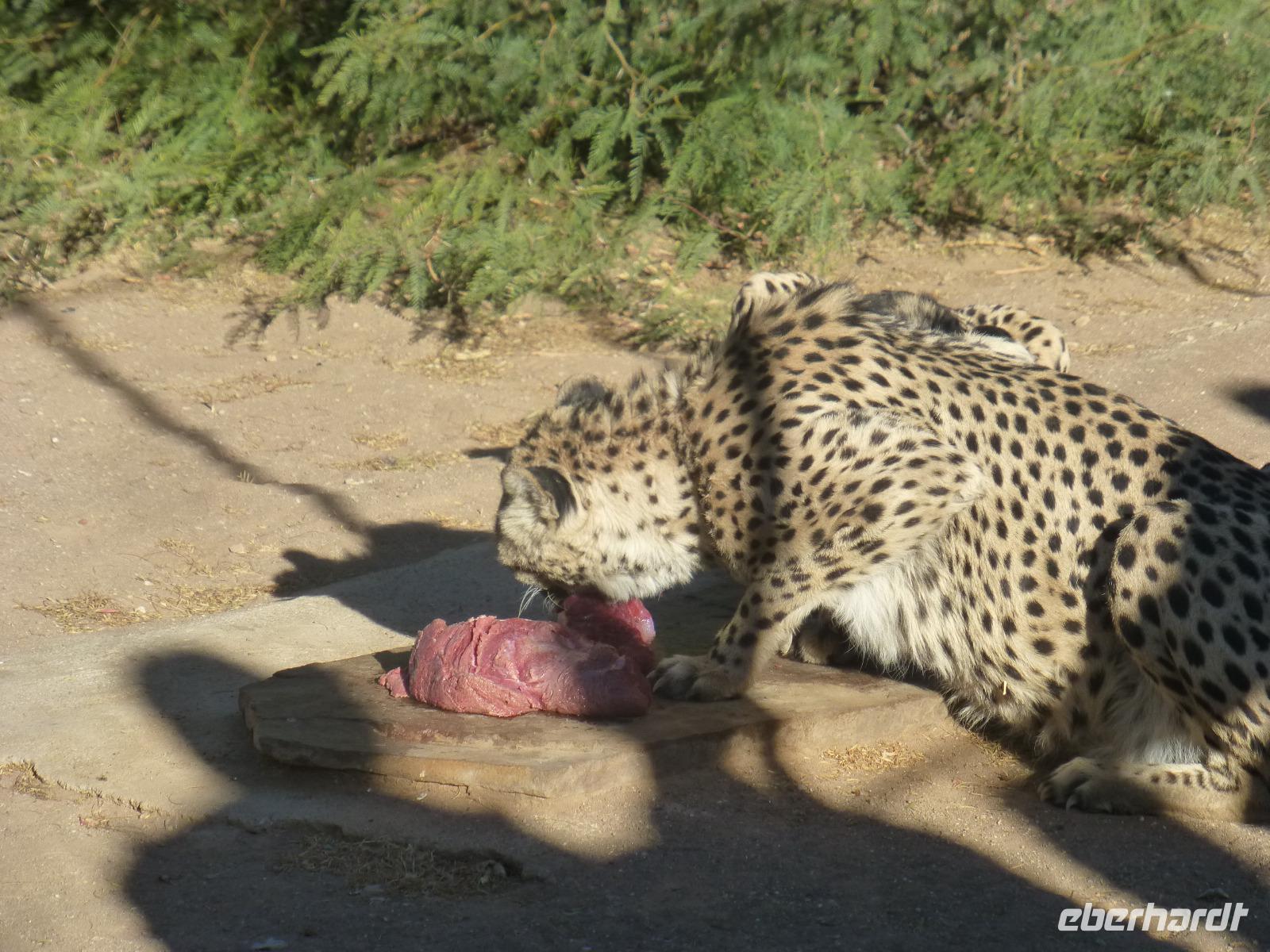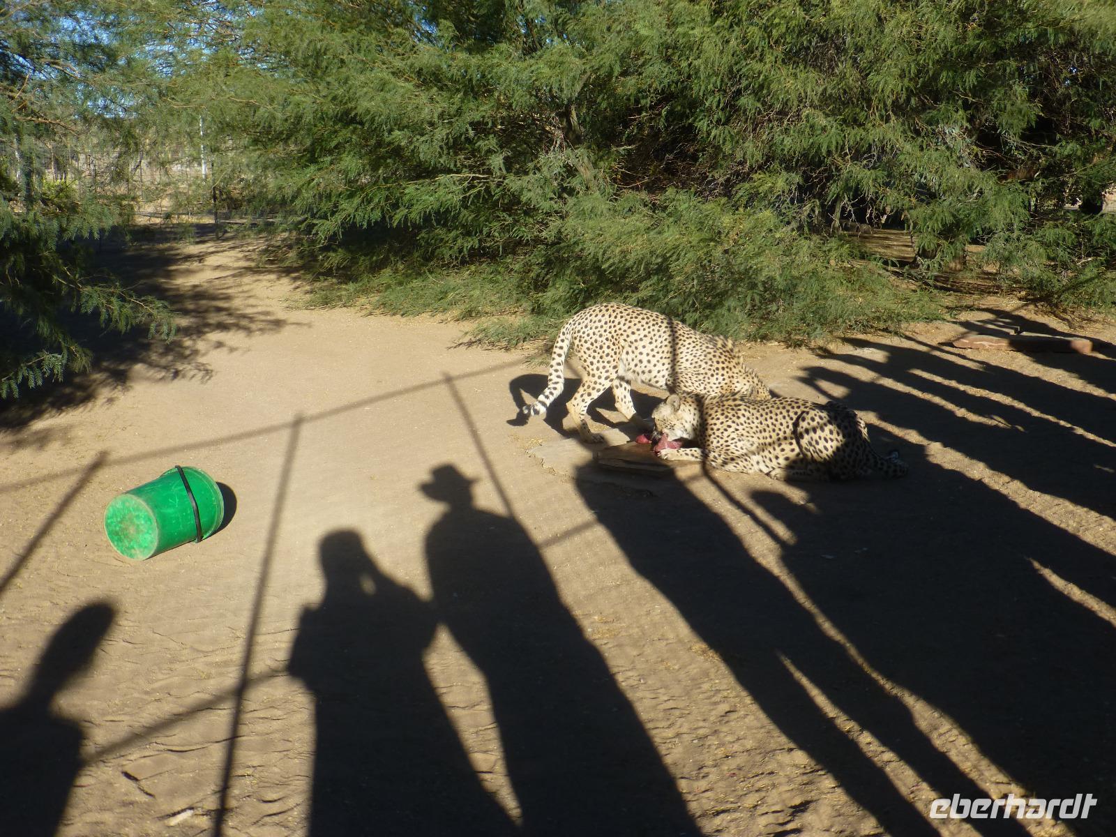 Danach hält Ernst noch eine kleine Überraschung für uns bereit: er kennt ein privates Farmgeländes in dem Geparden leben. Wir haben Glück und können den Katzen beim fressen zusehen.