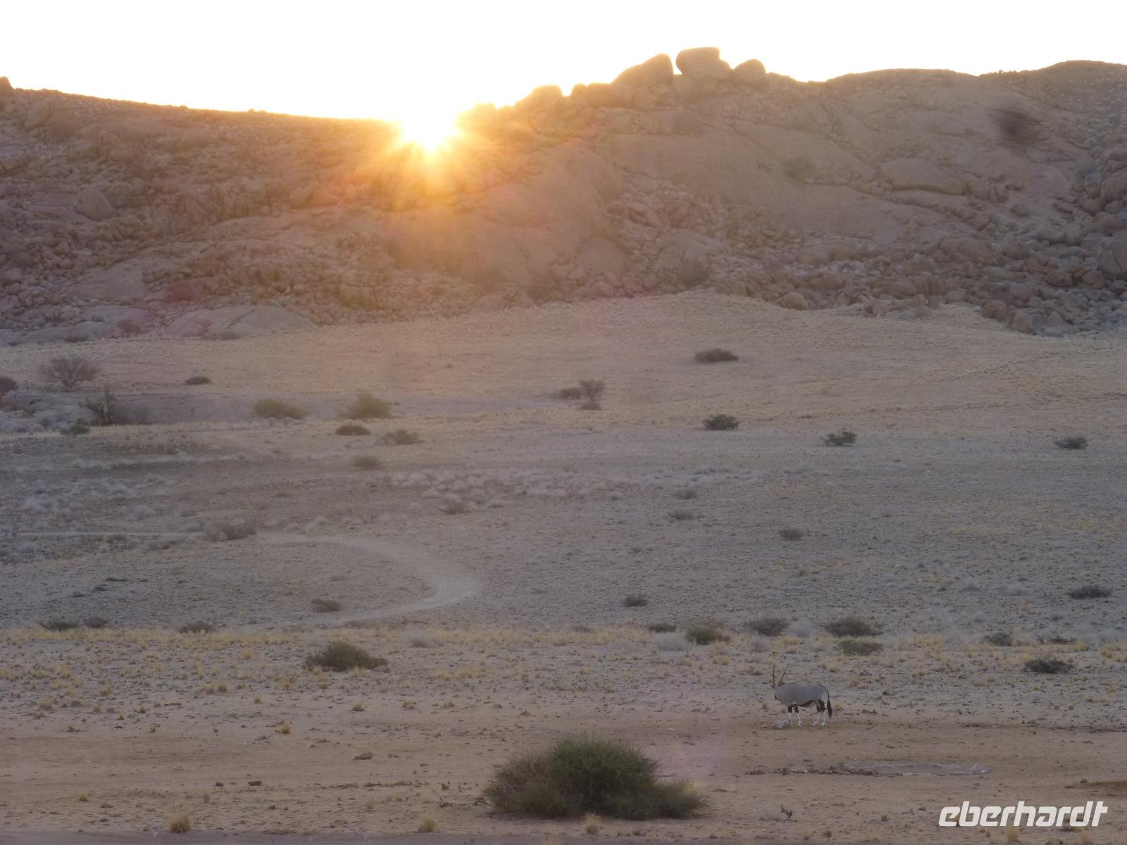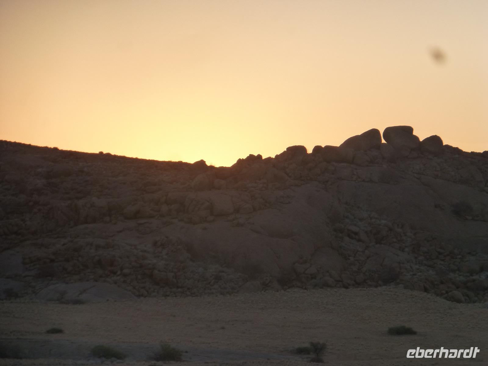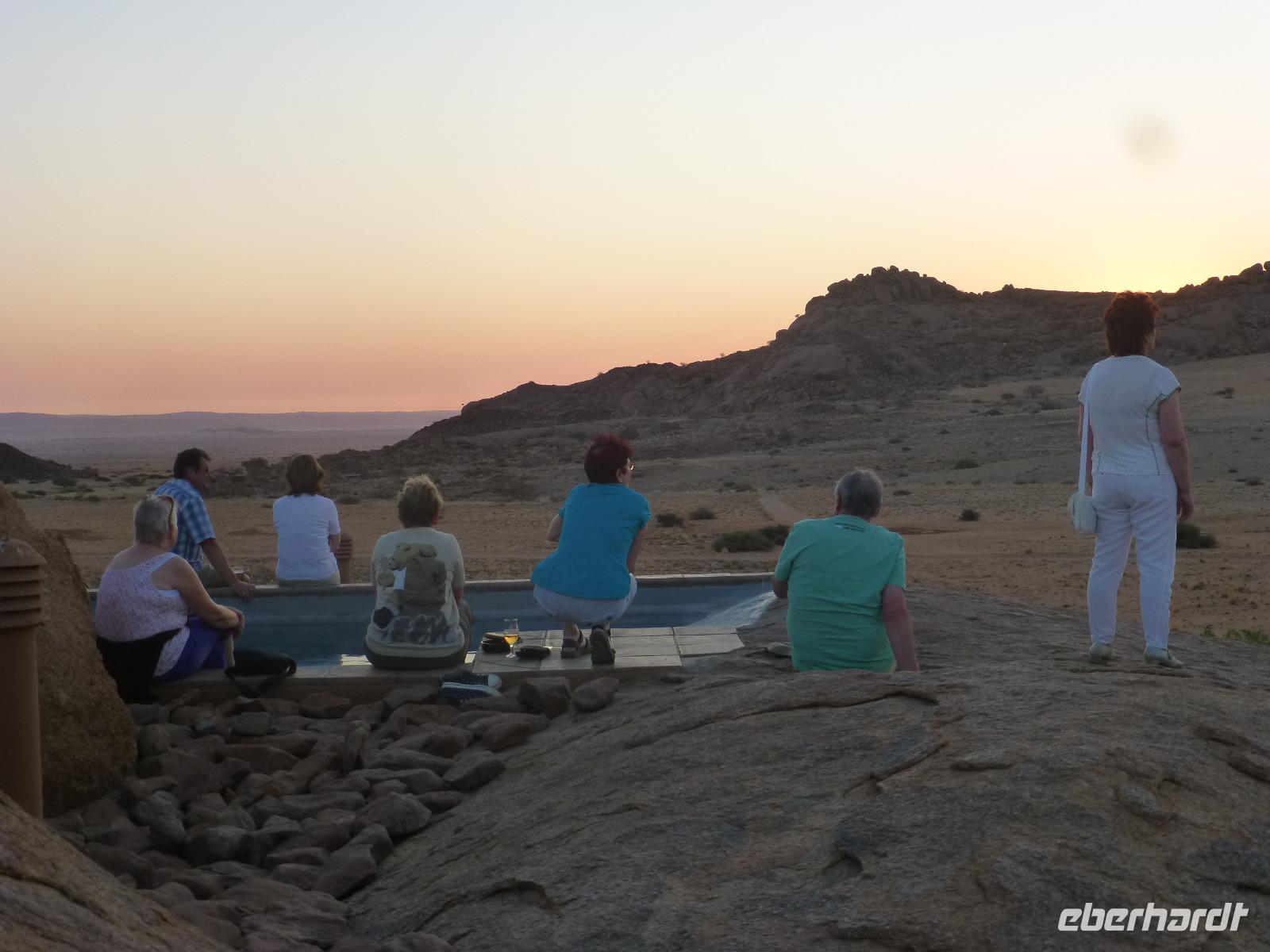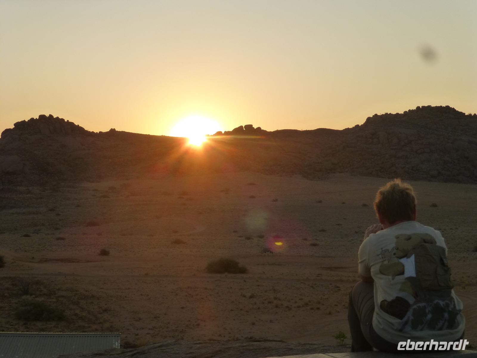 Noch völlig in Gedanken an Jörg, seine Familie und seine Farm starten wir in Richtung Naukluft Gebirge. Am Nachmittag erwartet uns in einsamer bergigen Wüstenlandschaft das Namib Naukluft Adventure Camp. Nun heisst es Truck entladen, denn für das Abendessen müssen wir, speziell aber Ernst selbst kochen. Vor dem Abendessen, nach dem wir uns in unseren Steinchalets häuslich eingerichtet , die herrliche Umgebung bestaunten und fotografiert und die Füße im kleinen Felsenpool gekühlt hatten, erwartete uns ein toller Sonnenuntergang inmitten der Wüste. Das Abendessen war lecker und nach einem kalten frischgezapften namibischen Bier, hieß es heute früh ins Körbchen, da morgen zeitiges aufstehen angesagt war.