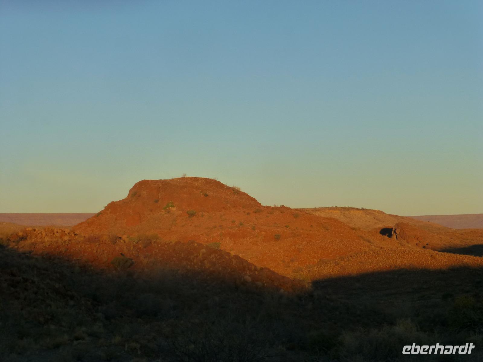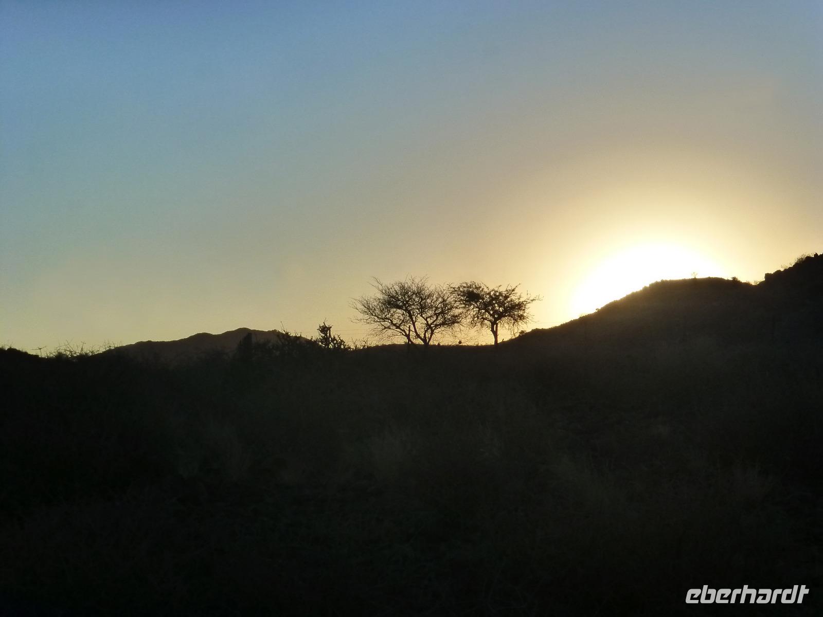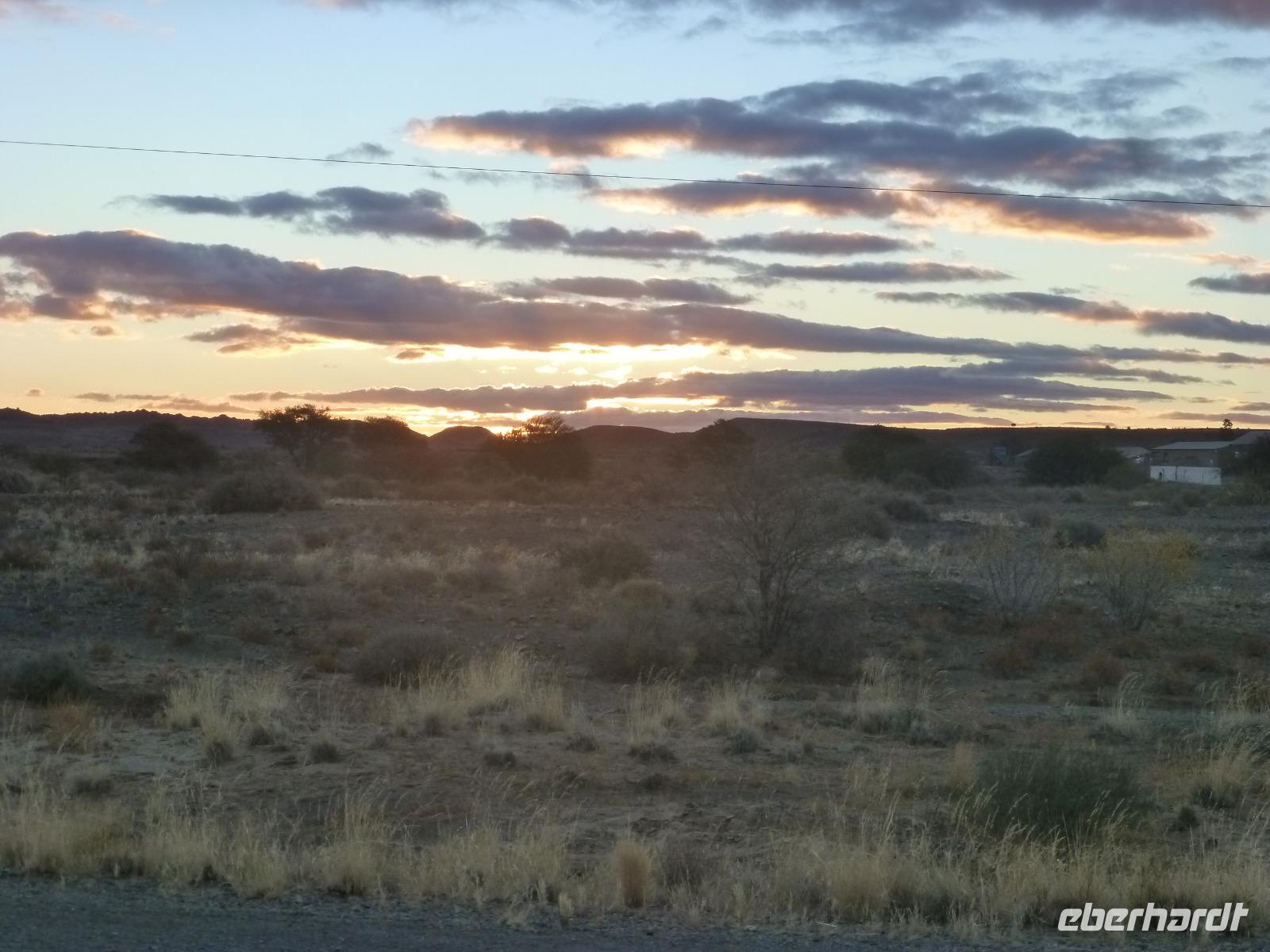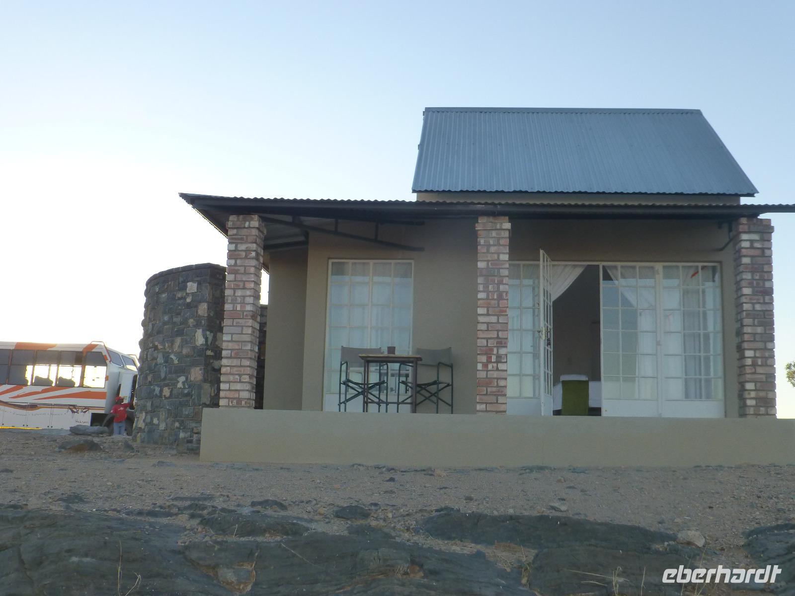 Noch völlig in Gedanken an Jörg, seine Familie und seine Farm starten wir in Richtung Naukluft Gebirge. Am Nachmittag erwartet uns in einsamer bergigen Wüstenlandschaft das Namib Naukluft Adventure Camp. Nun heisst es Truck entladen, denn für das Abendessen müssen wir, speziell aber Ernst selbst kochen. Vor dem Abendessen, nach dem wir uns in unseren Steinchalets häuslich eingerichtet , die herrliche Umgebung bestaunten und fotografiert und die Füße im kleinen Felsenpool gekühlt hatten, erwartete uns ein toller Sonnenuntergang inmitten der Wüste. Das Abendessen war lecker und nach einem kalten frischgezapften namibischen Bier, hieß es heute früh ins Körbchen, da morgen zeitiges aufstehen angesagt war.
