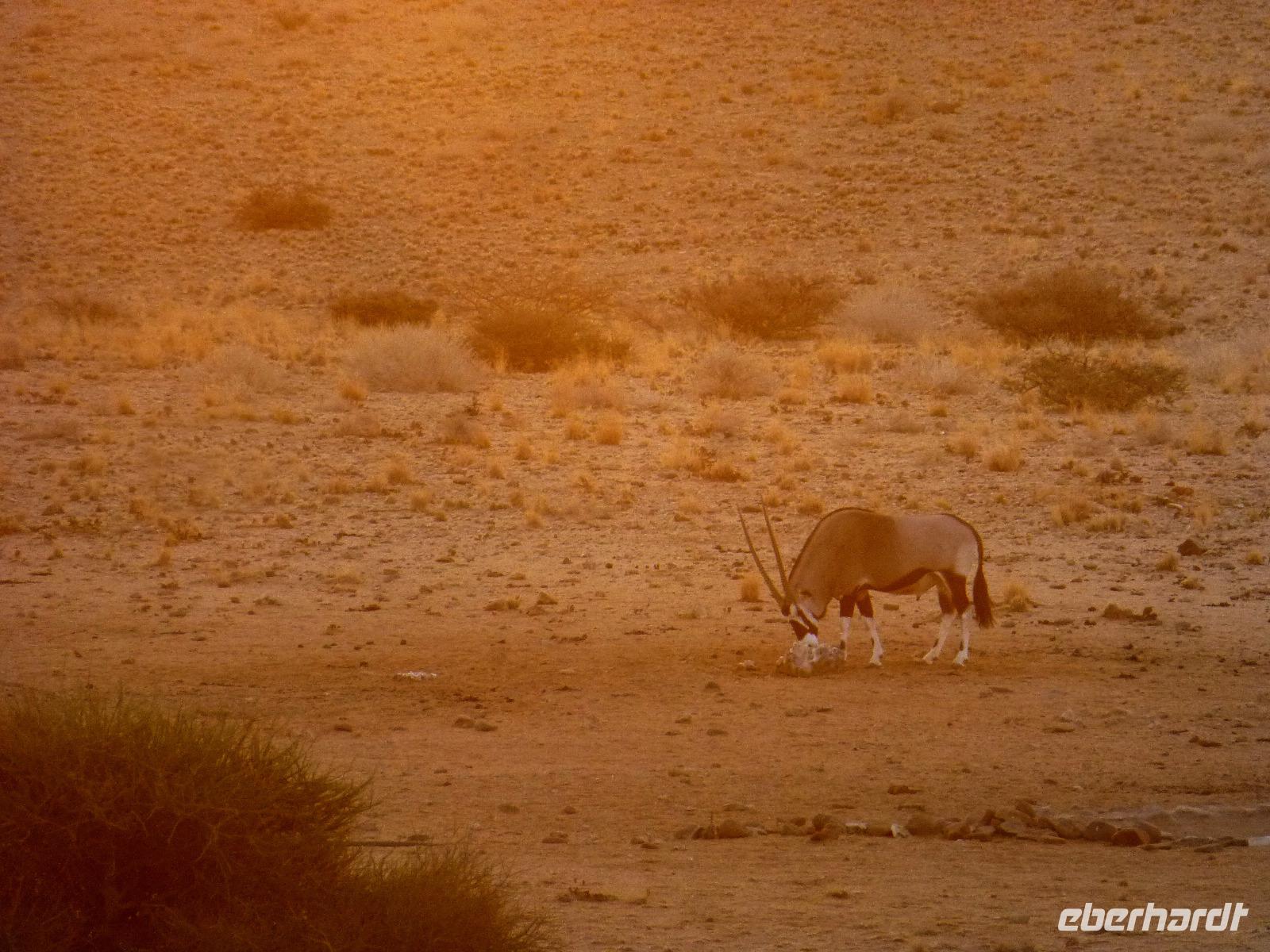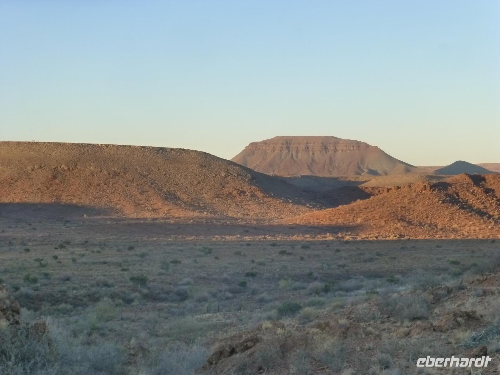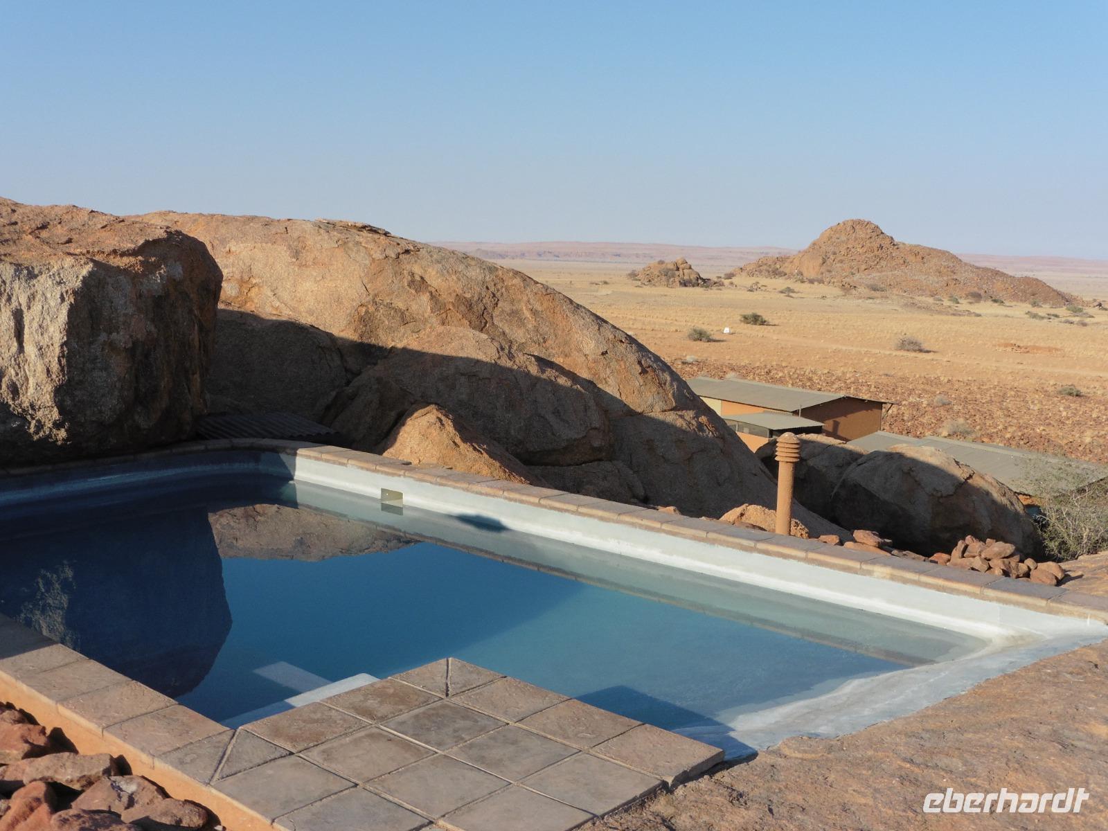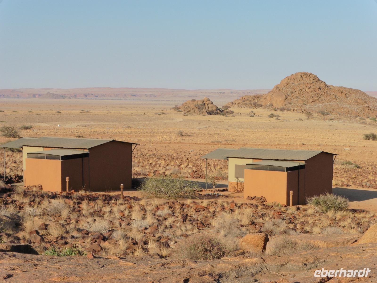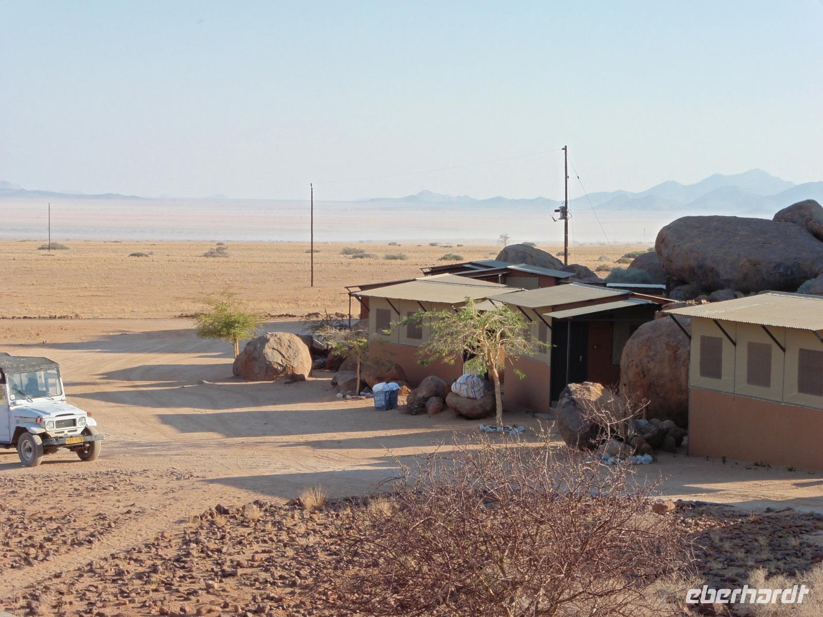 Noch völlig in Gedanken an Jörg, seine Familie und seine Farm starten wir in Richtung Naukluft Gebirge. Am Nachmittag erwartet uns in einsamer bergigen Wüstenlandschaft das Namib Naukluft Adventure Camp. Nun heisst es Truck entladen, denn für das Abendessen müssen wir, speziell aber Ernst selbst kochen. Vor dem Abendessen, nach dem wir uns in unseren Steinchalets häuslich eingerichtet , die herrliche Umgebung bestaunten und fotografiert und die Füße im kleinen Felsenpool gekühlt hatten, erwartete uns ein toller Sonnenuntergang inmitten der Wüste. Das Abendessen war lecker und nach einem kalten frischgezapften namibischen Bier, hieß es heute früh ins Körbchen, da morgen zeitiges aufstehen angesagt war.
