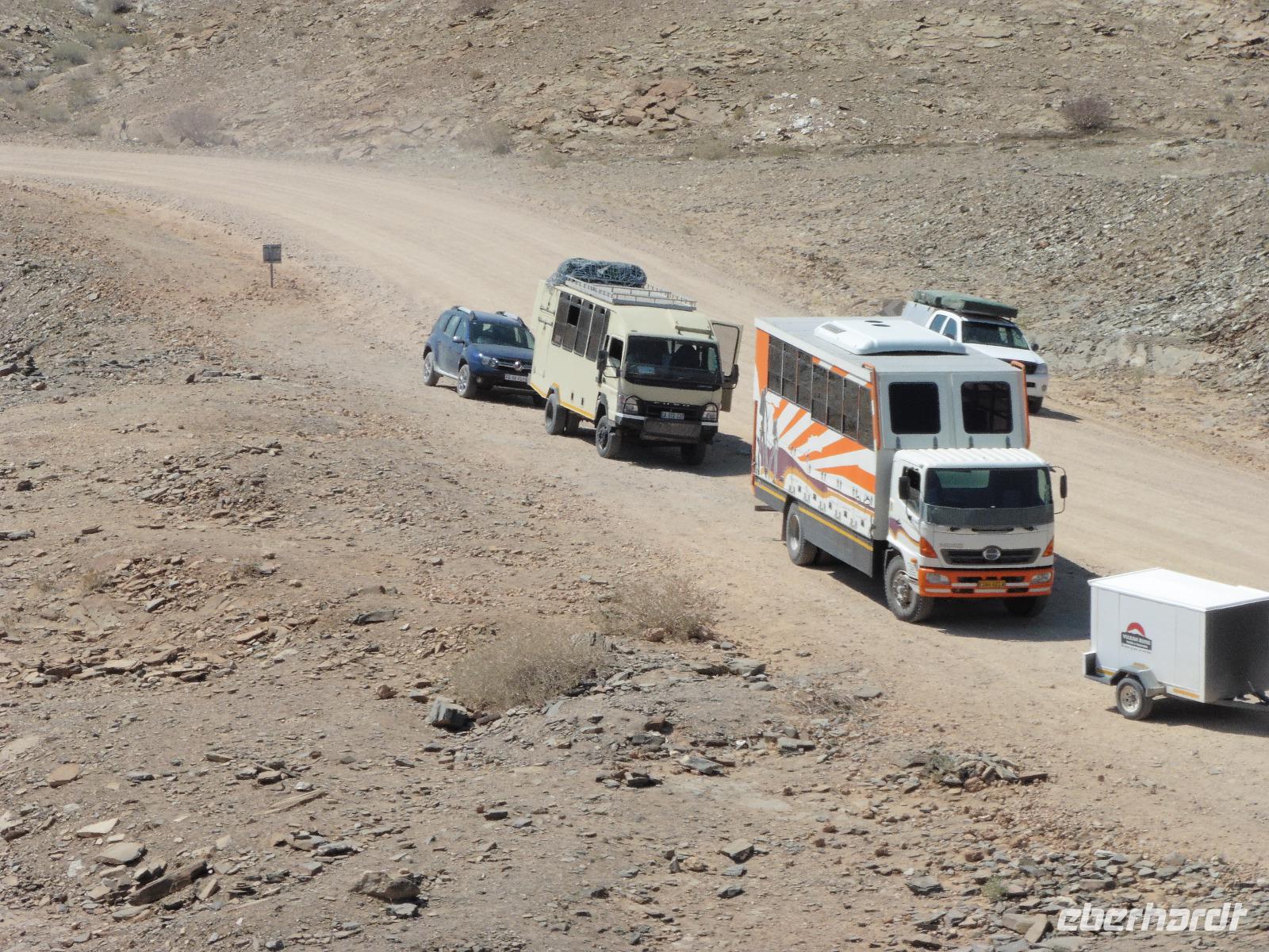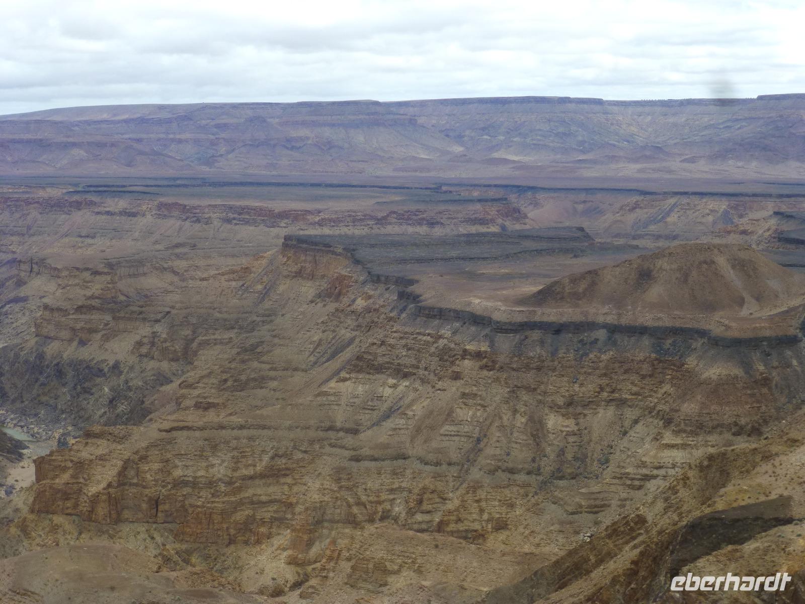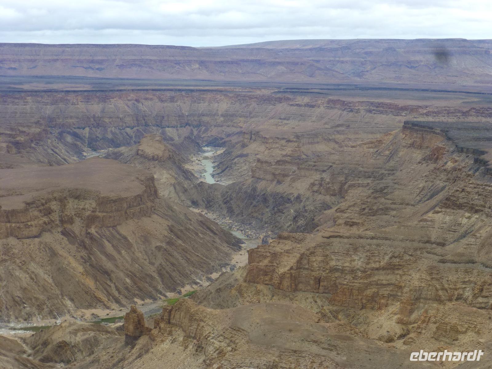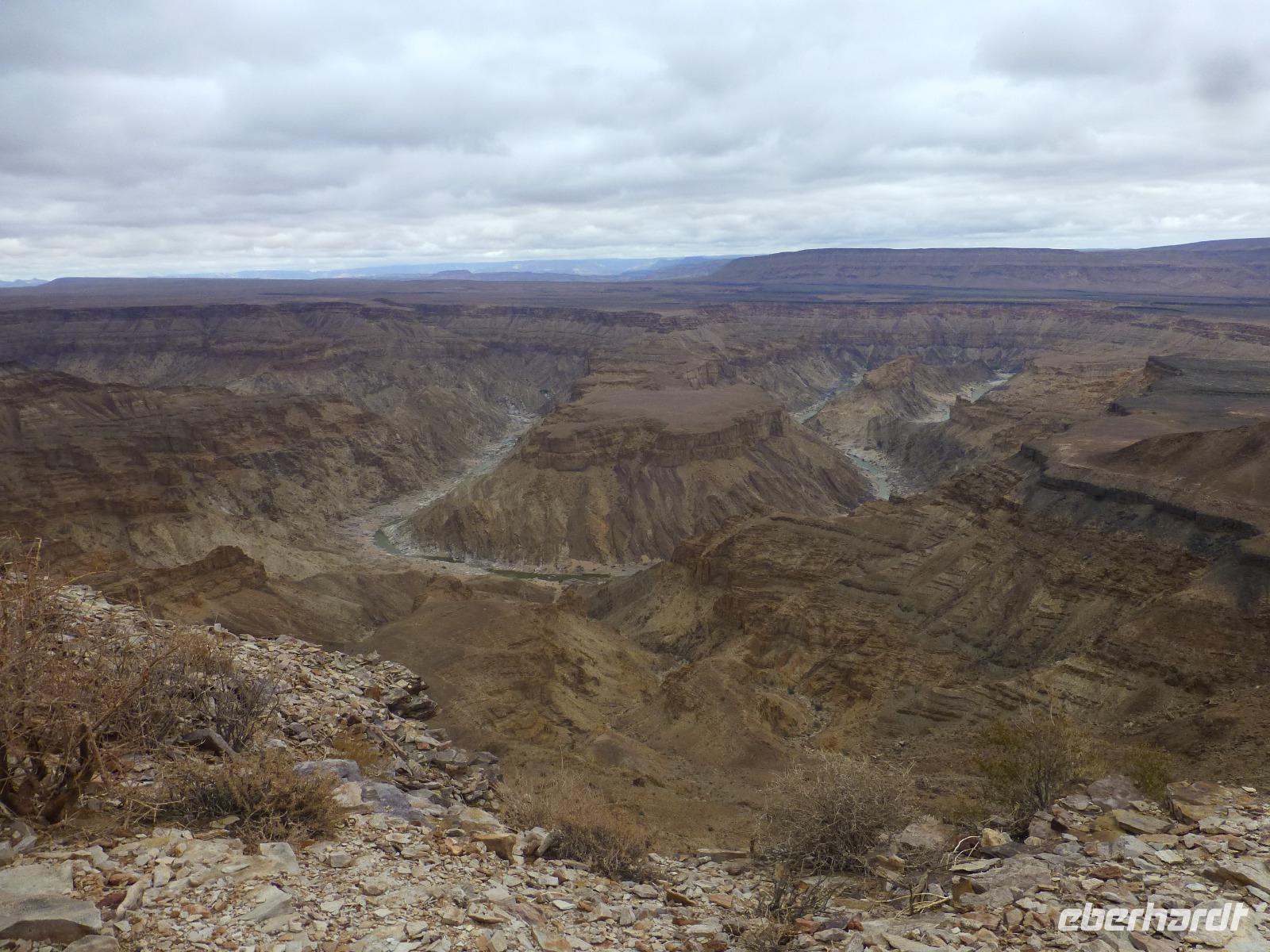 Nach dem Frühstück starteten wir weiter Richtung Süden. Wir sehen den Naute-Staudamm , der riesige Wasserspeicher versorgt die gesamte Region um Keetmanshoop mit dem kühlen Nass. Deshalb ist es nicht verwunderlich, dass hier, in unmittelbarer Umgebung ein kleines Paradies entstand: in der kargen, trockenen Landschaft eine grüne Oase mit Tafeltrauben und Datteln. Die weitere Route führte uns parallel der Eisenbahnstrecke und durch die Karoo bis zum Fish River Canyon. Unterwegs begegneten uns das erste, magische "Einhorn", auch alter Oryx genannt, Strauße und Springböcke. Schon von weitem konnten wir die gigantischen Ausfläufer des Canyons erahnen. Gigantische tauchte dieser plötzlich als „großes Loch im Boden" auf - eine spektakuläre Aussicht. Der Fish River windet sich im 550 Meter tiefen Bergmassiv und bildet somit die zweitgrößte Schluchtenlandschaft der Erde. Bei einem Spaziergang entlang der Canyon-Kante boten sich immer wieder neue Fotoperspektiven. Am Ende unseres Spazierganges, am Einstieg für Wanderungen wartete Filipo mit dem Truck auf uns. Unsere Mittagspause verbrachten wir im tollen Canon Roadhouse - eine herrliche Oase mitten in der Wüste, gespickt durch Allerlei zum Anschauen: alte, rostige Oldtimer, die zugleich Pflanzkübel für Kakteen sind, eine alte Tankstelle, die heute als Bar weiterhin ihren Zweck erfüllt.