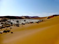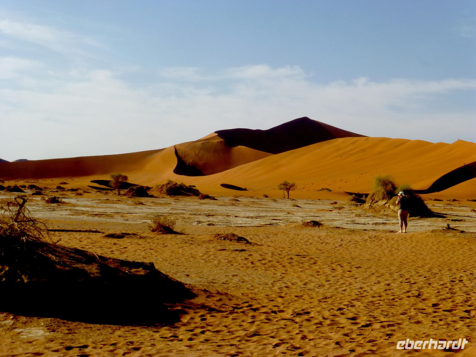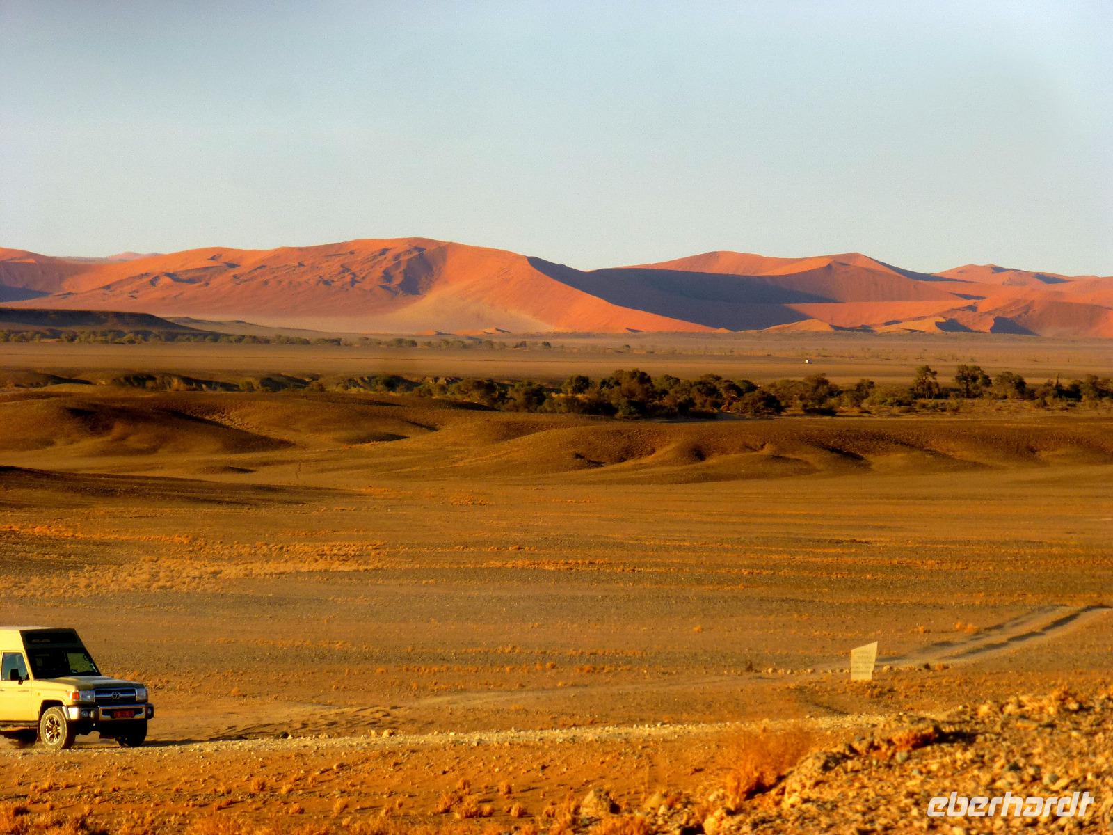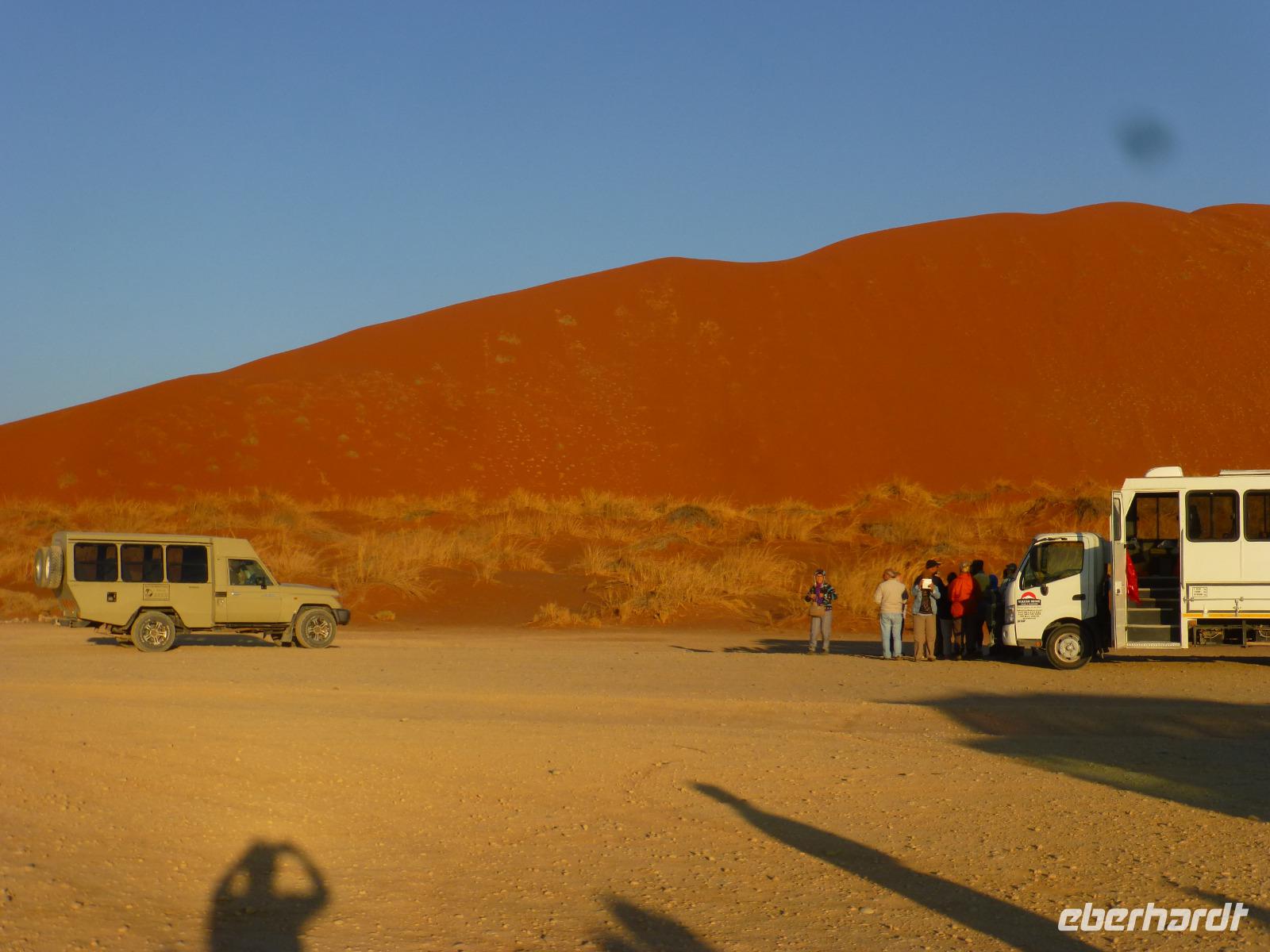 Die Tore zum Sossusvlei Park öffnen bei Sonnenaufgang, also ca. 6:30 Uhr "afrikanischer" Zeit. Links und rechts erheben sich nun die roten wunderschönen Dünen. Die Sonne geht langsam auf und färbt den rötlichen Sand in ein wunderschönes orange. An der bekannten Dünne 45 stehen bereits mehrere Busse und Jeeps unser Ziel ist aber die Düne Big Dady.