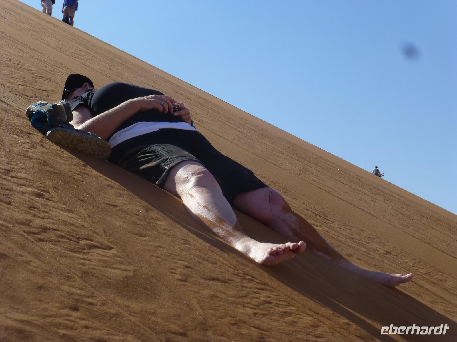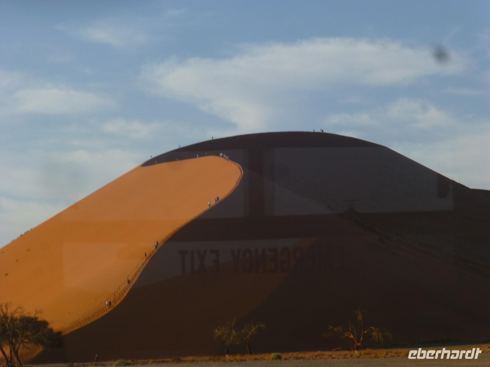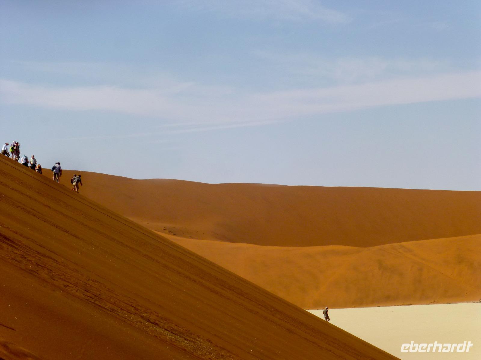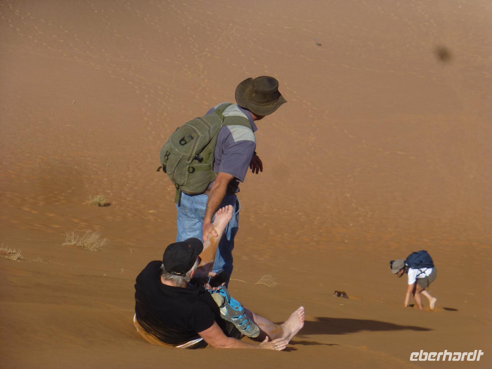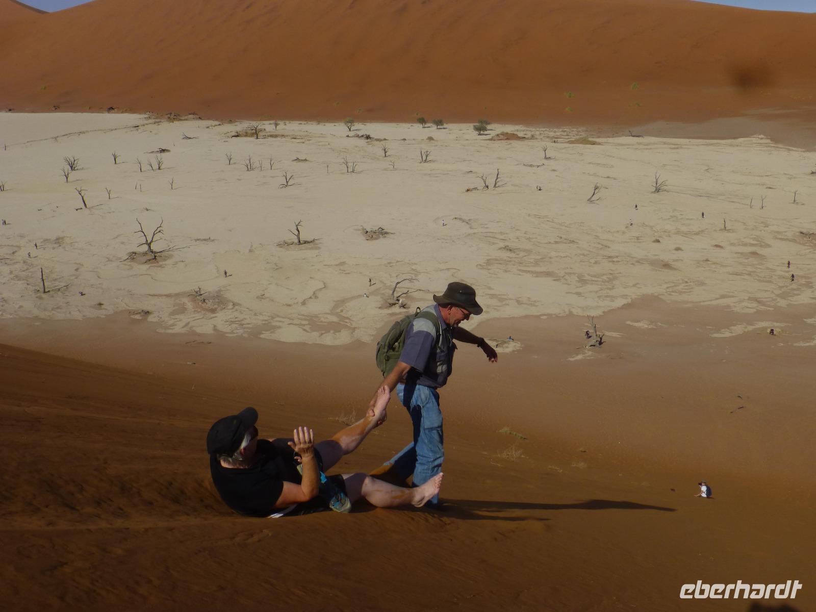 Nach einiger Zeit hält Filipo auf einem Parkplatz an und wir steigen um in Allradjeep bis zu Big Dady. Schnell ziehen wir uns die Schuhe aus, schnappen unsere Wasserflaschen und erklimmen die Düne. Um uns herum ein orangefarbenes Meer und zwischen den Zehen nix als Sand. Vom Gipfel der Düne aus haben wir einen wunderbaren Blick auf das Deathvlei. Erika ist glücklich, auch Sie hat nach anfänglichen Zweifeln Big Dady erklommen. Der Abstieg per Podex trug zur allgemeinen Belustigung bei.