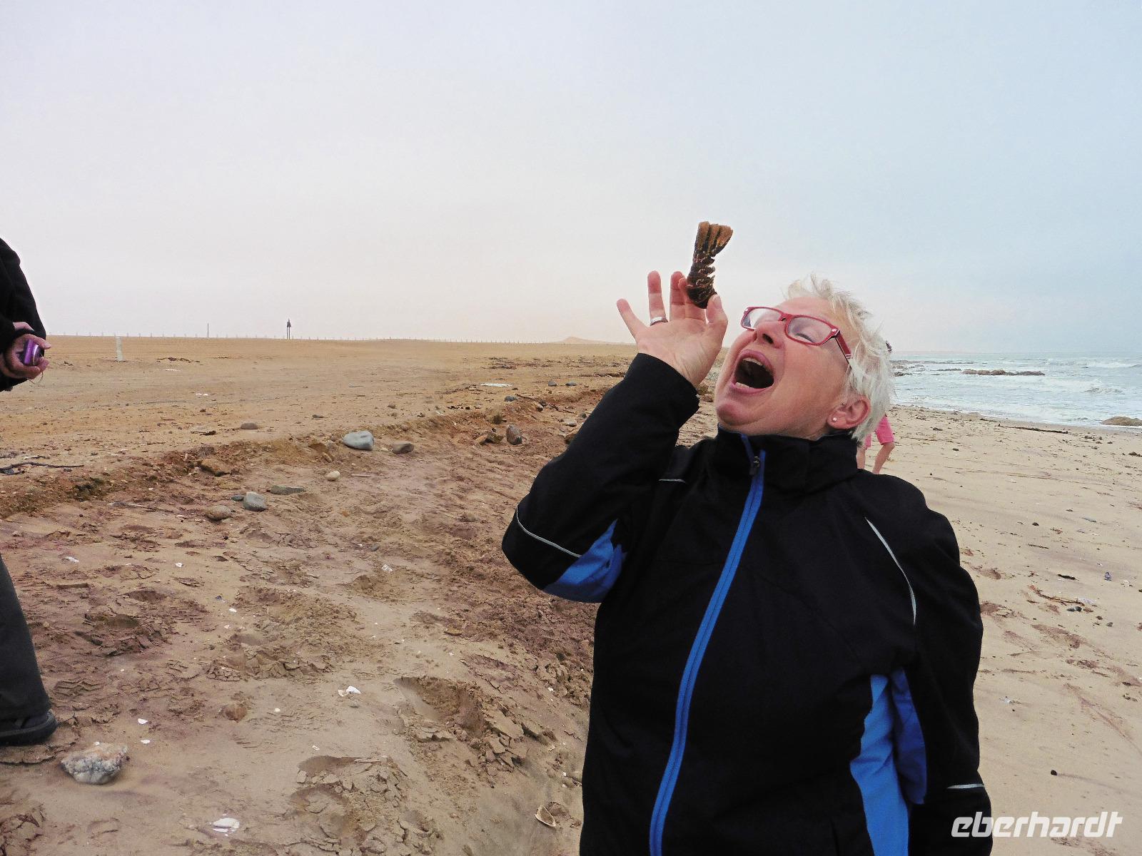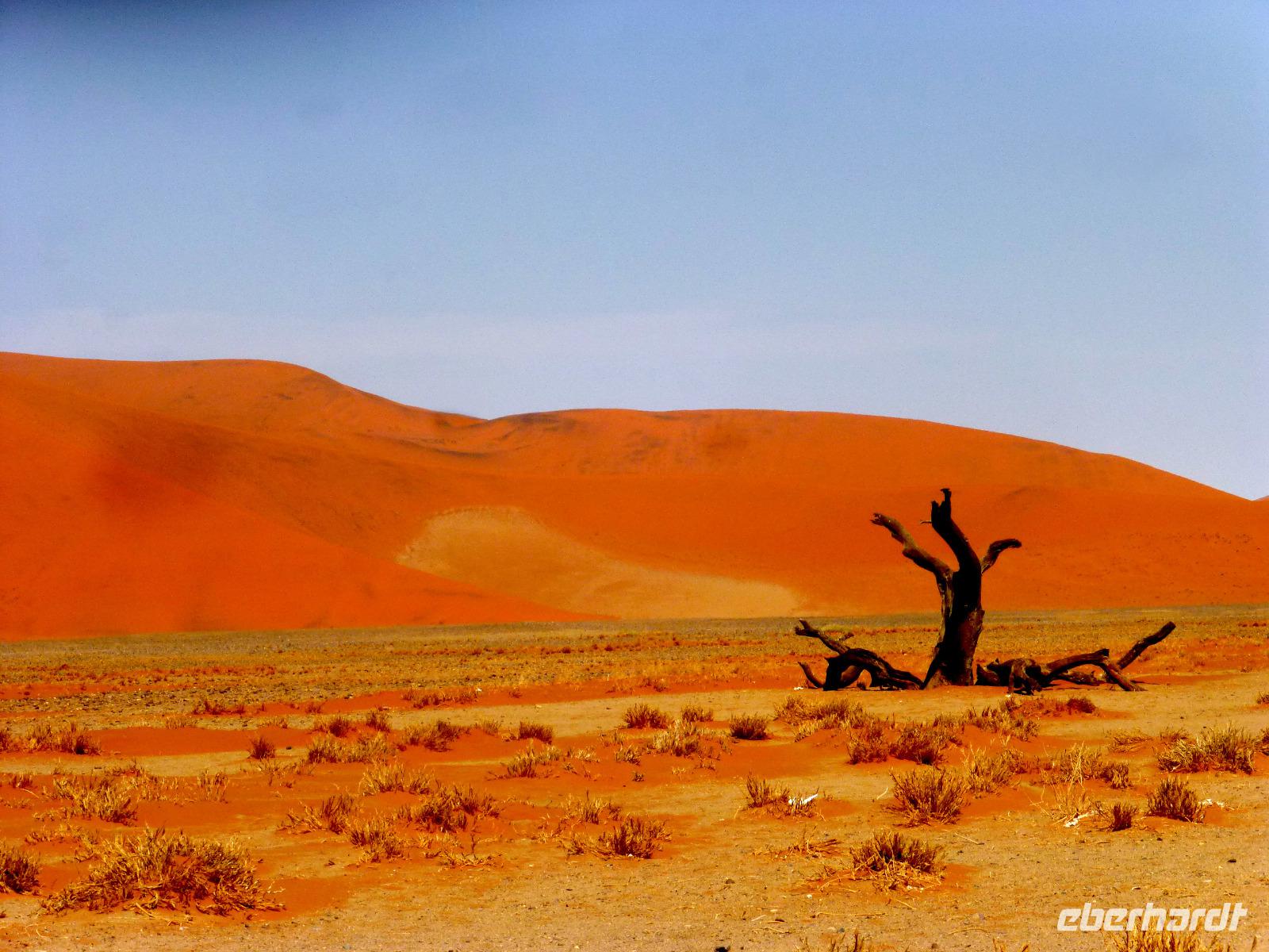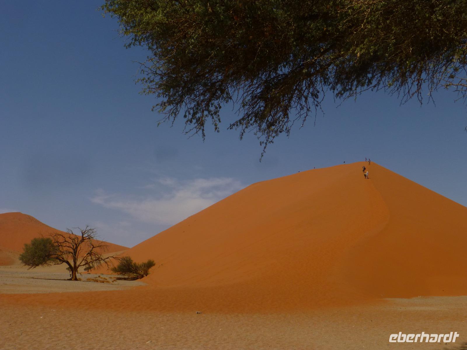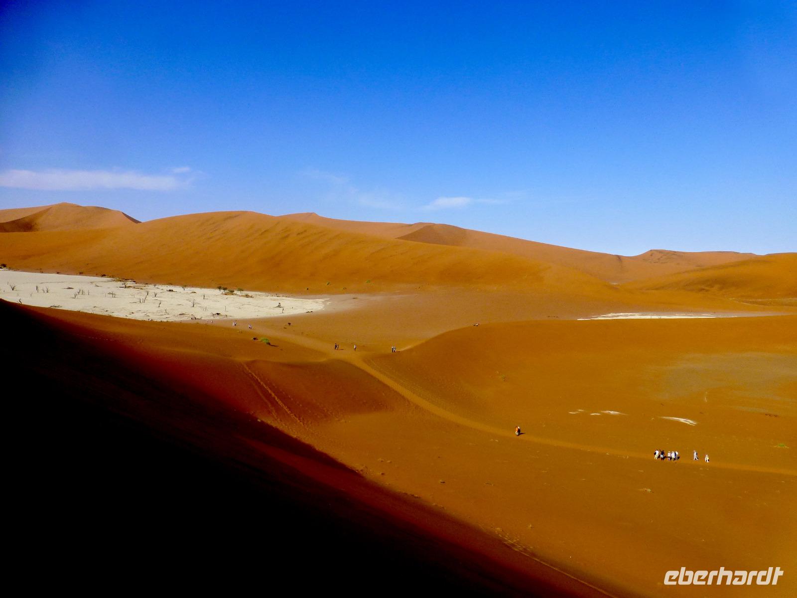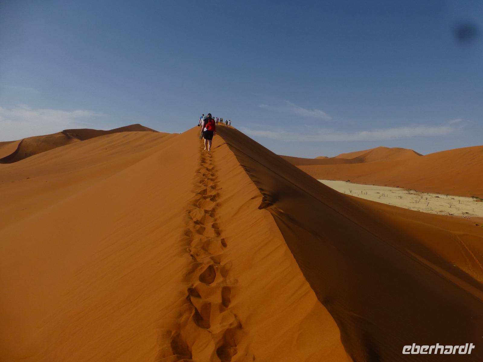 Nach einiger Zeit hält Filipo auf einem Parkplatz an und wir steigen um in Allradjeep bis zu Big Dady. Schnell ziehen wir uns die Schuhe aus, schnappen unsere Wasserflaschen und erklimmen die Düne. Um uns herum ein orangefarbenes Meer und zwischen den Zehen nix als Sand. Vom Gipfel der Düne aus haben wir einen wunderbaren Blick auf das Deathvlei. Erika ist glücklich, auch Sie hat nach anfänglichen Zweifeln Big Dady erklommen. Der Abstieg per Podex trug zur allgemeinen Belustigung bei.
