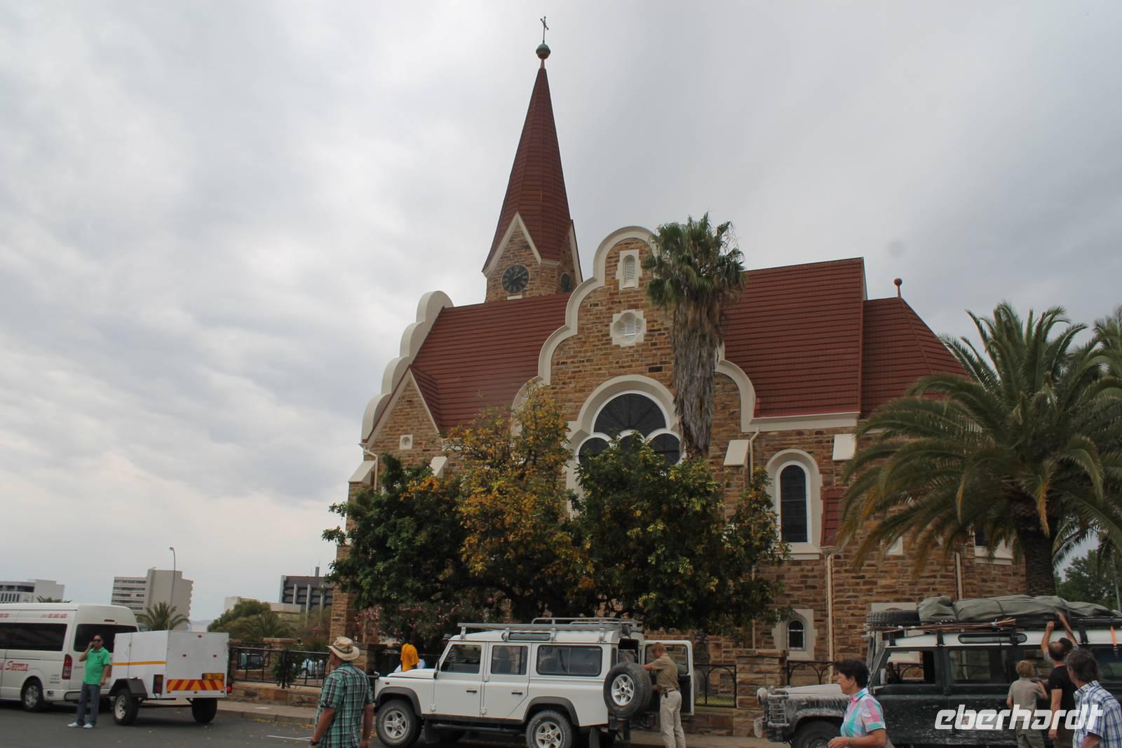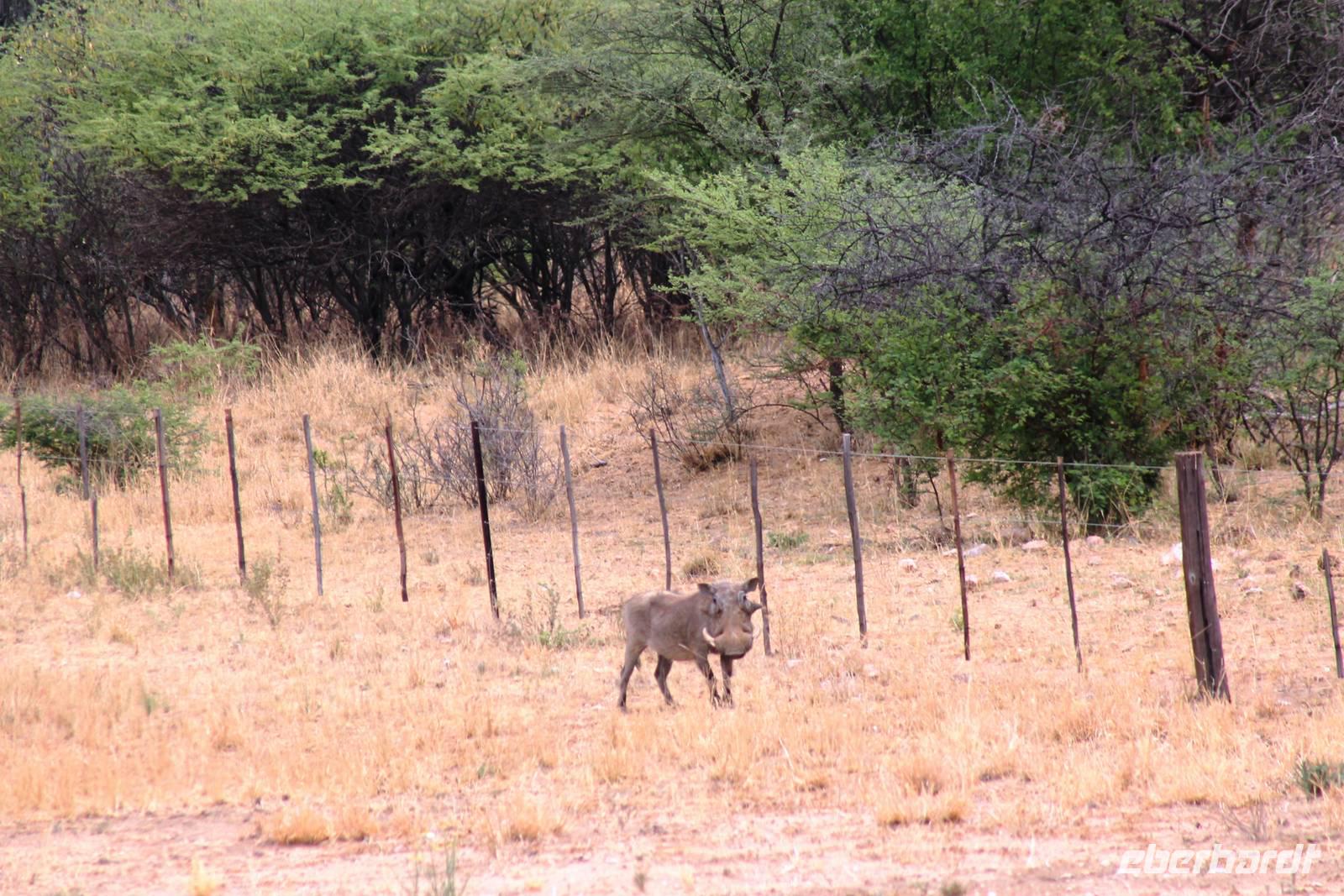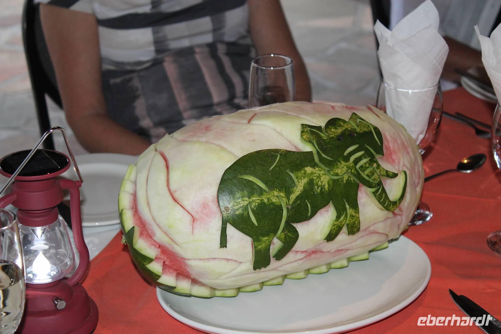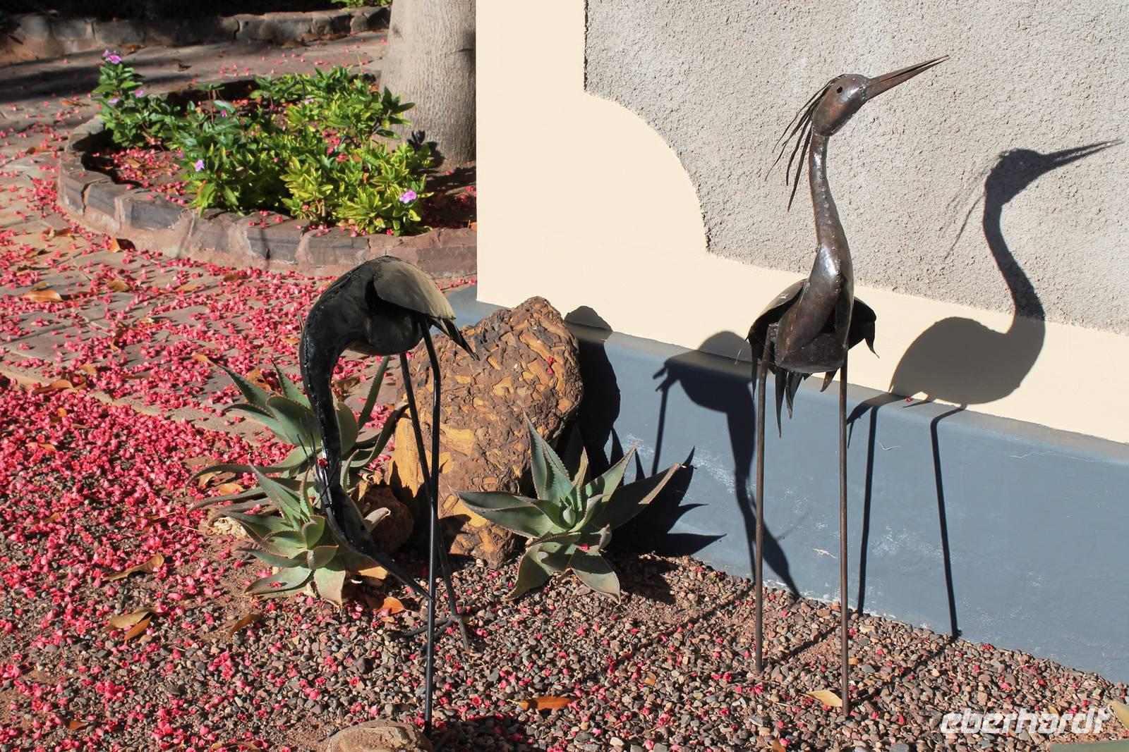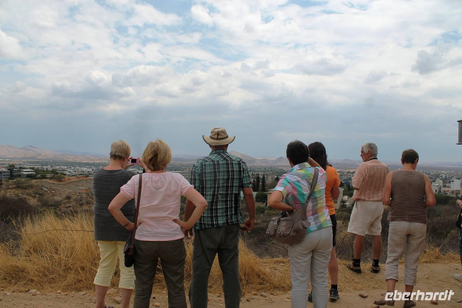 Heute begann der letzte Tag und der Abschied vom wundervollen Namibia rückte in greifbare Nähe. Auch der Himmel fing an zu weinen. Dennoch war der Regen ein Segen für das Land, nach der langen Trockenzeit, also freuten wir uns mit. Auf Asphalt ging es schnell voran. Unterwegs wollten wir unbedingt noch Warzenschweine auf unseren Fotos verewigen, denn die fehlten noch in unserer Sammlung. Leider waren die cleveren Kerlchen zu schnell für uns. Eben noch genüsslich am Strassenrand grasend, verschwanden sie geschwind in den Büschen, sobald unser Truck kurz anhielt. Am Anfang war das Spielchen noch ganz unterhaltsam, aber später widmeten wir uns lieber Anekdoten, Geschichten und den lustigen Gedichten von Rudolf (Kostproben von ihm folgen zum Schluss). In Okahandja besichtigten wir die alte Kirche und den Friedhof. Später stürmte ein blinder Passagier unseren Truck. Horst lud ein Chamäleon zur kurzen Mitfahrt ein. Als wir im kleinen Cafe einen Kaffee und einen kleinen Imbiss genossen, hatten wir noch eine überraschende Begegnung mit dem Fernsehkoch, Frank Buchholz vom ARD-Buffet. Sein größter Fan Heidi war überglücklich (wurde natürlich gleich mit einem Selfie protokolliert). In Windhoek angekommen, unternahmen wir eine Rundfahrt durch den bunten, lebendigen Stadtteil (Township) Katutura. Von einem Aussichtpunkt oberhalb der Stadt hatten wir einen fantastischen Ausblick auf die namibische Hauptstadt. Anschließend fuhren wir ins Zentrum von Windhoek hinab. An der Christuskirche stiegen wir aus. Diese war offen und so konnten wir die Kirche auch innen besichtigen. Danach spazierten zum "Tintenpalast" und am Park wieder zurück. Gegenüber auf einen Hügel, sahen wir den futuristischen Bau des neuen Unabhängigkeitsmuseums, davor thront die nagelneue Statue von Sam Nujoma (1. Präsident von Namibia). Auf diesem Platz stand einst der Südwester Reiter, der vor ca. 2 Jahren vor die Feste umgesetzt wurde. Diese Stelle mußte er wiederum räumen, da dort nun ein neues Denkmal steht. Seit dem "reitet" bzw. liegt er im begrenzten Rahmen im Innenhof der Alten Feste, die allerdings verschlossen war. Am Nachmittag wurden wir im Hotel Thule, unserer letzten Station, herzlich empfangen. Von Rosalie wurden wir im liebreizenden Deutsch mit jeder Menge Sekt und Kuchen empfangen. Am frühen Abend trafen wir uns auf der Terrasse des Hotels wieder. Der letzte Abend hatte begonnen. Im überdachten Teil nahmen wir an unserer Festtafel Platz. Zur abendlichen Begrüßung wurde uns wiederholt Sekt kredenzt. Das Personal des Hotel "Thule" kennt eben den Geschmack seiner Stammgäste von Eberhardt. Nach einem leckeren Abendmahl schlachteten wir eine eigens für uns desingte Elefanten-Melone. Von Rosalie und dem Thule-Team wurden wir bestens unterhalten. Zum Abschluß stimmten sie die Nationalhymne Namibia an, welch eine Ehre für uns. Es war ein geselliger, schöner Abschlußabend.