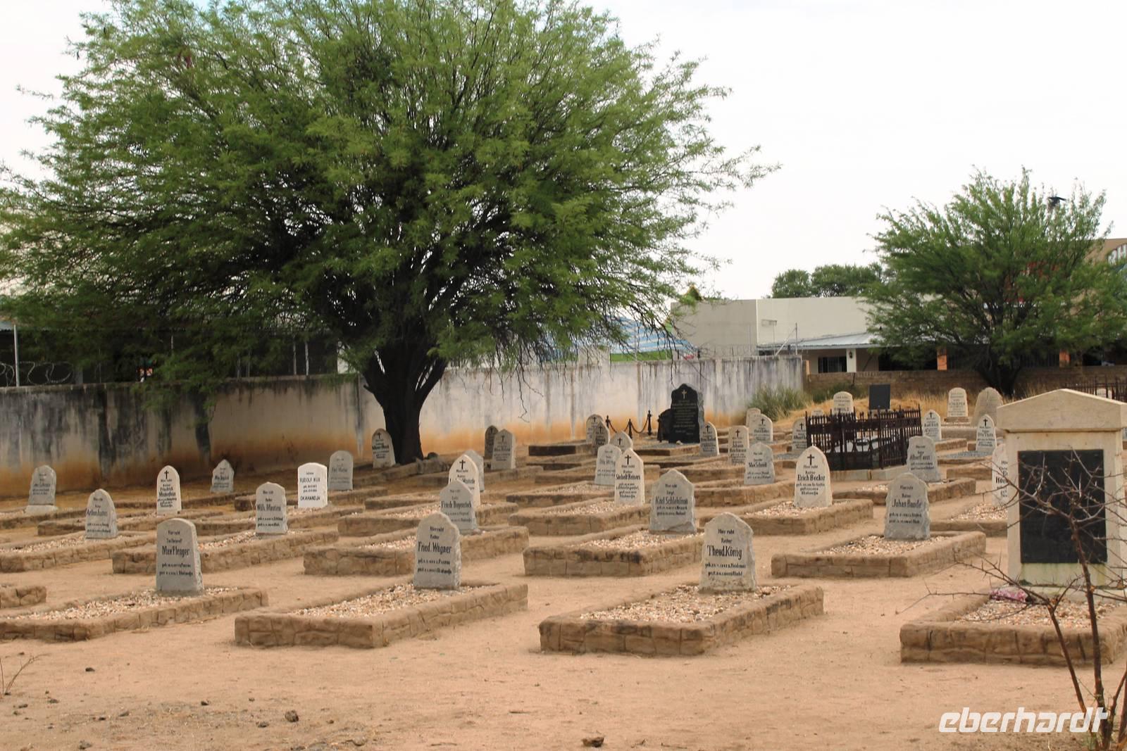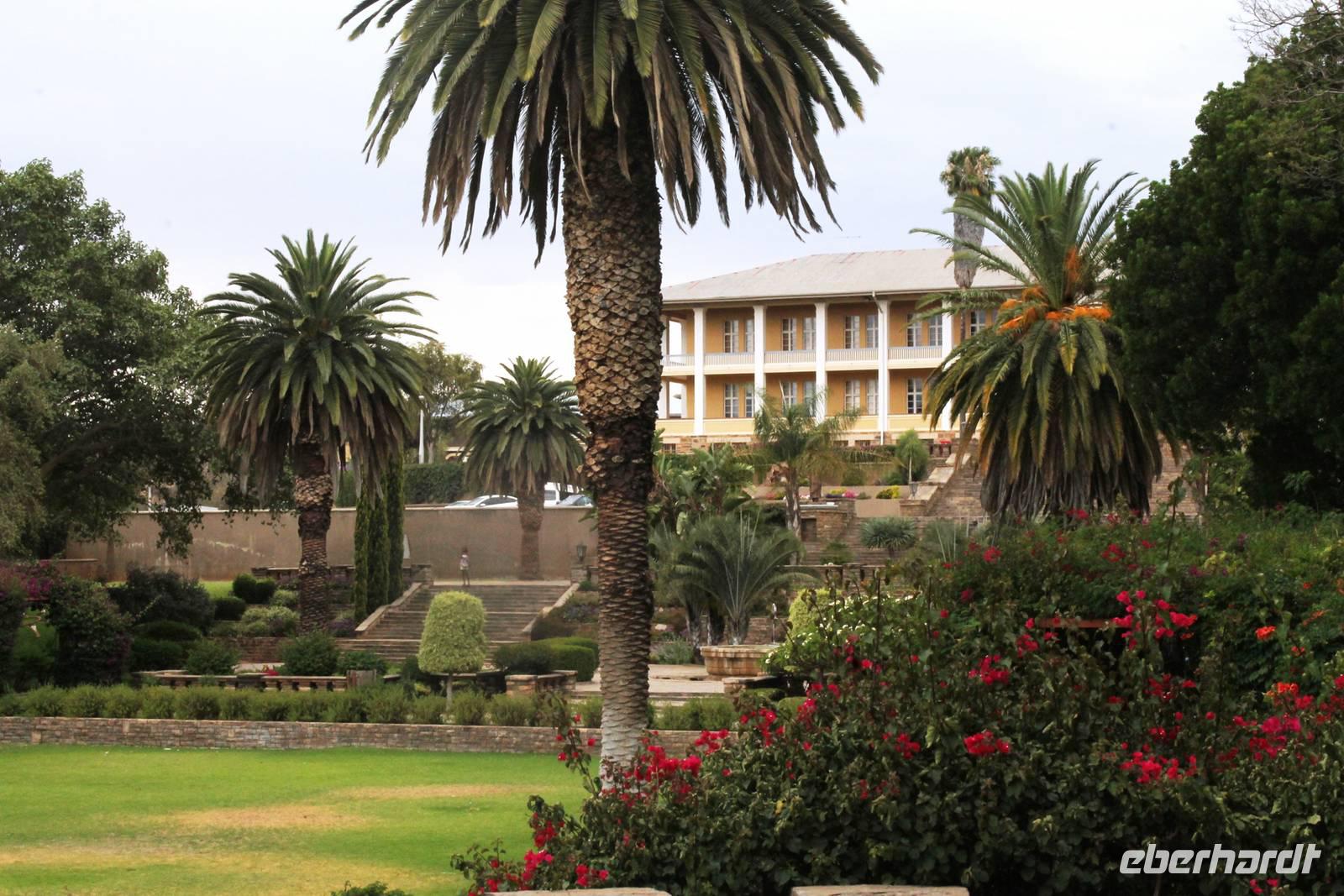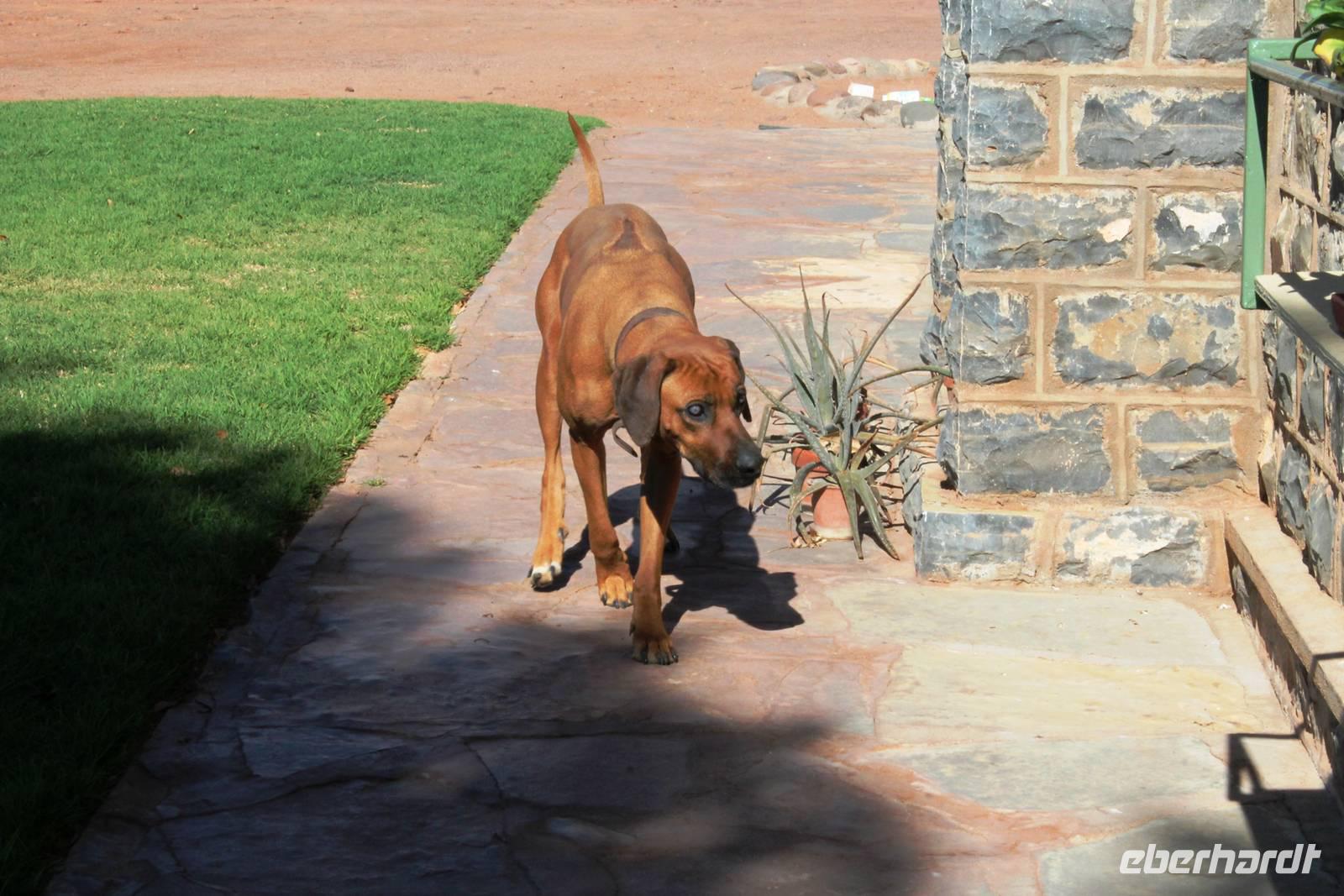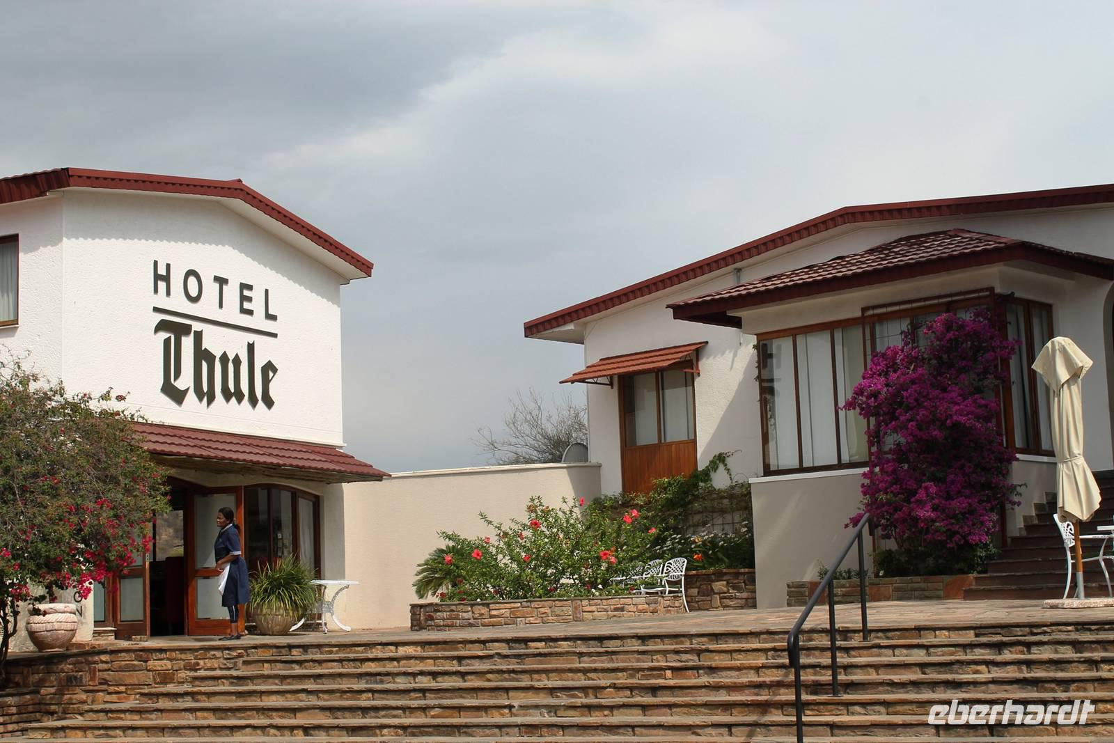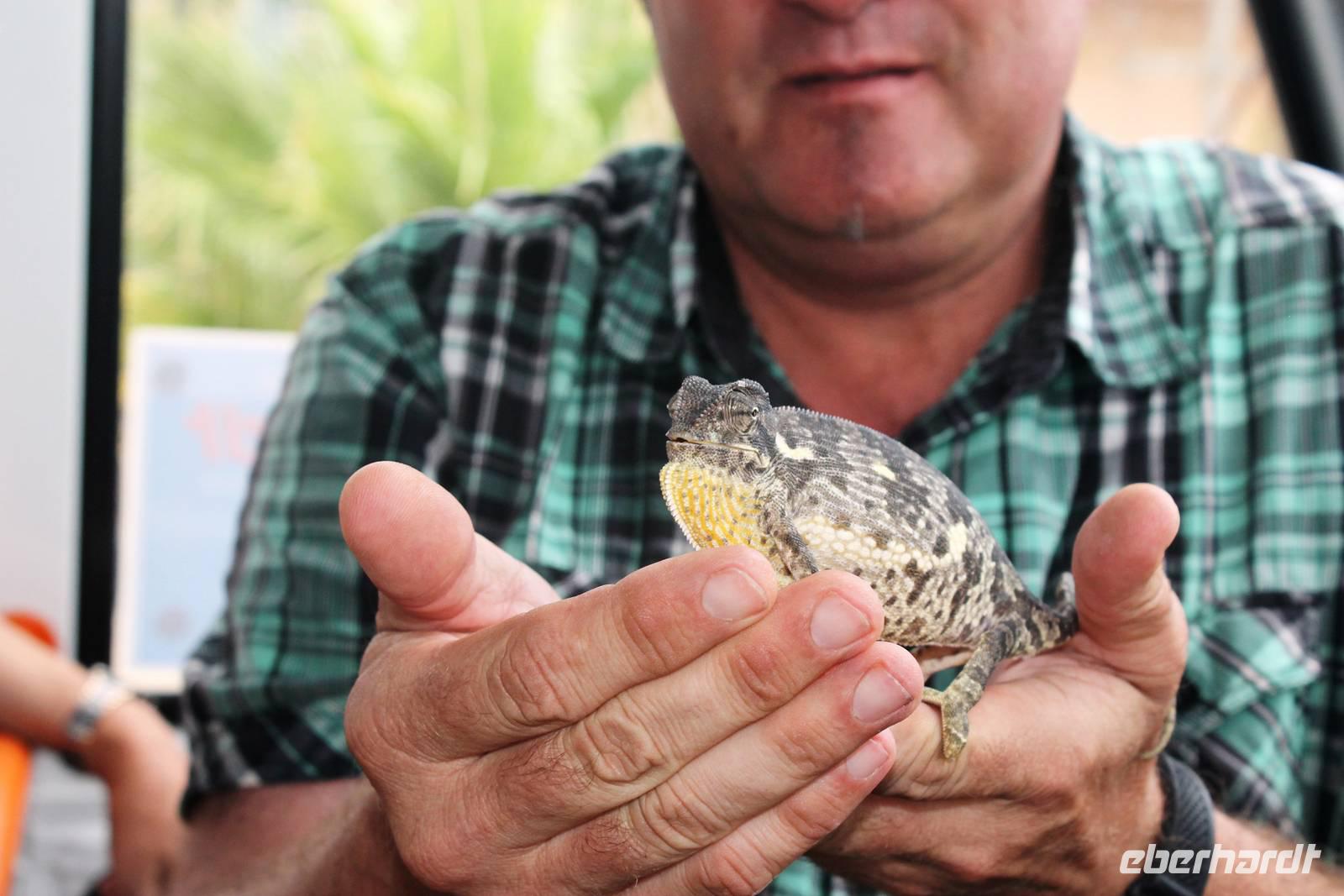 Heute begann der letzte Tag und der Abschied vom wundervollen Namibia rückte in greifbare Nähe. Auch der Himmel fing an zu weinen. Dennoch war der Regen ein Segen für das Land, nach der langen Trockenzeit, also freuten wir uns mit. Auf Asphalt ging es schnell voran. Unterwegs wollten wir unbedingt noch Warzenschweine auf unseren Fotos verewigen, denn die fehlten noch in unserer Sammlung. Leider waren die cleveren Kerlchen zu schnell für uns. Eben noch genüsslich am Strassenrand grasend, verschwanden sie geschwind in den Büschen, sobald unser Truck kurz anhielt. Am Anfang war das Spielchen noch ganz unterhaltsam, aber später widmeten wir uns lieber Anekdoten, Geschichten und den lustigen Gedichten von Rudolf (Kostproben von ihm folgen zum Schluss). In Okahandja besichtigten wir die alte Kirche und den Friedhof. Später stürmte ein blinder Passagier unseren Truck. Horst lud ein Chamäleon zur kurzen Mitfahrt ein. Als wir im kleinen Cafe einen Kaffee und einen kleinen Imbiss genossen, hatten wir noch eine überraschende Begegnung mit dem Fernsehkoch, Frank Buchholz vom ARD-Buffet. Sein größter Fan Heidi war überglücklich (wurde natürlich gleich mit einem Selfie protokolliert). In Windhoek angekommen, unternahmen wir eine Rundfahrt durch den bunten, lebendigen Stadtteil (Township) Katutura. Von einem Aussichtpunkt oberhalb der Stadt hatten wir einen fantastischen Ausblick auf die namibische Hauptstadt. Anschließend fuhren wir ins Zentrum von Windhoek hinab. An der Christuskirche stiegen wir aus. Diese war offen und so konnten wir die Kirche auch innen besichtigen. Danach spazierten zum "Tintenpalast" und am Park wieder zurück. Gegenüber auf einen Hügel, sahen wir den futuristischen Bau des neuen Unabhängigkeitsmuseums, davor thront die nagelneue Statue von Sam Nujoma (1. Präsident von Namibia). Auf diesem Platz stand einst der Südwester Reiter, der vor ca. 2 Jahren vor die Feste umgesetzt wurde. Diese Stelle mußte er wiederum räumen, da dort nun ein neues Denkmal steht. Seit dem "reitet" bzw. liegt er im begrenzten Rahmen im Innenhof der Alten Feste, die allerdings verschlossen war. Am Nachmittag wurden wir im Hotel Thule, unserer letzten Station, herzlich empfangen. Von Rosalie wurden wir im liebreizenden Deutsch mit jeder Menge Sekt und Kuchen empfangen. Am frühen Abend trafen wir uns auf der Terrasse des Hotels wieder. Der letzte Abend hatte begonnen. Im überdachten Teil nahmen wir an unserer Festtafel Platz. Zur abendlichen Begrüßung wurde uns wiederholt Sekt kredenzt. Das Personal des Hotel "Thule" kennt eben den Geschmack seiner Stammgäste von Eberhardt. Nach einem leckeren Abendmahl schlachteten wir eine eigens für uns desingte Elefanten-Melone. Von Rosalie und dem Thule-Team wurden wir bestens unterhalten. Zum Abschluß stimmten sie die Nationalhymne Namibia an, welch eine Ehre für uns. Es war ein geselliger, schöner Abschlußabend.