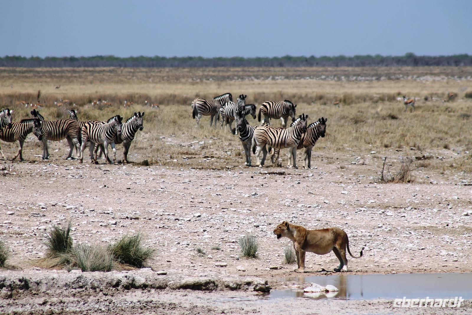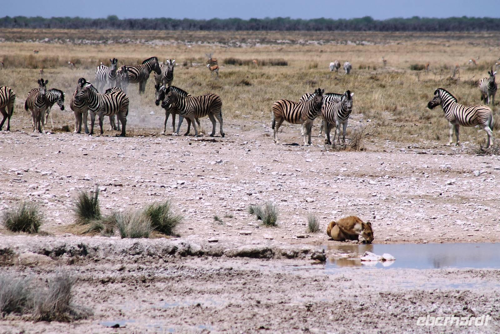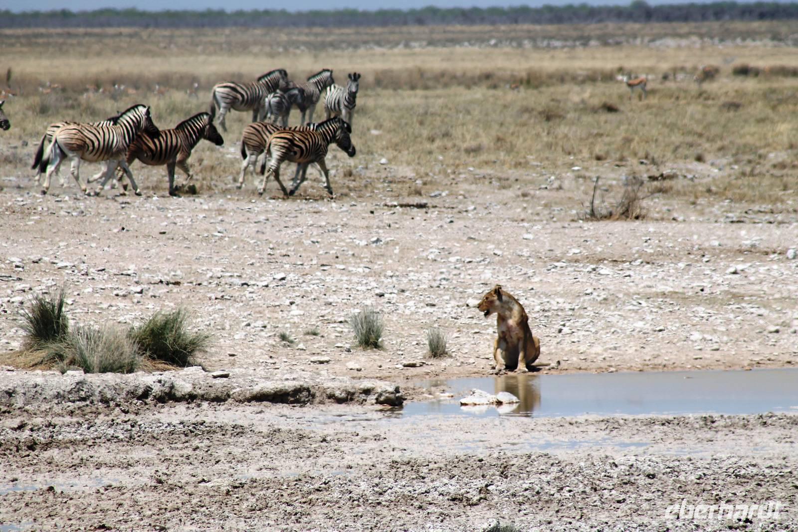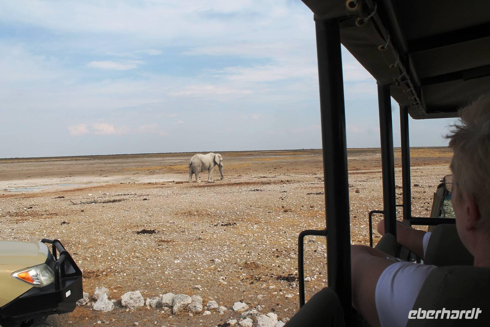 Nach dem zeitigen Frühstück setzten wir unsere Erkundungen im Etosha Nationapark mit unserem Truck fort - Vorteil: erhöhte, bequeme Sitze - Schiebefenster für den pefekten Schnappschuss - kein Staub oder ständiger Fahrtwind - Getränke an Bord. Erste Stationen waren einige Wasserlöcher und das Camp "Okaukuejo". Es gab wieder reichlich zu schauen. Wir beobachteten Springbock- und Impalaherden, Gnus, Strauße, Riesentrappen, natürlich Zebras und Oryxe sowie Kuhantilopen, Nashörner und Elefanten. Später sahen wir eine Ansammlung von Fahrzeugen, also nix wie hin. Juchu, eine Löwendame, die glaube ich, tragend war, saß am Wasser, während die riesige Zebraherde ringsum fast regenslos verharrte. Weitere Löwen sollten folgend. In der Nähe eines anderen Wasserloches hielten zahlreiche Geier eine Versammlung. Der Grund ein verenderter, kleinerer Elefant. Anschließend fuhren wir zum Rand der Etosha-Pfanne, dem Etosha Lookout. Hier stiegen wir aus: strahlend blauer Himmel - weisse, nicht greifbare Weite und nichts als Weite. Einfach faszinierend. Alles erschien unendlich und wir waren mittendrin! Unsere Pause verbrachten wir im Camp Halali, wo die deutschen Truppen auf den nahen Hügel damals einen Heliographen errichteten. Nicht nur am dortigen Wasserloch war Mittagspause, auch wenig Service und Auswahl im Restaurant und im Supermarkt wurde für die zahlreichen Besucher angeboten. Dabei wäre das doch in der Hochsaison eine Goldgrube. Halali kommt übrigens aus dem Deutschen und bedeutet Ende der Jagd. Aber nicht für uns! Am späteren Nachmittag kehrten wir mit spannenden, tierreichen Erlebnissen im Gepäck zu unserer Lodge zurück.
