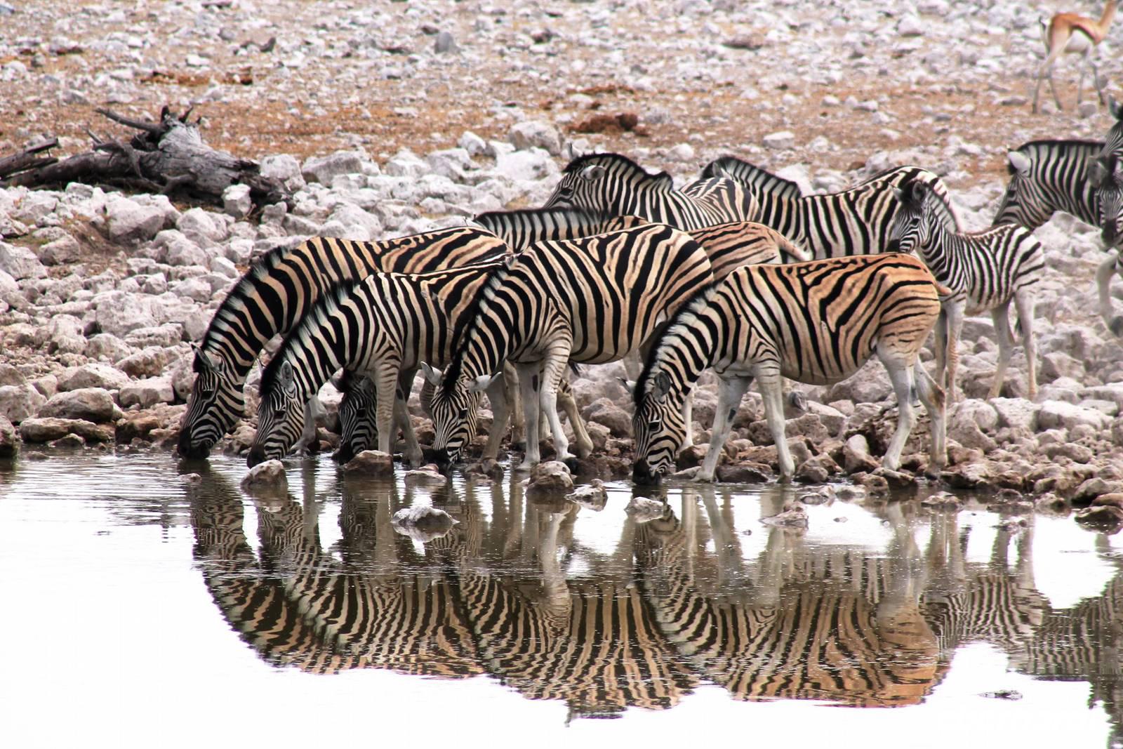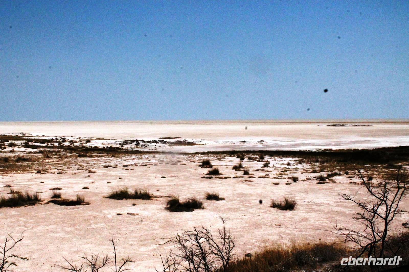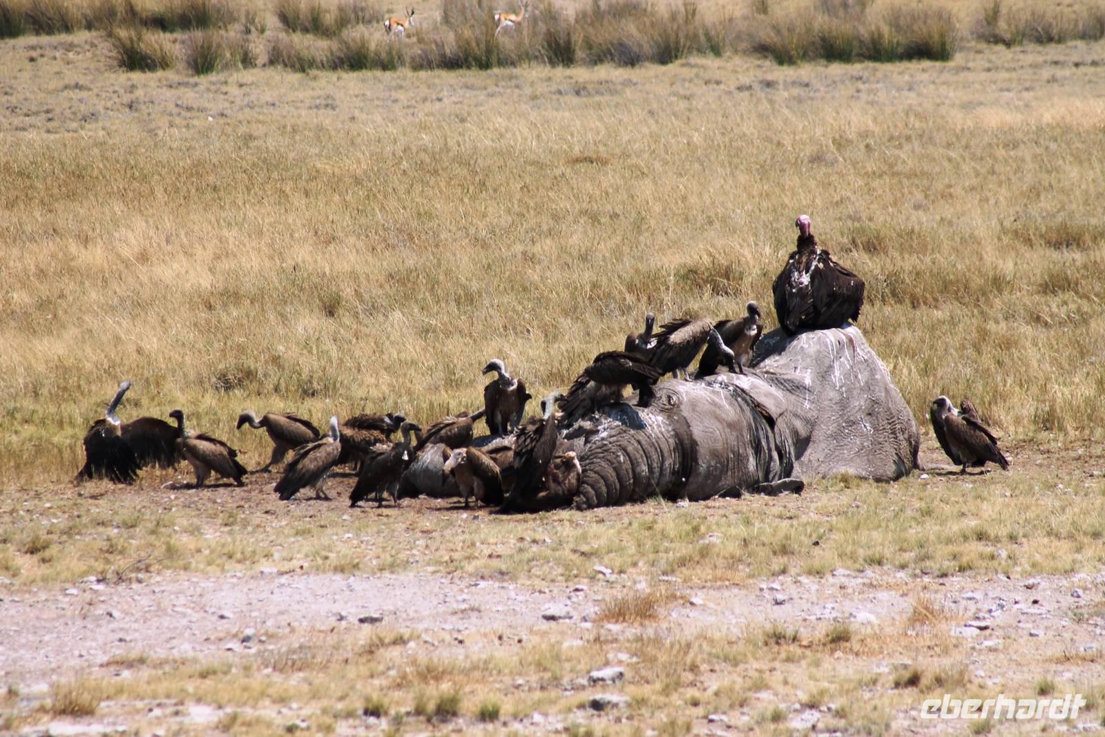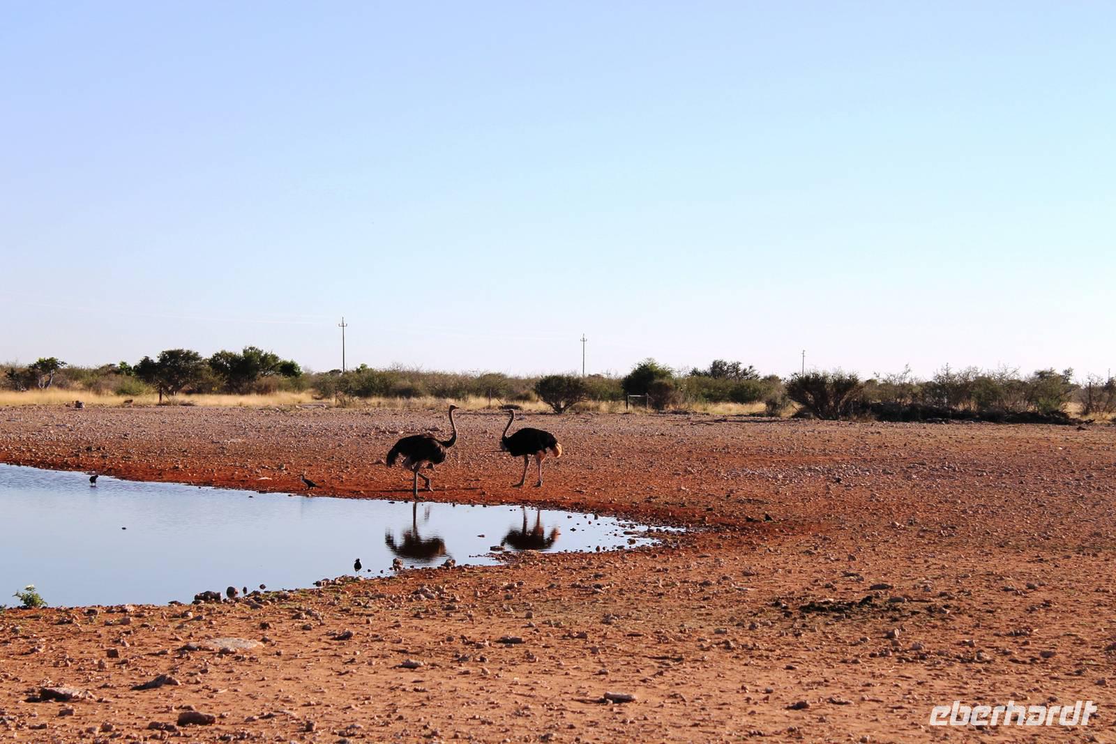 Nach dem zeitigen Frühstück setzten wir unsere Erkundungen im Etosha Nationapark mit unserem Truck fort - Vorteil: erhöhte, bequeme Sitze - Schiebefenster für den pefekten Schnappschuss - kein Staub oder ständiger Fahrtwind - Getränke an Bord. Erste Stationen waren einige Wasserlöcher und das Camp "Okaukuejo". Es gab wieder reichlich zu schauen. Wir beobachteten Springbock- und Impalaherden, Gnus, Strauße, Riesentrappen, natürlich Zebras und Oryxe sowie Kuhantilopen, Nashörner und Elefanten. Später sahen wir eine Ansammlung von Fahrzeugen, also nix wie hin. Juchu, eine Löwendame, die glaube ich, tragend war, saß am Wasser, während die riesige Zebraherde ringsum fast regenslos verharrte. Weitere Löwen sollten folgend. In der Nähe eines anderen Wasserloches hielten zahlreiche Geier eine Versammlung. Der Grund ein verenderter, kleinerer Elefant. Anschließend fuhren wir zum Rand der Etosha-Pfanne, dem Etosha Lookout. Hier stiegen wir aus: strahlend blauer Himmel - weisse, nicht greifbare Weite und nichts als Weite. Einfach faszinierend. Alles erschien unendlich und wir waren mittendrin! Unsere Pause verbrachten wir im Camp Halali, wo die deutschen Truppen auf den nahen Hügel damals einen Heliographen errichteten. Nicht nur am dortigen Wasserloch war Mittagspause, auch wenig Service und Auswahl im Restaurant und im Supermarkt wurde für die zahlreichen Besucher angeboten. Dabei wäre das doch in der Hochsaison eine Goldgrube. Halali kommt übrigens aus dem Deutschen und bedeutet Ende der Jagd. Aber nicht für uns! Am späteren Nachmittag kehrten wir mit spannenden, tierreichen Erlebnissen im Gepäck zu unserer Lodge zurück.
