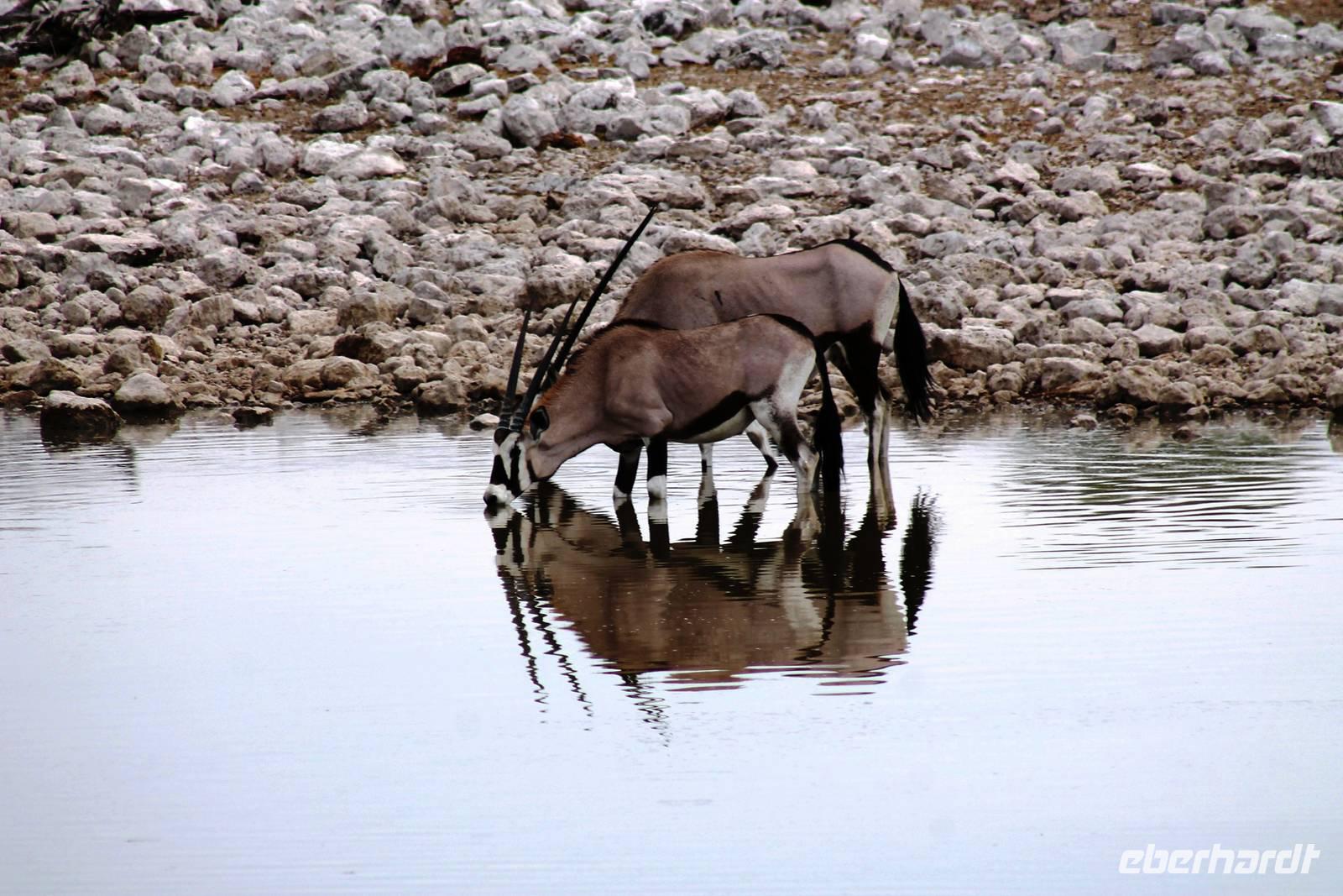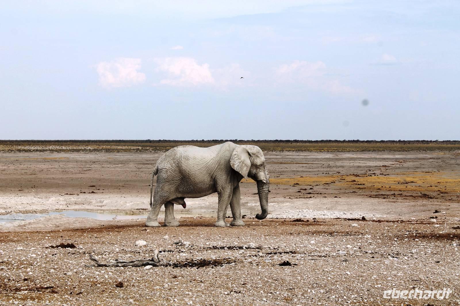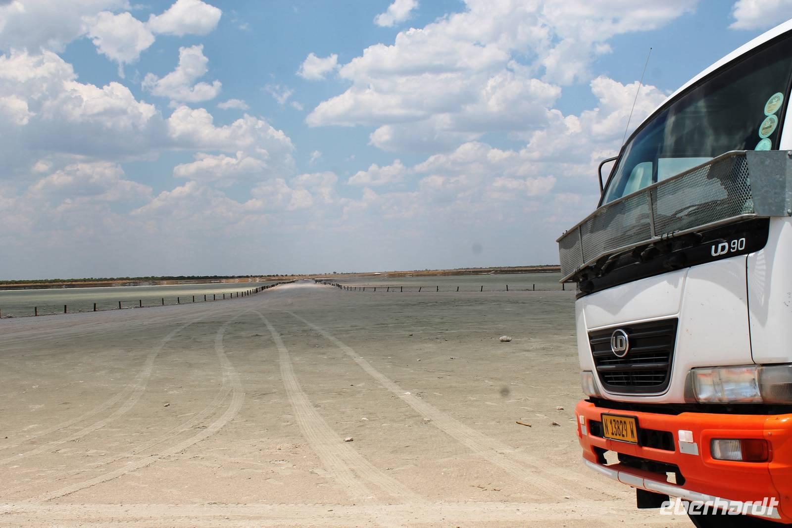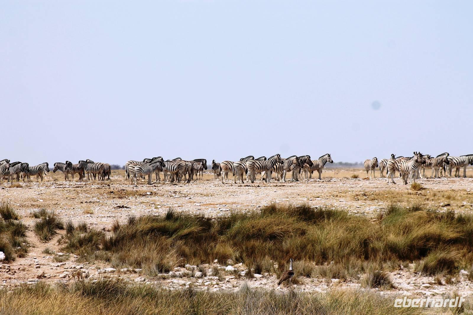 Nach dem zeitigen Frühstück setzten wir unsere Erkundungen im Etosha Nationapark mit unserem Truck fort - Vorteil: erhöhte, bequeme Sitze - Schiebefenster für den pefekten Schnappschuss - kein Staub oder ständiger Fahrtwind - Getränke an Bord. Erste Stationen waren einige Wasserlöcher und das Camp "Okaukuejo". Es gab wieder reichlich zu schauen. Wir beobachteten Springbock- und Impalaherden, Gnus, Strauße, Riesentrappen, natürlich Zebras und Oryxe sowie Kuhantilopen, Nashörner und Elefanten. Später sahen wir eine Ansammlung von Fahrzeugen, also nix wie hin. Juchu, eine Löwendame, die glaube ich, tragend war, saß am Wasser, während die riesige Zebraherde ringsum fast regenslos verharrte. Weitere Löwen sollten folgend. In der Nähe eines anderen Wasserloches hielten zahlreiche Geier eine Versammlung. Der Grund ein verenderter, kleinerer Elefant. Anschließend fuhren wir zum Rand der Etosha-Pfanne, dem Etosha Lookout. Hier stiegen wir aus: strahlend blauer Himmel - weisse, nicht greifbare Weite und nichts als Weite. Einfach faszinierend. Alles erschien unendlich und wir waren mittendrin! Unsere Pause verbrachten wir im Camp Halali, wo die deutschen Truppen auf den nahen Hügel damals einen Heliographen errichteten. Nicht nur am dortigen Wasserloch war Mittagspause, auch wenig Service und Auswahl im Restaurant und im Supermarkt wurde für die zahlreichen Besucher angeboten. Dabei wäre das doch in der Hochsaison eine Goldgrube. Halali kommt übrigens aus dem Deutschen und bedeutet Ende der Jagd. Aber nicht für uns! Am späteren Nachmittag kehrten wir mit spannenden, tierreichen Erlebnissen im Gepäck zu unserer Lodge zurück.