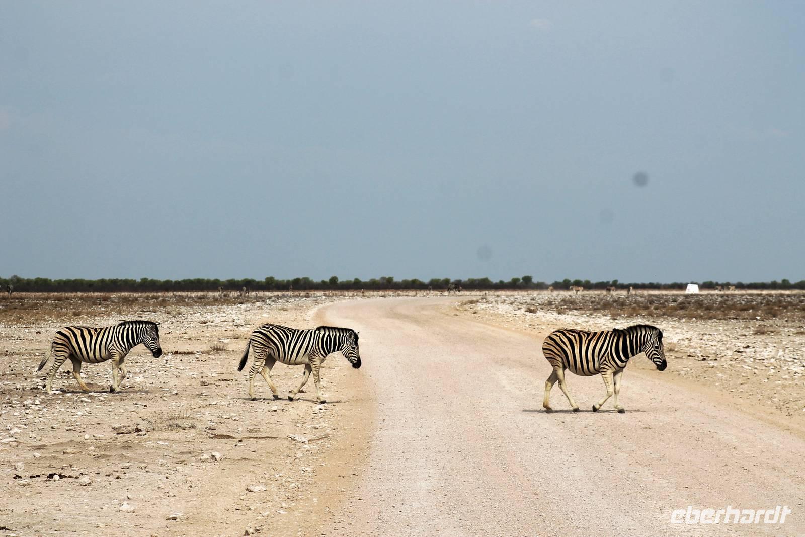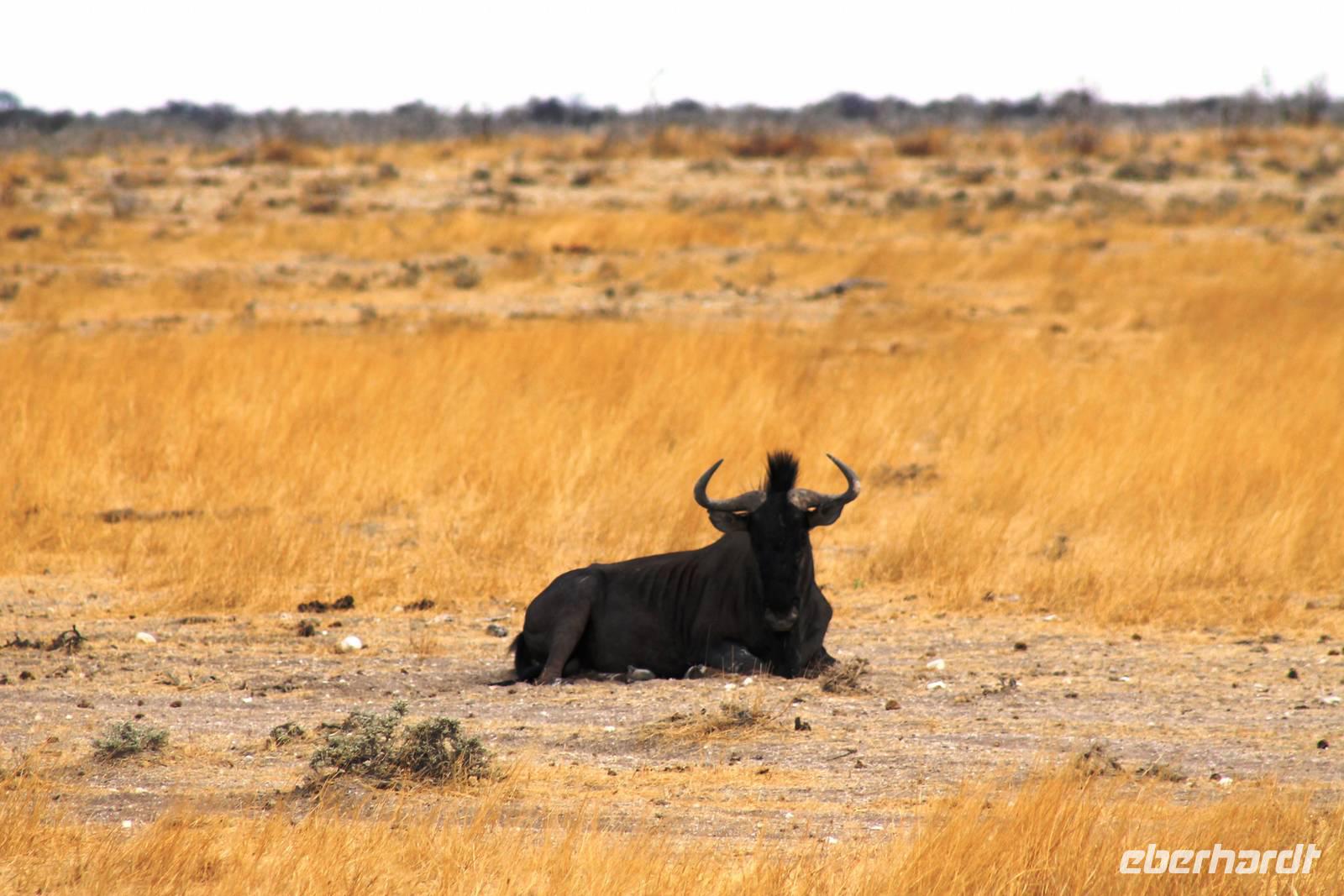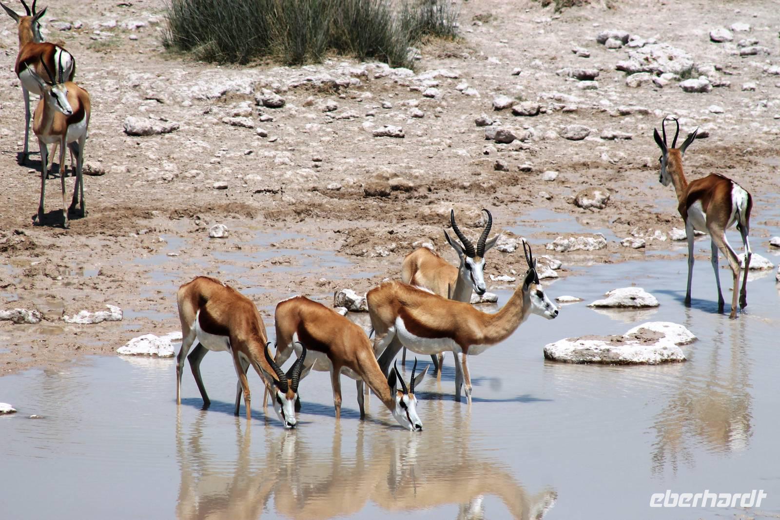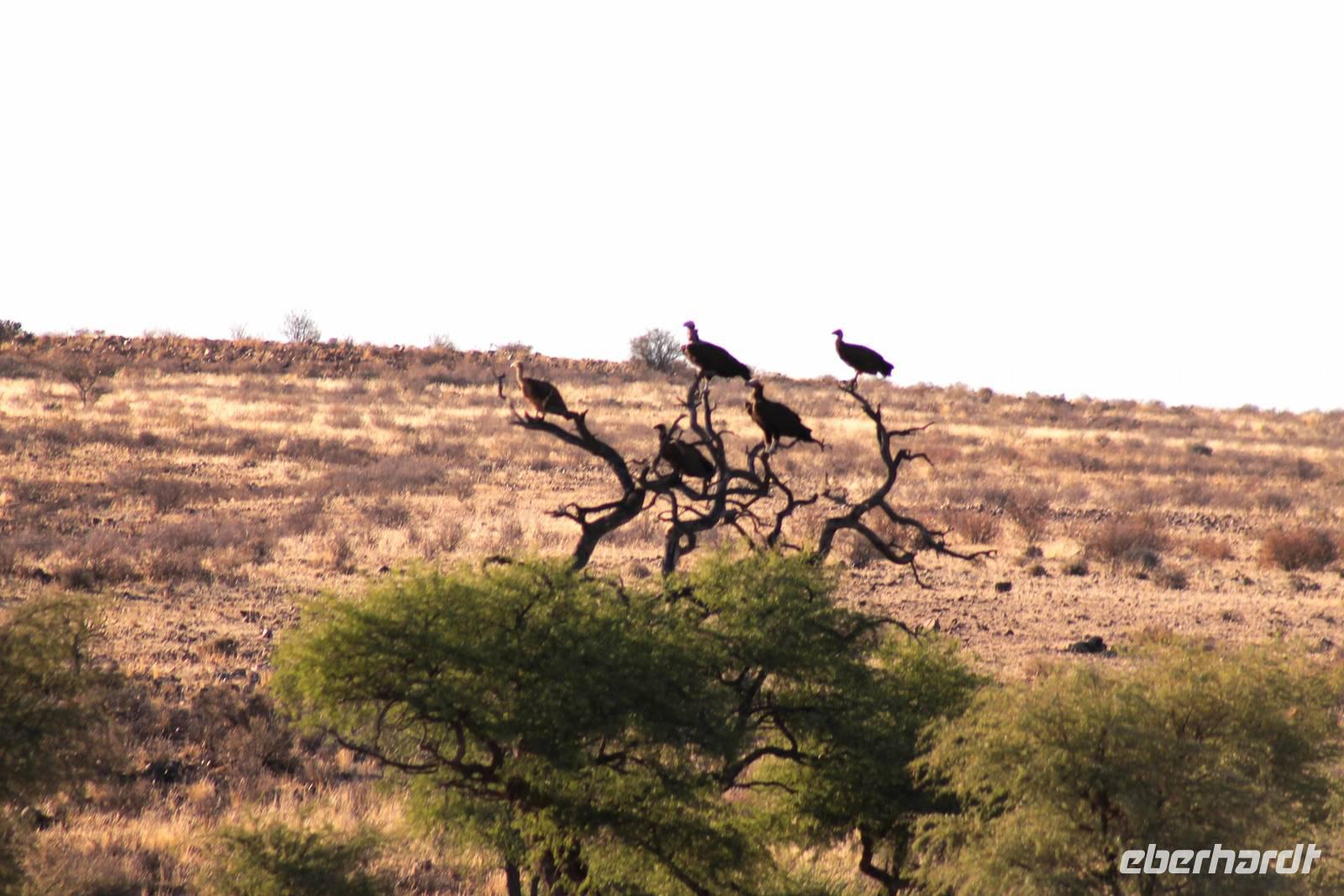 Nach dem zeitigen Frühstück setzten wir unsere Erkundungen im Etosha Nationapark mit unserem Truck fort - Vorteil: erhöhte, bequeme Sitze - Schiebefenster für den pefekten Schnappschuss - kein Staub oder ständiger Fahrtwind - Getränke an Bord. Erste Stationen waren einige Wasserlöcher und das Camp "Okaukuejo". Es gab wieder reichlich zu schauen. Wir beobachteten Springbock- und Impalaherden, Gnus, Strauße, Riesentrappen, natürlich Zebras und Oryxe sowie Kuhantilopen, Nashörner und Elefanten. Später sahen wir eine Ansammlung von Fahrzeugen, also nix wie hin. Juchu, eine Löwendame, die glaube ich, tragend war, saß am Wasser, während die riesige Zebraherde ringsum fast regenslos verharrte. Weitere Löwen sollten folgend. In der Nähe eines anderen Wasserloches hielten zahlreiche Geier eine Versammlung. Der Grund ein verenderter, kleinerer Elefant. Anschließend fuhren wir zum Rand der Etosha-Pfanne, dem Etosha Lookout. Hier stiegen wir aus: strahlend blauer Himmel - weisse, nicht greifbare Weite und nichts als Weite. Einfach faszinierend. Alles erschien unendlich und wir waren mittendrin! Unsere Pause verbrachten wir im Camp Halali, wo die deutschen Truppen auf den nahen Hügel damals einen Heliographen errichteten. Nicht nur am dortigen Wasserloch war Mittagspause, auch wenig Service und Auswahl im Restaurant und im Supermarkt wurde für die zahlreichen Besucher angeboten. Dabei wäre das doch in der Hochsaison eine Goldgrube. Halali kommt übrigens aus dem Deutschen und bedeutet Ende der Jagd. Aber nicht für uns! Am späteren Nachmittag kehrten wir mit spannenden, tierreichen Erlebnissen im Gepäck zu unserer Lodge zurück.