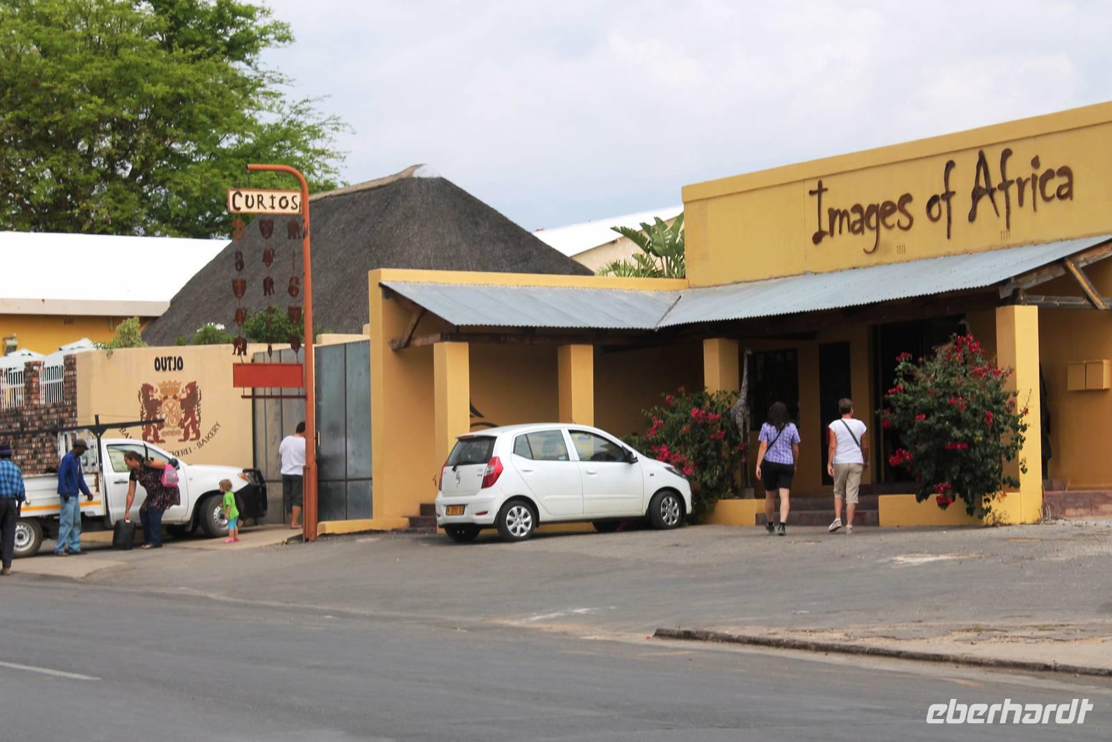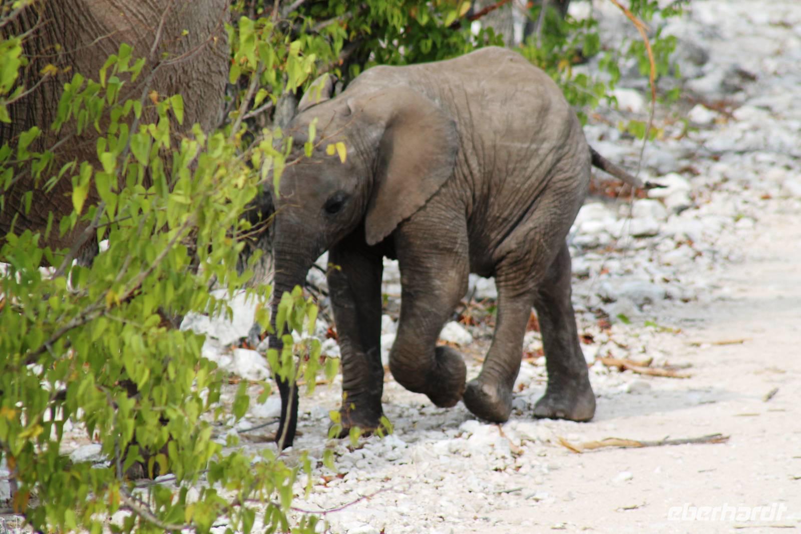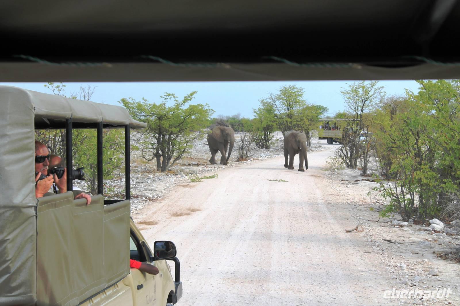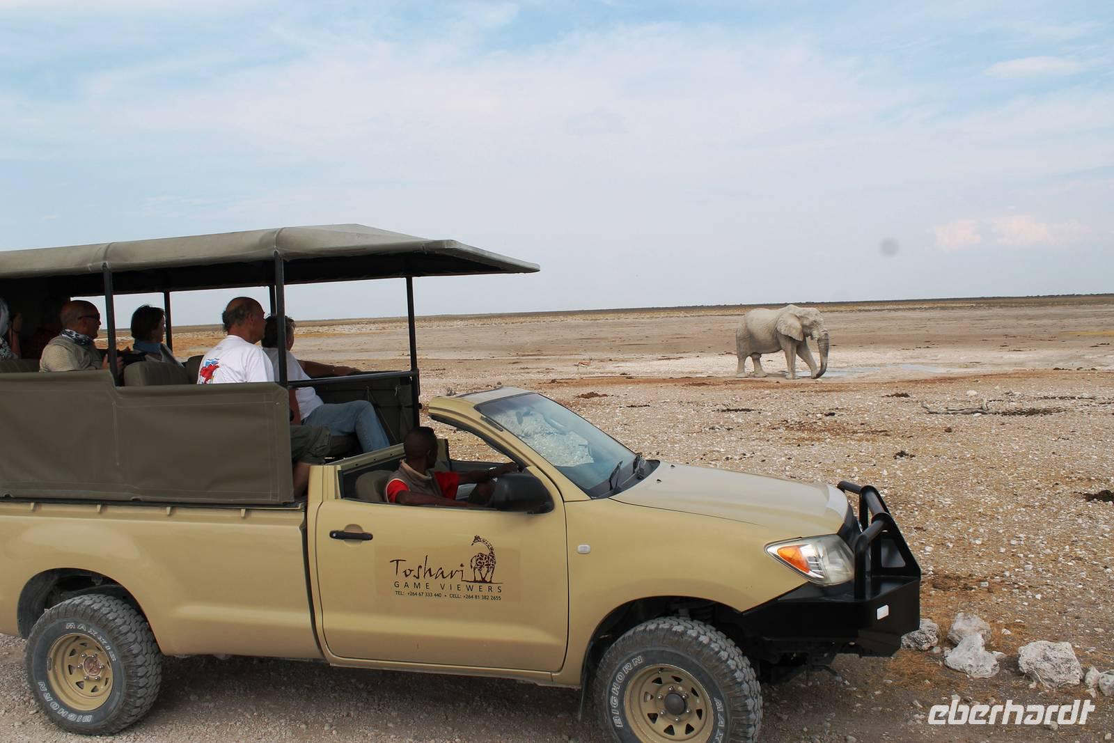 Heute fuhren wir nach Outjio, dem Tor zum Etosha Nationalpark. Dort bummelten wir durch den Ort und stöberten in Geschäften nach dem ein oder anderen Souvenir. In einem kleinen Cafe war dann ein zweiter Kaffee nach dem Frühstück fällig. Ich und Horst konnten den süßen Leckereien nicht widerstehen und nahmen eine Kostprobe der tollen Torten und Kuchen. Bereits am frühen Nachmittag erreichten wir die romantische Toshari Lodge, unweit vom Eingang des Nationalparks. Fast alle Gäste hatten sich für eine optionale erste Pirschfahrt durch Etosha NP entschieden. Mit 2 Jeeps starteten wir voller Erwartungen, die anschließend total erfüllt wurden: Giraffen, Elefanten, Elefanten, Nashörner, Elefanten, Zebras, Kudus, Springböcke, Impalas, Gnus, Tüpfelhyäne...... Sicher habe ich so einiges vergessen. Überwältigt waren wir vom Wasserloch-Date mit weißem Elefant und Nashorn. Später gerieten wir mitten in den Heimmarsch einer Elefantenherde vom Wasserloch. Der Baby-Elefant war besonders knuddelig. Am Abend labten wir uns am vielfältigen Buffet, wurden vom Personal der Lodge bestens unterhalten und ließen den Abend bei sommerlichen Temperaturen an der offenen Bar gemütlich ausklingen.