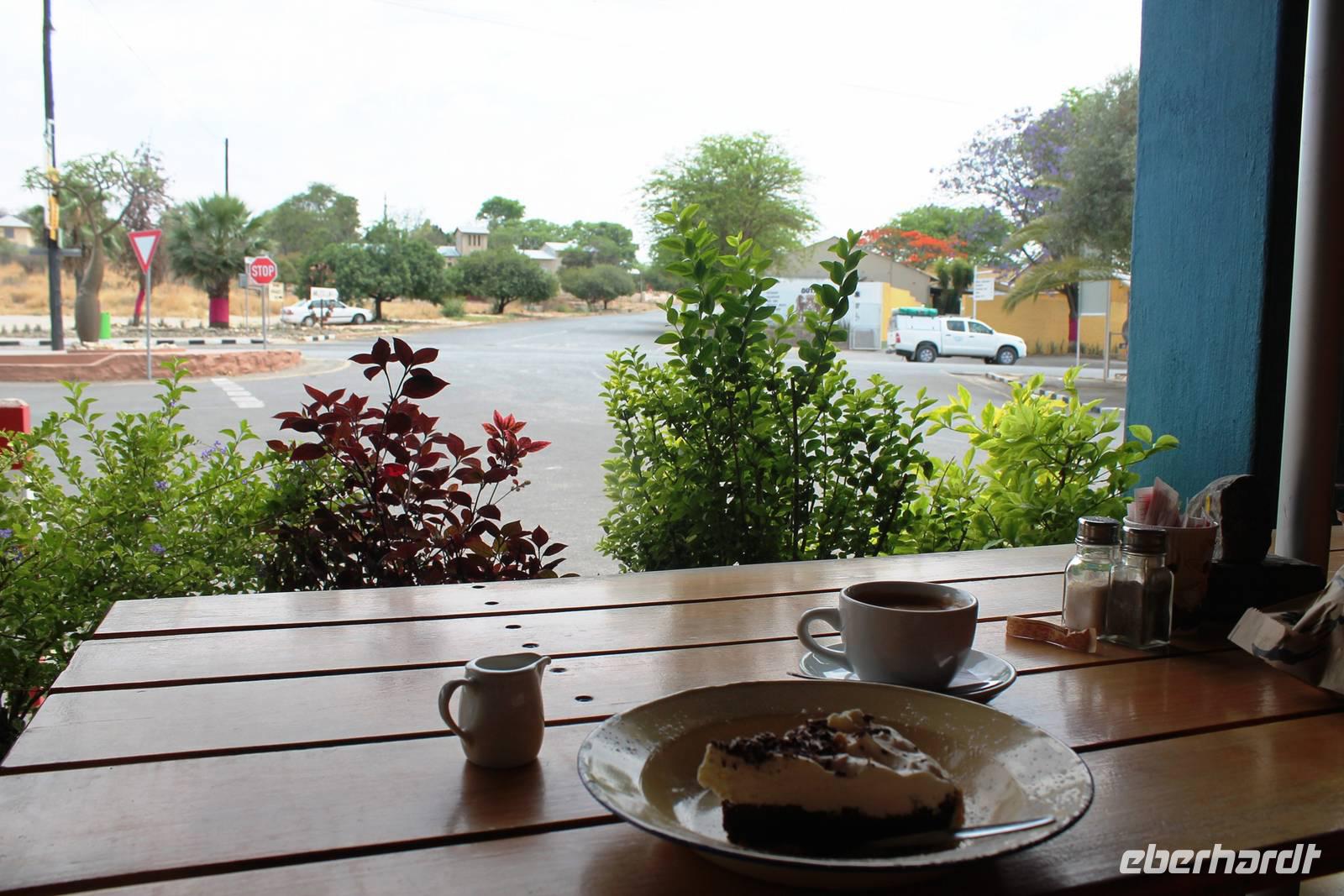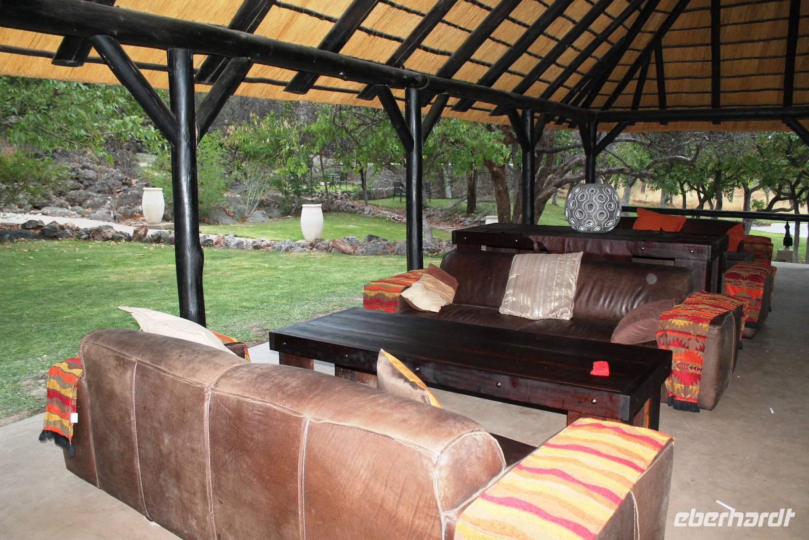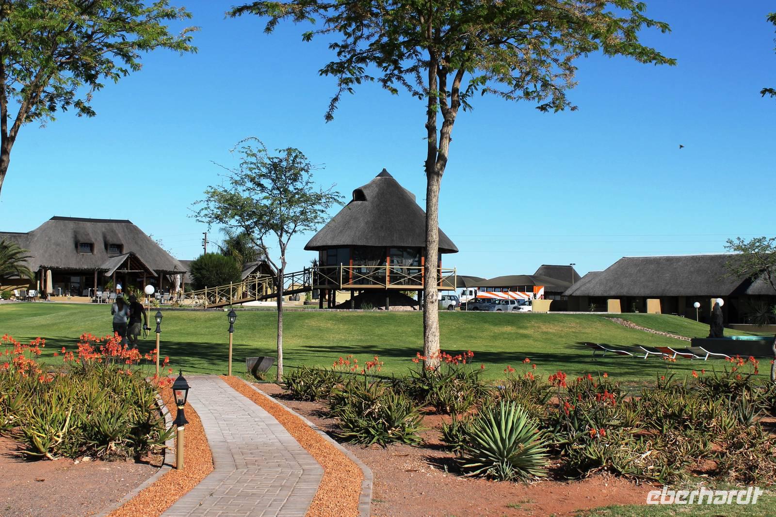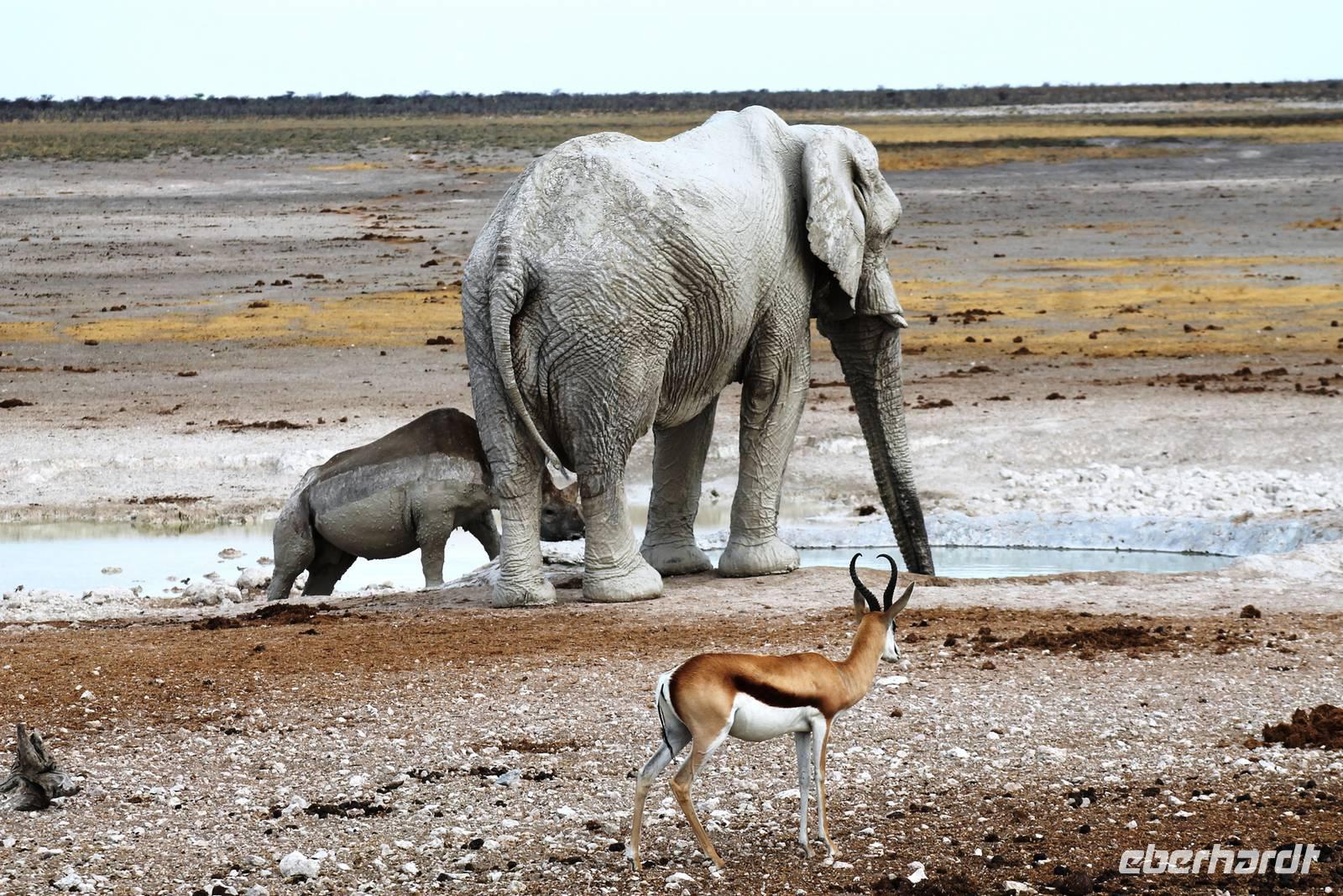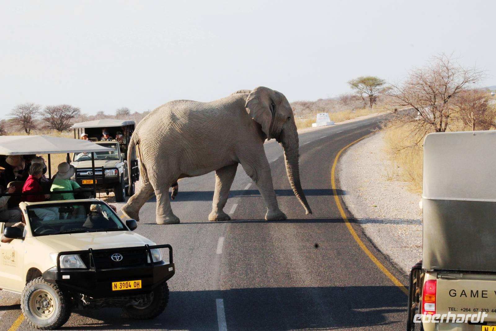 Heute fuhren wir nach Outjio, dem Tor zum Etosha Nationalpark. Dort bummelten wir durch den Ort und stöberten in Geschäften nach dem ein oder anderen Souvenir. In einem kleinen Cafe war dann ein zweiter Kaffee nach dem Frühstück fällig. Ich und Horst konnten den süßen Leckereien nicht widerstehen und nahmen eine Kostprobe der tollen Torten und Kuchen. Bereits am frühen Nachmittag erreichten wir die romantische Toshari Lodge, unweit vom Eingang des Nationalparks. Fast alle Gäste hatten sich für eine optionale erste Pirschfahrt durch Etosha NP entschieden. Mit 2 Jeeps starteten wir voller Erwartungen, die anschließend total erfüllt wurden: Giraffen, Elefanten, Elefanten, Nashörner, Elefanten, Zebras, Kudus, Springböcke, Impalas, Gnus, Tüpfelhyäne...... Sicher habe ich so einiges vergessen. Überwältigt waren wir vom Wasserloch-Date mit weißem Elefant und Nashorn. Später gerieten wir mitten in den Heimmarsch einer Elefantenherde vom Wasserloch. Der Baby-Elefant war besonders knuddelig. Am Abend labten wir uns am vielfältigen Buffet, wurden vom Personal der Lodge bestens unterhalten und ließen den Abend bei sommerlichen Temperaturen an der offenen Bar gemütlich ausklingen.