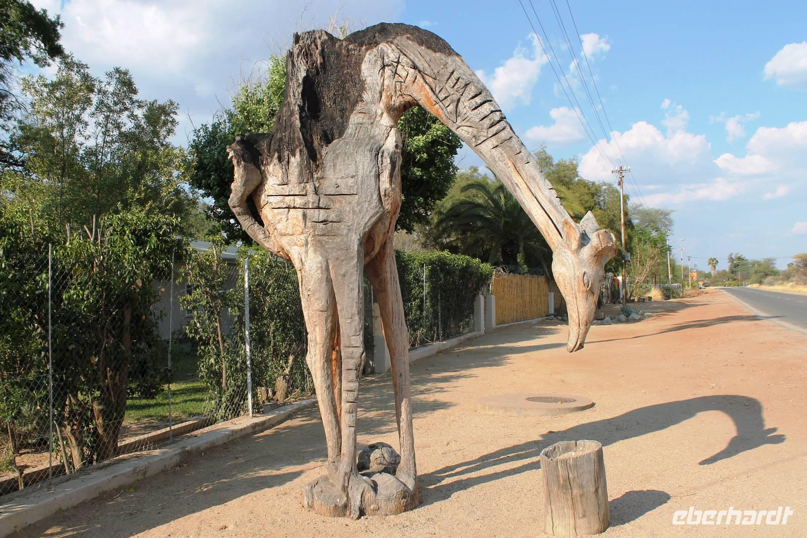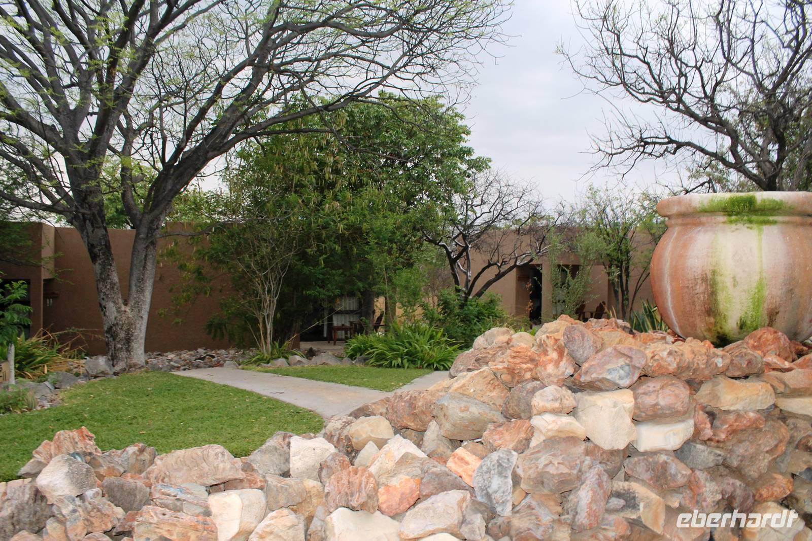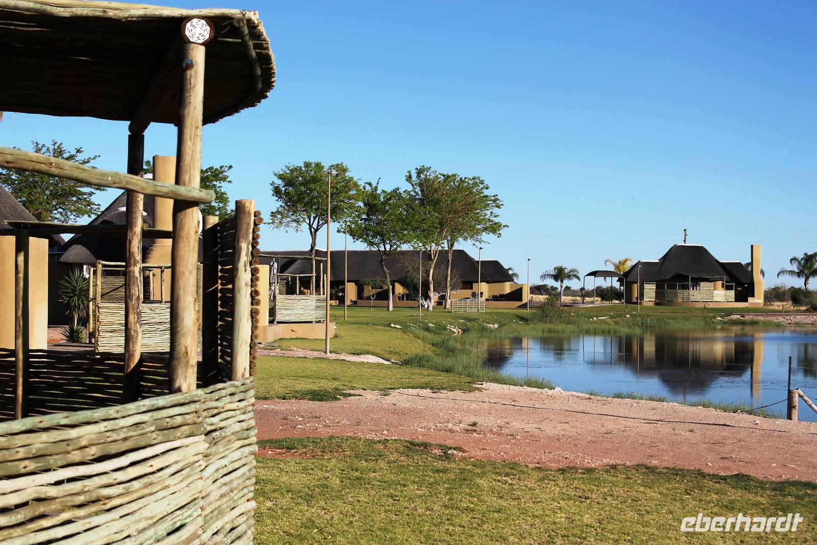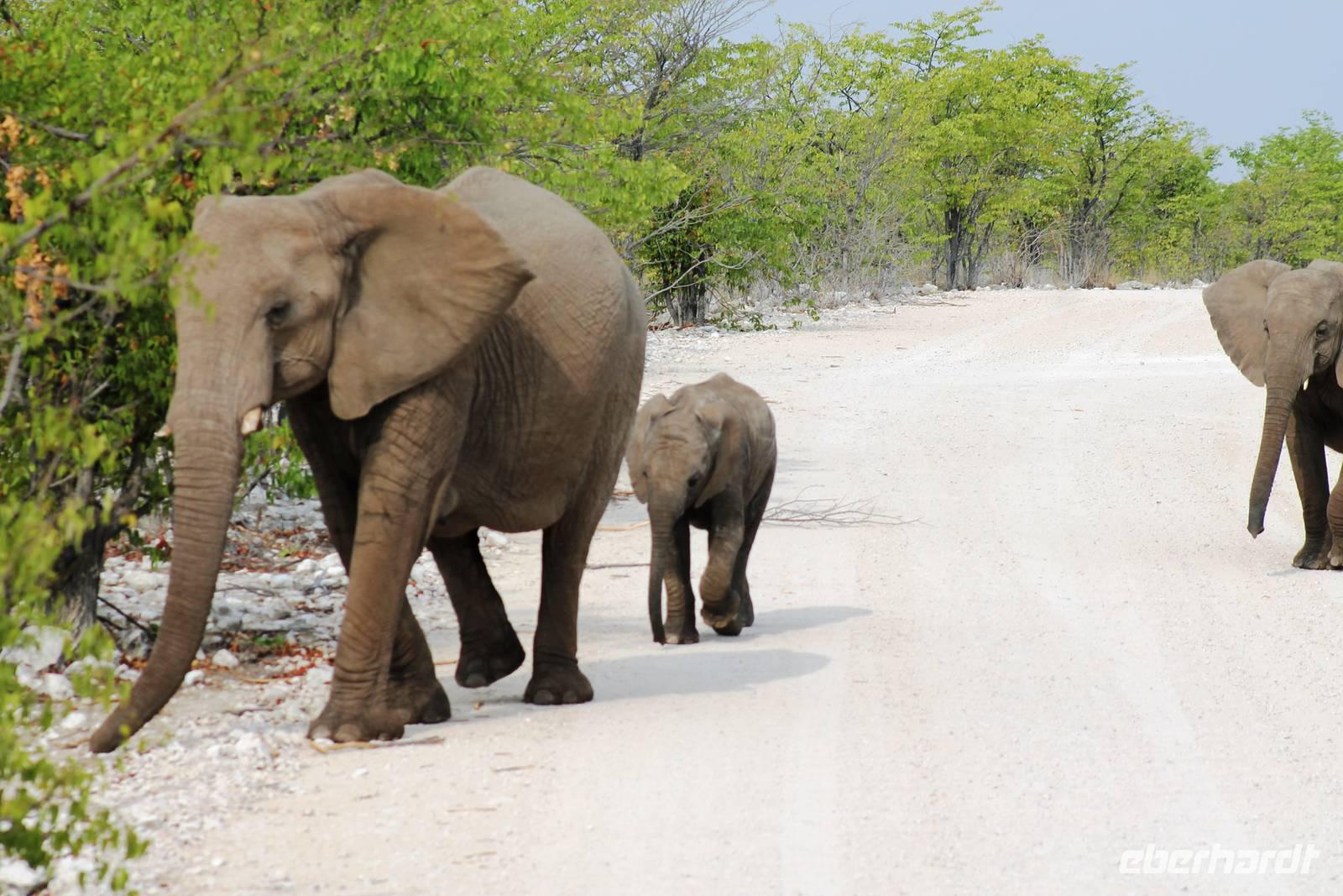 Heute fuhren wir nach Outjio, dem Tor zum Etosha Nationalpark. Dort bummelten wir durch den Ort und stöberten in Geschäften nach dem ein oder anderen Souvenir. In einem kleinen Cafe war dann ein zweiter Kaffee nach dem Frühstück fällig. Ich und Horst konnten den süßen Leckereien nicht widerstehen und nahmen eine Kostprobe der tollen Torten und Kuchen. Bereits am frühen Nachmittag erreichten wir die romantische Toshari Lodge, unweit vom Eingang des Nationalparks. Fast alle Gäste hatten sich für eine optionale erste Pirschfahrt durch Etosha NP entschieden. Mit 2 Jeeps starteten wir voller Erwartungen, die anschließend total erfüllt wurden: Giraffen, Elefanten, Elefanten, Nashörner, Elefanten, Zebras, Kudus, Springböcke, Impalas, Gnus, Tüpfelhyäne...... Sicher habe ich so einiges vergessen. Überwältigt waren wir vom Wasserloch-Date mit weißem Elefant und Nashorn. Später gerieten wir mitten in den Heimmarsch einer Elefantenherde vom Wasserloch. Der Baby-Elefant war besonders knuddelig. Am Abend labten wir uns am vielfältigen Buffet, wurden vom Personal der Lodge bestens unterhalten und ließen den Abend bei sommerlichen Temperaturen an der offenen Bar gemütlich ausklingen.