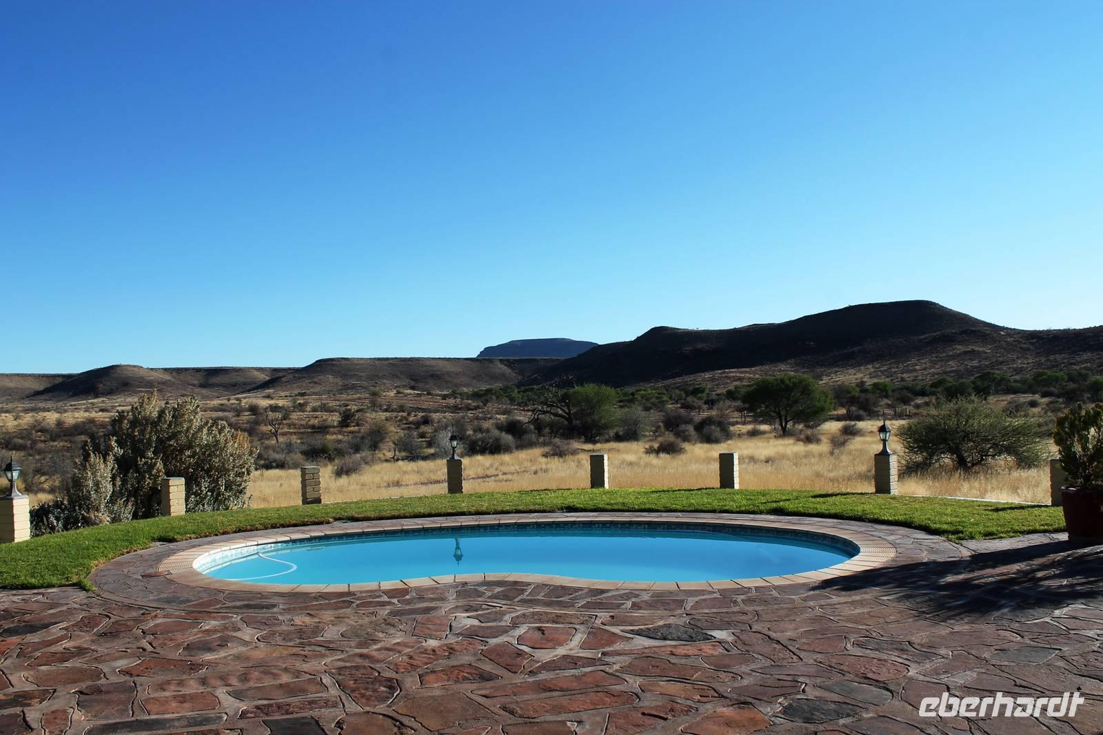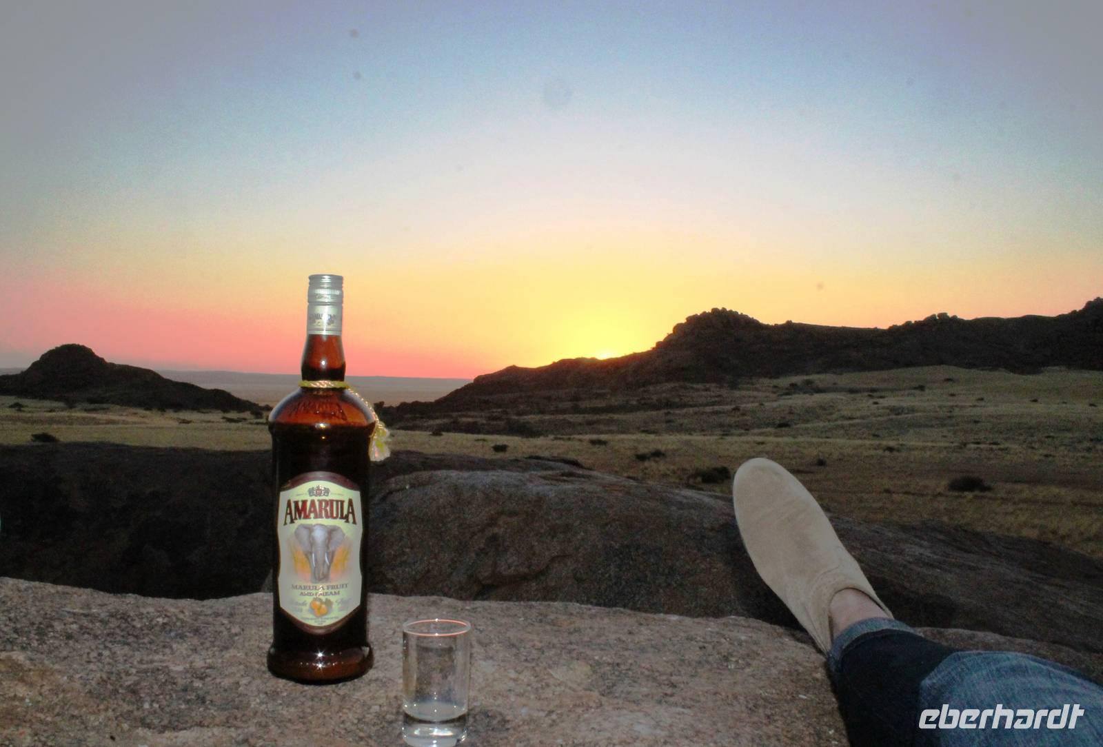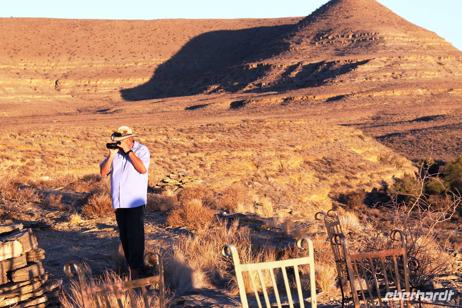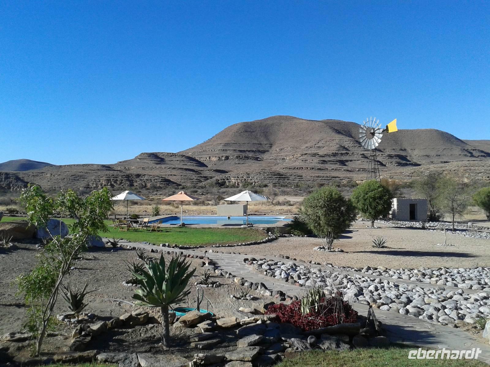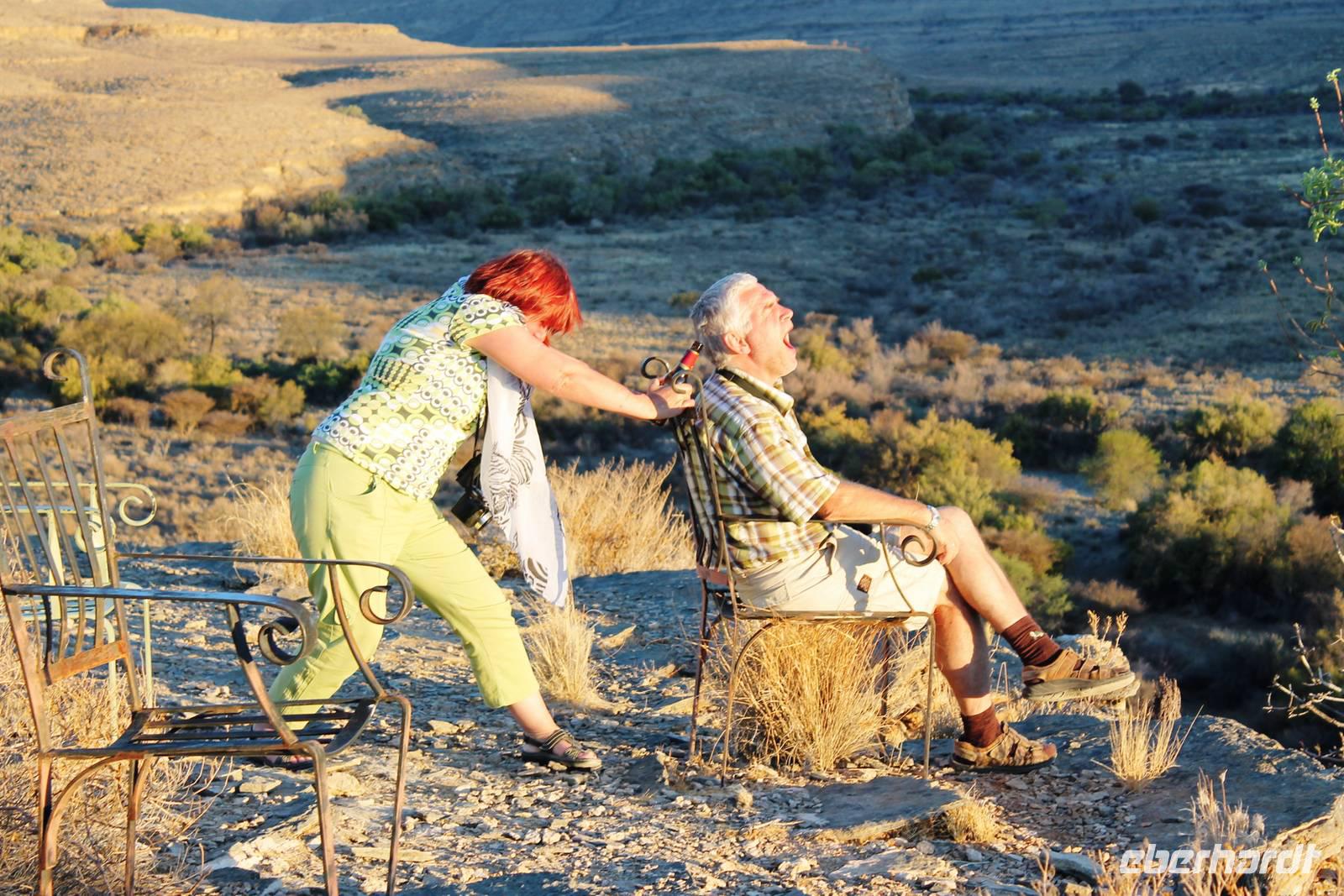 Wie beim Abendessen wurde uns auch zum Frühstück echte Hausmannskost (frisch gebackene Brötchen, leckere Marmelade und würziger Wildschinken und Rührei vom Feinsten) serviert und alle halfen mit. Anschließend zeigte uns Jörg noch sein "Anwesen" rund ums Farmhaus. 3 seiner 4 Kinder unterstützten ihn tatkräftig dabei. Der jüngste Spross ist noch zu klein und bleibt lieber bei Mama Michelle im Tragetuch. Man merkte, dass Jörg mächtig stolz ist, auf das was er an Ideen Stück für Stück umsetzt: Solarkocher, solare Stromerzeugung, seinen ökologischen Gemüsengarten, wo auch grüner Spargel wächst und seine eigene Fischzucht, weitab Seen und Meeren. Auch seine Kinder sind voll bei der Sache, obwohl Spielen und Lachen, manchmal auch Streiten dazu gehören. Sie werden zu Hause unterrichtet, ihr Spielplatz ist die Natur, Fernseher Fehlanzeige. Man spürt sie und die ganze Familie sind glücklich, beneidenswert! Nehmen wir ein kleines Stück dieses einfachen, puren Glücks mit in unsere Konsumgesellschaft mit und verschenken es! Wir sagen Danke, wünschen alles Gute und verabschieden uns herzlich von dieser super Familie und den besonderen Momenten, die wir auf der Farm Dabis erleben konnten. Am Mittag brachen wir zum Zebra Mountain Park auf, unserer nächsten Station. Später am "Verkehrsknotenpunkt" Maltahöhe, einer ehemaligen Station der deutschen Schutztruppe, machten wir halt und durchstöberten den Kramladen der Tankstelle im Ort und verewigten uns an den Wänden. Der Slogan: „Maltahöhe liegt nicht am A.... der Welt, aber man kann ihn sehen" ist äußerst passend für den Ort. Mutter Natur rauschte wieder an uns vorbei und nach kurviger, bergiger Anfahrt mit unserem Truck fanden wir das versteckte Paradies, die Zebra River Lodge. Nach dem wir uns in unseren schönen Zimmern und Steinchalets häuslich eingerichtet hatten, die herrliche Umgebung bestaunten und fotografierten, bei Kaffee und Kuchen entspannten, stürzten wir uns bei herrlichen Sonnenschein ins Pool. Am späten Nachmittag wartete eine Überraschung auf uns. Zum Sonnenuntergang (Sundowner) wurden wir auf ein Bergplateau entführt. Dort wurde eigens für uns eine Bar aufgebaut, denn in der Wüste ist noch kein Eberhardt-Gast verdurstet. Mit passenden Drinks und Snacks genossen wir die untergehende Sonne mit einer fantastischen Aussicht. Es war einfach traumhaft. Das Menü am Abend wurde uns von einer netten, jungen Dame auf Nama schmackhaft gemacht und Horst übersetzte.... Unterhaltsam wurde der gemütliche Abend auf der Terrasse mit Gesangs- und Showeinlagen vom Personal, Horst und Annett fortgesetzt.