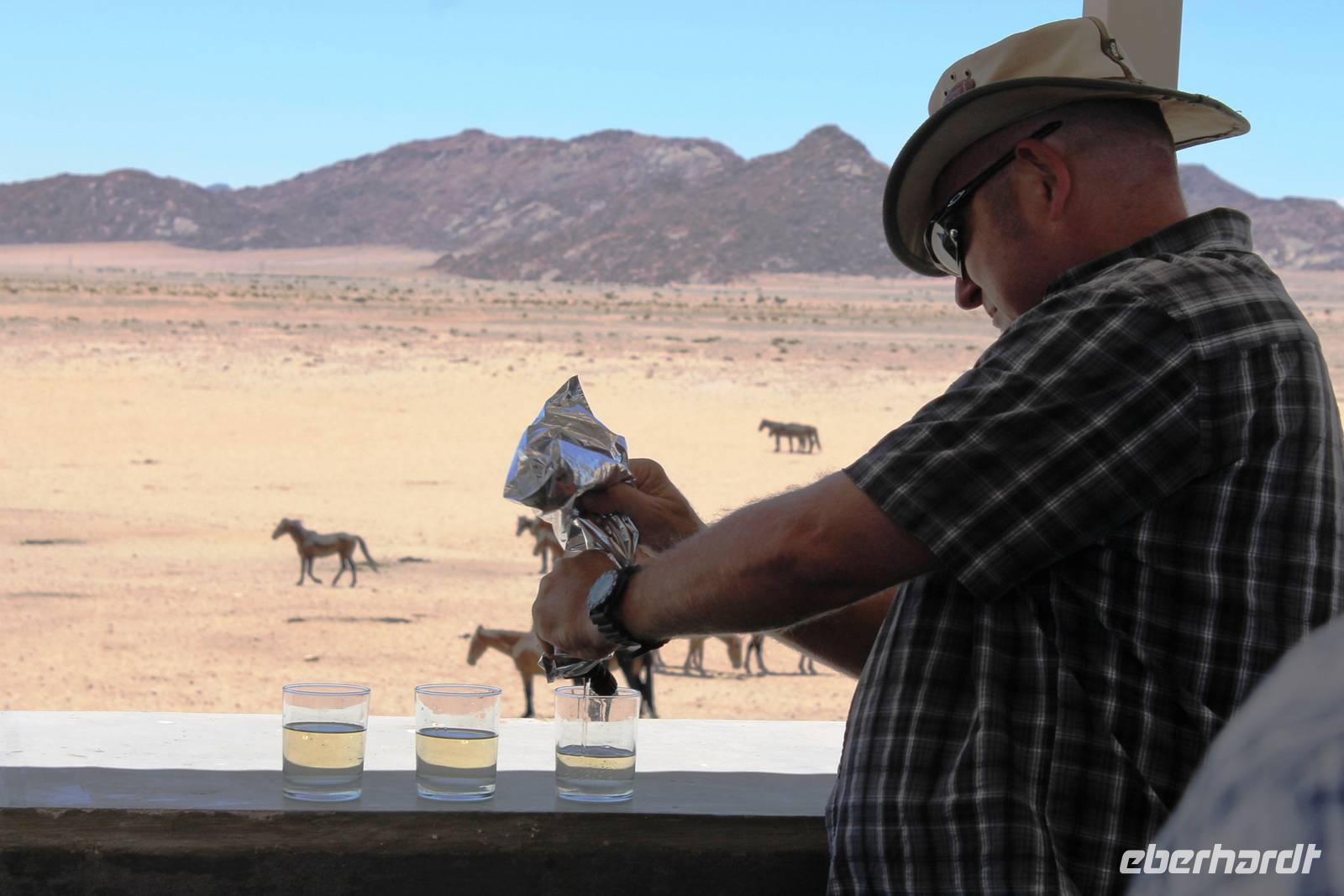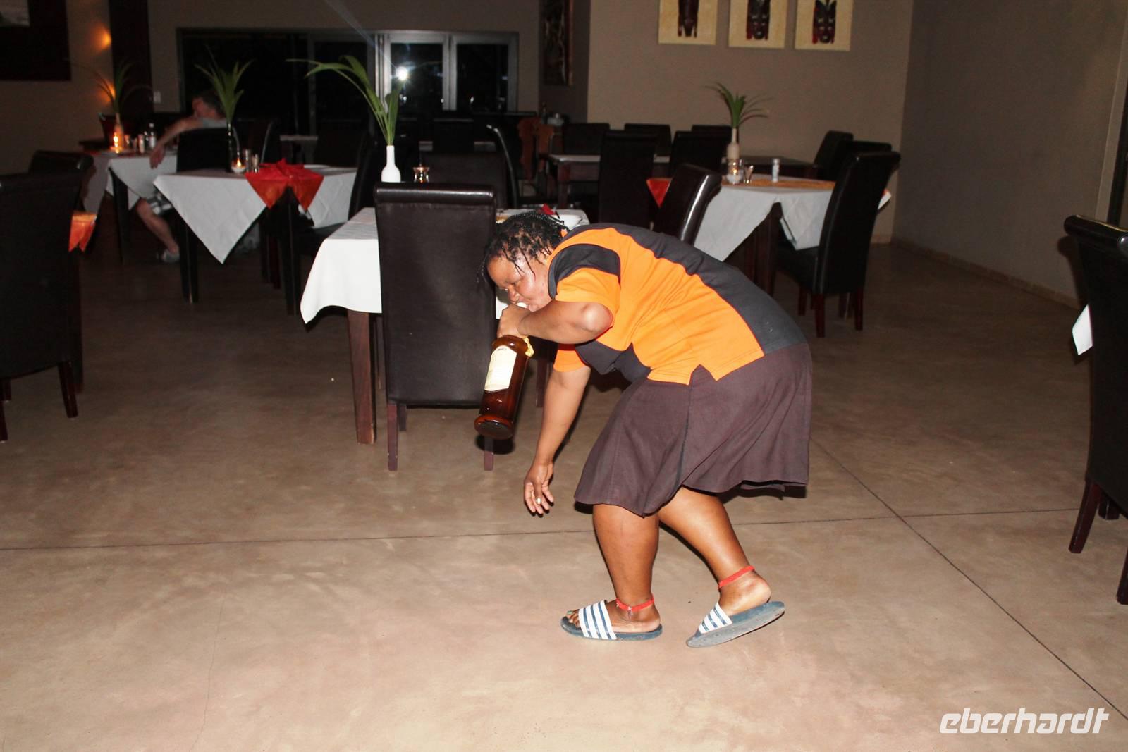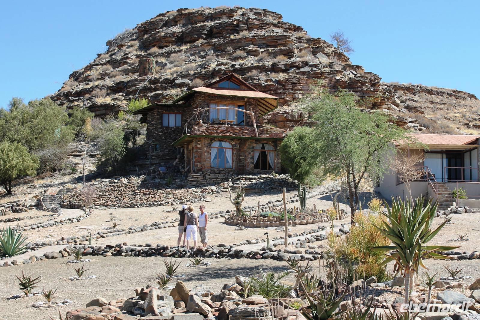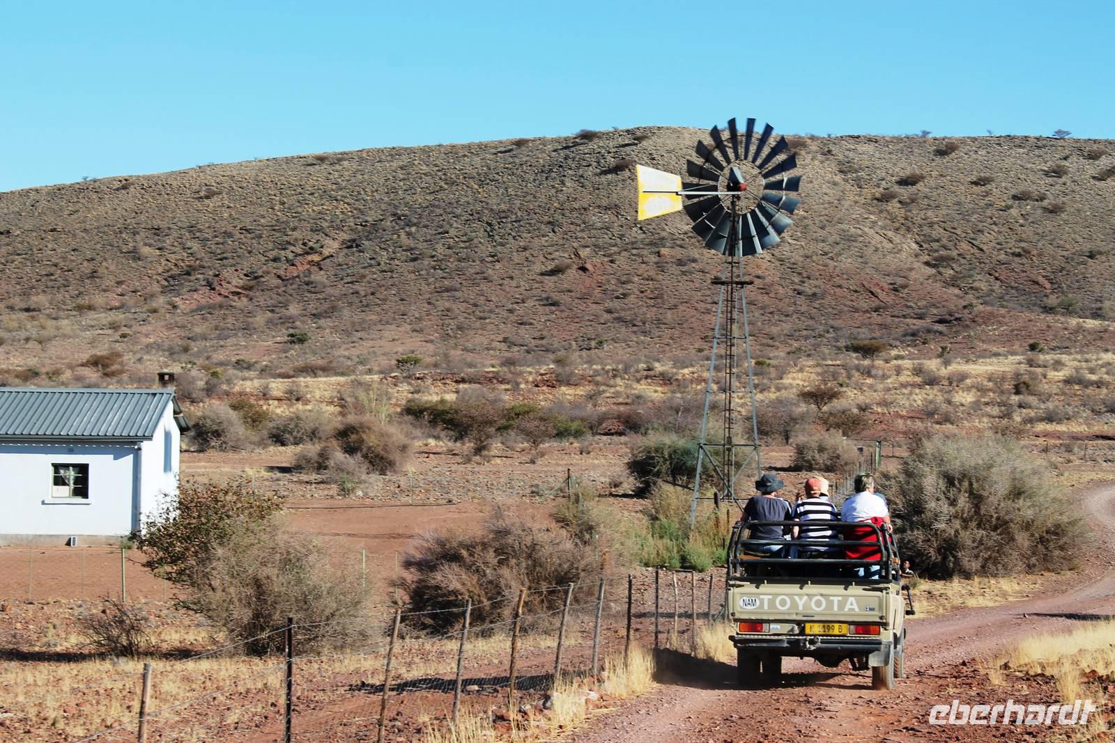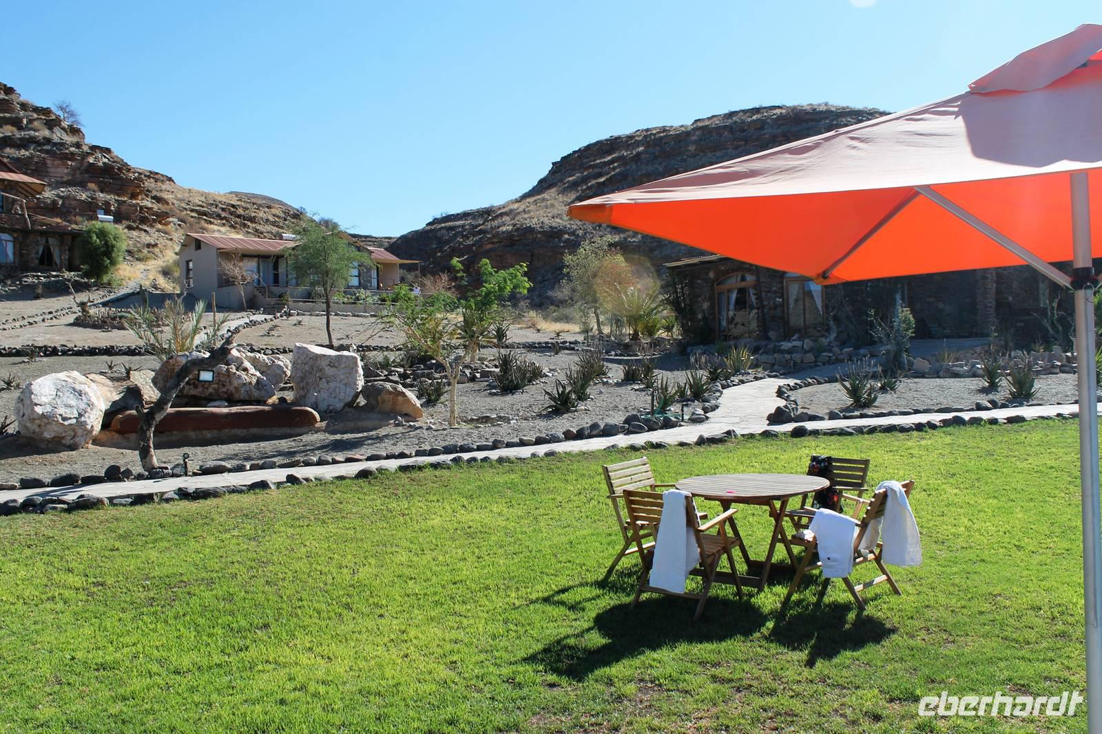 Wie beim Abendessen wurde uns auch zum Frühstück echte Hausmannskost (frisch gebackene Brötchen, leckere Marmelade und würziger Wildschinken und Rührei vom Feinsten) serviert und alle halfen mit. Anschließend zeigte uns Jörg noch sein "Anwesen" rund ums Farmhaus. 3 seiner 4 Kinder unterstützten ihn tatkräftig dabei. Der jüngste Spross ist noch zu klein und bleibt lieber bei Mama Michelle im Tragetuch. Man merkte, dass Jörg mächtig stolz ist, auf das was er an Ideen Stück für Stück umsetzt: Solarkocher, solare Stromerzeugung, seinen ökologischen Gemüsengarten, wo auch grüner Spargel wächst und seine eigene Fischzucht, weitab Seen und Meeren. Auch seine Kinder sind voll bei der Sache, obwohl Spielen und Lachen, manchmal auch Streiten dazu gehören. Sie werden zu Hause unterrichtet, ihr Spielplatz ist die Natur, Fernseher Fehlanzeige. Man spürt sie und die ganze Familie sind glücklich, beneidenswert! Nehmen wir ein kleines Stück dieses einfachen, puren Glücks mit in unsere Konsumgesellschaft mit und verschenken es! Wir sagen Danke, wünschen alles Gute und verabschieden uns herzlich von dieser super Familie und den besonderen Momenten, die wir auf der Farm Dabis erleben konnten. Am Mittag brachen wir zum Zebra Mountain Park auf, unserer nächsten Station. Später am "Verkehrsknotenpunkt" Maltahöhe, einer ehemaligen Station der deutschen Schutztruppe, machten wir halt und durchstöberten den Kramladen der Tankstelle im Ort und verewigten uns an den Wänden. Der Slogan: „Maltahöhe liegt nicht am A.... der Welt, aber man kann ihn sehen" ist äußerst passend für den Ort. Mutter Natur rauschte wieder an uns vorbei und nach kurviger, bergiger Anfahrt mit unserem Truck fanden wir das versteckte Paradies, die Zebra River Lodge. Nach dem wir uns in unseren schönen Zimmern und Steinchalets häuslich eingerichtet hatten, die herrliche Umgebung bestaunten und fotografierten, bei Kaffee und Kuchen entspannten, stürzten wir uns bei herrlichen Sonnenschein ins Pool. Am späten Nachmittag wartete eine Überraschung auf uns. Zum Sonnenuntergang (Sundowner) wurden wir auf ein Bergplateau entführt. Dort wurde eigens für uns eine Bar aufgebaut, denn in der Wüste ist noch kein Eberhardt-Gast verdurstet. Mit passenden Drinks und Snacks genossen wir die untergehende Sonne mit einer fantastischen Aussicht. Es war einfach traumhaft. Das Menü am Abend wurde uns von einer netten, jungen Dame auf Nama schmackhaft gemacht und Horst übersetzte.... Unterhaltsam wurde der gemütliche Abend auf der Terrasse mit Gesangs- und Showeinlagen vom Personal, Horst und Annett fortgesetzt.