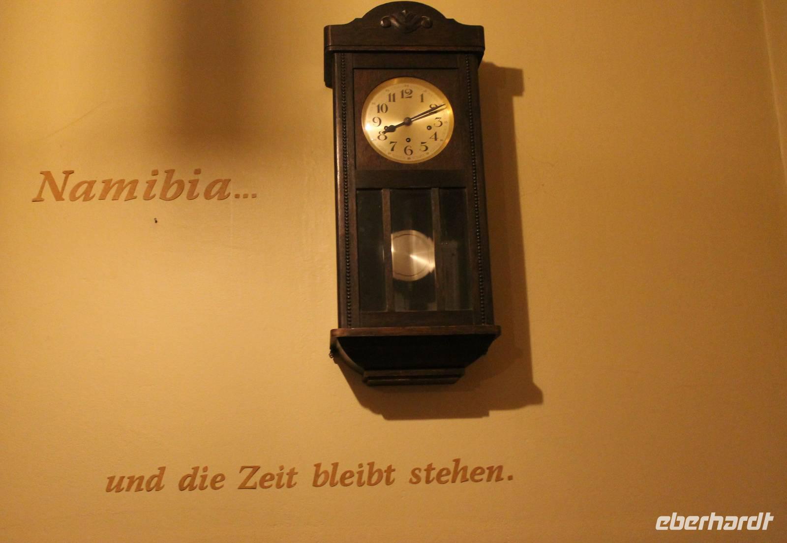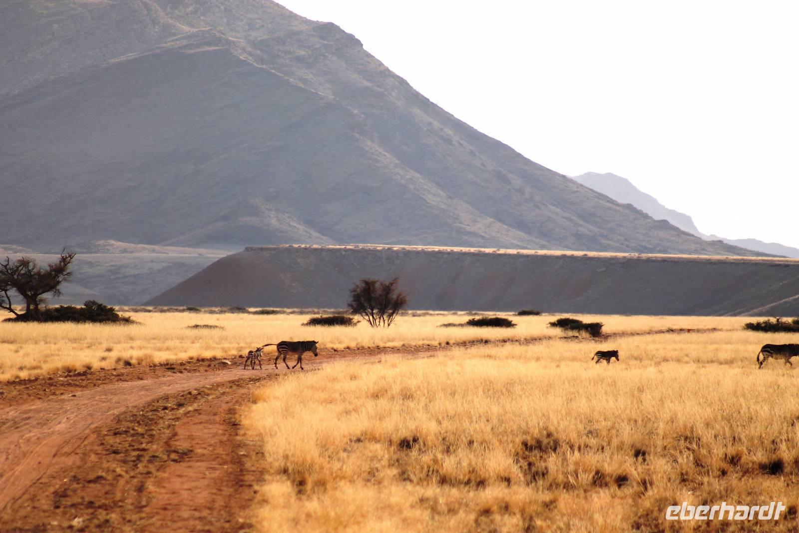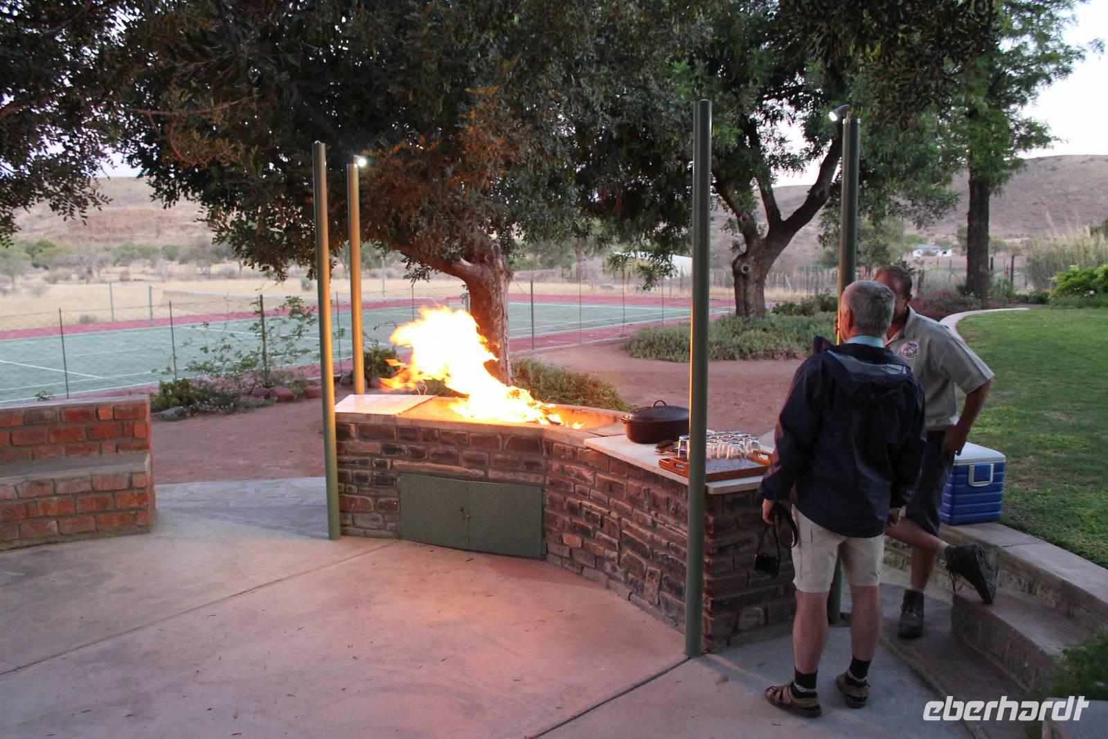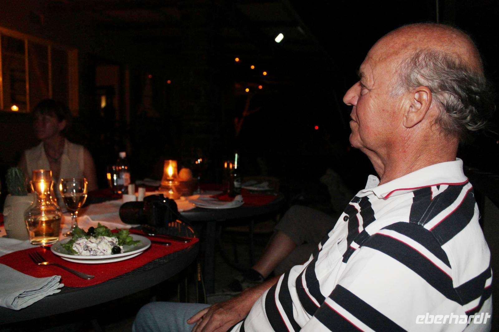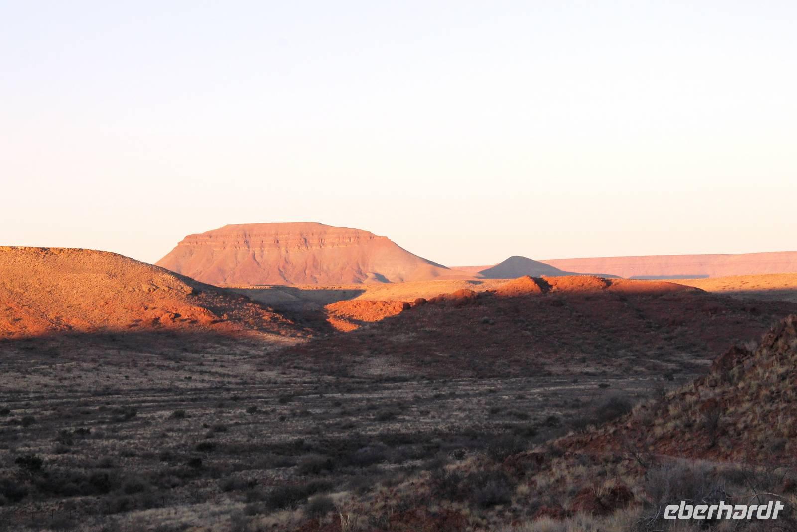 Wie beim Abendessen wurde uns auch zum Frühstück echte Hausmannskost (frisch gebackene Brötchen, leckere Marmelade und würziger Wildschinken und Rührei vom Feinsten) serviert und alle halfen mit. Anschließend zeigte uns Jörg noch sein "Anwesen" rund ums Farmhaus. 3 seiner 4 Kinder unterstützten ihn tatkräftig dabei. Der jüngste Spross ist noch zu klein und bleibt lieber bei Mama Michelle im Tragetuch. Man merkte, dass Jörg mächtig stolz ist, auf das was er an Ideen Stück für Stück umsetzt: Solarkocher, solare Stromerzeugung, seinen ökologischen Gemüsengarten, wo auch grüner Spargel wächst und seine eigene Fischzucht, weitab Seen und Meeren. Auch seine Kinder sind voll bei der Sache, obwohl Spielen und Lachen, manchmal auch Streiten dazu gehören. Sie werden zu Hause unterrichtet, ihr Spielplatz ist die Natur, Fernseher Fehlanzeige. Man spürt sie und die ganze Familie sind glücklich, beneidenswert! Nehmen wir ein kleines Stück dieses einfachen, puren Glücks mit in unsere Konsumgesellschaft mit und verschenken es! Wir sagen Danke, wünschen alles Gute und verabschieden uns herzlich von dieser super Familie und den besonderen Momenten, die wir auf der Farm Dabis erleben konnten. Am Mittag brachen wir zum Zebra Mountain Park auf, unserer nächsten Station. Später am "Verkehrsknotenpunkt" Maltahöhe, einer ehemaligen Station der deutschen Schutztruppe, machten wir halt und durchstöberten den Kramladen der Tankstelle im Ort und verewigten uns an den Wänden. Der Slogan: „Maltahöhe liegt nicht am A.... der Welt, aber man kann ihn sehen" ist äußerst passend für den Ort. Mutter Natur rauschte wieder an uns vorbei und nach kurviger, bergiger Anfahrt mit unserem Truck fanden wir das versteckte Paradies, die Zebra River Lodge. Nach dem wir uns in unseren schönen Zimmern und Steinchalets häuslich eingerichtet hatten, die herrliche Umgebung bestaunten und fotografierten, bei Kaffee und Kuchen entspannten, stürzten wir uns bei herrlichen Sonnenschein ins Pool. Am späten Nachmittag wartete eine Überraschung auf uns. Zum Sonnenuntergang (Sundowner) wurden wir auf ein Bergplateau entführt. Dort wurde eigens für uns eine Bar aufgebaut, denn in der Wüste ist noch kein Eberhardt-Gast verdurstet. Mit passenden Drinks und Snacks genossen wir die untergehende Sonne mit einer fantastischen Aussicht. Es war einfach traumhaft. Das Menü am Abend wurde uns von einer netten, jungen Dame auf Nama schmackhaft gemacht und Horst übersetzte.... Unterhaltsam wurde der gemütliche Abend auf der Terrasse mit Gesangs- und Showeinlagen vom Personal, Horst und Annett fortgesetzt.