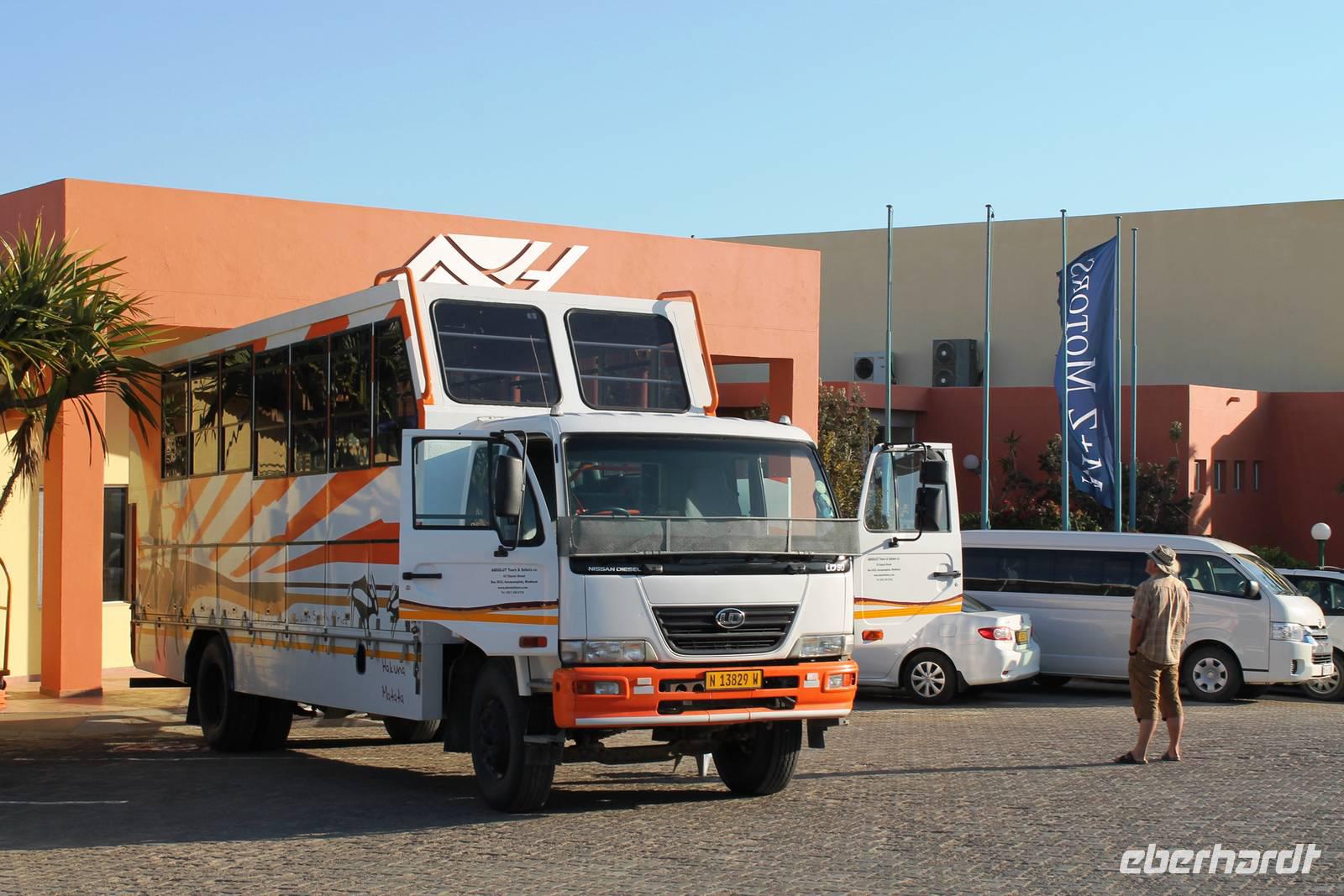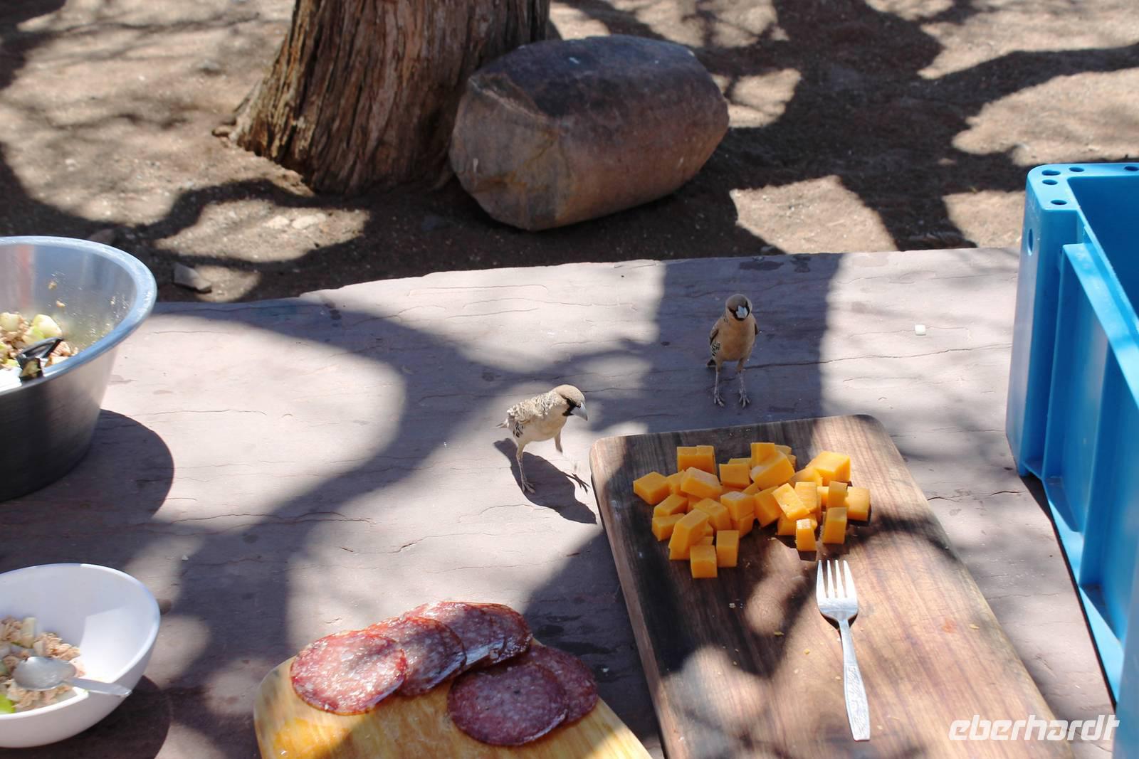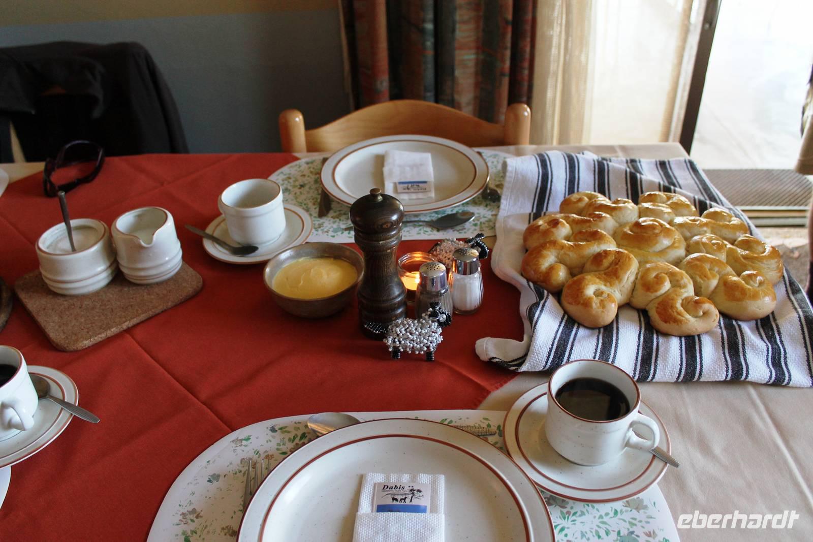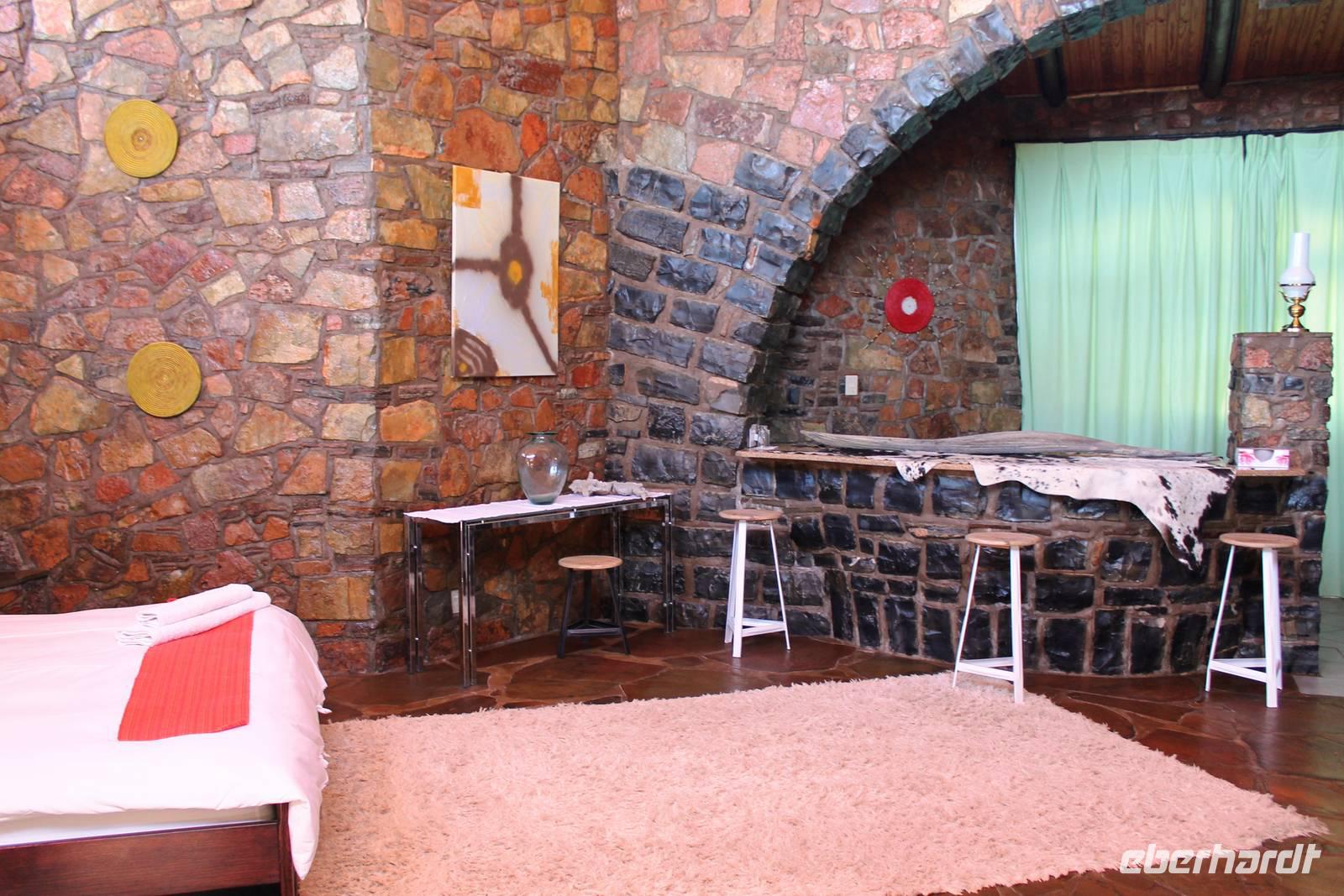 Wie beim Abendessen wurde uns auch zum Frühstück echte Hausmannskost (frisch gebackene Brötchen, leckere Marmelade und würziger Wildschinken und Rührei vom Feinsten) serviert und alle halfen mit. Anschließend zeigte uns Jörg noch sein "Anwesen" rund ums Farmhaus. 3 seiner 4 Kinder unterstützten ihn tatkräftig dabei. Der jüngste Spross ist noch zu klein und bleibt lieber bei Mama Michelle im Tragetuch. Man merkte, dass Jörg mächtig stolz ist, auf das was er an Ideen Stück für Stück umsetzt: Solarkocher, solare Stromerzeugung, seinen ökologischen Gemüsengarten, wo auch grüner Spargel wächst und seine eigene Fischzucht, weitab Seen und Meeren. Auch seine Kinder sind voll bei der Sache, obwohl Spielen und Lachen, manchmal auch Streiten dazu gehören. Sie werden zu Hause unterrichtet, ihr Spielplatz ist die Natur, Fernseher Fehlanzeige. Man spürt sie und die ganze Familie sind glücklich, beneidenswert! Nehmen wir ein kleines Stück dieses einfachen, puren Glücks mit in unsere Konsumgesellschaft mit und verschenken es! Wir sagen Danke, wünschen alles Gute und verabschieden uns herzlich von dieser super Familie und den besonderen Momenten, die wir auf der Farm Dabis erleben konnten. Am Mittag brachen wir zum Zebra Mountain Park auf, unserer nächsten Station. Später am "Verkehrsknotenpunkt" Maltahöhe, einer ehemaligen Station der deutschen Schutztruppe, machten wir halt und durchstöberten den Kramladen der Tankstelle im Ort und verewigten uns an den Wänden. Der Slogan: „Maltahöhe liegt nicht am A.... der Welt, aber man kann ihn sehen" ist äußerst passend für den Ort. Mutter Natur rauschte wieder an uns vorbei und nach kurviger, bergiger Anfahrt mit unserem Truck fanden wir das versteckte Paradies, die Zebra River Lodge. Nach dem wir uns in unseren schönen Zimmern und Steinchalets häuslich eingerichtet hatten, die herrliche Umgebung bestaunten und fotografierten, bei Kaffee und Kuchen entspannten, stürzten wir uns bei herrlichen Sonnenschein ins Pool. Am späten Nachmittag wartete eine Überraschung auf uns. Zum Sonnenuntergang (Sundowner) wurden wir auf ein Bergplateau entführt. Dort wurde eigens für uns eine Bar aufgebaut, denn in der Wüste ist noch kein Eberhardt-Gast verdurstet. Mit passenden Drinks und Snacks genossen wir die untergehende Sonne mit einer fantastischen Aussicht. Es war einfach traumhaft. Das Menü am Abend wurde uns von einer netten, jungen Dame auf Nama schmackhaft gemacht und Horst übersetzte.... Unterhaltsam wurde der gemütliche Abend auf der Terrasse mit Gesangs- und Showeinlagen vom Personal, Horst und Annett fortgesetzt.
