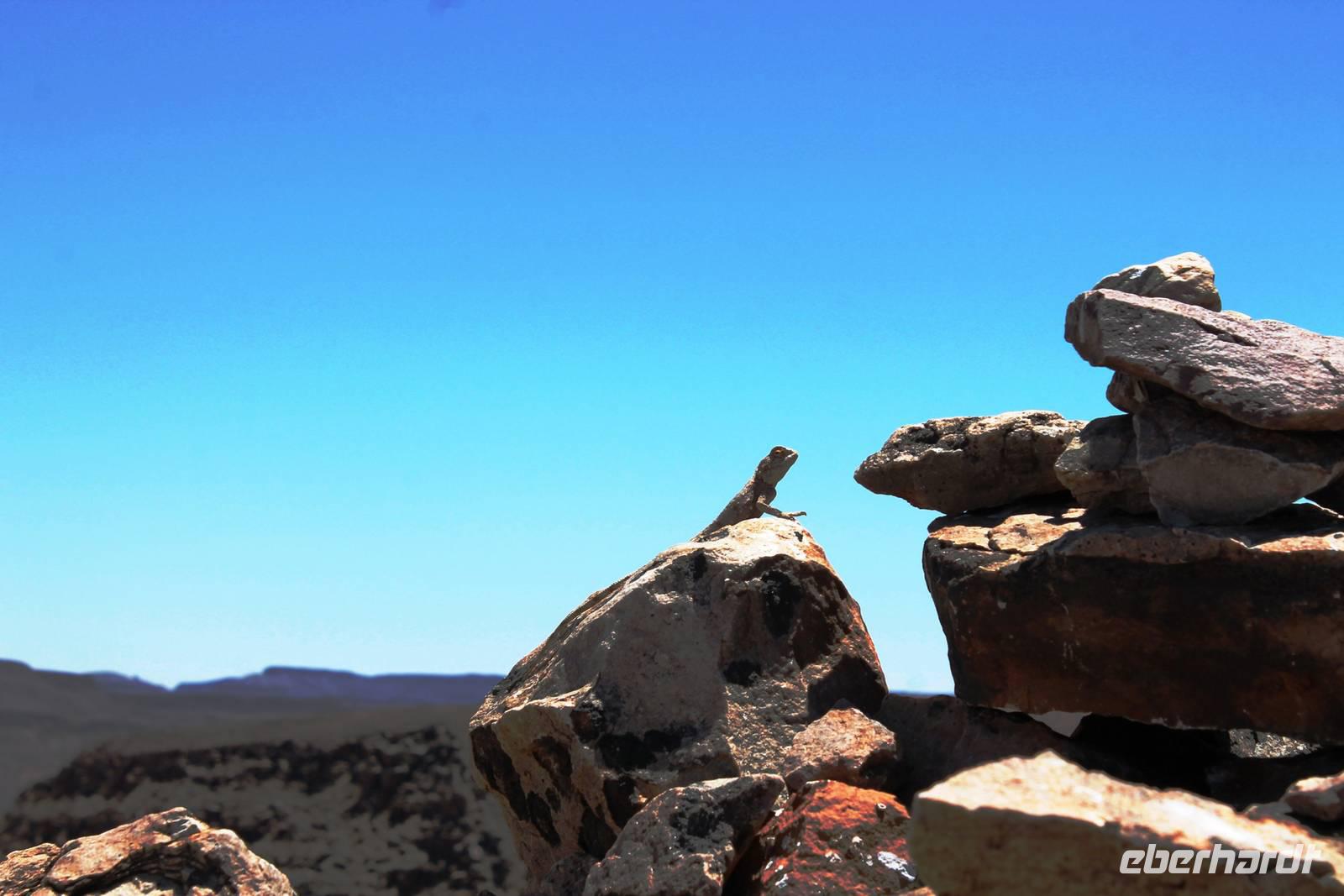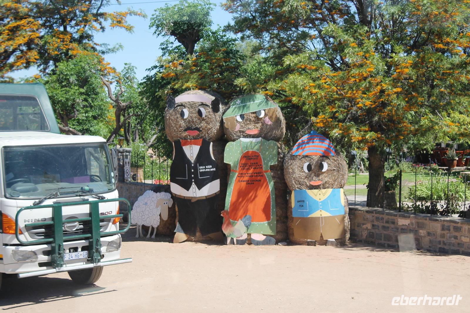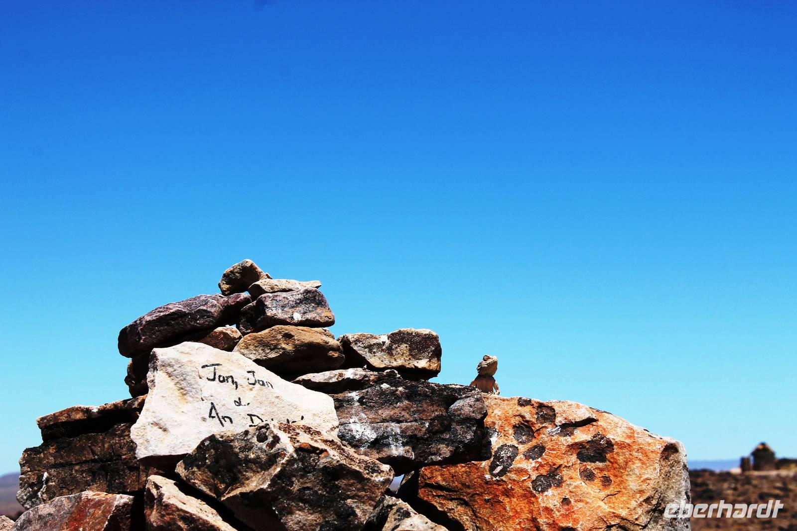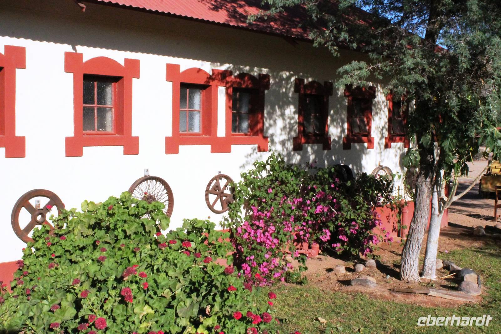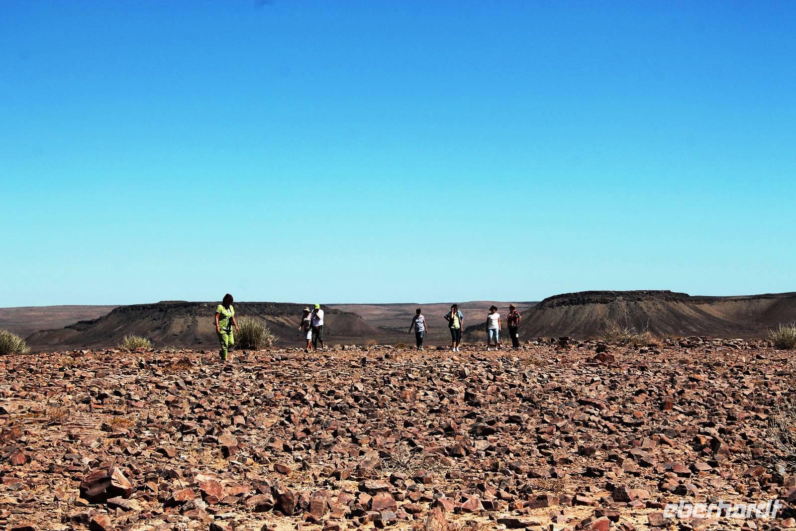 Wie beim Abendessen wurde uns auch zum Frühstück echte Hausmannskost (frisch gebackene Brötchen, leckere Marmelade und würziger Wildschinken und Rührei vom Feinsten) serviert und alle halfen mit. Anschließend zeigte uns Jörg noch sein "Anwesen" rund ums Farmhaus. 3 seiner 4 Kinder unterstützten ihn tatkräftig dabei. Der jüngste Spross ist noch zu klein und bleibt lieber bei Mama Michelle im Tragetuch. Man merkte, dass Jörg mächtig stolz ist, auf das was er an Ideen Stück für Stück umsetzt: Solarkocher, solare Stromerzeugung, seinen ökologischen Gemüsengarten, wo auch grüner Spargel wächst und seine eigene Fischzucht, weitab Seen und Meeren. Auch seine Kinder sind voll bei der Sache, obwohl Spielen und Lachen, manchmal auch Streiten dazu gehören. Sie werden zu Hause unterrichtet, ihr Spielplatz ist die Natur, Fernseher Fehlanzeige. Man spürt sie und die ganze Familie sind glücklich, beneidenswert! Nehmen wir ein kleines Stück dieses einfachen, puren Glücks mit in unsere Konsumgesellschaft mit und verschenken es! Wir sagen Danke, wünschen alles Gute und verabschieden uns herzlich von dieser super Familie und den besonderen Momenten, die wir auf der Farm Dabis erleben konnten. Am Mittag brachen wir zum Zebra Mountain Park auf, unserer nächsten Station. Später am "Verkehrsknotenpunkt" Maltahöhe, einer ehemaligen Station der deutschen Schutztruppe, machten wir halt und durchstöberten den Kramladen der Tankstelle im Ort und verewigten uns an den Wänden. Der Slogan: „Maltahöhe liegt nicht am A.... der Welt, aber man kann ihn sehen" ist äußerst passend für den Ort. Mutter Natur rauschte wieder an uns vorbei und nach kurviger, bergiger Anfahrt mit unserem Truck fanden wir das versteckte Paradies, die Zebra River Lodge. Nach dem wir uns in unseren schönen Zimmern und Steinchalets häuslich eingerichtet hatten, die herrliche Umgebung bestaunten und fotografierten, bei Kaffee und Kuchen entspannten, stürzten wir uns bei herrlichen Sonnenschein ins Pool. Am späten Nachmittag wartete eine Überraschung auf uns. Zum Sonnenuntergang (Sundowner) wurden wir auf ein Bergplateau entführt. Dort wurde eigens für uns eine Bar aufgebaut, denn in der Wüste ist noch kein Eberhardt-Gast verdurstet. Mit passenden Drinks und Snacks genossen wir die untergehende Sonne mit einer fantastischen Aussicht. Es war einfach traumhaft. Das Menü am Abend wurde uns von einer netten, jungen Dame auf Nama schmackhaft gemacht und Horst übersetzte.... Unterhaltsam wurde der gemütliche Abend auf der Terrasse mit Gesangs- und Showeinlagen vom Personal, Horst und Annett fortgesetzt.