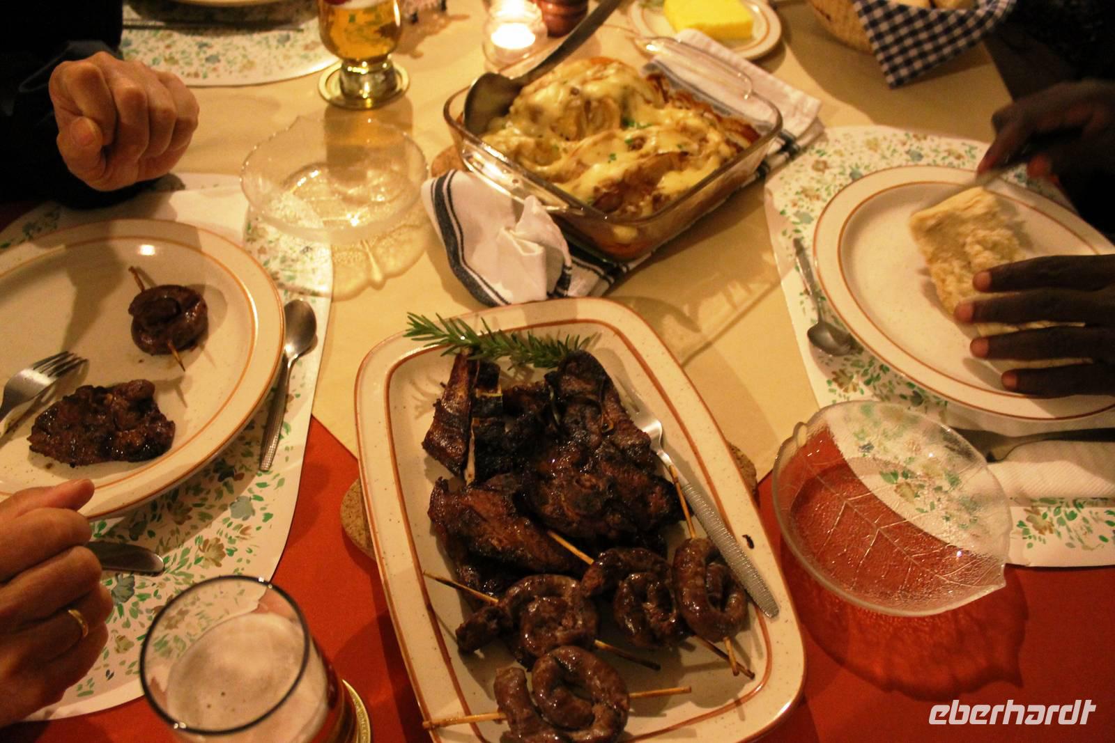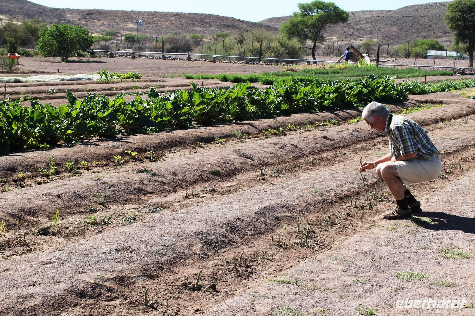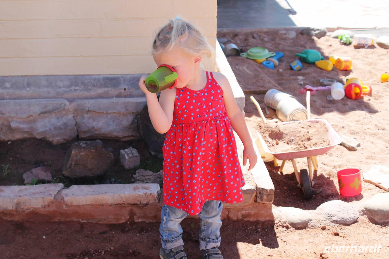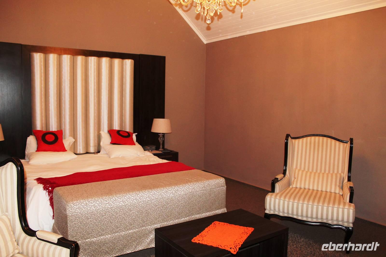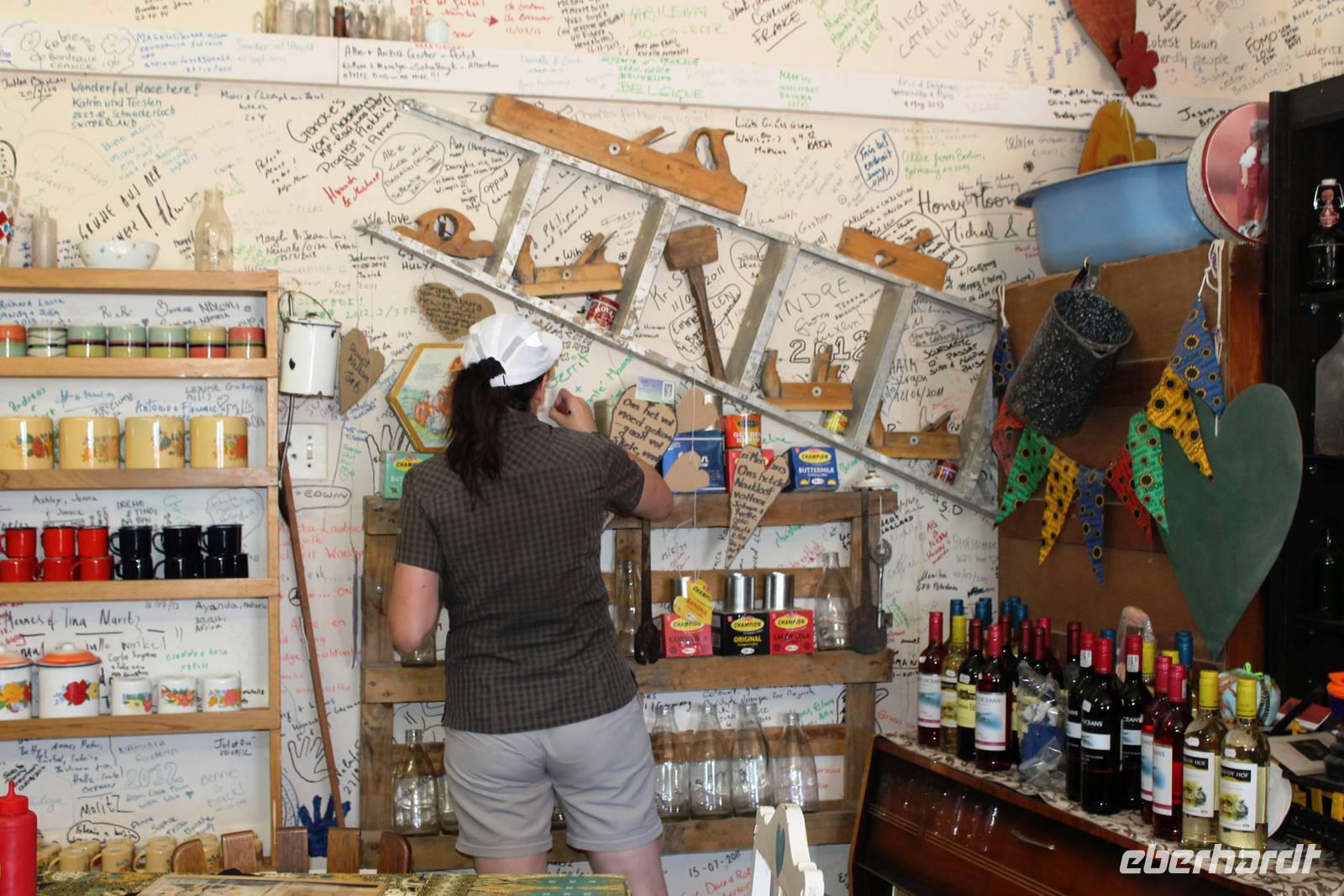 Wie beim Abendessen wurde uns auch zum Frühstück echte Hausmannskost (frisch gebackene Brötchen, leckere Marmelade und würziger Wildschinken und Rührei vom Feinsten) serviert und alle halfen mit. Anschließend zeigte uns Jörg noch sein "Anwesen" rund ums Farmhaus. 3 seiner 4 Kinder unterstützten ihn tatkräftig dabei. Der jüngste Spross ist noch zu klein und bleibt lieber bei Mama Michelle im Tragetuch. Man merkte, dass Jörg mächtig stolz ist, auf das was er an Ideen Stück für Stück umsetzt: Solarkocher, solare Stromerzeugung, seinen ökologischen Gemüsengarten, wo auch grüner Spargel wächst und seine eigene Fischzucht, weitab Seen und Meeren. Auch seine Kinder sind voll bei der Sache, obwohl Spielen und Lachen, manchmal auch Streiten dazu gehören. Sie werden zu Hause unterrichtet, ihr Spielplatz ist die Natur, Fernseher Fehlanzeige. Man spürt sie und die ganze Familie sind glücklich, beneidenswert! Nehmen wir ein kleines Stück dieses einfachen, puren Glücks mit in unsere Konsumgesellschaft mit und verschenken es! Wir sagen Danke, wünschen alles Gute und verabschieden uns herzlich von dieser super Familie und den besonderen Momenten, die wir auf der Farm Dabis erleben konnten. Am Mittag brachen wir zum Zebra Mountain Park auf, unserer nächsten Station. Später am "Verkehrsknotenpunkt" Maltahöhe, einer ehemaligen Station der deutschen Schutztruppe, machten wir halt und durchstöberten den Kramladen der Tankstelle im Ort und verewigten uns an den Wänden. Der Slogan: „Maltahöhe liegt nicht am A.... der Welt, aber man kann ihn sehen" ist äußerst passend für den Ort. Mutter Natur rauschte wieder an uns vorbei und nach kurviger, bergiger Anfahrt mit unserem Truck fanden wir das versteckte Paradies, die Zebra River Lodge. Nach dem wir uns in unseren schönen Zimmern und Steinchalets häuslich eingerichtet hatten, die herrliche Umgebung bestaunten und fotografierten, bei Kaffee und Kuchen entspannten, stürzten wir uns bei herrlichen Sonnenschein ins Pool. Am späten Nachmittag wartete eine Überraschung auf uns. Zum Sonnenuntergang (Sundowner) wurden wir auf ein Bergplateau entführt. Dort wurde eigens für uns eine Bar aufgebaut, denn in der Wüste ist noch kein Eberhardt-Gast verdurstet. Mit passenden Drinks und Snacks genossen wir die untergehende Sonne mit einer fantastischen Aussicht. Es war einfach traumhaft. Das Menü am Abend wurde uns von einer netten, jungen Dame auf Nama schmackhaft gemacht und Horst übersetzte.... Unterhaltsam wurde der gemütliche Abend auf der Terrasse mit Gesangs- und Showeinlagen vom Personal, Horst und Annett fortgesetzt.