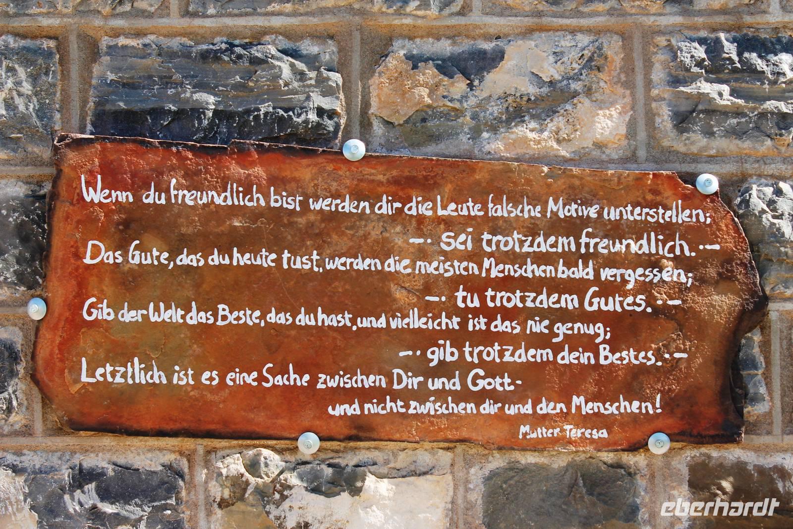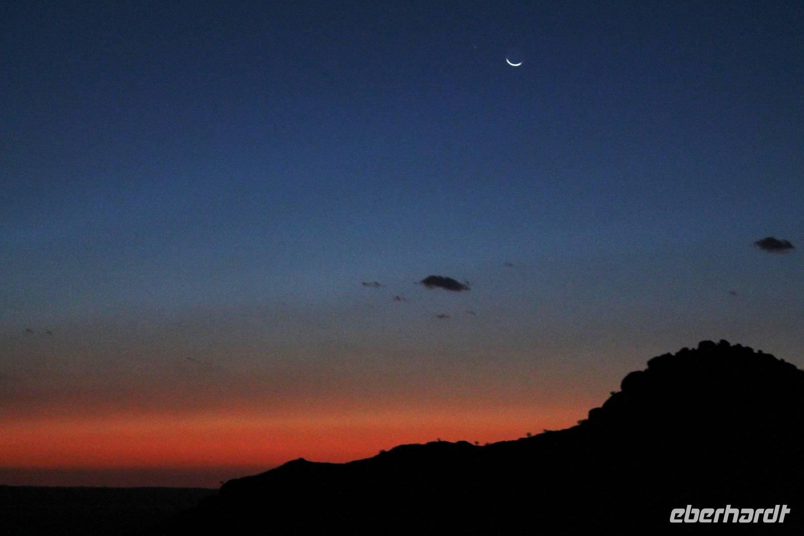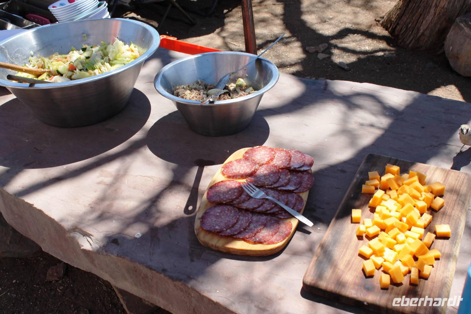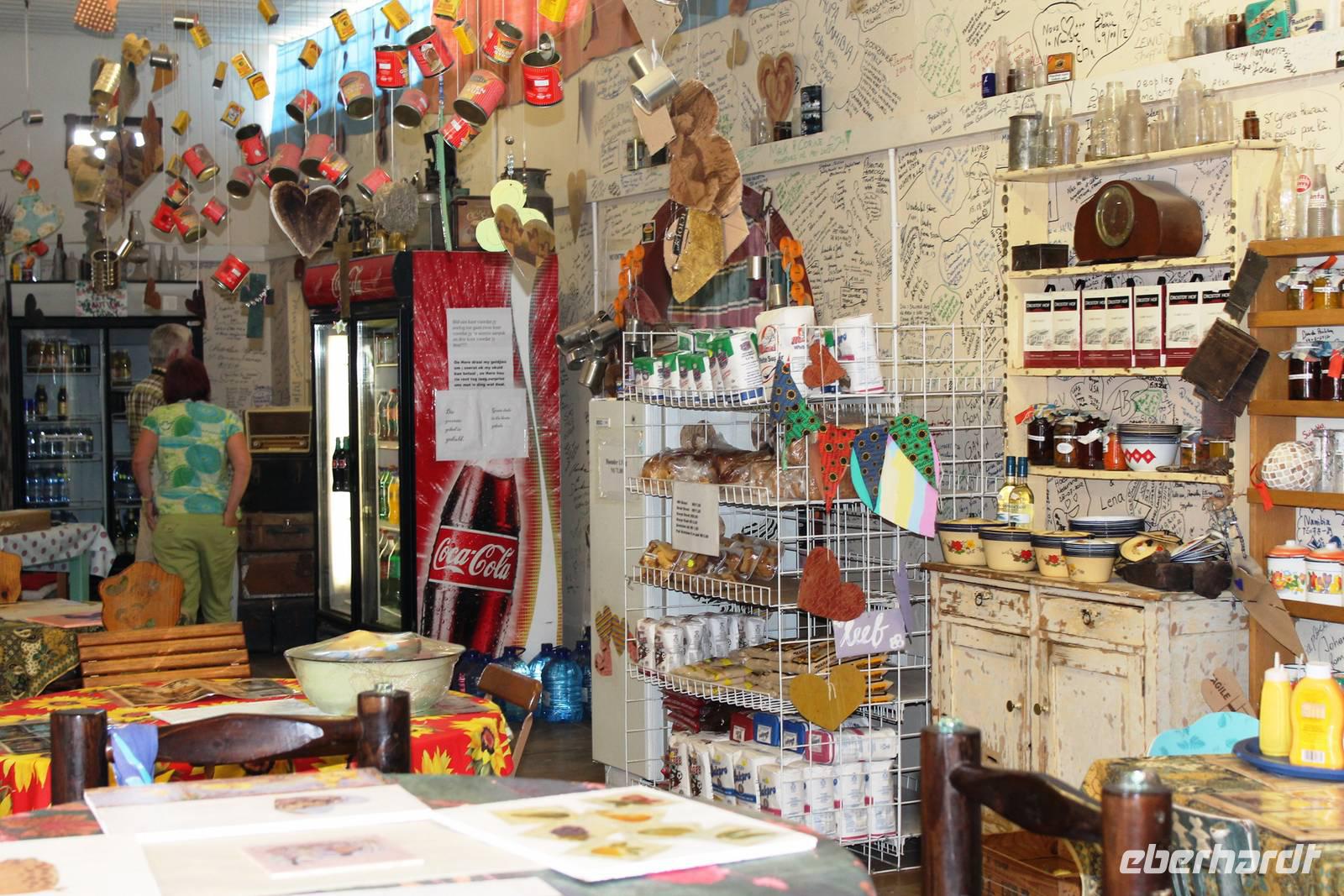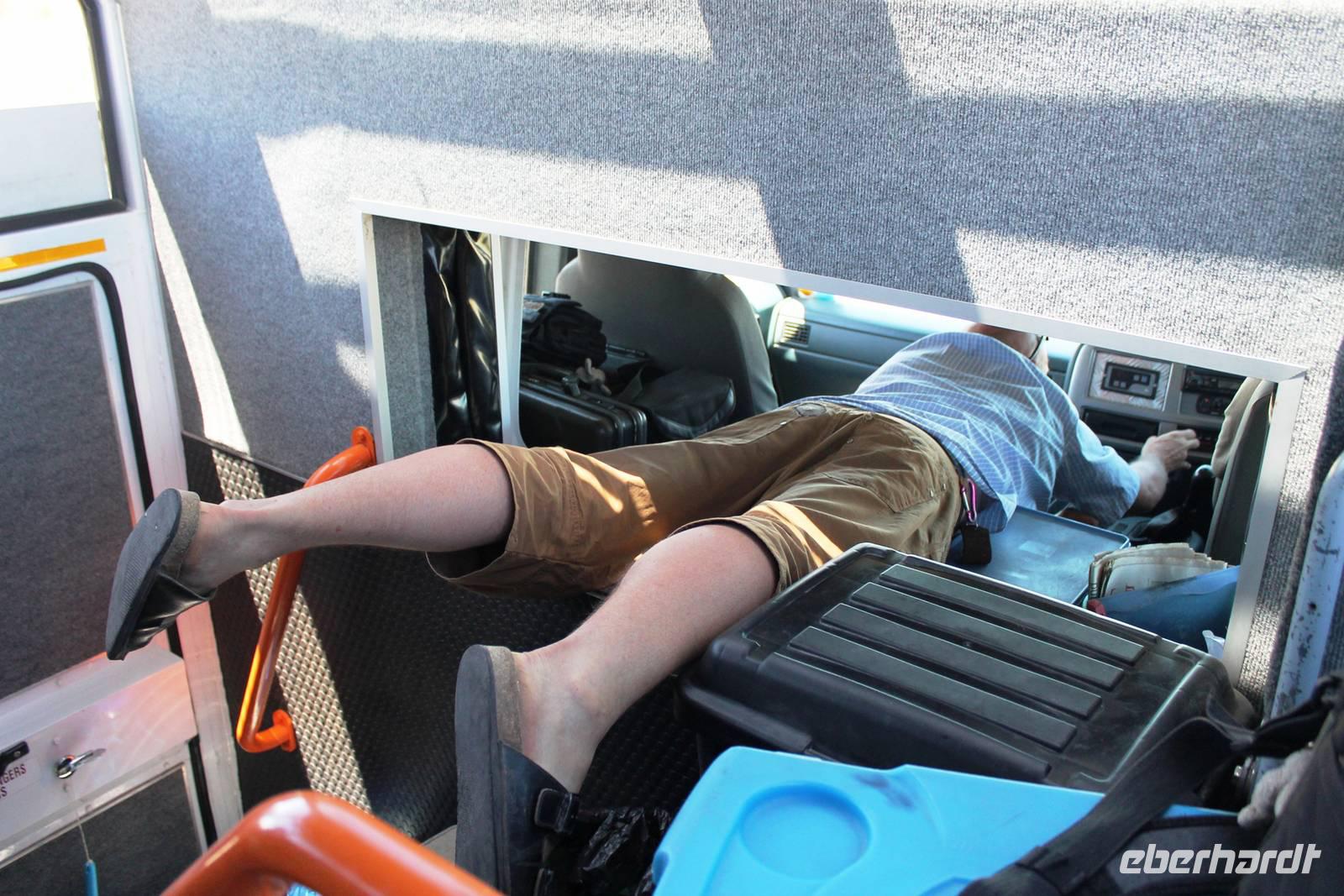 Wie beim Abendessen wurde uns auch zum Frühstück echte Hausmannskost (frisch gebackene Brötchen, leckere Marmelade und würziger Wildschinken und Rührei vom Feinsten) serviert und alle halfen mit. Anschließend zeigte uns Jörg noch sein "Anwesen" rund ums Farmhaus. 3 seiner 4 Kinder unterstützten ihn tatkräftig dabei. Der jüngste Spross ist noch zu klein und bleibt lieber bei Mama Michelle im Tragetuch. Man merkte, dass Jörg mächtig stolz ist, auf das was er an Ideen Stück für Stück umsetzt: Solarkocher, solare Stromerzeugung, seinen ökologischen Gemüsengarten, wo auch grüner Spargel wächst und seine eigene Fischzucht, weitab Seen und Meeren. Auch seine Kinder sind voll bei der Sache, obwohl Spielen und Lachen, manchmal auch Streiten dazu gehören. Sie werden zu Hause unterrichtet, ihr Spielplatz ist die Natur, Fernseher Fehlanzeige. Man spürt sie und die ganze Familie sind glücklich, beneidenswert! Nehmen wir ein kleines Stück dieses einfachen, puren Glücks mit in unsere Konsumgesellschaft mit und verschenken es! Wir sagen Danke, wünschen alles Gute und verabschieden uns herzlich von dieser super Familie und den besonderen Momenten, die wir auf der Farm Dabis erleben konnten. Am Mittag brachen wir zum Zebra Mountain Park auf, unserer nächsten Station. Später am "Verkehrsknotenpunkt" Maltahöhe, einer ehemaligen Station der deutschen Schutztruppe, machten wir halt und durchstöberten den Kramladen der Tankstelle im Ort und verewigten uns an den Wänden. Der Slogan: „Maltahöhe liegt nicht am A.... der Welt, aber man kann ihn sehen" ist äußerst passend für den Ort. Mutter Natur rauschte wieder an uns vorbei und nach kurviger, bergiger Anfahrt mit unserem Truck fanden wir das versteckte Paradies, die Zebra River Lodge. Nach dem wir uns in unseren schönen Zimmern und Steinchalets häuslich eingerichtet hatten, die herrliche Umgebung bestaunten und fotografierten, bei Kaffee und Kuchen entspannten, stürzten wir uns bei herrlichen Sonnenschein ins Pool. Am späten Nachmittag wartete eine Überraschung auf uns. Zum Sonnenuntergang (Sundowner) wurden wir auf ein Bergplateau entführt. Dort wurde eigens für uns eine Bar aufgebaut, denn in der Wüste ist noch kein Eberhardt-Gast verdurstet. Mit passenden Drinks und Snacks genossen wir die untergehende Sonne mit einer fantastischen Aussicht. Es war einfach traumhaft. Das Menü am Abend wurde uns von einer netten, jungen Dame auf Nama schmackhaft gemacht und Horst übersetzte.... Unterhaltsam wurde der gemütliche Abend auf der Terrasse mit Gesangs- und Showeinlagen vom Personal, Horst und Annett fortgesetzt.