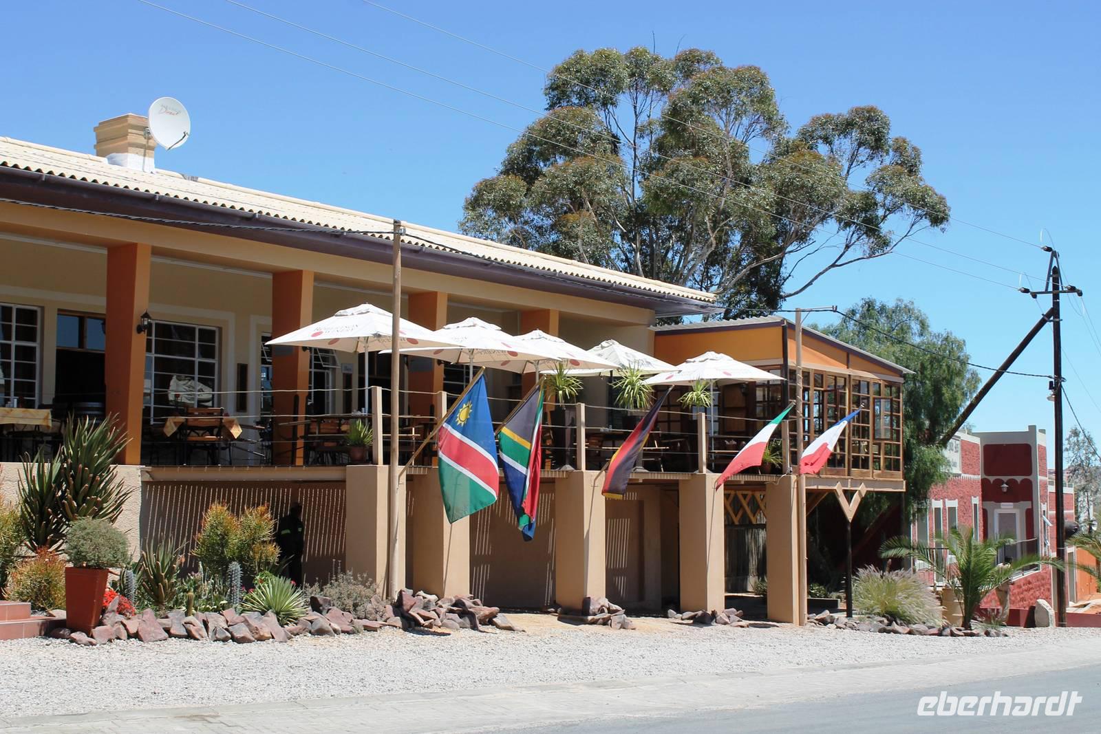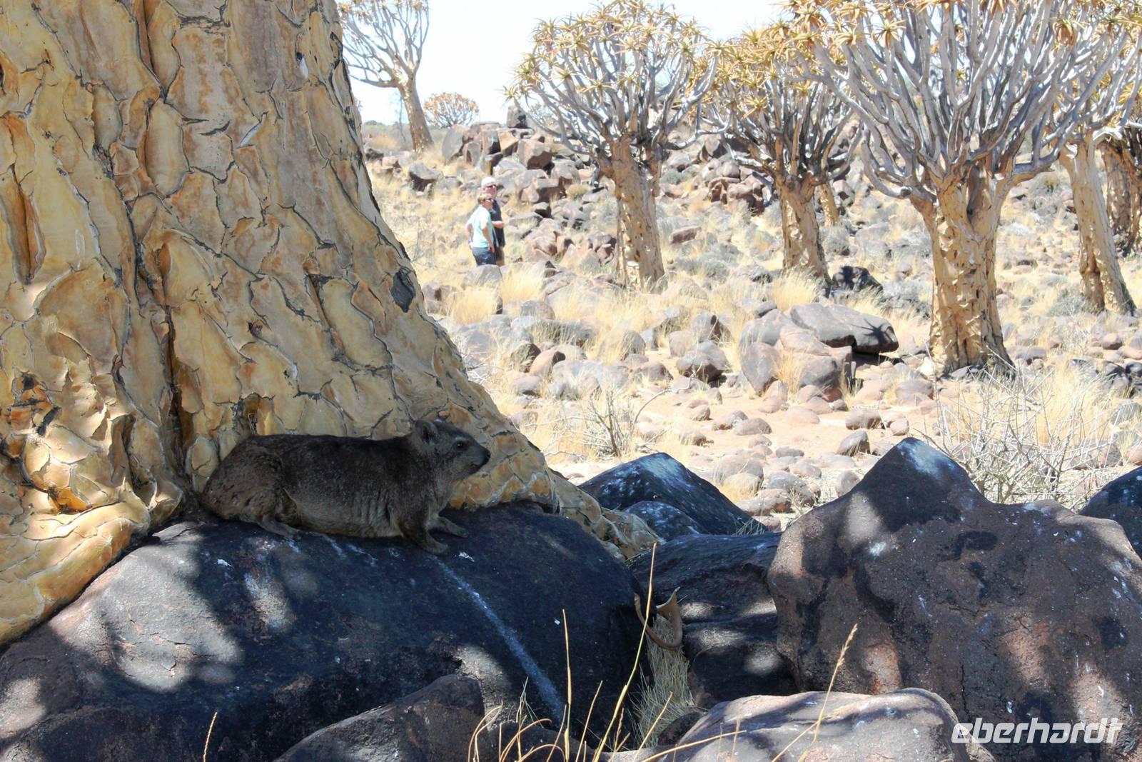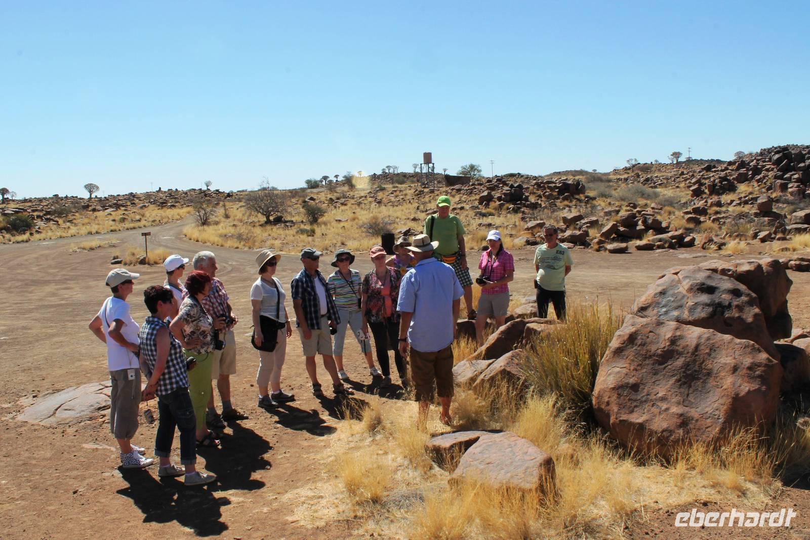 Nach dem Frühstück truckten wir Richtung Keetmanshoop. Unterwegs bestaunten wir Riesennester der Webervögel, einsame Viehstationen mit traditionellen Wasserpumpen und sahen einzelne "Kalahari Ferraris", die durch die Wüste "rasten". Schon am Mittag empfing uns Keetmanshoop, die alte Missionarstadt, benannt nach dem deutschen Missionar, der einst den christlichen Glauben in die Weiten Namibias brachte. Neben dem Central Park fanden wir auch viele deutsche Relikte in dem kleinen Ort: das kaiserliche Postamt und die Felsenkiche. Nach dem wir unsere Vorräte im Supermarkt aufgefüllt hatten, fuhren wir zum unweit entfernten Köcherbaumwald "Quiver Tree Forest", der sich auf einem privaten Gelände befindet. Während Horst unser erstes Picknick vorbereitete, spazierten wir durch den "Wald". In dieser Gegend ist die Konzentration an Köcherbäumen besonders hoch, während anders wo nur einzelne Exemplare zu finden sind. Der Köcherbaum ist ja eigentlich kein Baum, sondern eine Aloen-Art, die ca. 8 m hoch werden kann. Der Name stammt von den San, die aus den "hohlen" Ästen Pfeilköcher schnitzten. In einigen Bäumen hatten sich Webervögel in ihren riesigen "Wohnblöcken" häuslich eingerichtet und freuten sich laut zwitschernd auf unseren Besuch. Im Schatten der Bäume verschliefen Klippschliefer die heiße Mittagszeit. Kaum zu glauben, dass diesen Murmeltieren sehr ähnlichen Tieren gerade der Elefant als nächster Verwandter gilt. Anschließend stärkten wir uns in geselliger Runde beim Picknick. Auch der "Abwasch" ist anschließend schnell gemacht, denn alle freuten sich auf`s Spielen! Also auf zum Spielplatz der Riesen, "Giants Playground". Enorme Temperaturunterschiede sprengten die Felsen auf und so formten sich über Jahrtausende bizzare Formationen, die allesamt aussehen wie ein unaufgeräumter Baumarkt. Wir spazierten durch das Labyrinth der Bauklötze und erklommen einzelne Felsformationen. Danach fuhren wir nach Keetmanshoop zurück und bezogen unsere Zimmer im "Schützenhaus", dem ältesten, deutschen Klubhaus in Namibia. Einige Gäste hatten sogar das Privileg in der ehemaligen Synagoge zu nächtigen. Vor dem Abendessen trafen wir uns an der Bar, um die nächsten Reiseetappen zu besprechen. Das Abendessen a la Carte schmeckte allen super und war, Dank der Bestellung schon beim Check In, zügig auf dem Tisch. Die Kreditkarten-Maschine hatte aber keine Eile.
