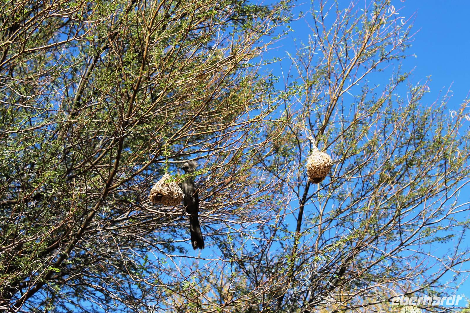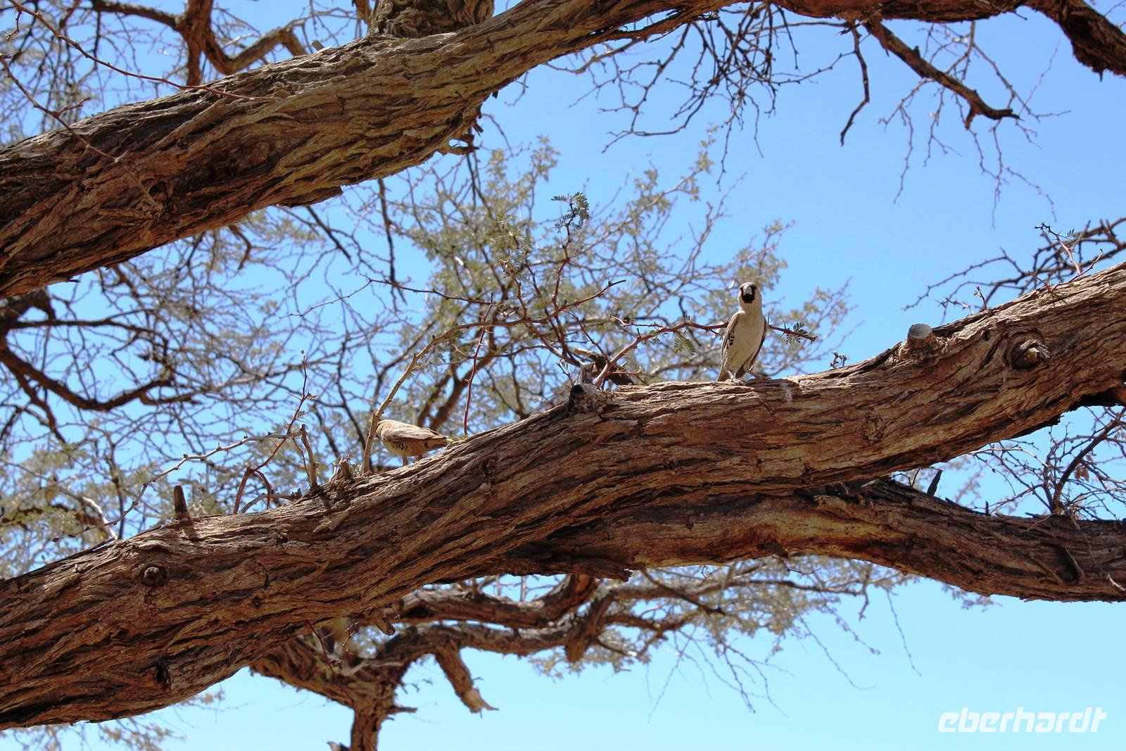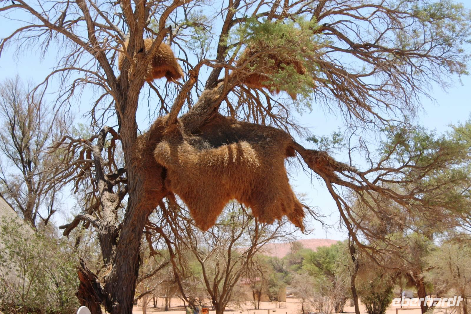 Nach dem Frühstück truckten wir Richtung Keetmanshoop. Unterwegs bestaunten wir Riesennester der Webervögel, einsame Viehstationen mit traditionellen Wasserpumpen und sahen einzelne "Kalahari Ferraris", die durch die Wüste "rasten". Schon am Mittag empfing uns Keetmanshoop, die alte Missionarstadt, benannt nach dem deutschen Missionar, der einst den christlichen Glauben in die Weiten Namibias brachte. Neben dem Central Park fanden wir auch viele deutsche Relikte in dem kleinen Ort: das kaiserliche Postamt und die Felsenkiche. Nach dem wir unsere Vorräte im Supermarkt aufgefüllt hatten, fuhren wir zum unweit entfernten Köcherbaumwald "Quiver Tree Forest", der sich auf einem privaten Gelände befindet. Während Horst unser erstes Picknick vorbereitete, spazierten wir durch den "Wald". In dieser Gegend ist die Konzentration an Köcherbäumen besonders hoch, während anders wo nur einzelne Exemplare zu finden sind. Der Köcherbaum ist ja eigentlich kein Baum, sondern eine Aloen-Art, die ca. 8 m hoch werden kann. Der Name stammt von den San, die aus den "hohlen" Ästen Pfeilköcher schnitzten. In einigen Bäumen hatten sich Webervögel in ihren riesigen "Wohnblöcken" häuslich eingerichtet und freuten sich laut zwitschernd auf unseren Besuch. Im Schatten der Bäume verschliefen Klippschliefer die heiße Mittagszeit. Kaum zu glauben, dass diesen Murmeltieren sehr ähnlichen Tieren gerade der Elefant als nächster Verwandter gilt. Anschließend stärkten wir uns in geselliger Runde beim Picknick. Auch der "Abwasch" ist anschließend schnell gemacht, denn alle freuten sich auf`s Spielen! Also auf zum Spielplatz der Riesen, "Giants Playground". Enorme Temperaturunterschiede sprengten die Felsen auf und so formten sich über Jahrtausende bizzare Formationen, die allesamt aussehen wie ein unaufgeräumter Baumarkt. Wir spazierten durch das Labyrinth der Bauklötze und erklommen einzelne Felsformationen. Danach fuhren wir nach Keetmanshoop zurück und bezogen unsere Zimmer im "Schützenhaus", dem ältesten, deutschen Klubhaus in Namibia. Einige Gäste hatten sogar das Privileg in der ehemaligen Synagoge zu nächtigen. Vor dem Abendessen trafen wir uns an der Bar, um die nächsten Reiseetappen zu besprechen. Das Abendessen a la Carte schmeckte allen super und war, Dank der Bestellung schon beim Check In, zügig auf dem Tisch. Die Kreditkarten-Maschine hatte aber keine Eile.