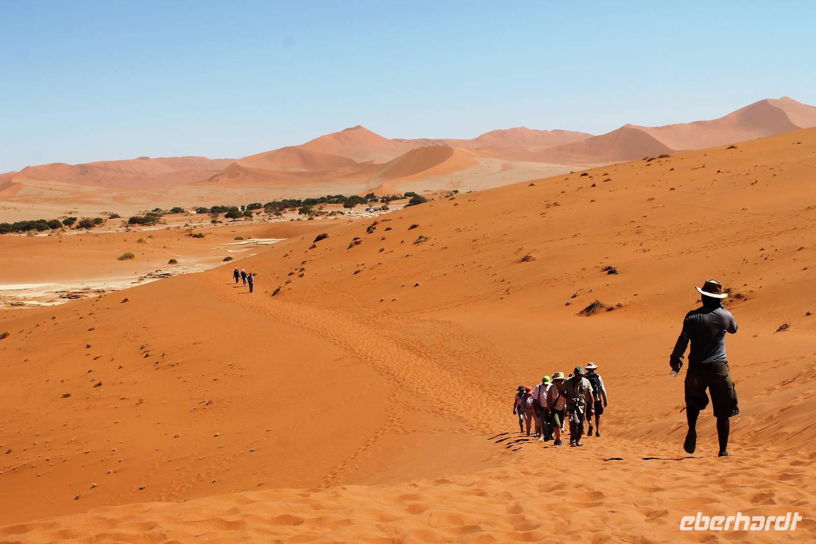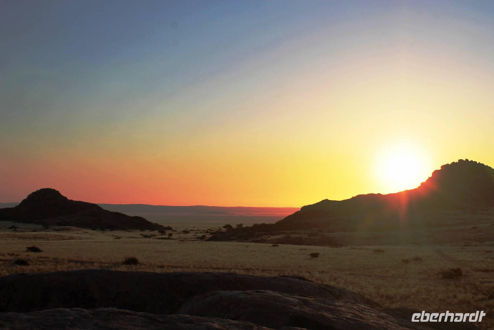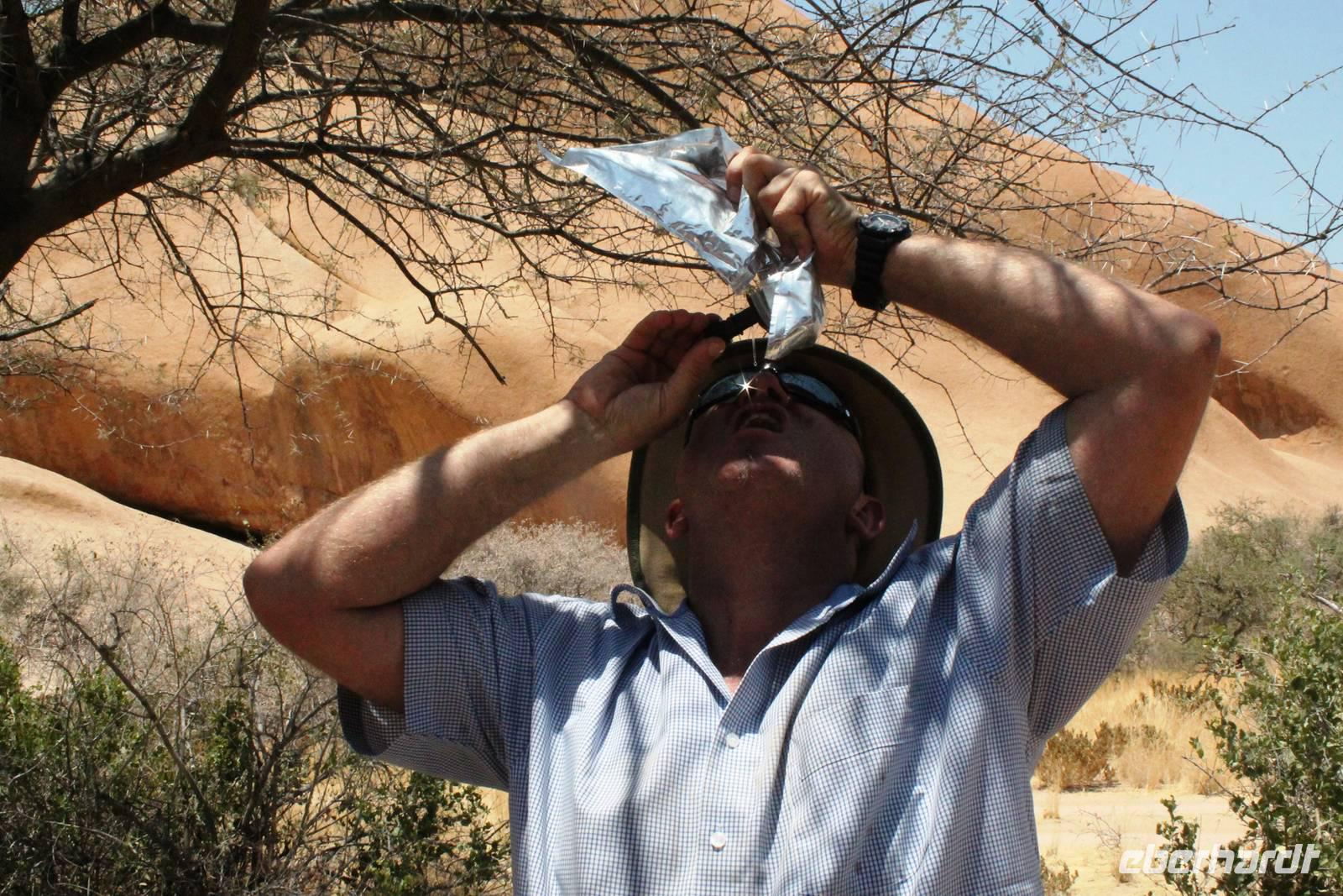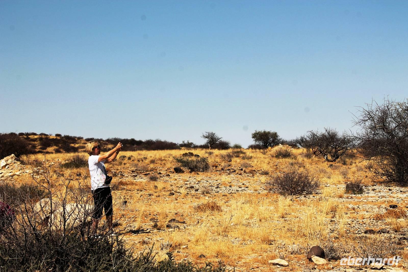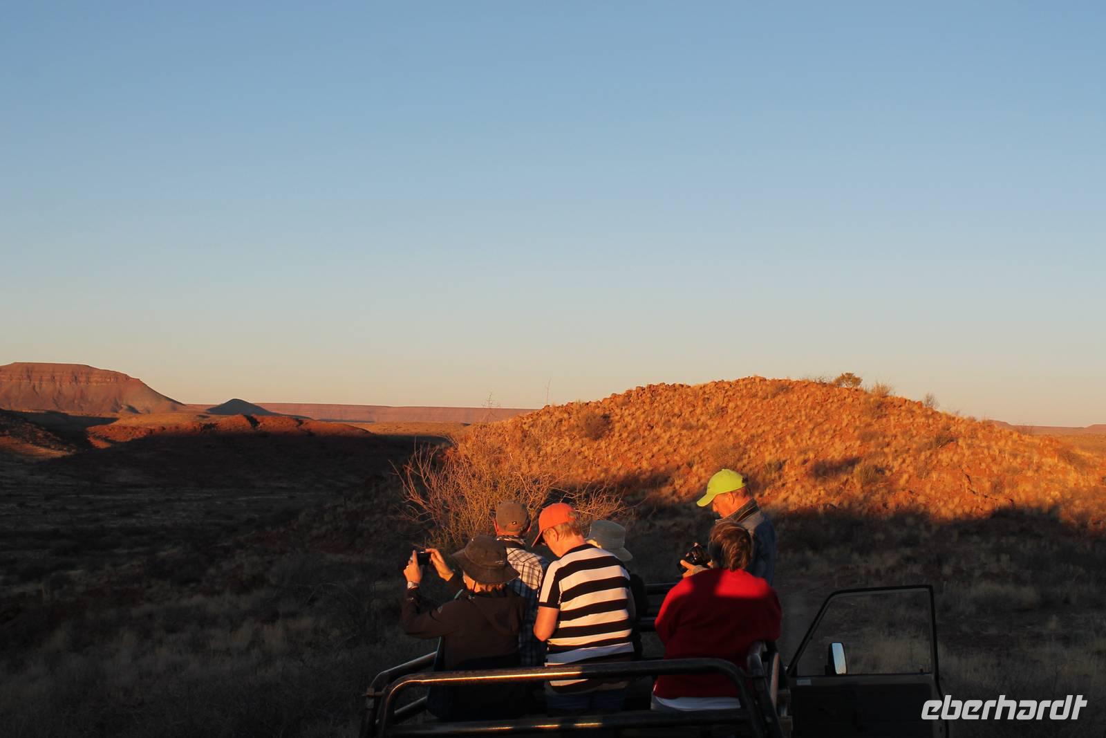 Frühes Aufstehen war heute Pflicht, denn unser Ziel waren die höchsten Dünen der Welt in der Namib. Ja, es war noch sehr früh und dunkel, die meisten schlürften demzufolge still ihren Kaffee. Nach dem wir Koffer und Lunchpakete im Truck verstaut hatten, fuhren wir los. Zum Sonnenaufgang wurden wir von einer Bodenwelle etwas unsanft geweckt. Die Tore zum Sossusvlei Park öffnen bei Sonnenaufgang, also ca. 6:30 Uhr "afrikanischer" Zeit. Im frühen Morgenlicht erstrahlten die hohen Dünen (bis ca. 400 m hoch) im satten Rot im Kontrast zum teilweise tiefblauen, klaren Himmel. Es entstanden fantastische Fotos. Auch Oryxe, Strauße und Springböcke "grasten" in der Wüste. Wir sahen sogar eine seltene Schabrackenhyäne, auch braune Hyäne genannt - Welch ein Glück. Später erklommen wir, die nur ca. 100 m hohe Düne 45. Nach wenigen Metern war "Sand im Getriebe" und die meisten zogen barfuß weiter. Toll, wie viele Eberhardt-Gäste sich als Gipfelstürmer bewiesen. Nach dem „Frühsport" wurden wir mit einer grandiosen Aussicht auf das Dünenmeer belohnt. Heute war ja Bergfest, im wahrsten Sinne des Wortes. Nach dem rasanten Abstieg "gruben" wir die Klappstühle aus und frühstückten in einzigartiger Umgebung. Später wechselten wir unseren Truck und stiegen in Allrad-Fahrzeuge, um durch sandigen Boden im Trockenflußbett weiter zu kommen. Wir unternahmen eine weitere sportliche Herausforderung und wanderten zum Dead Vlei, wo jegliche Vegetation tot erschien. Unsere letzte Station war ein Fotostopp an der ausgetrockneten Lehmsenke, dem eigentliche Sossusvlei. Die Rückfahrt zum 4x4 Parkplatz gestaltete sich zur hart umkämpften Wüstenralley. Mittlerweile war Mittagszeit und es war sehr heiß, der heißeste Tag auf unserer Reise (ca. 40° C). Die Dünen leuchteten nun in Orange und Gelb - ein fantastisches Farbenspiel. Anschließend picknickten wir unter einem Schattenbaum, bevor wir in den, ebenfalls trockenen Sesriem Canyon hinab stiegen und mit Horst erkundeten. In unserer idyllisch gelegenen Lodge am Rande des Namib Naukluft Parks erwartete uns ein erfrischendes Bad im kleinen Felsenpool, ein traumhafter Sonnenuntergang mit Amarula und ein Braai Abendessen, welches wir allesamt selbst zubereiteten - Danke den fleissigen Helfern. Mit leckerem Essen, frisch Gezapften, Amarula, Geschichten und knalligen Effekten (Danke an den Sprengmeister Gabi) hatten wir einen unterhaltsamen Abend im von Eberhardt besetzten Namib Naukluft Camp.
