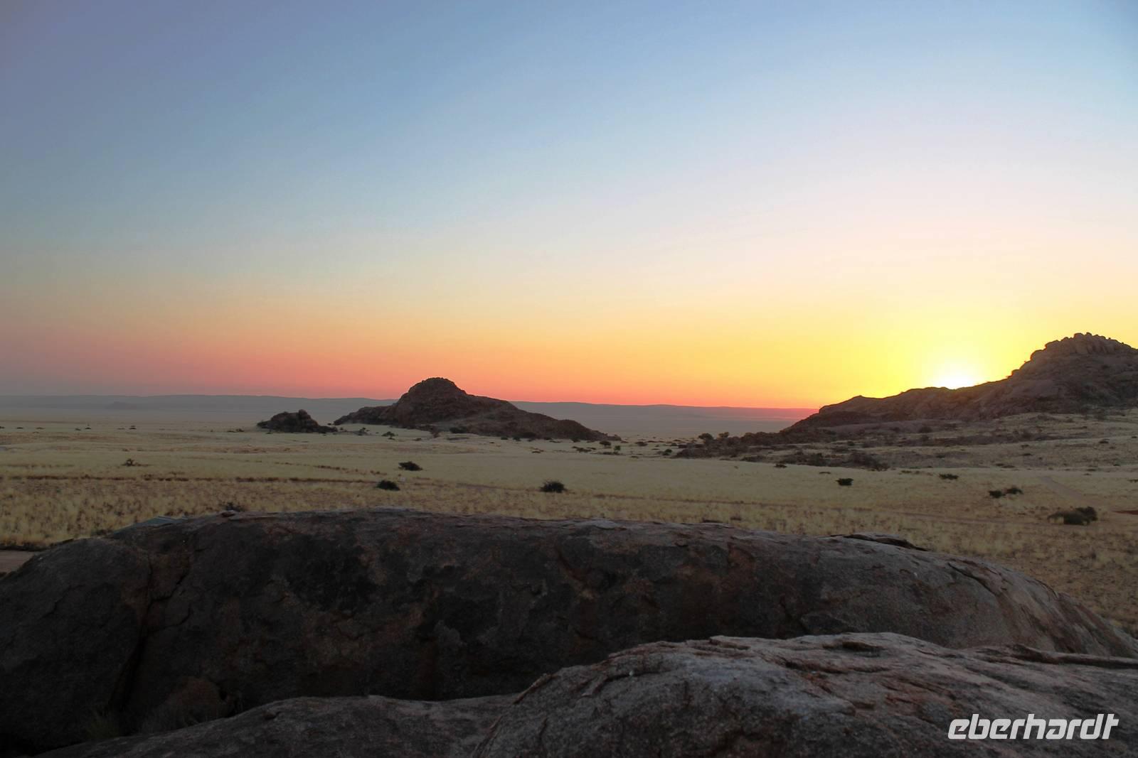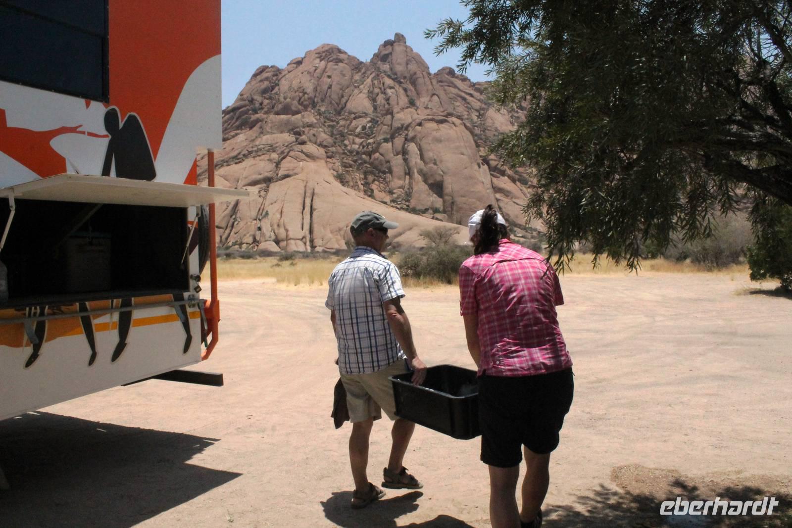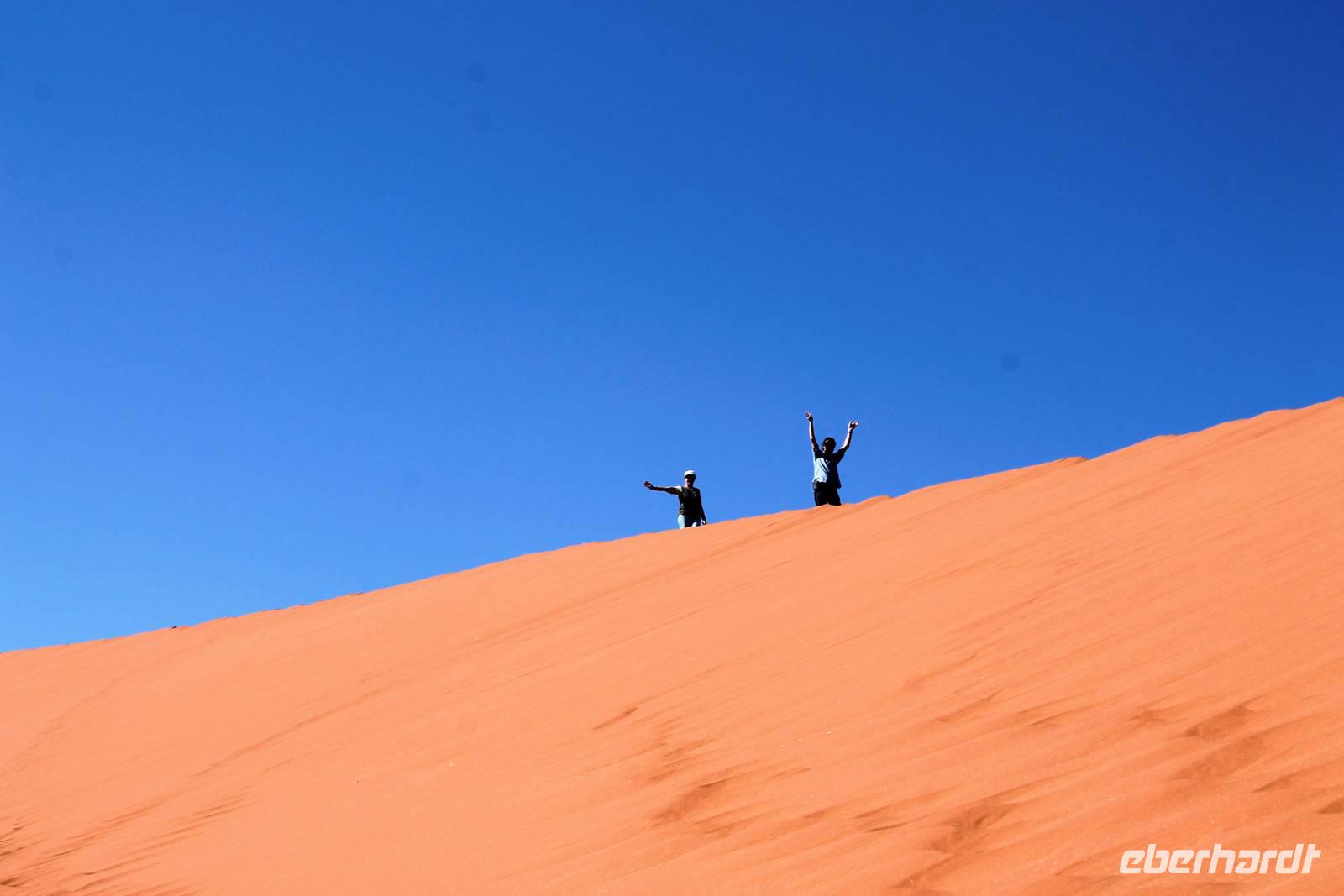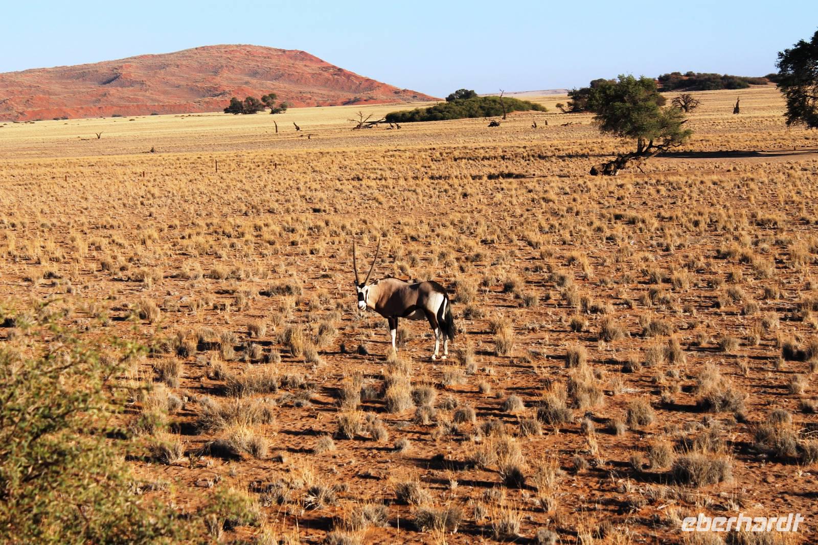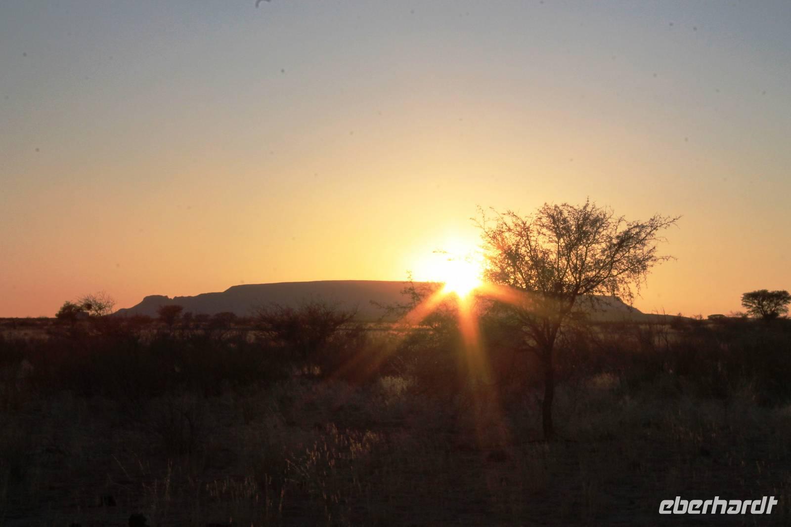 Frühes Aufstehen war heute Pflicht, denn unser Ziel waren die höchsten Dünen der Welt in der Namib. Ja, es war noch sehr früh und dunkel, die meisten schlürften demzufolge still ihren Kaffee. Nach dem wir Koffer und Lunchpakete im Truck verstaut hatten, fuhren wir los. Zum Sonnenaufgang wurden wir von einer Bodenwelle etwas unsanft geweckt. Die Tore zum Sossusvlei Park öffnen bei Sonnenaufgang, also ca. 6:30 Uhr "afrikanischer" Zeit. Im frühen Morgenlicht erstrahlten die hohen Dünen (bis ca. 400 m hoch) im satten Rot im Kontrast zum teilweise tiefblauen, klaren Himmel. Es entstanden fantastische Fotos. Auch Oryxe, Strauße und Springböcke "grasten" in der Wüste. Wir sahen sogar eine seltene Schabrackenhyäne, auch braune Hyäne genannt - Welch ein Glück. Später erklommen wir, die nur ca. 100 m hohe Düne 45. Nach wenigen Metern war "Sand im Getriebe" und die meisten zogen barfuß weiter. Toll, wie viele Eberhardt-Gäste sich als Gipfelstürmer bewiesen. Nach dem „Frühsport" wurden wir mit einer grandiosen Aussicht auf das Dünenmeer belohnt. Heute war ja Bergfest, im wahrsten Sinne des Wortes. Nach dem rasanten Abstieg "gruben" wir die Klappstühle aus und frühstückten in einzigartiger Umgebung. Später wechselten wir unseren Truck und stiegen in Allrad-Fahrzeuge, um durch sandigen Boden im Trockenflußbett weiter zu kommen. Wir unternahmen eine weitere sportliche Herausforderung und wanderten zum Dead Vlei, wo jegliche Vegetation tot erschien. Unsere letzte Station war ein Fotostopp an der ausgetrockneten Lehmsenke, dem eigentliche Sossusvlei. Die Rückfahrt zum 4x4 Parkplatz gestaltete sich zur hart umkämpften Wüstenralley. Mittlerweile war Mittagszeit und es war sehr heiß, der heißeste Tag auf unserer Reise (ca. 40° C). Die Dünen leuchteten nun in Orange und Gelb - ein fantastisches Farbenspiel. Anschließend picknickten wir unter einem Schattenbaum, bevor wir in den, ebenfalls trockenen Sesriem Canyon hinab stiegen und mit Horst erkundeten. In unserer idyllisch gelegenen Lodge am Rande des Namib Naukluft Parks erwartete uns ein erfrischendes Bad im kleinen Felsenpool, ein traumhafter Sonnenuntergang mit Amarula und ein Braai Abendessen, welches wir allesamt selbst zubereiteten - Danke den fleissigen Helfern. Mit leckerem Essen, frisch Gezapften, Amarula, Geschichten und knalligen Effekten (Danke an den Sprengmeister Gabi) hatten wir einen unterhaltsamen Abend im von Eberhardt besetzten Namib Naukluft Camp.
