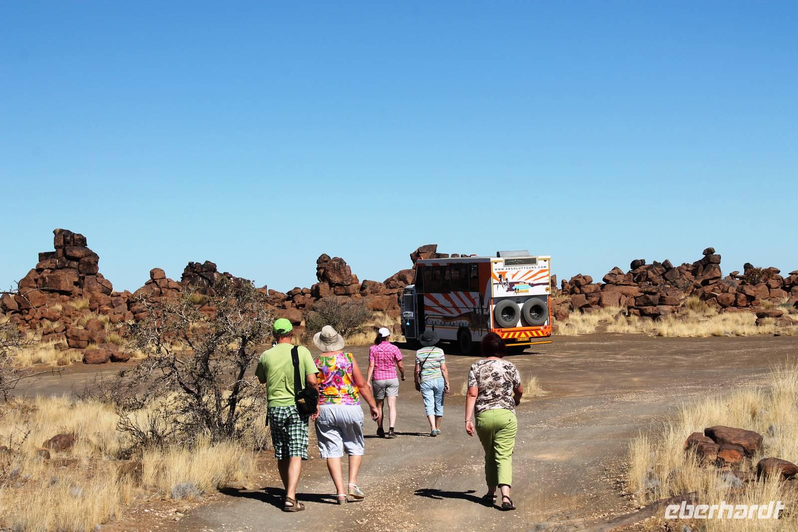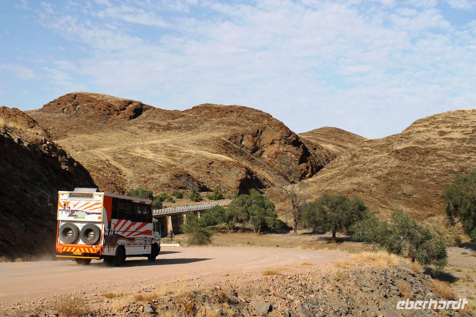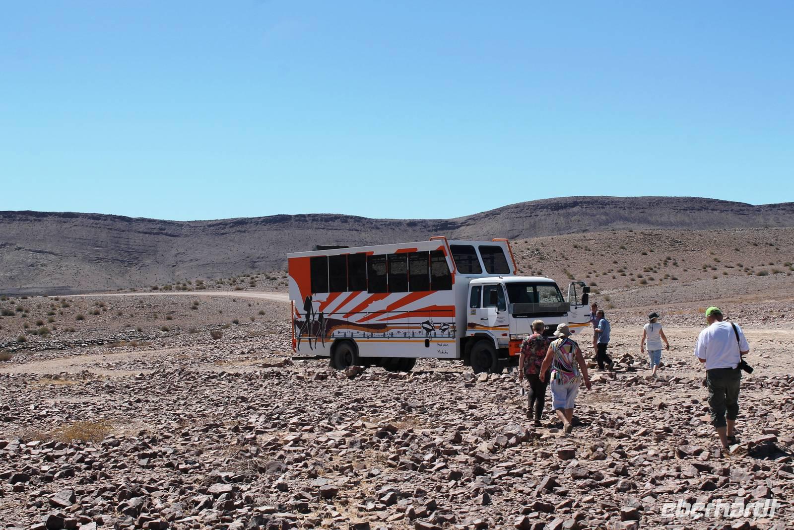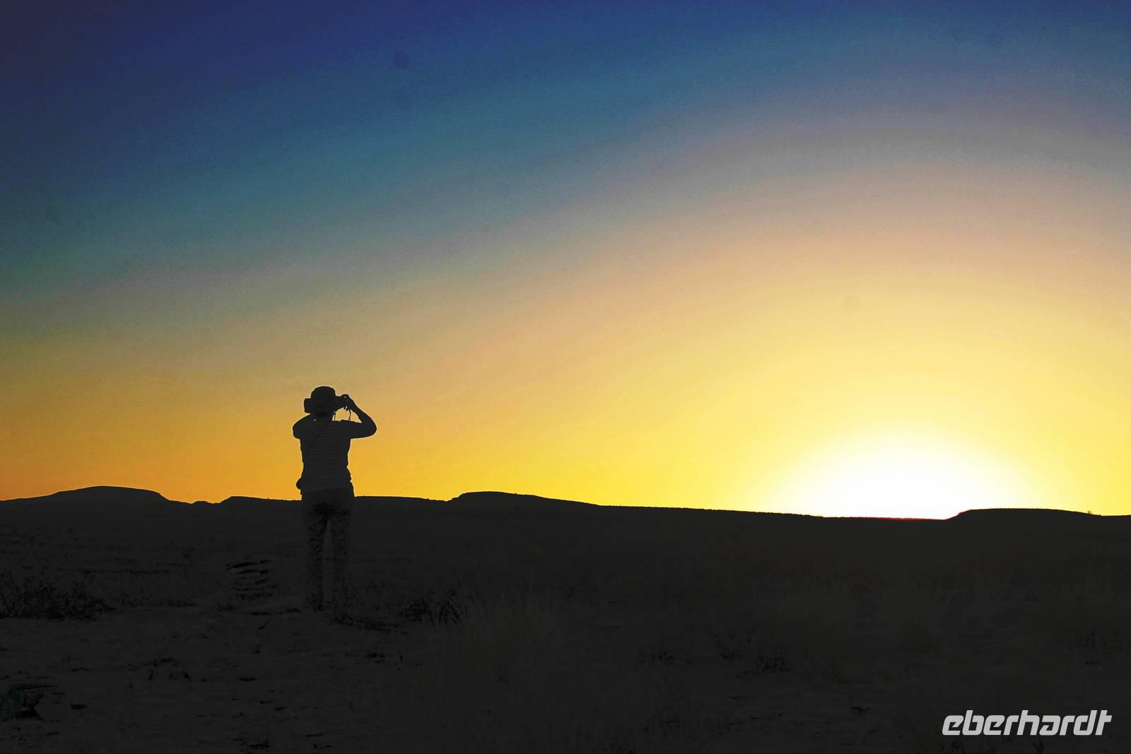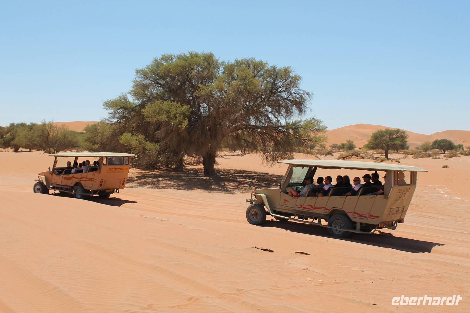 Frühes Aufstehen war heute Pflicht, denn unser Ziel waren die höchsten Dünen der Welt in der Namib. Ja, es war noch sehr früh und dunkel, die meisten schlürften demzufolge still ihren Kaffee. Nach dem wir Koffer und Lunchpakete im Truck verstaut hatten, fuhren wir los. Zum Sonnenaufgang wurden wir von einer Bodenwelle etwas unsanft geweckt. Die Tore zum Sossusvlei Park öffnen bei Sonnenaufgang, also ca. 6:30 Uhr "afrikanischer" Zeit. Im frühen Morgenlicht erstrahlten die hohen Dünen (bis ca. 400 m hoch) im satten Rot im Kontrast zum teilweise tiefblauen, klaren Himmel. Es entstanden fantastische Fotos. Auch Oryxe, Strauße und Springböcke "grasten" in der Wüste. Wir sahen sogar eine seltene Schabrackenhyäne, auch braune Hyäne genannt - Welch ein Glück. Später erklommen wir, die nur ca. 100 m hohe Düne 45. Nach wenigen Metern war "Sand im Getriebe" und die meisten zogen barfuß weiter. Toll, wie viele Eberhardt-Gäste sich als Gipfelstürmer bewiesen. Nach dem „Frühsport" wurden wir mit einer grandiosen Aussicht auf das Dünenmeer belohnt. Heute war ja Bergfest, im wahrsten Sinne des Wortes. Nach dem rasanten Abstieg "gruben" wir die Klappstühle aus und frühstückten in einzigartiger Umgebung. Später wechselten wir unseren Truck und stiegen in Allrad-Fahrzeuge, um durch sandigen Boden im Trockenflußbett weiter zu kommen. Wir unternahmen eine weitere sportliche Herausforderung und wanderten zum Dead Vlei, wo jegliche Vegetation tot erschien. Unsere letzte Station war ein Fotostopp an der ausgetrockneten Lehmsenke, dem eigentliche Sossusvlei. Die Rückfahrt zum 4x4 Parkplatz gestaltete sich zur hart umkämpften Wüstenralley. Mittlerweile war Mittagszeit und es war sehr heiß, der heißeste Tag auf unserer Reise (ca. 40° C). Die Dünen leuchteten nun in Orange und Gelb - ein fantastisches Farbenspiel. Anschließend picknickten wir unter einem Schattenbaum, bevor wir in den, ebenfalls trockenen Sesriem Canyon hinab stiegen und mit Horst erkundeten. In unserer idyllisch gelegenen Lodge am Rande des Namib Naukluft Parks erwartete uns ein erfrischendes Bad im kleinen Felsenpool, ein traumhafter Sonnenuntergang mit Amarula und ein Braai Abendessen, welches wir allesamt selbst zubereiteten - Danke den fleissigen Helfern. Mit leckerem Essen, frisch Gezapften, Amarula, Geschichten und knalligen Effekten (Danke an den Sprengmeister Gabi) hatten wir einen unterhaltsamen Abend im von Eberhardt besetzten Namib Naukluft Camp.