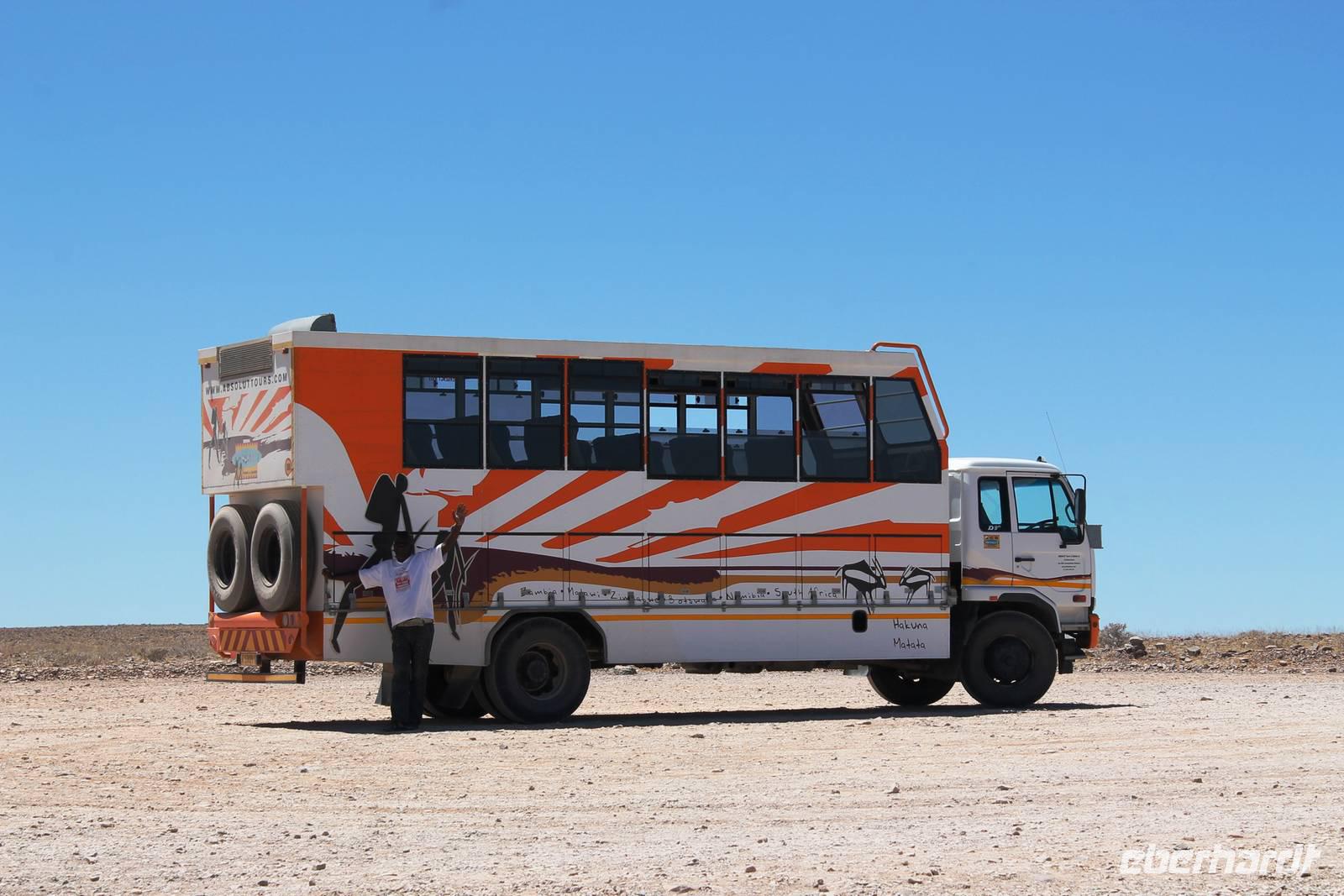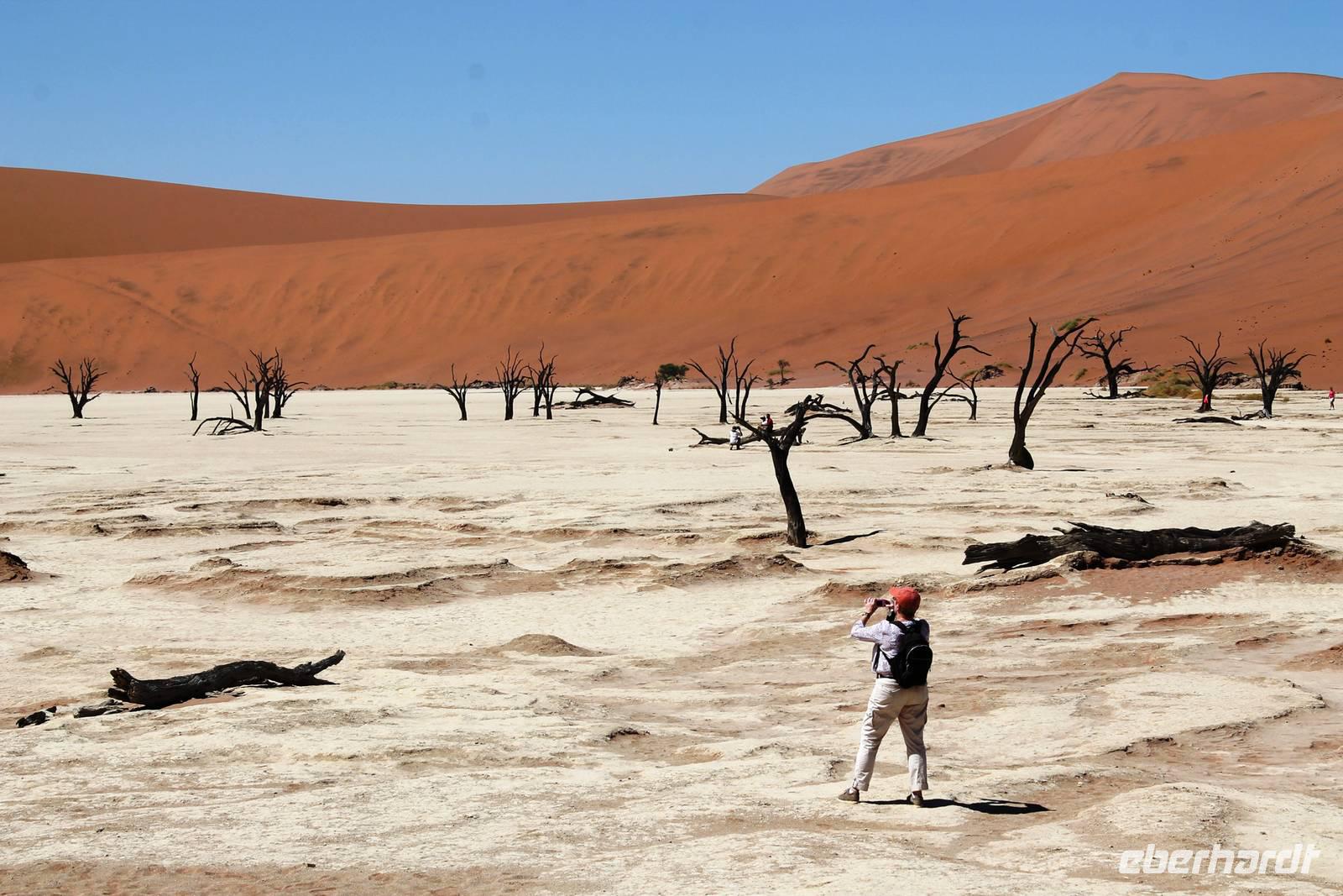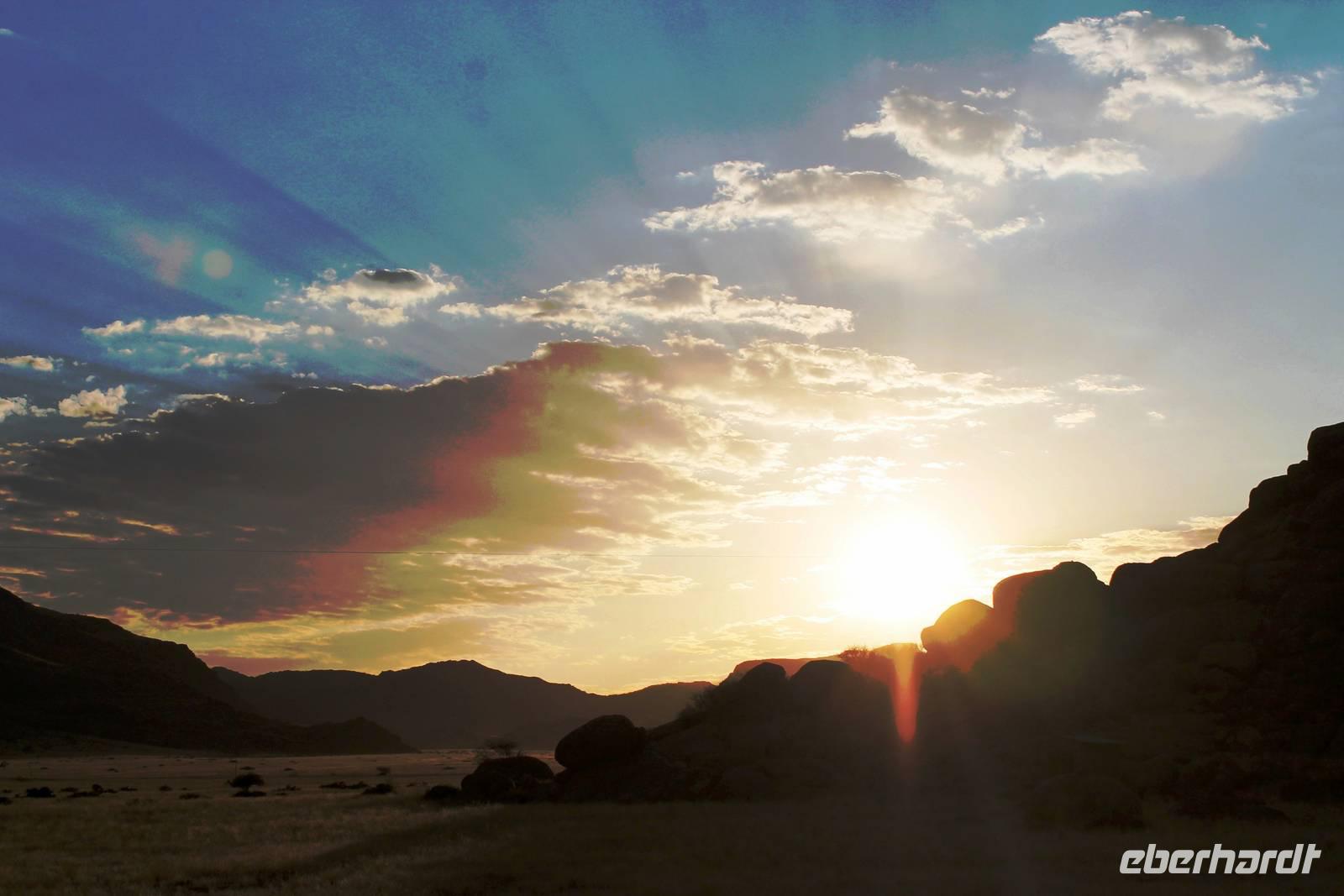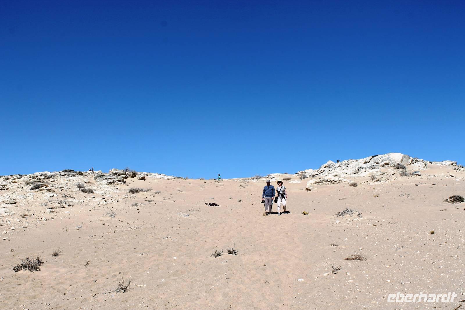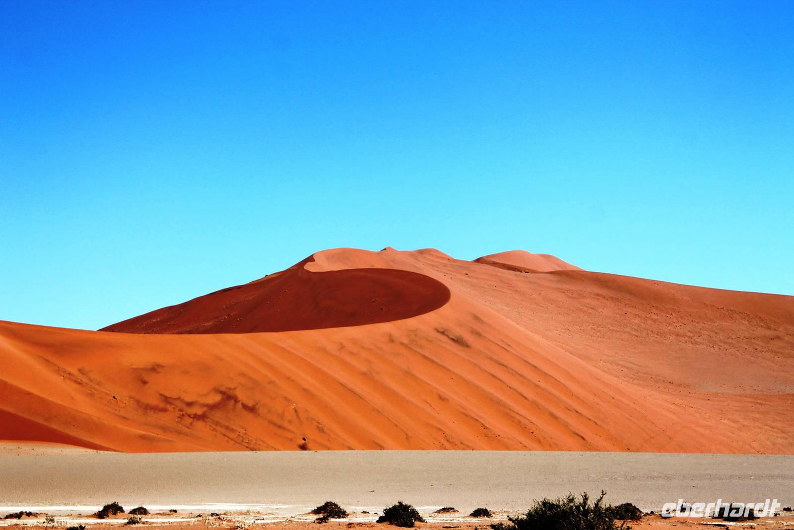 Frühes Aufstehen war heute Pflicht, denn unser Ziel waren die höchsten Dünen der Welt in der Namib. Ja, es war noch sehr früh und dunkel, die meisten schlürften demzufolge still ihren Kaffee. Nach dem wir Koffer und Lunchpakete im Truck verstaut hatten, fuhren wir los. Zum Sonnenaufgang wurden wir von einer Bodenwelle etwas unsanft geweckt. Die Tore zum Sossusvlei Park öffnen bei Sonnenaufgang, also ca. 6:30 Uhr "afrikanischer" Zeit. Im frühen Morgenlicht erstrahlten die hohen Dünen (bis ca. 400 m hoch) im satten Rot im Kontrast zum teilweise tiefblauen, klaren Himmel. Es entstanden fantastische Fotos. Auch Oryxe, Strauße und Springböcke "grasten" in der Wüste. Wir sahen sogar eine seltene Schabrackenhyäne, auch braune Hyäne genannt - Welch ein Glück. Später erklommen wir, die nur ca. 100 m hohe Düne 45. Nach wenigen Metern war "Sand im Getriebe" und die meisten zogen barfuß weiter. Toll, wie viele Eberhardt-Gäste sich als Gipfelstürmer bewiesen. Nach dem „Frühsport" wurden wir mit einer grandiosen Aussicht auf das Dünenmeer belohnt. Heute war ja Bergfest, im wahrsten Sinne des Wortes. Nach dem rasanten Abstieg "gruben" wir die Klappstühle aus und frühstückten in einzigartiger Umgebung. Später wechselten wir unseren Truck und stiegen in Allrad-Fahrzeuge, um durch sandigen Boden im Trockenflußbett weiter zu kommen. Wir unternahmen eine weitere sportliche Herausforderung und wanderten zum Dead Vlei, wo jegliche Vegetation tot erschien. Unsere letzte Station war ein Fotostopp an der ausgetrockneten Lehmsenke, dem eigentliche Sossusvlei. Die Rückfahrt zum 4x4 Parkplatz gestaltete sich zur hart umkämpften Wüstenralley. Mittlerweile war Mittagszeit und es war sehr heiß, der heißeste Tag auf unserer Reise (ca. 40° C). Die Dünen leuchteten nun in Orange und Gelb - ein fantastisches Farbenspiel. Anschließend picknickten wir unter einem Schattenbaum, bevor wir in den, ebenfalls trockenen Sesriem Canyon hinab stiegen und mit Horst erkundeten. In unserer idyllisch gelegenen Lodge am Rande des Namib Naukluft Parks erwartete uns ein erfrischendes Bad im kleinen Felsenpool, ein traumhafter Sonnenuntergang mit Amarula und ein Braai Abendessen, welches wir allesamt selbst zubereiteten - Danke den fleissigen Helfern. Mit leckerem Essen, frisch Gezapften, Amarula, Geschichten und knalligen Effekten (Danke an den Sprengmeister Gabi) hatten wir einen unterhaltsamen Abend im von Eberhardt besetzten Namib Naukluft Camp.