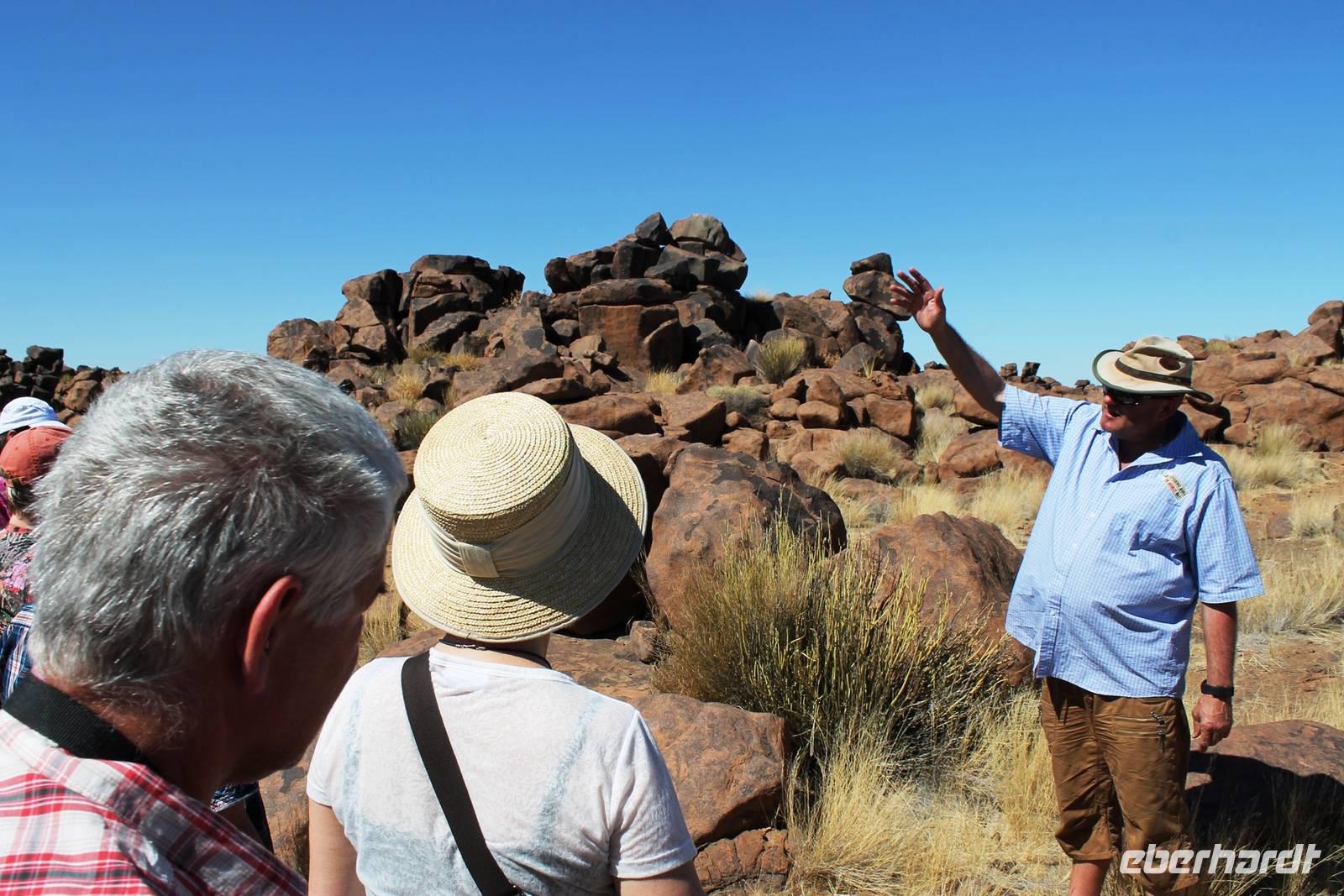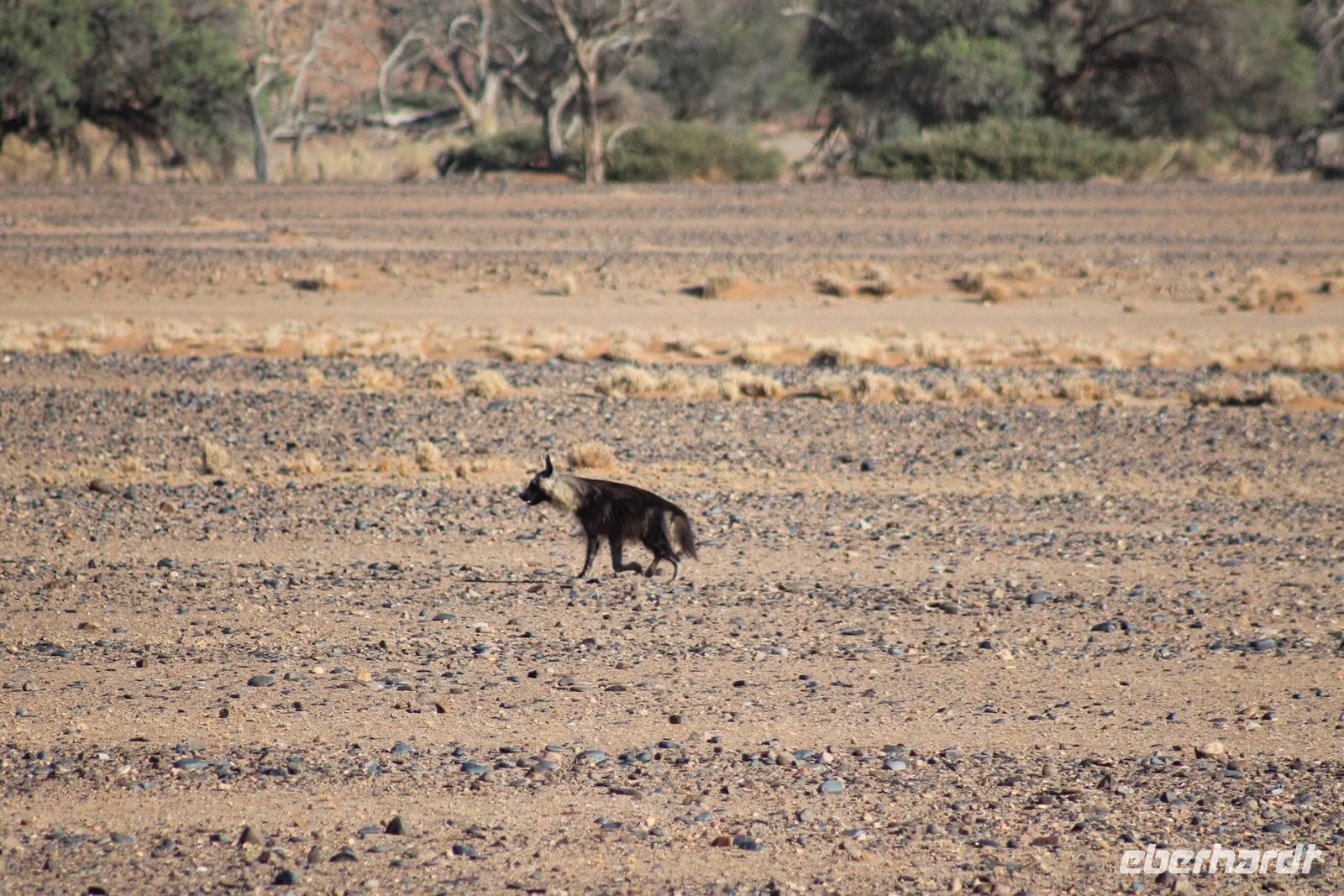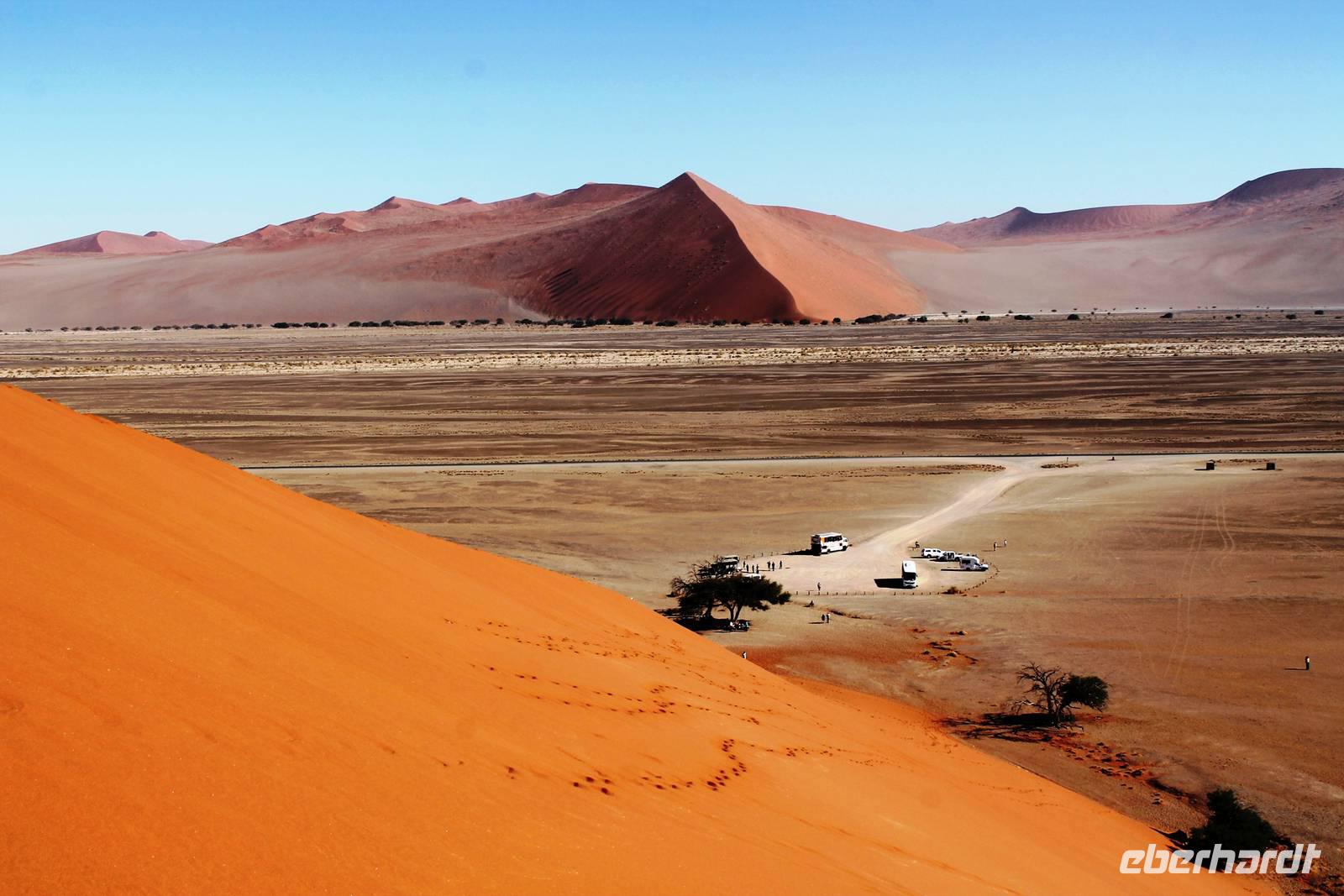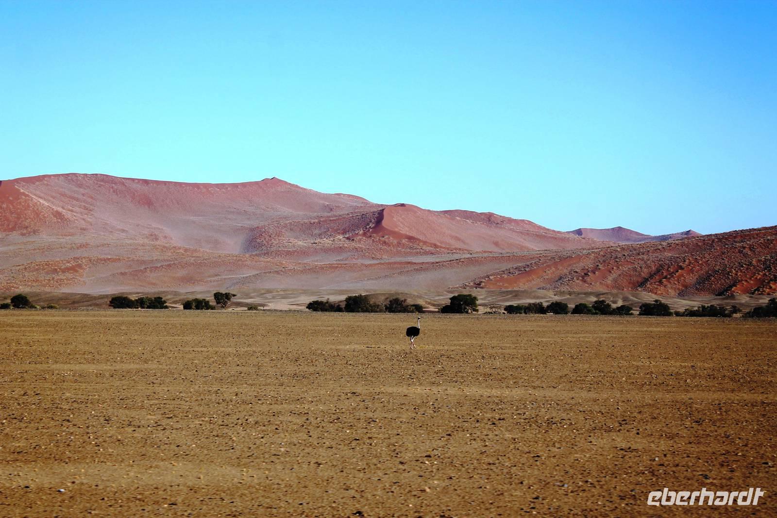 Frühes Aufstehen war heute Pflicht, denn unser Ziel waren die höchsten Dünen der Welt in der Namib. Ja, es war noch sehr früh und dunkel, die meisten schlürften demzufolge still ihren Kaffee. Nach dem wir Koffer und Lunchpakete im Truck verstaut hatten, fuhren wir los. Zum Sonnenaufgang wurden wir von einer Bodenwelle etwas unsanft geweckt. Die Tore zum Sossusvlei Park öffnen bei Sonnenaufgang, also ca. 6:30 Uhr "afrikanischer" Zeit. Im frühen Morgenlicht erstrahlten die hohen Dünen (bis ca. 400 m hoch) im satten Rot im Kontrast zum teilweise tiefblauen, klaren Himmel. Es entstanden fantastische Fotos. Auch Oryxe, Strauße und Springböcke "grasten" in der Wüste. Wir sahen sogar eine seltene Schabrackenhyäne, auch braune Hyäne genannt - Welch ein Glück. Später erklommen wir, die nur ca. 100 m hohe Düne 45. Nach wenigen Metern war "Sand im Getriebe" und die meisten zogen barfuß weiter. Toll, wie viele Eberhardt-Gäste sich als Gipfelstürmer bewiesen. Nach dem „Frühsport" wurden wir mit einer grandiosen Aussicht auf das Dünenmeer belohnt. Heute war ja Bergfest, im wahrsten Sinne des Wortes. Nach dem rasanten Abstieg "gruben" wir die Klappstühle aus und frühstückten in einzigartiger Umgebung. Später wechselten wir unseren Truck und stiegen in Allrad-Fahrzeuge, um durch sandigen Boden im Trockenflußbett weiter zu kommen. Wir unternahmen eine weitere sportliche Herausforderung und wanderten zum Dead Vlei, wo jegliche Vegetation tot erschien. Unsere letzte Station war ein Fotostopp an der ausgetrockneten Lehmsenke, dem eigentliche Sossusvlei. Die Rückfahrt zum 4x4 Parkplatz gestaltete sich zur hart umkämpften Wüstenralley. Mittlerweile war Mittagszeit und es war sehr heiß, der heißeste Tag auf unserer Reise (ca. 40° C). Die Dünen leuchteten nun in Orange und Gelb - ein fantastisches Farbenspiel. Anschließend picknickten wir unter einem Schattenbaum, bevor wir in den, ebenfalls trockenen Sesriem Canyon hinab stiegen und mit Horst erkundeten. In unserer idyllisch gelegenen Lodge am Rande des Namib Naukluft Parks erwartete uns ein erfrischendes Bad im kleinen Felsenpool, ein traumhafter Sonnenuntergang mit Amarula und ein Braai Abendessen, welches wir allesamt selbst zubereiteten - Danke den fleissigen Helfern. Mit leckerem Essen, frisch Gezapften, Amarula, Geschichten und knalligen Effekten (Danke an den Sprengmeister Gabi) hatten wir einen unterhaltsamen Abend im von Eberhardt besetzten Namib Naukluft Camp.