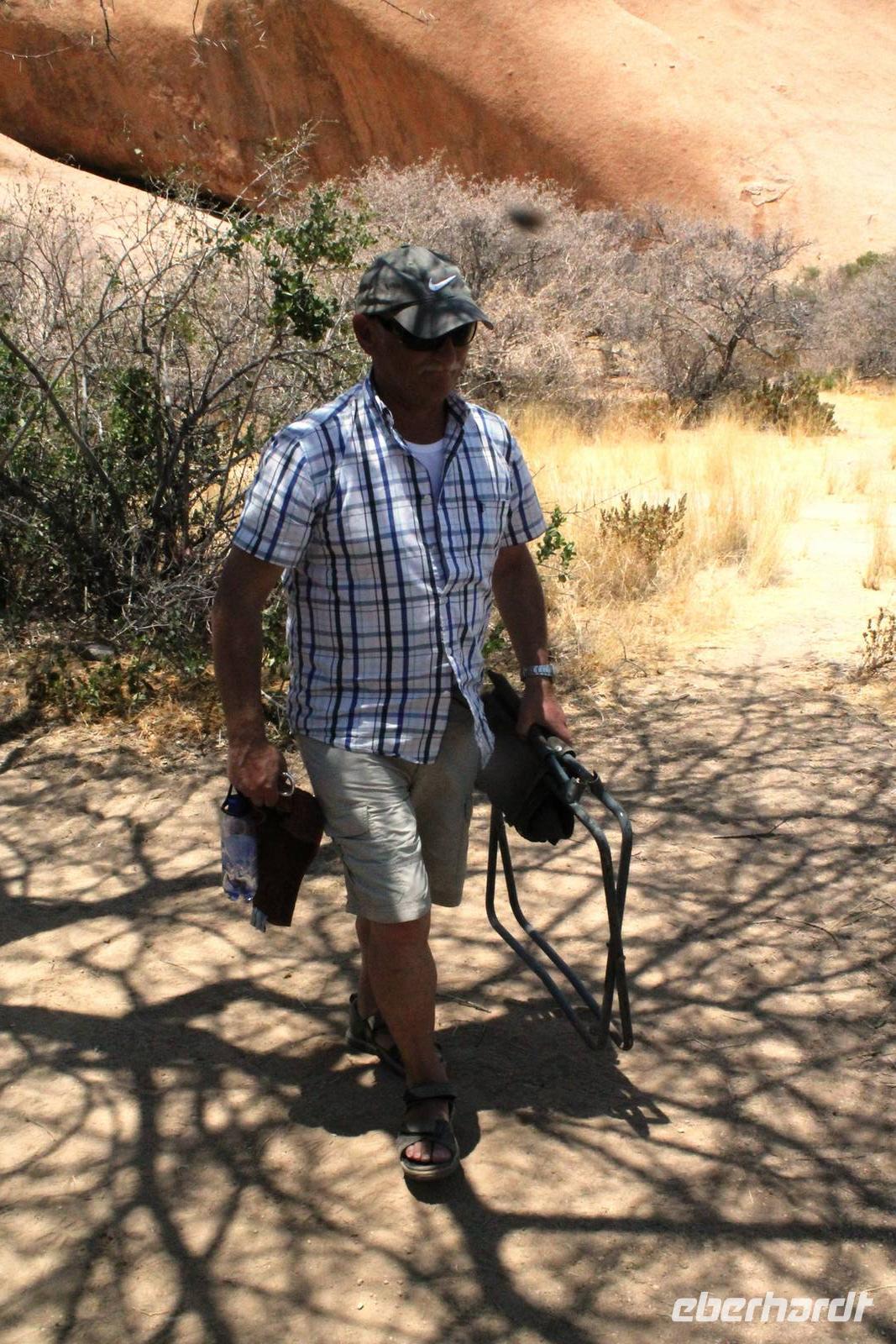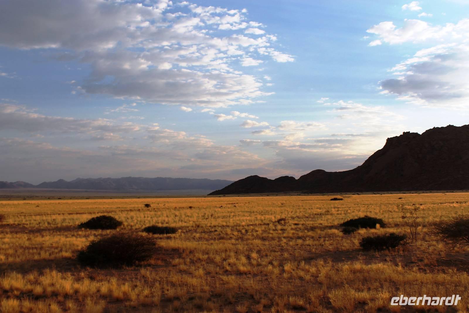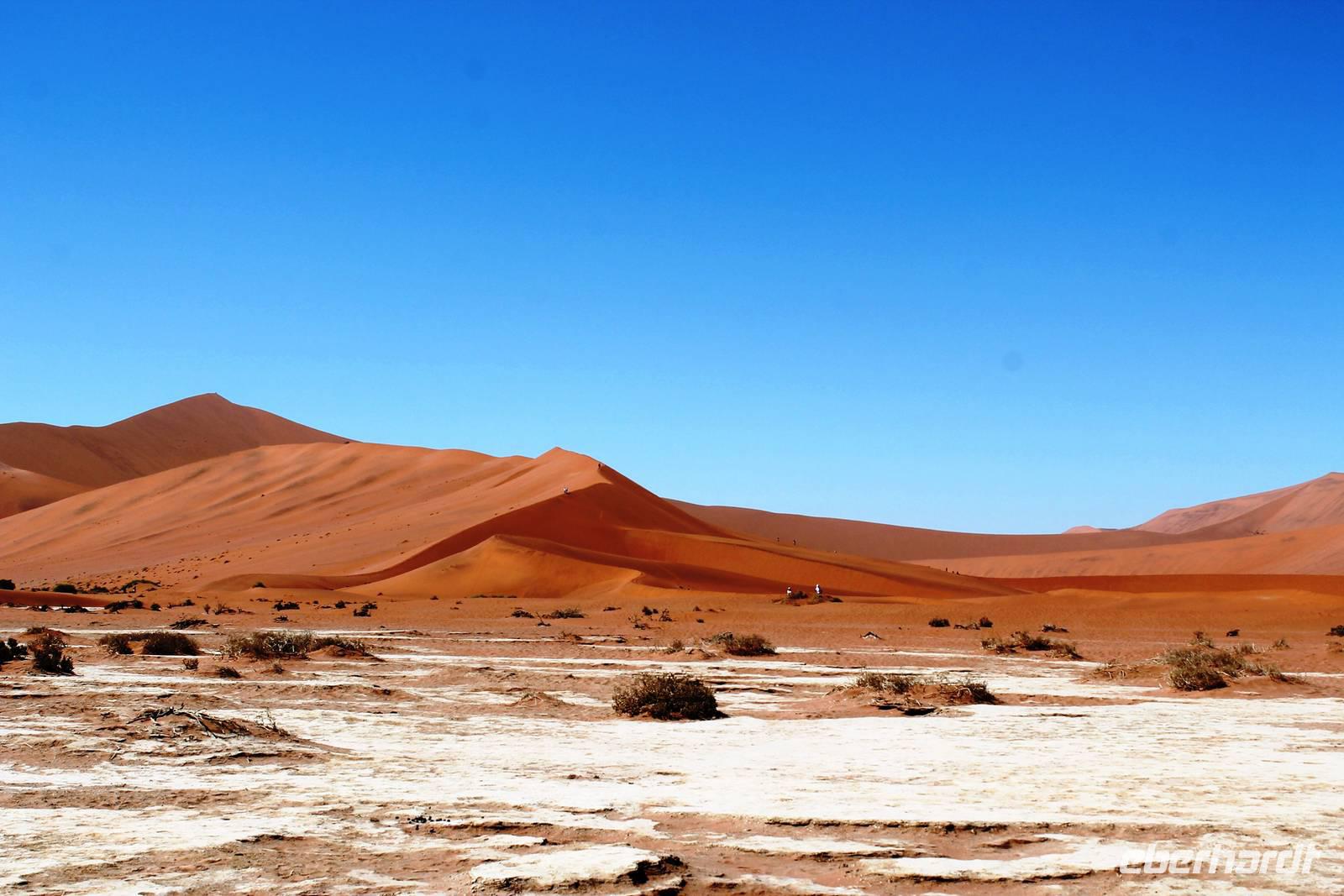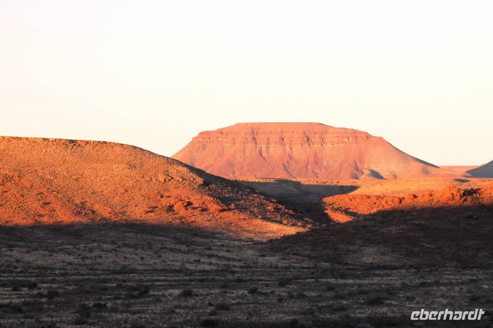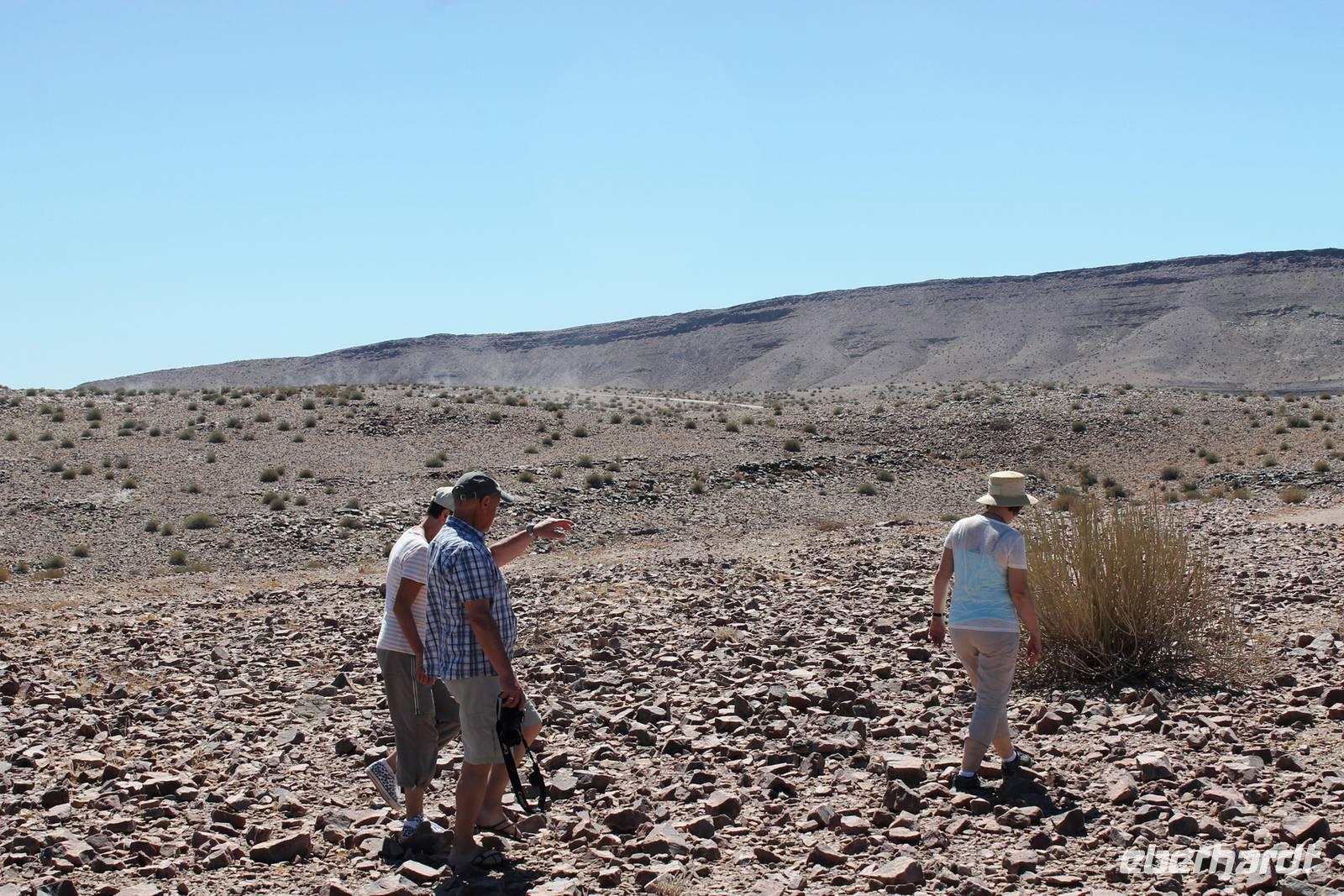 Frühes Aufstehen war heute Pflicht, denn unser Ziel waren die höchsten Dünen der Welt in der Namib. Ja, es war noch sehr früh und dunkel, die meisten schlürften demzufolge still ihren Kaffee. Nach dem wir Koffer und Lunchpakete im Truck verstaut hatten, fuhren wir los. Zum Sonnenaufgang wurden wir von einer Bodenwelle etwas unsanft geweckt. Die Tore zum Sossusvlei Park öffnen bei Sonnenaufgang, also ca. 6:30 Uhr "afrikanischer" Zeit. Im frühen Morgenlicht erstrahlten die hohen Dünen (bis ca. 400 m hoch) im satten Rot im Kontrast zum teilweise tiefblauen, klaren Himmel. Es entstanden fantastische Fotos. Auch Oryxe, Strauße und Springböcke "grasten" in der Wüste. Wir sahen sogar eine seltene Schabrackenhyäne, auch braune Hyäne genannt - Welch ein Glück. Später erklommen wir, die nur ca. 100 m hohe Düne 45. Nach wenigen Metern war "Sand im Getriebe" und die meisten zogen barfuß weiter. Toll, wie viele Eberhardt-Gäste sich als Gipfelstürmer bewiesen. Nach dem „Frühsport" wurden wir mit einer grandiosen Aussicht auf das Dünenmeer belohnt. Heute war ja Bergfest, im wahrsten Sinne des Wortes. Nach dem rasanten Abstieg "gruben" wir die Klappstühle aus und frühstückten in einzigartiger Umgebung. Später wechselten wir unseren Truck und stiegen in Allrad-Fahrzeuge, um durch sandigen Boden im Trockenflußbett weiter zu kommen. Wir unternahmen eine weitere sportliche Herausforderung und wanderten zum Dead Vlei, wo jegliche Vegetation tot erschien. Unsere letzte Station war ein Fotostopp an der ausgetrockneten Lehmsenke, dem eigentliche Sossusvlei. Die Rückfahrt zum 4x4 Parkplatz gestaltete sich zur hart umkämpften Wüstenralley. Mittlerweile war Mittagszeit und es war sehr heiß, der heißeste Tag auf unserer Reise (ca. 40° C). Die Dünen leuchteten nun in Orange und Gelb - ein fantastisches Farbenspiel. Anschließend picknickten wir unter einem Schattenbaum, bevor wir in den, ebenfalls trockenen Sesriem Canyon hinab stiegen und mit Horst erkundeten. In unserer idyllisch gelegenen Lodge am Rande des Namib Naukluft Parks erwartete uns ein erfrischendes Bad im kleinen Felsenpool, ein traumhafter Sonnenuntergang mit Amarula und ein Braai Abendessen, welches wir allesamt selbst zubereiteten - Danke den fleissigen Helfern. Mit leckerem Essen, frisch Gezapften, Amarula, Geschichten und knalligen Effekten (Danke an den Sprengmeister Gabi) hatten wir einen unterhaltsamen Abend im von Eberhardt besetzten Namib Naukluft Camp.