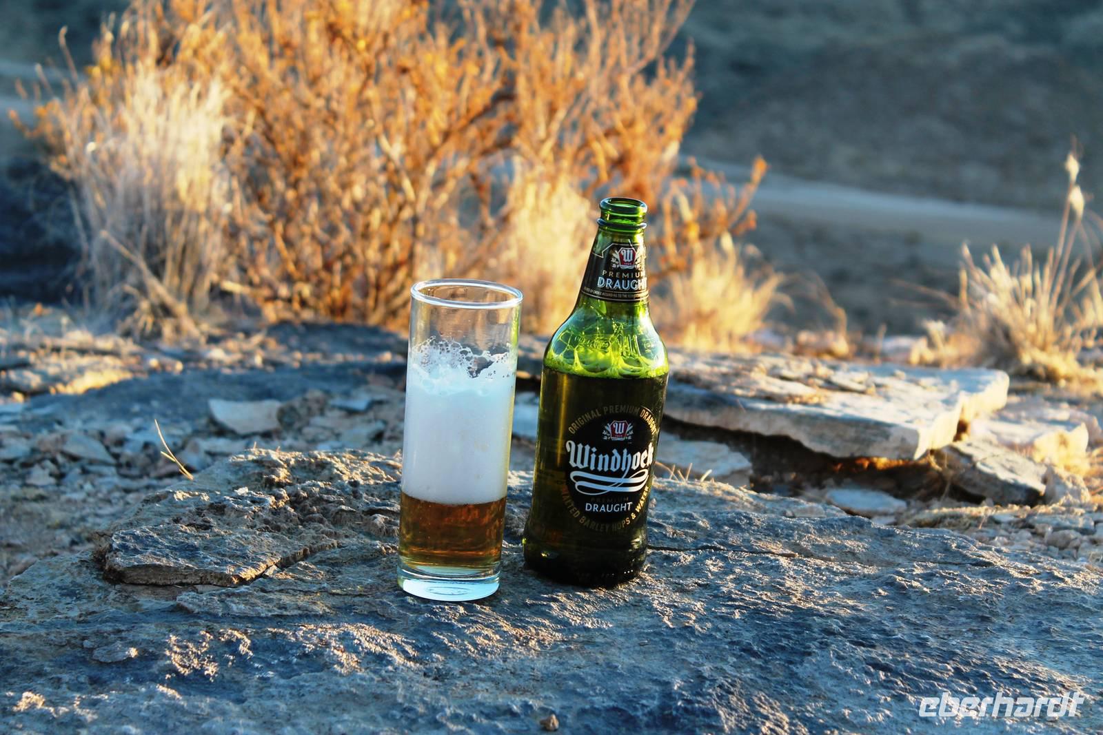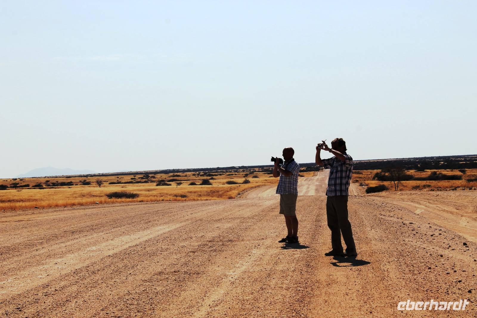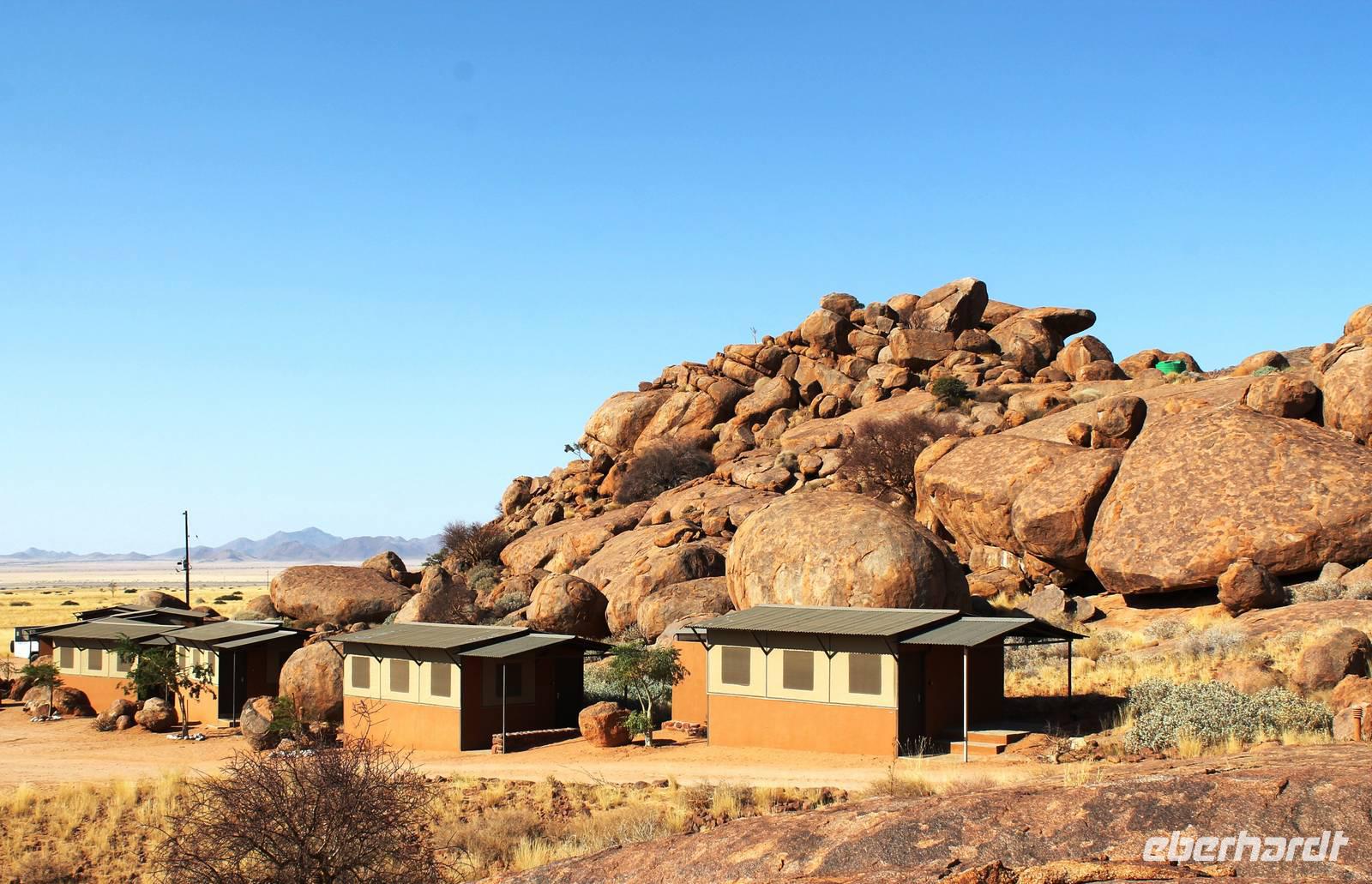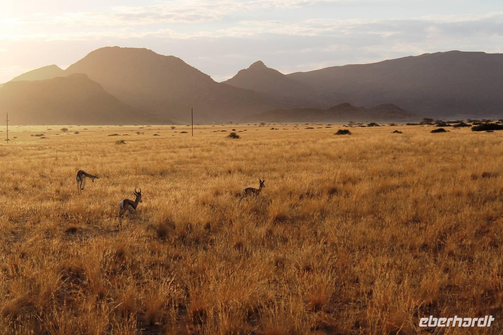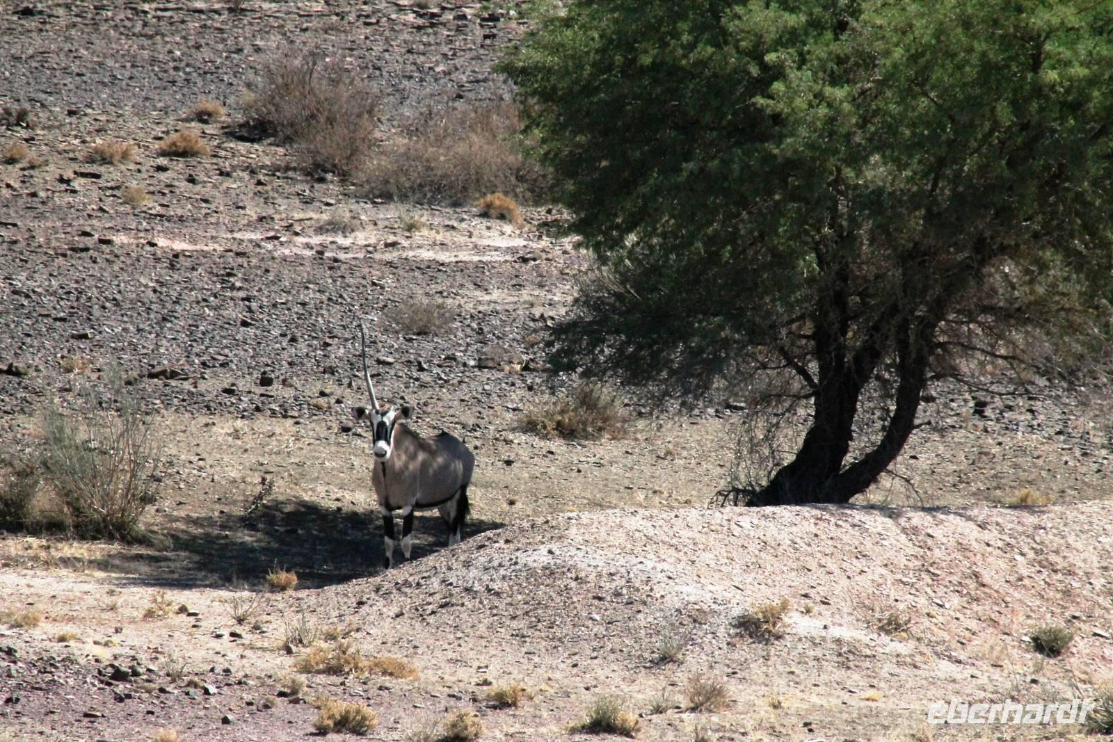 Frühes Aufstehen war heute Pflicht, denn unser Ziel waren die höchsten Dünen der Welt in der Namib. Ja, es war noch sehr früh und dunkel, die meisten schlürften demzufolge still ihren Kaffee. Nach dem wir Koffer und Lunchpakete im Truck verstaut hatten, fuhren wir los. Zum Sonnenaufgang wurden wir von einer Bodenwelle etwas unsanft geweckt. Die Tore zum Sossusvlei Park öffnen bei Sonnenaufgang, also ca. 6:30 Uhr "afrikanischer" Zeit. Im frühen Morgenlicht erstrahlten die hohen Dünen (bis ca. 400 m hoch) im satten Rot im Kontrast zum teilweise tiefblauen, klaren Himmel. Es entstanden fantastische Fotos. Auch Oryxe, Strauße und Springböcke "grasten" in der Wüste. Wir sahen sogar eine seltene Schabrackenhyäne, auch braune Hyäne genannt - Welch ein Glück. Später erklommen wir, die nur ca. 100 m hohe Düne 45. Nach wenigen Metern war "Sand im Getriebe" und die meisten zogen barfuß weiter. Toll, wie viele Eberhardt-Gäste sich als Gipfelstürmer bewiesen. Nach dem „Frühsport" wurden wir mit einer grandiosen Aussicht auf das Dünenmeer belohnt. Heute war ja Bergfest, im wahrsten Sinne des Wortes. Nach dem rasanten Abstieg "gruben" wir die Klappstühle aus und frühstückten in einzigartiger Umgebung. Später wechselten wir unseren Truck und stiegen in Allrad-Fahrzeuge, um durch sandigen Boden im Trockenflußbett weiter zu kommen. Wir unternahmen eine weitere sportliche Herausforderung und wanderten zum Dead Vlei, wo jegliche Vegetation tot erschien. Unsere letzte Station war ein Fotostopp an der ausgetrockneten Lehmsenke, dem eigentliche Sossusvlei. Die Rückfahrt zum 4x4 Parkplatz gestaltete sich zur hart umkämpften Wüstenralley. Mittlerweile war Mittagszeit und es war sehr heiß, der heißeste Tag auf unserer Reise (ca. 40° C). Die Dünen leuchteten nun in Orange und Gelb - ein fantastisches Farbenspiel. Anschließend picknickten wir unter einem Schattenbaum, bevor wir in den, ebenfalls trockenen Sesriem Canyon hinab stiegen und mit Horst erkundeten. In unserer idyllisch gelegenen Lodge am Rande des Namib Naukluft Parks erwartete uns ein erfrischendes Bad im kleinen Felsenpool, ein traumhafter Sonnenuntergang mit Amarula und ein Braai Abendessen, welches wir allesamt selbst zubereiteten - Danke den fleissigen Helfern. Mit leckerem Essen, frisch Gezapften, Amarula, Geschichten und knalligen Effekten (Danke an den Sprengmeister Gabi) hatten wir einen unterhaltsamen Abend im von Eberhardt besetzten Namib Naukluft Camp.