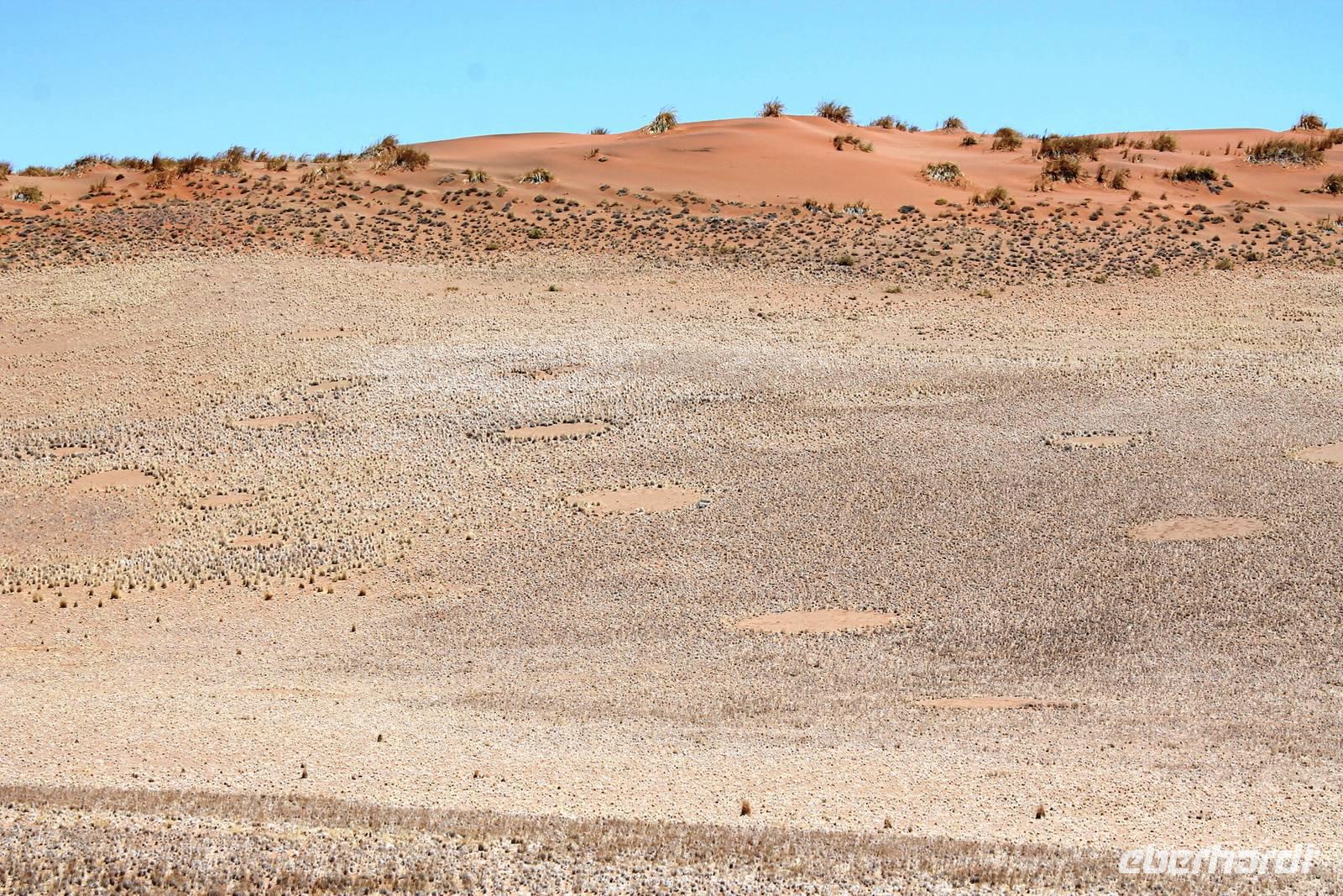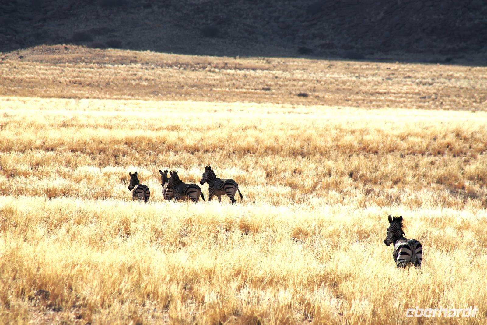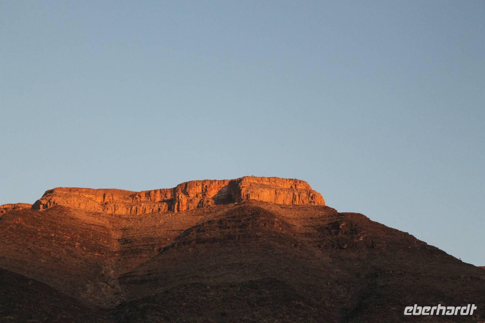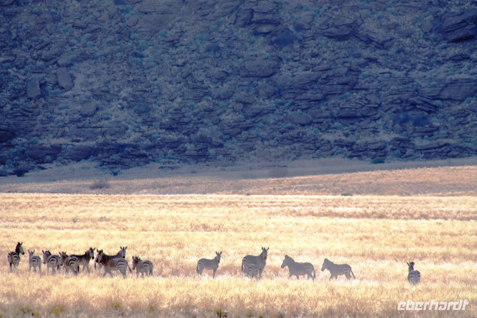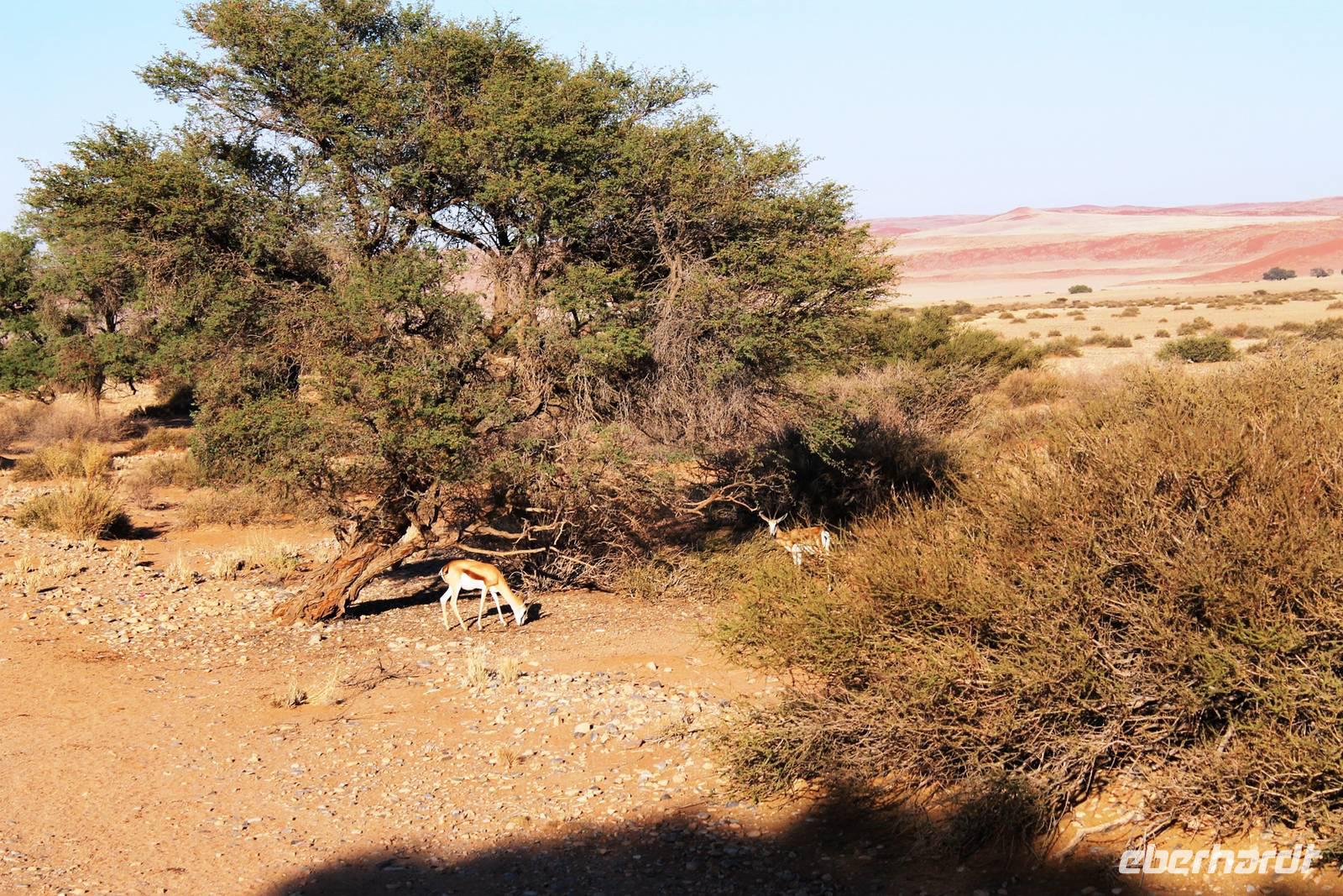 Frühes Aufstehen war heute Pflicht, denn unser Ziel waren die höchsten Dünen der Welt in der Namib. Ja, es war noch sehr früh und dunkel, die meisten schlürften demzufolge still ihren Kaffee. Nach dem wir Koffer und Lunchpakete im Truck verstaut hatten, fuhren wir los. Zum Sonnenaufgang wurden wir von einer Bodenwelle etwas unsanft geweckt. Die Tore zum Sossusvlei Park öffnen bei Sonnenaufgang, also ca. 6:30 Uhr "afrikanischer" Zeit. Im frühen Morgenlicht erstrahlten die hohen Dünen (bis ca. 400 m hoch) im satten Rot im Kontrast zum teilweise tiefblauen, klaren Himmel. Es entstanden fantastische Fotos. Auch Oryxe, Strauße und Springböcke "grasten" in der Wüste. Wir sahen sogar eine seltene Schabrackenhyäne, auch braune Hyäne genannt - Welch ein Glück. Später erklommen wir, die nur ca. 100 m hohe Düne 45. Nach wenigen Metern war "Sand im Getriebe" und die meisten zogen barfuß weiter. Toll, wie viele Eberhardt-Gäste sich als Gipfelstürmer bewiesen. Nach dem „Frühsport" wurden wir mit einer grandiosen Aussicht auf das Dünenmeer belohnt. Heute war ja Bergfest, im wahrsten Sinne des Wortes. Nach dem rasanten Abstieg "gruben" wir die Klappstühle aus und frühstückten in einzigartiger Umgebung. Später wechselten wir unseren Truck und stiegen in Allrad-Fahrzeuge, um durch sandigen Boden im Trockenflußbett weiter zu kommen. Wir unternahmen eine weitere sportliche Herausforderung und wanderten zum Dead Vlei, wo jegliche Vegetation tot erschien. Unsere letzte Station war ein Fotostopp an der ausgetrockneten Lehmsenke, dem eigentliche Sossusvlei. Die Rückfahrt zum 4x4 Parkplatz gestaltete sich zur hart umkämpften Wüstenralley. Mittlerweile war Mittagszeit und es war sehr heiß, der heißeste Tag auf unserer Reise (ca. 40° C). Die Dünen leuchteten nun in Orange und Gelb - ein fantastisches Farbenspiel. Anschließend picknickten wir unter einem Schattenbaum, bevor wir in den, ebenfalls trockenen Sesriem Canyon hinab stiegen und mit Horst erkundeten. In unserer idyllisch gelegenen Lodge am Rande des Namib Naukluft Parks erwartete uns ein erfrischendes Bad im kleinen Felsenpool, ein traumhafter Sonnenuntergang mit Amarula und ein Braai Abendessen, welches wir allesamt selbst zubereiteten - Danke den fleissigen Helfern. Mit leckerem Essen, frisch Gezapften, Amarula, Geschichten und knalligen Effekten (Danke an den Sprengmeister Gabi) hatten wir einen unterhaltsamen Abend im von Eberhardt besetzten Namib Naukluft Camp.