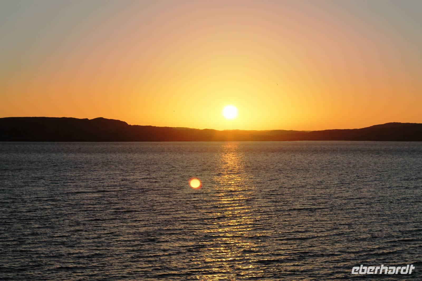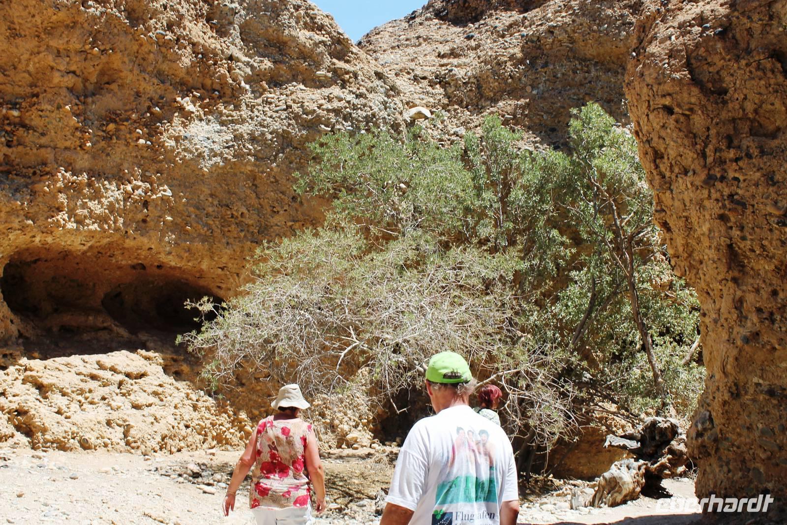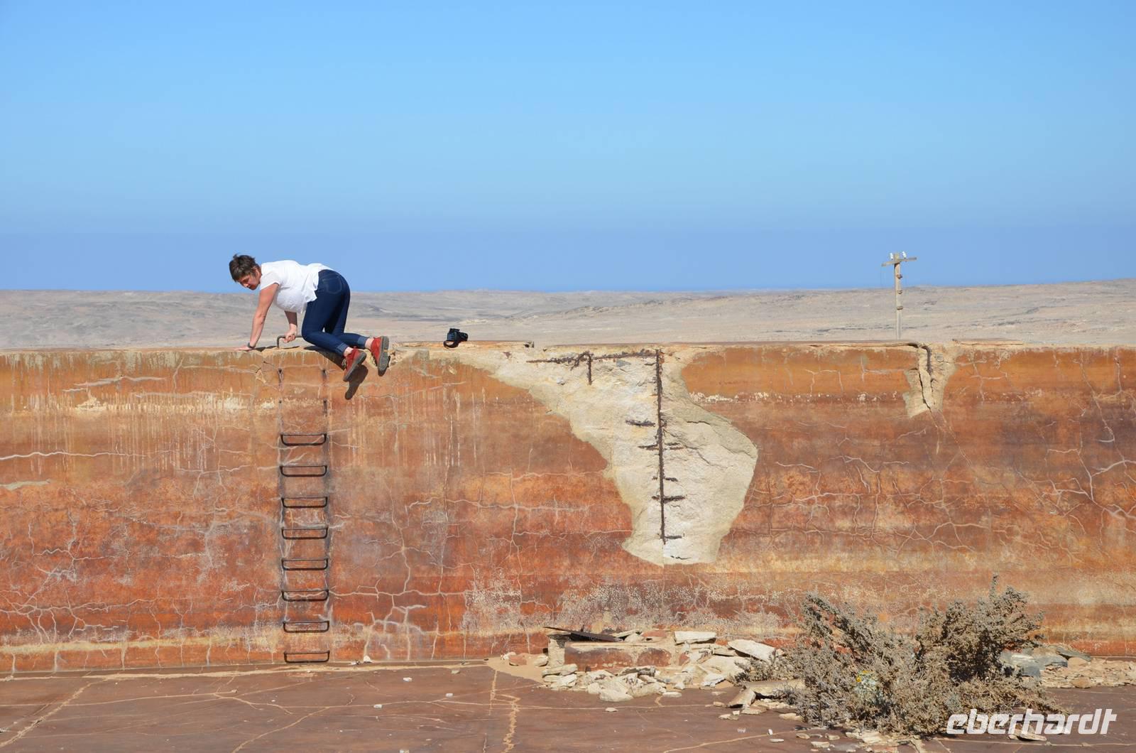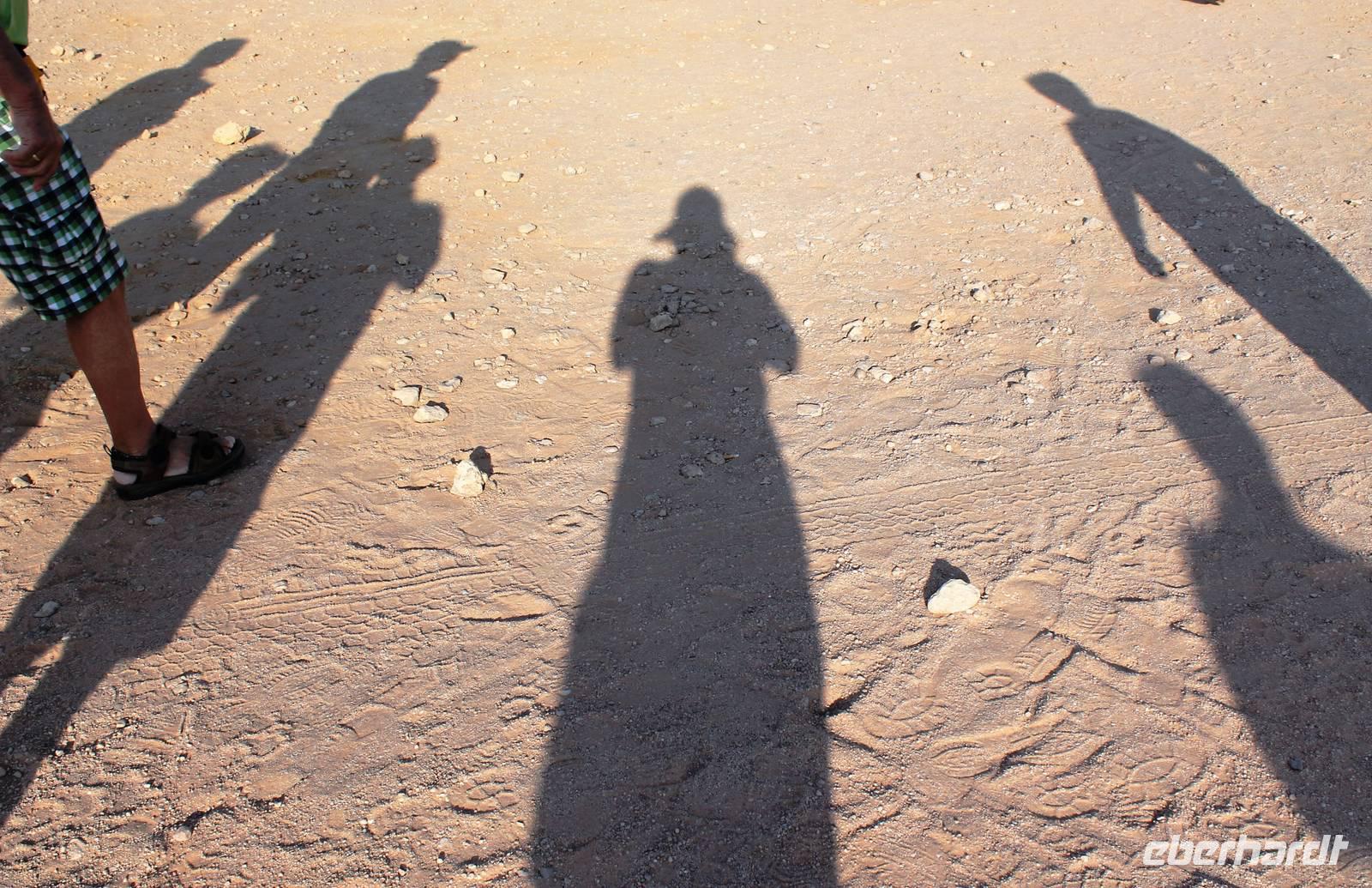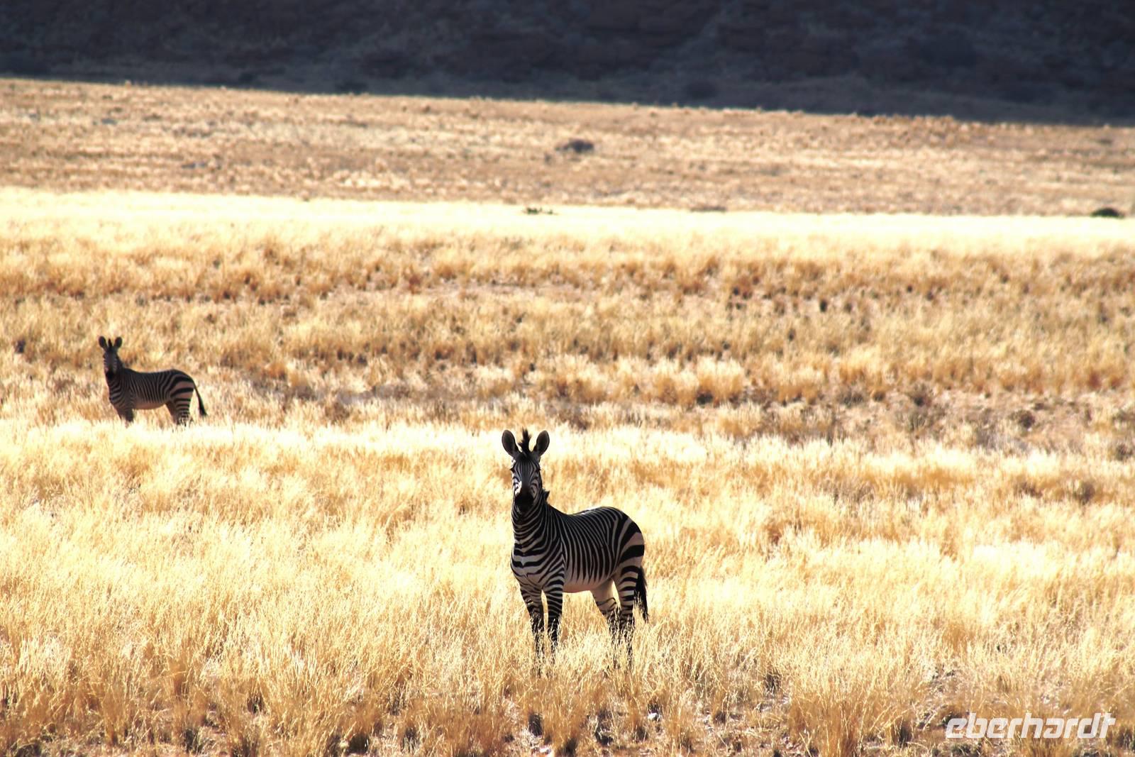 Frühes Aufstehen war heute Pflicht, denn unser Ziel waren die höchsten Dünen der Welt in der Namib. Ja, es war noch sehr früh und dunkel, die meisten schlürften demzufolge still ihren Kaffee. Nach dem wir Koffer und Lunchpakete im Truck verstaut hatten, fuhren wir los. Zum Sonnenaufgang wurden wir von einer Bodenwelle etwas unsanft geweckt. Die Tore zum Sossusvlei Park öffnen bei Sonnenaufgang, also ca. 6:30 Uhr "afrikanischer" Zeit. Im frühen Morgenlicht erstrahlten die hohen Dünen (bis ca. 400 m hoch) im satten Rot im Kontrast zum teilweise tiefblauen, klaren Himmel. Es entstanden fantastische Fotos. Auch Oryxe, Strauße und Springböcke "grasten" in der Wüste. Wir sahen sogar eine seltene Schabrackenhyäne, auch braune Hyäne genannt - Welch ein Glück. Später erklommen wir, die nur ca. 100 m hohe Düne 45. Nach wenigen Metern war "Sand im Getriebe" und die meisten zogen barfuß weiter. Toll, wie viele Eberhardt-Gäste sich als Gipfelstürmer bewiesen. Nach dem „Frühsport" wurden wir mit einer grandiosen Aussicht auf das Dünenmeer belohnt. Heute war ja Bergfest, im wahrsten Sinne des Wortes. Nach dem rasanten Abstieg "gruben" wir die Klappstühle aus und frühstückten in einzigartiger Umgebung. Später wechselten wir unseren Truck und stiegen in Allrad-Fahrzeuge, um durch sandigen Boden im Trockenflußbett weiter zu kommen. Wir unternahmen eine weitere sportliche Herausforderung und wanderten zum Dead Vlei, wo jegliche Vegetation tot erschien. Unsere letzte Station war ein Fotostopp an der ausgetrockneten Lehmsenke, dem eigentliche Sossusvlei. Die Rückfahrt zum 4x4 Parkplatz gestaltete sich zur hart umkämpften Wüstenralley. Mittlerweile war Mittagszeit und es war sehr heiß, der heißeste Tag auf unserer Reise (ca. 40° C). Die Dünen leuchteten nun in Orange und Gelb - ein fantastisches Farbenspiel. Anschließend picknickten wir unter einem Schattenbaum, bevor wir in den, ebenfalls trockenen Sesriem Canyon hinab stiegen und mit Horst erkundeten. In unserer idyllisch gelegenen Lodge am Rande des Namib Naukluft Parks erwartete uns ein erfrischendes Bad im kleinen Felsenpool, ein traumhafter Sonnenuntergang mit Amarula und ein Braai Abendessen, welches wir allesamt selbst zubereiteten - Danke den fleissigen Helfern. Mit leckerem Essen, frisch Gezapften, Amarula, Geschichten und knalligen Effekten (Danke an den Sprengmeister Gabi) hatten wir einen unterhaltsamen Abend im von Eberhardt besetzten Namib Naukluft Camp.