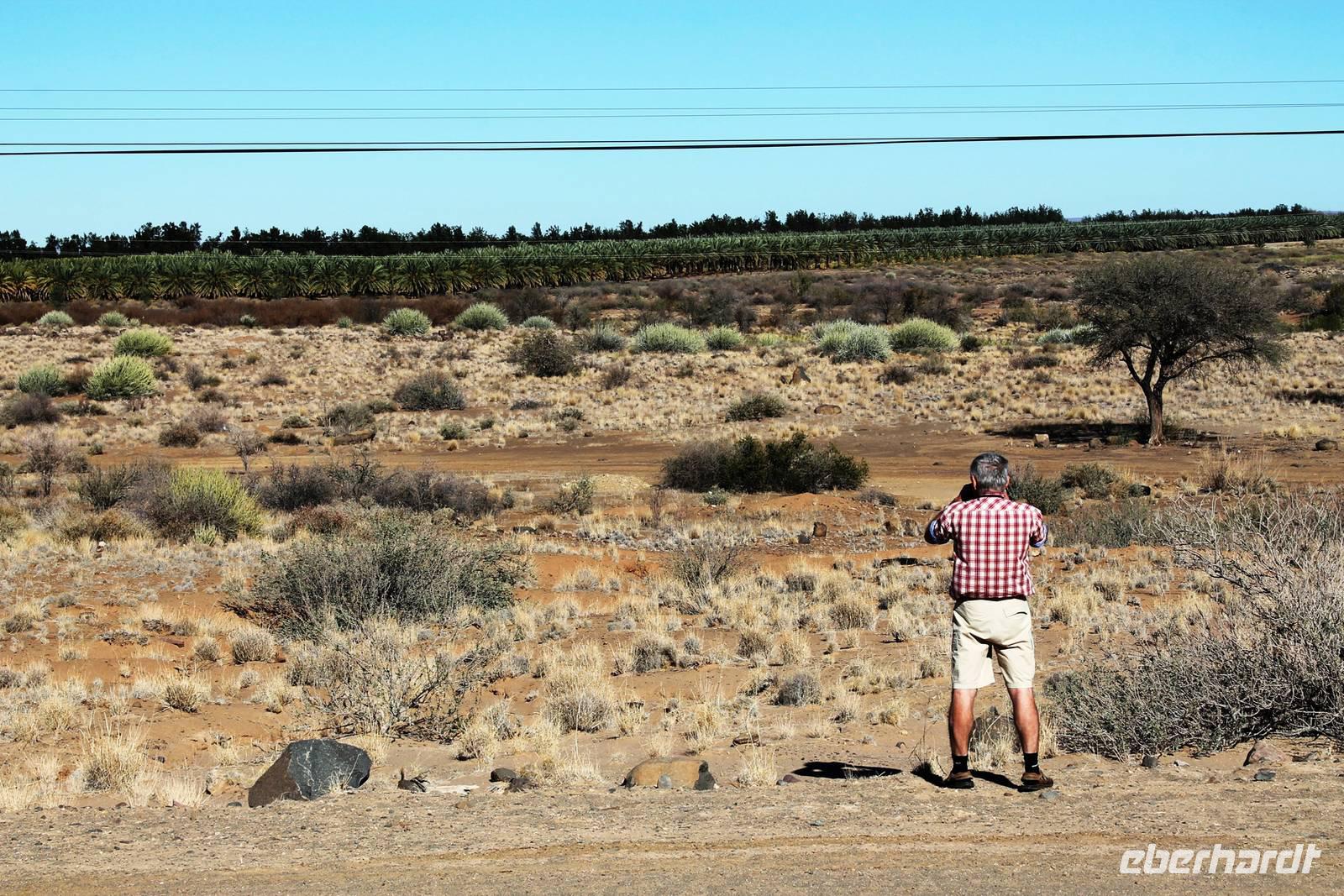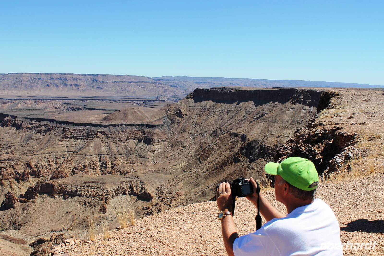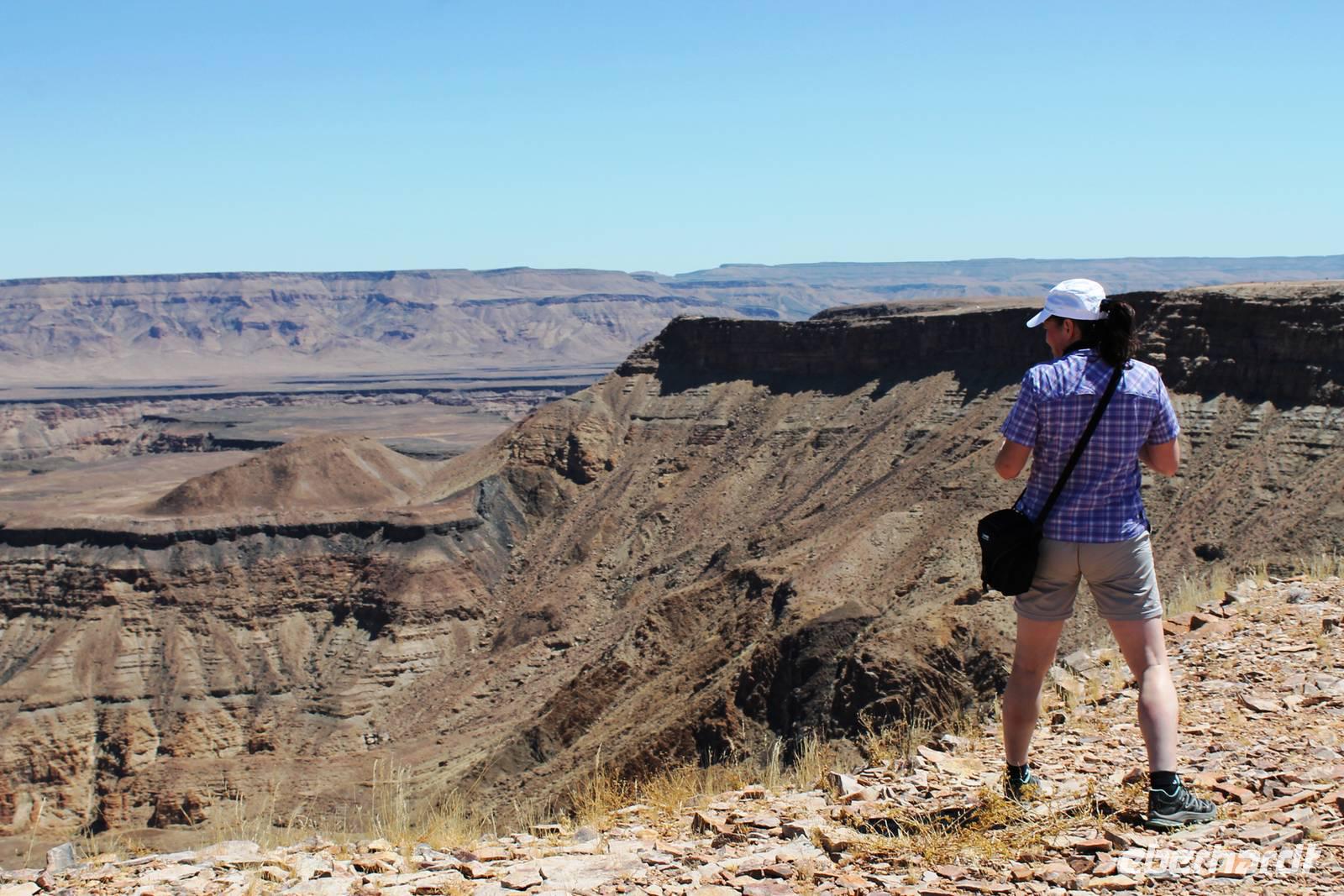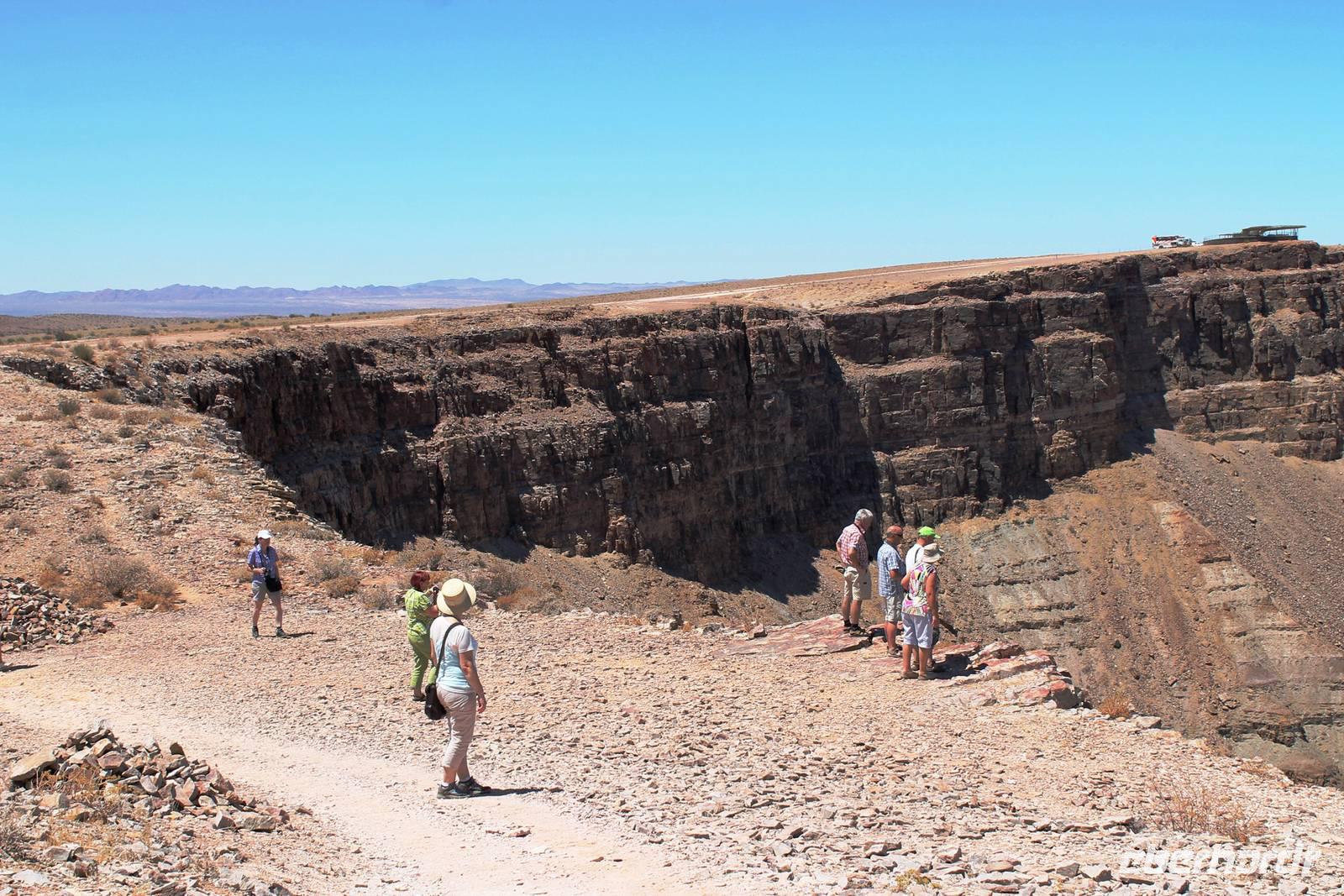 Nach dem Frühstück starteten wir weiter Richtung Süden. Am Naute-Staudamm stoppten wir. Der riesige Wasserspeicher versorgt die gesamte Region um Keetmanshoop und mehr mit dem kühlen Nass. Deshalb ist es nicht verwunderlich, dass hier, in unmittelbarer Umgebung ein kleines Paradies entstand: in der kargen, trockenen Landschaft eine grüne Oase mit Tafeltrauben und Datteln. Die weitere Route führte uns parallel der Eisenbahnstrecke und durch die Karoo bis zum Fish River Canyon. Unterwegs begegneten uns das erste, magische "Einhorn", auch alter Oryx genannt, Strauße und Springböcke. Schon von weitem erahnten wir die gigantischen Ausfläufer des Canyons. Auf Fotos bannten wir diese Momente. Wir fuhren in den Nationalpark hinein, bis zum obersten Aussichtpunkt. Der gigantische Canyon tauchte plötzlich als „großes Loch im Boden" auf - eine spektakuläre Aussicht. Der Fish River windet sich durch den 550 Meter tiefen Canyon und bildet somit die zweitgrößte Schluchtenlandschaft der Erde. Bei einem Spaziergang entlang der Kante boten sich immer wieder neue Perspektiven für zahlreiche Fotos. Am Ende unseres Spazierganges, dort wo früher der Einstieg zur mehrtägigen Wanderung in den Canyon war, wartete Ernest mit dem Truck auf uns. So mußten wir den "heißen" Weg nicht zurück wandern. In dieser wahnsinnigen Kulisse picknickten wir, unser Horst hatte wieder Leckeres auf den Tisch gezaubert. Bereits am frühen Nachmittag bezogen wir unsere kühlen Zimmer im Canon Roadhouse - eine herrliche Oase mitten in der Wüste, gespickt durch Allerlei zum Anschauen: alte, rostige Oldtimer, die zugleich Pflanzkübel für Kakteen sind, eine alte Tankstelle, die heute als Bar weiterhin ihren Zweck erfüllt. Den freien Nachmittag verbringen wir in der Lodge: bei hochsommerlichen Temperaturen ist eine Abkühlung im Pool mit dem freien Blick in die weite Landschaft ein absolutes Muß. Nach Kaffee, Kuchen oder einem anderen kühlen Getränk unternahmen einige einen Spaziergang zum Hausberg und bestaunten noch einmal die unendliche Weite in der untergehenden Sonne. Nach dem schmackhaften Abendessen suchten wir vergebens nach dem Kreuz des Südens. Aber das riesige, helle Sternenzelt, welches über uns aufgeschlagen wurde, verschlug uns den Atem.