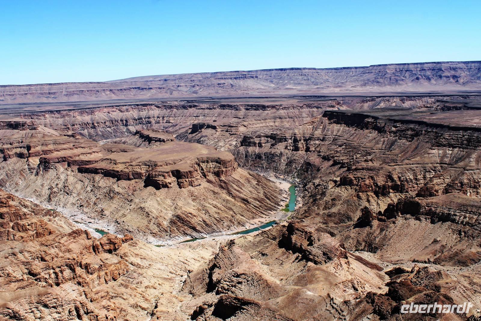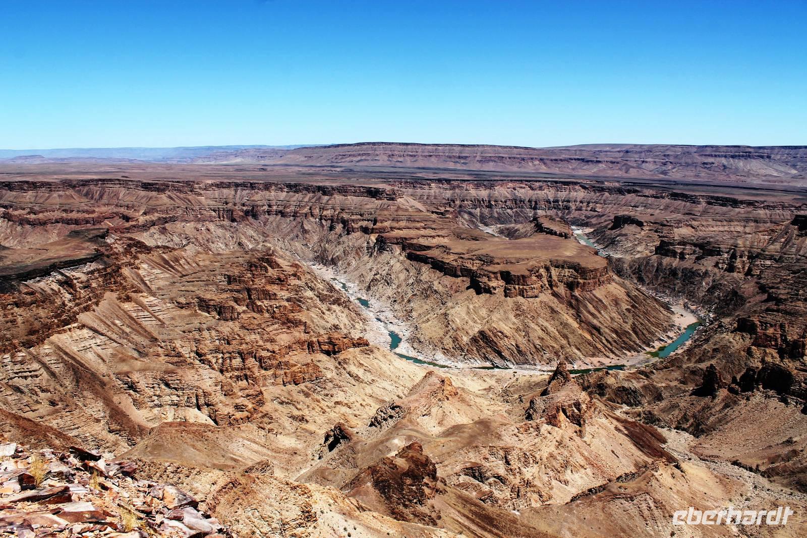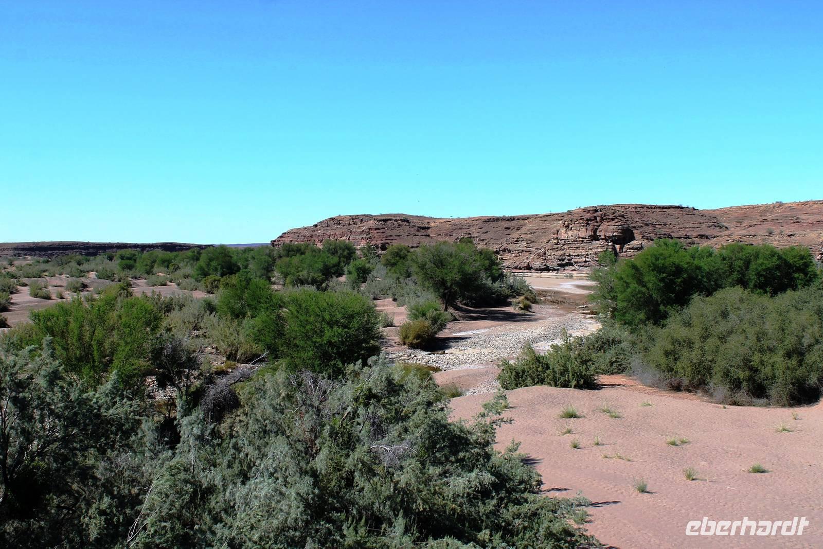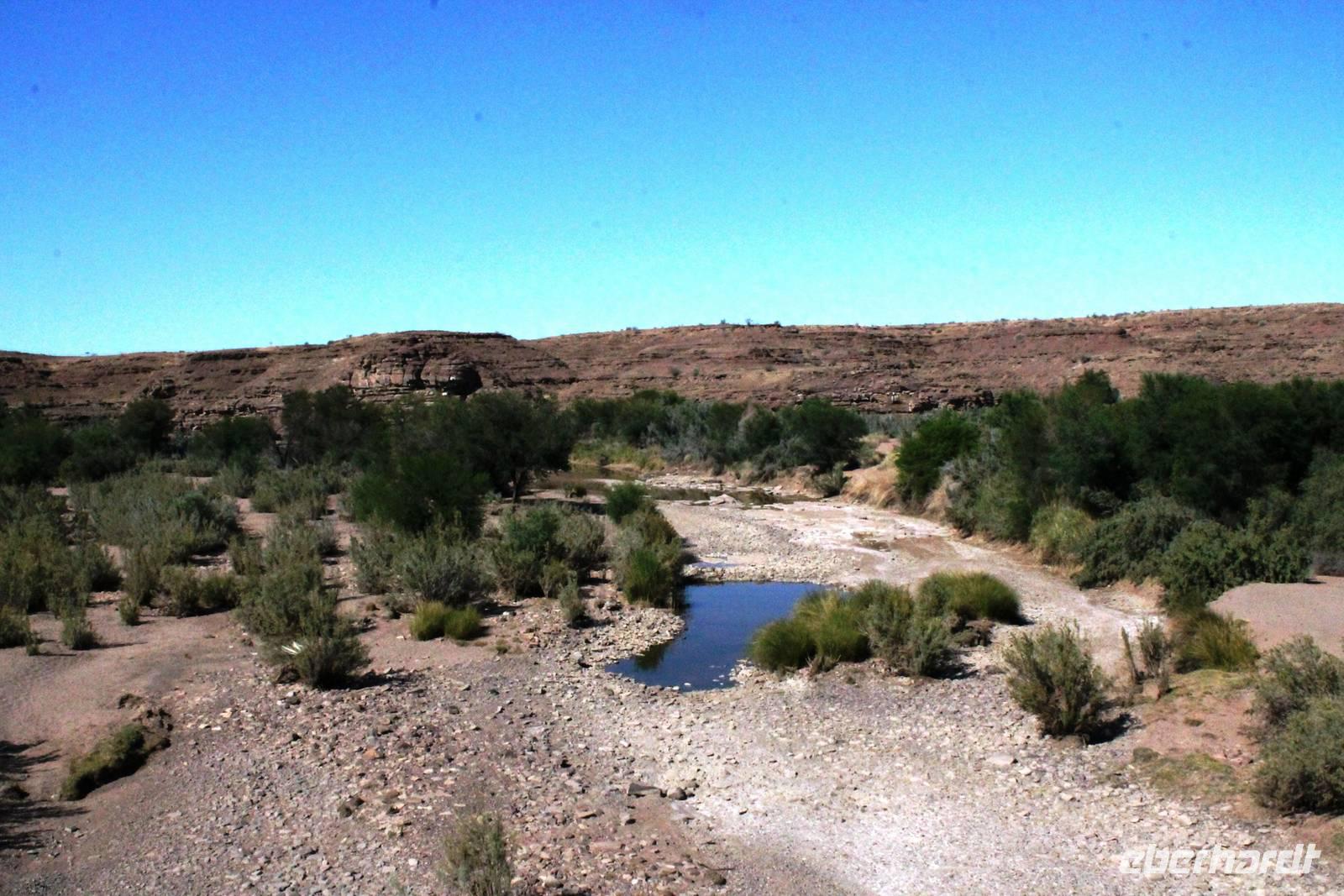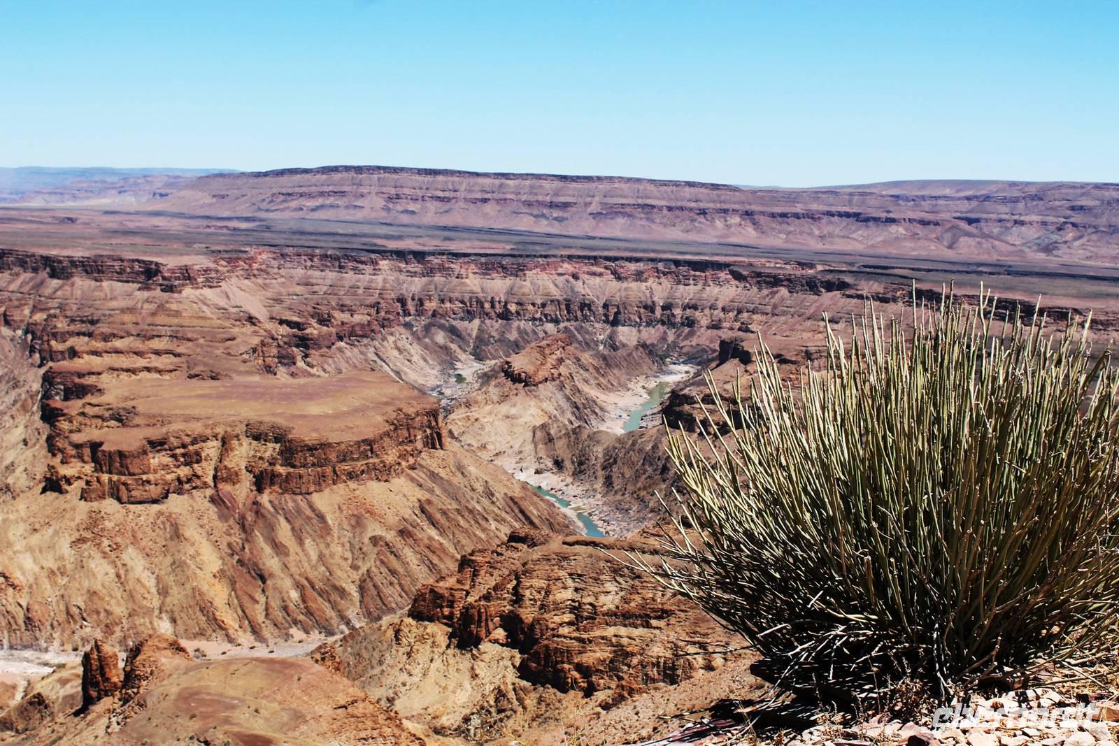 Nach dem Frühstück starteten wir weiter Richtung Süden. Am Naute-Staudamm stoppten wir. Der riesige Wasserspeicher versorgt die gesamte Region um Keetmanshoop und mehr mit dem kühlen Nass. Deshalb ist es nicht verwunderlich, dass hier, in unmittelbarer Umgebung ein kleines Paradies entstand: in der kargen, trockenen Landschaft eine grüne Oase mit Tafeltrauben und Datteln. Die weitere Route führte uns parallel der Eisenbahnstrecke und durch die Karoo bis zum Fish River Canyon. Unterwegs begegneten uns das erste, magische "Einhorn", auch alter Oryx genannt, Strauße und Springböcke. Schon von weitem erahnten wir die gigantischen Ausfläufer des Canyons. Auf Fotos bannten wir diese Momente. Wir fuhren in den Nationalpark hinein, bis zum obersten Aussichtpunkt. Der gigantische Canyon tauchte plötzlich als „großes Loch im Boden" auf - eine spektakuläre Aussicht. Der Fish River windet sich durch den 550 Meter tiefen Canyon und bildet somit die zweitgrößte Schluchtenlandschaft der Erde. Bei einem Spaziergang entlang der Kante boten sich immer wieder neue Perspektiven für zahlreiche Fotos. Am Ende unseres Spazierganges, dort wo früher der Einstieg zur mehrtägigen Wanderung in den Canyon war, wartete Ernest mit dem Truck auf uns. So mußten wir den "heißen" Weg nicht zurück wandern. In dieser wahnsinnigen Kulisse picknickten wir, unser Horst hatte wieder Leckeres auf den Tisch gezaubert. Bereits am frühen Nachmittag bezogen wir unsere kühlen Zimmer im Canon Roadhouse - eine herrliche Oase mitten in der Wüste, gespickt durch Allerlei zum Anschauen: alte, rostige Oldtimer, die zugleich Pflanzkübel für Kakteen sind, eine alte Tankstelle, die heute als Bar weiterhin ihren Zweck erfüllt. Den freien Nachmittag verbringen wir in der Lodge: bei hochsommerlichen Temperaturen ist eine Abkühlung im Pool mit dem freien Blick in die weite Landschaft ein absolutes Muß. Nach Kaffee, Kuchen oder einem anderen kühlen Getränk unternahmen einige einen Spaziergang zum Hausberg und bestaunten noch einmal die unendliche Weite in der untergehenden Sonne. Nach dem schmackhaften Abendessen suchten wir vergebens nach dem Kreuz des Südens. Aber das riesige, helle Sternenzelt, welches über uns aufgeschlagen wurde, verschlug uns den Atem.