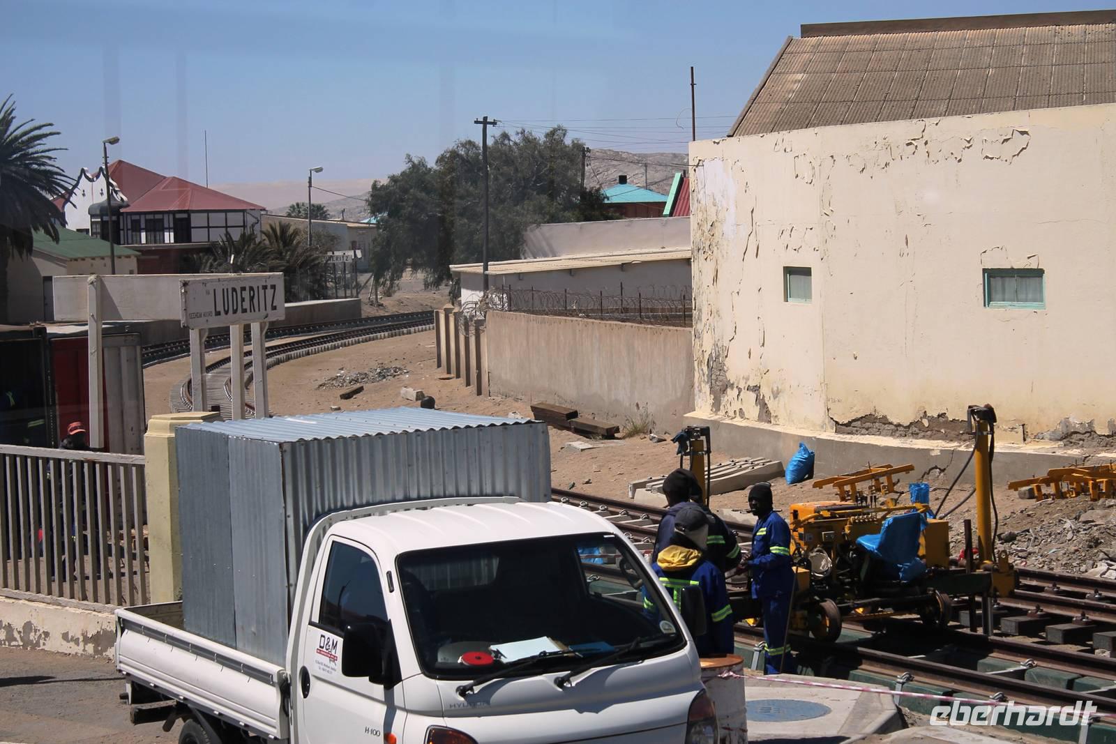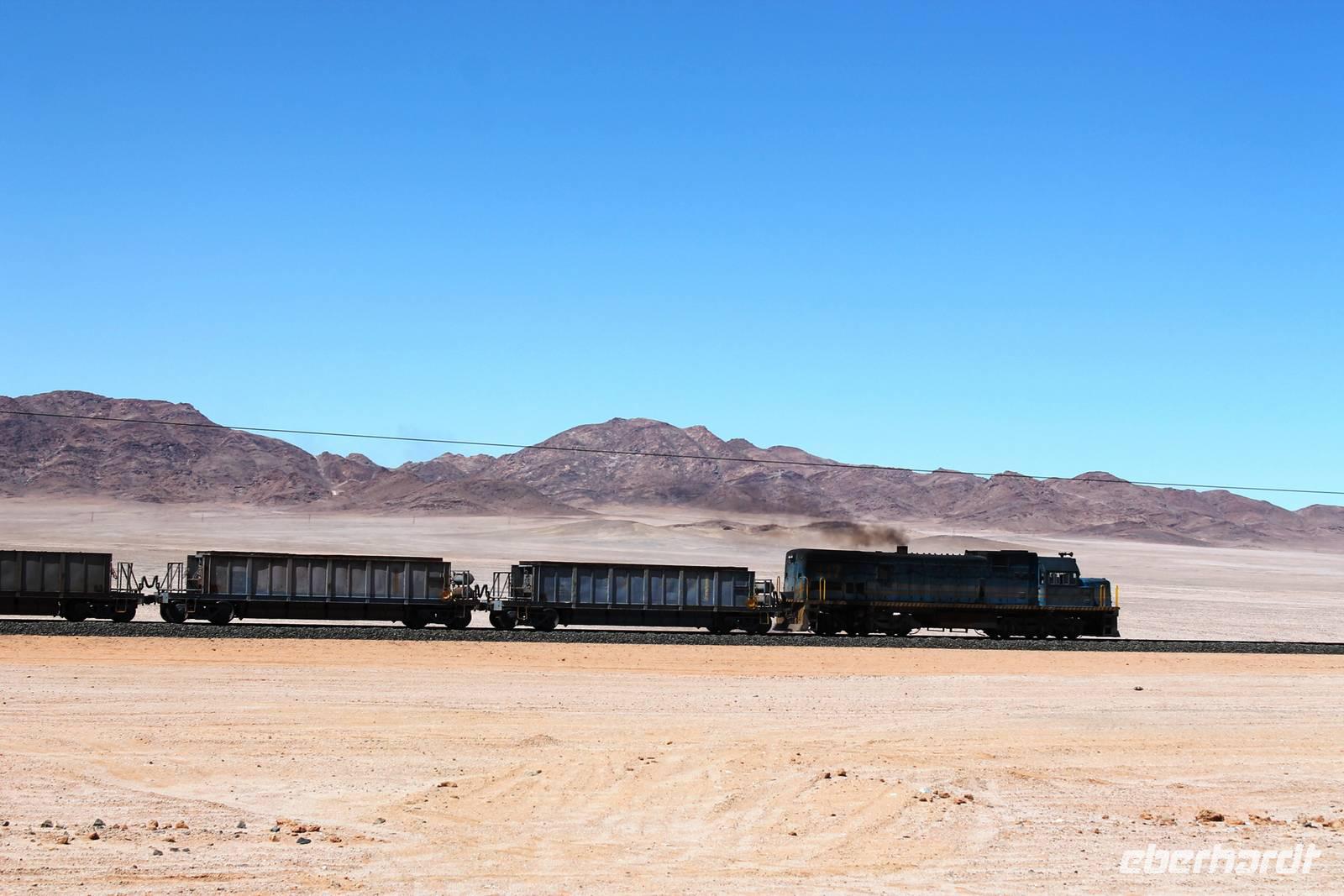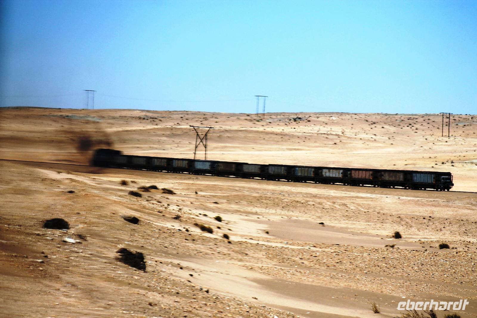 Unser heutiges Ziel war Lüderitz am Atlantik. Zunächst überquerten wir den trockenen Fis River und gelangten später nach Aus. Im beschaulichen Aus füllten wir unseren Tank auf und fuhren zum Stell-Dich-Ein am Garub-Wasserloch mit den Wildpferden. WOW, da war mal Betrieb in der Wüste. Wir hatten Glück: Pferde, Oryxe, Springböcke und Strausse versammelten sich in der Hitze der Sonne am Wasserloch. Auch wir gaben uns dem Müssiggang hin und schlemmten vom Picknick-Buffet vor einer einzigartigen Filmkulisse. Mit einem Glas Wein betrachteten wir das Treiben der Wildpferde in der Namib. Ein wunderbarer Anblick, der ein gewisses Gefühl von Freiheit vermittelte. Fasziniert und gestärkt fuhren wir weiter. Ein langer, schwarzer Asphaltstreifen bahnt sich seinen geraden Weg durch die Wüste, von Ost nach West. Zu beiden Seiten erstreckt sich eine karge, weite Landschaft, die nur durch ein paar Inselberge durchbrochen wird. Unsere Route führt parallel zur Eisenbahnlinie, die ständig von Wind und Sand im wahrsten Sinne verweht wird. Tiere sahen wir in der Mittagshitze kaum, aber dafür eine fahrende Eisenbahn. Juchu!!, es sollte nicht die letzte auf dieser Reise sein.