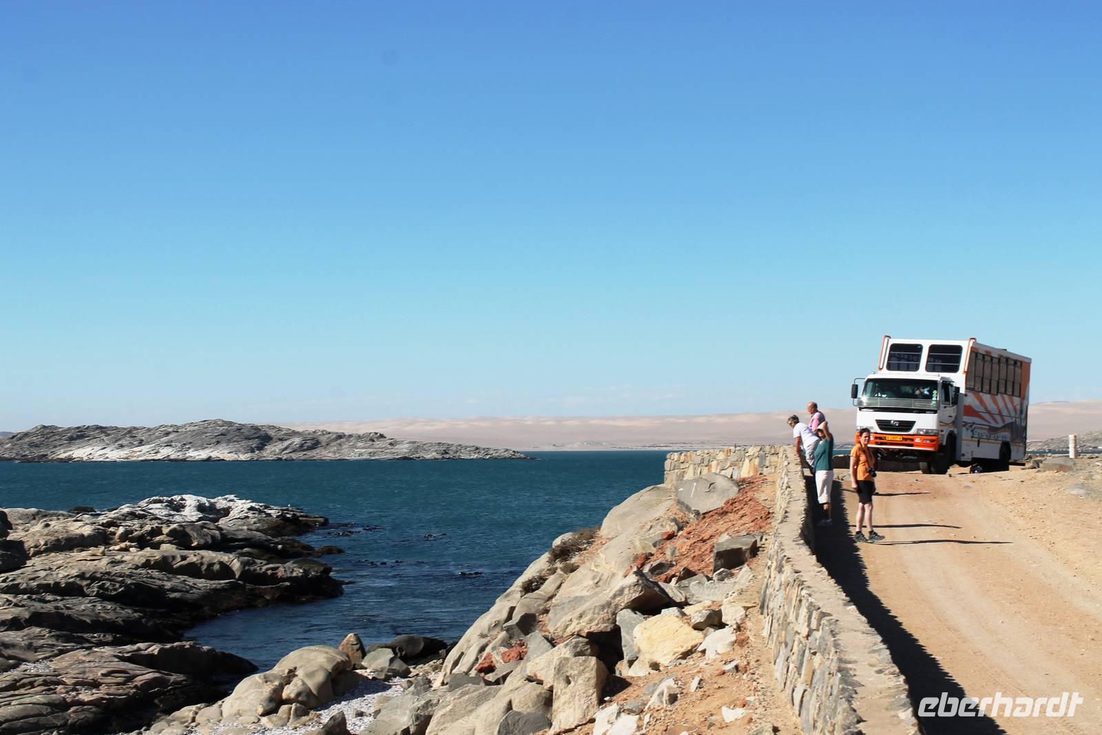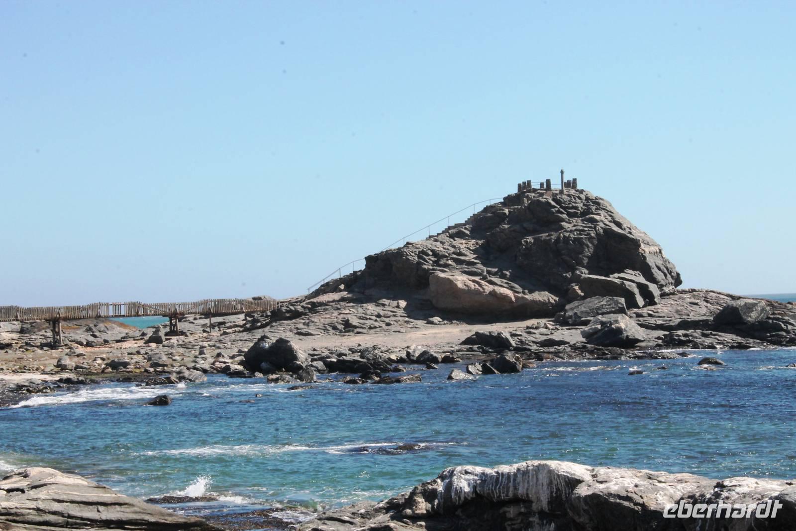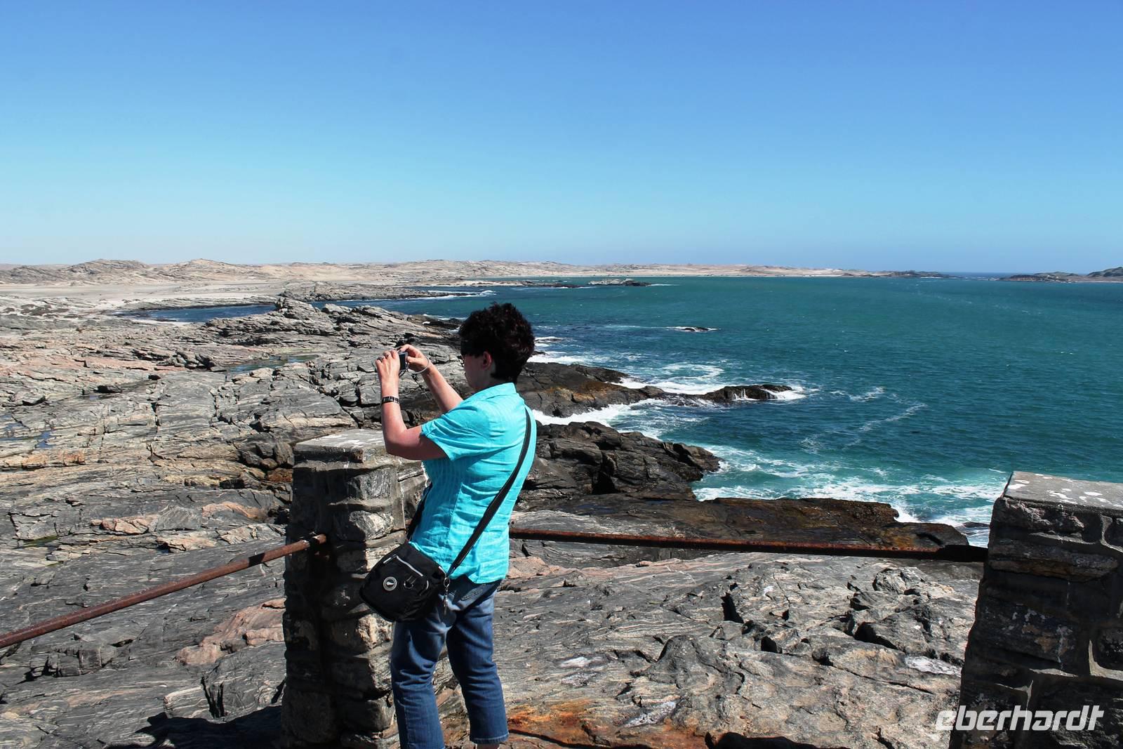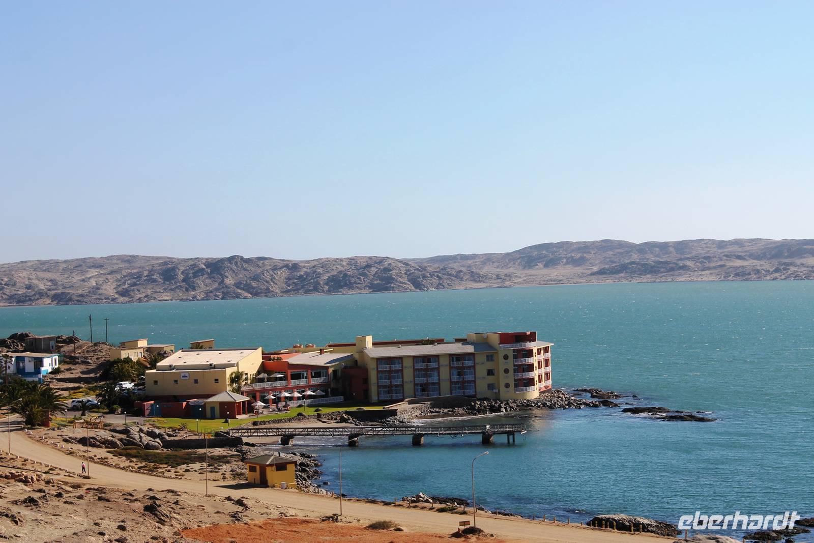 In Lüderitz angekommen unternahmen wir zunächst eine Buchtenrundfahrt, die uns zum Diaz-Point mit dem Diaz-Kreuz führt. Wir fuhren durch eine besonders karge Landschaft, vorbei an Salzfeldern, sahen Flamingos und immer wieder Hinweisschilder: Betreten verboten - Diamentensperrgebiet. Zum Diaz- Kreuz gingen wir über eine wacklige Brücke, die übrigens einige Tage nach uns in sich zusammen brach. An diesem Punkt landete im Jahr 1488 der portugisische Seefahrer Diaz bei seiner Erkundung des Seeweges nach dem Osten. Dem Diaz-Point ist im Meer eine kleine Insel mit einer Robbenkolonie vorgelagert. Bei herrlichstem Wetter, Sonnenschein und angenehmen Temperaturen lassen wir uns den Wind um die Nase wehen und genießen den Aufenthalt am Meer. Anschließend fuhren wir zur Haifisch-Insel nach Lüderitz, wo wir einen wunderbaren Blick auf Lüderitz hatten. Nach einer kleinen Rundfahrt durch das übersichtliche, farbenfrohe Lüderitz besichtigten wir die Felsenkirche, die als eines der Wahrzeichen der Stadt gilt. Das Nest-Hotel befindet sich direkt am Wasser und alle Zimmer haben Meerblick. Wir relaxten noch ein wenig beim Gin & Tonic auf der Terrasse, lauschten dem Meeresrauschen und beobachteten die Sky-Surfer. Da die Touristen in den letzten Jahren weniger wurden, suchte man Neues: Lüderitz gilt heute als Geheimtipp bei den Sky Surfern. Am Abend fuhren wir noch einmal an die Lüderitzer Waterfront, wo wir für das Abendessen im "Ritzis" Plätze reseriert hatten. Obwohl wir etwas länger auf die Speisen warteten, schmeckte es allen hervorragend und wir verlebten einen geselligen Abend, den einige noch an der Bar des Hotels ausklingen liessen.