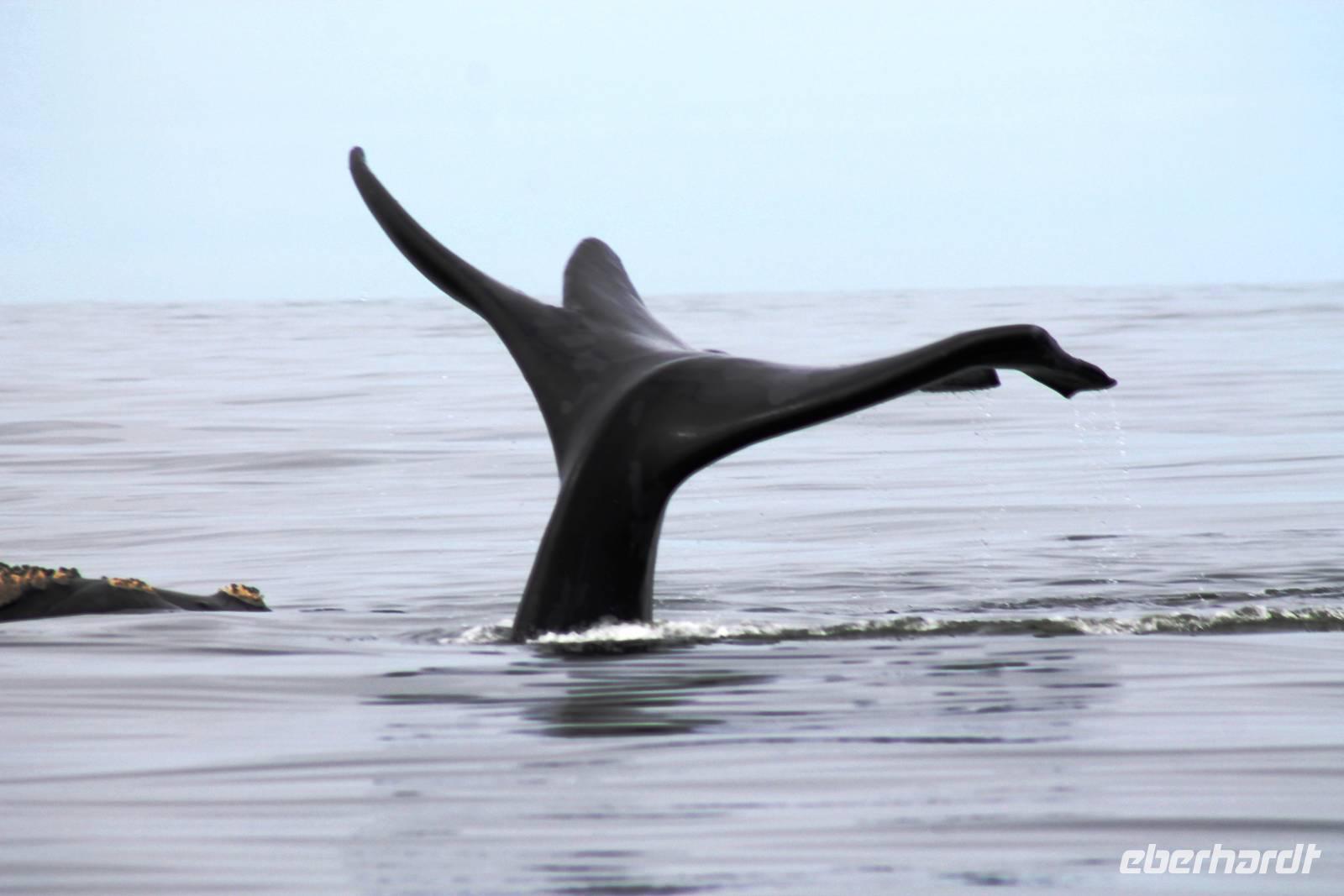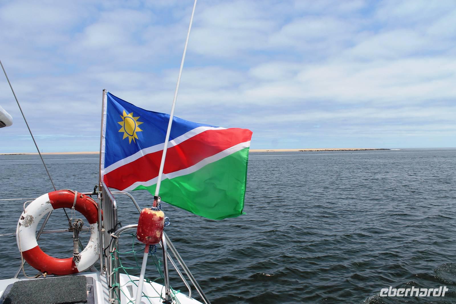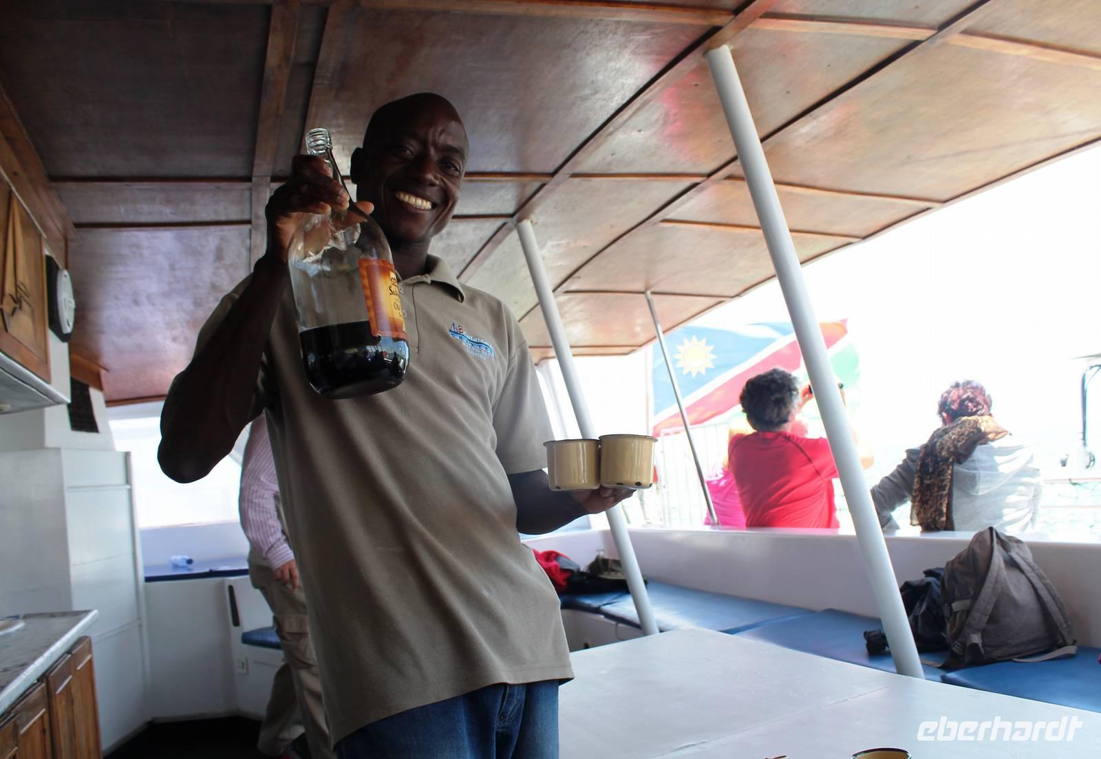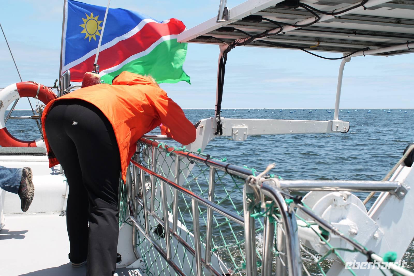 Der nächste Tag stand im Zeichen von Walvis Bay. Am Vormittag unternahmen alle Gäste eine Ausfahrt mit dem Catamaran durch die Lagune von Walvis Bay inklusive "blinder" Passagiere an Bord. Mit viel Witz, Charme und Humor erzählte uns Mike Wissenwertes über die Bucht und seine "Bewohner". Auch Robbe "Google" kam an Bord und forderte ihr Frühstück ein. Mike erhielt bei der Fütterung die Unterstützung von Gästen. Da wir aber frischen Fisch nicht so mögen, wurden wir mit good "Old Brown" Sherry bewirtet, den wir aus "Alibi-Kaffeetassen" (es war noch Vormittag) tranken. Auch die Pelikane Nami und Bia statteten uns einen Besuch ab und forderten Annetts Platz am Bug des Schiffes ein. Vorbei an der Austernfarm schipperten wir zur Halbinsel, auf deren Spitze der schwarz-weiße Leuchtturm steht. Hier haben es sich Robbenkolonien bequem gemacht. Man sieht, dass sich die niedlichen Ohrenrobben sehr wohl fühlen. Und dann: Da, Da, Da!!! - Benguela Delfine, eben "Da-Da-Delfine", wie Mike erklärte. Und nun das Highlight, Wale! WOW! Ich war zwar schon einige Male da, aber das erste Mal, dass mir hier Wale vorbei schwimmen. Den einen tauften wir Franzi, wegen seiner markanten Schwanzflosse. Nun ließen Mike und seine Besatzung die Korken knallen und wir stießen mit südafrikanischen Sekt auf diesen perfekten Vormittag an. Anschließend schlemmten wir vom köstlichen Buffet mit Austern, Meeresfrüchten, Fisch, Fleisch und Süßem. Es war im wahrsten Sinne des Wortes ein „tierisch lekka" Ausflug. Wir machten die Bekanntschaft mit zutraulichen Ohrenrobben, Pelikanen, Komoranen, riesigen Möwen, Benguela Delphinen und Walen. Vielen lieben Dank wieder an die Crew und den extra Sherry für die Mädchenrunde.
