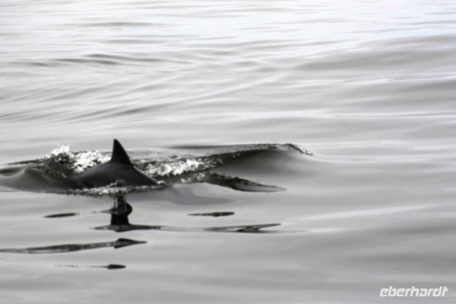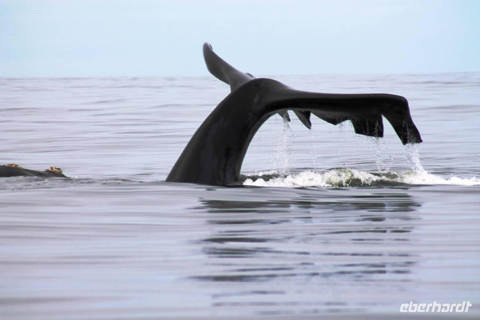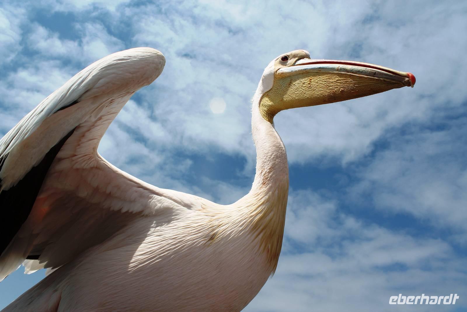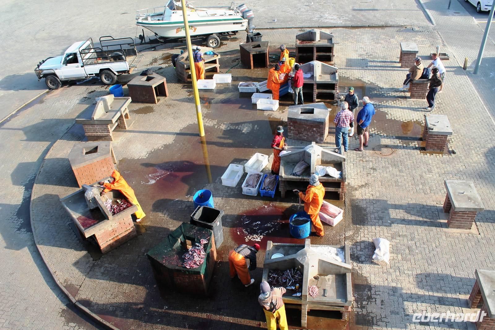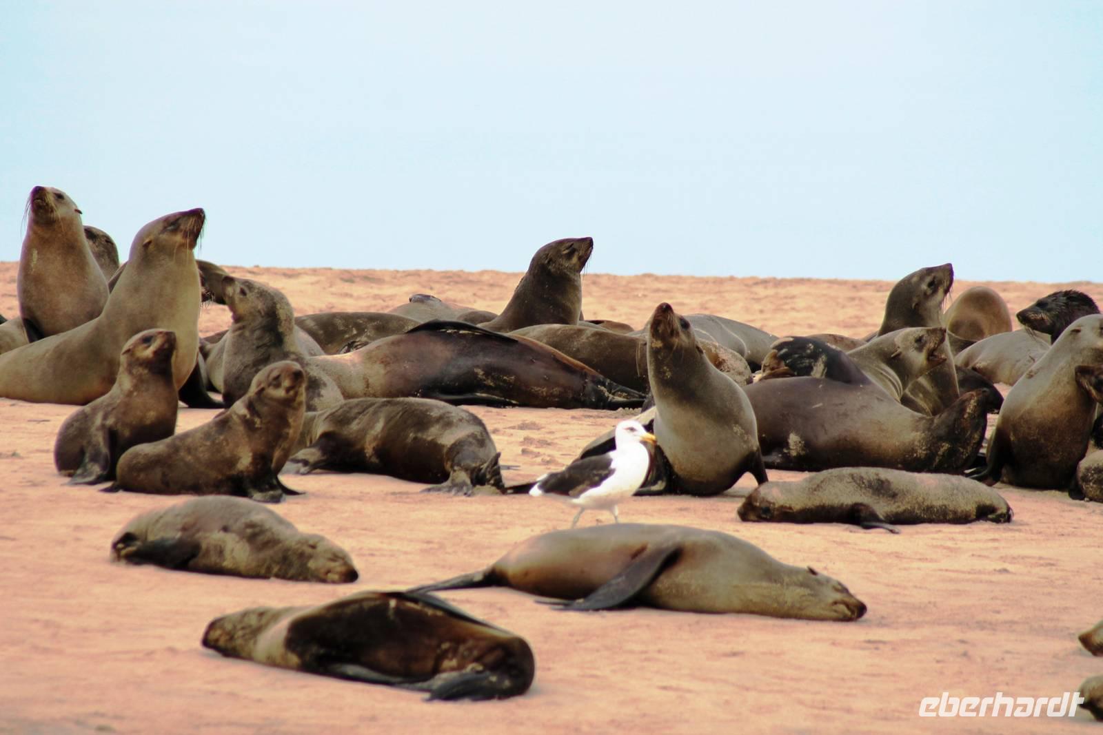 Der nächste Tag stand im Zeichen von Walvis Bay. Am Vormittag unternahmen alle Gäste eine Ausfahrt mit dem Catamaran durch die Lagune von Walvis Bay inklusive "blinder" Passagiere an Bord. Mit viel Witz, Charme und Humor erzählte uns Mike Wissenwertes über die Bucht und seine "Bewohner". Auch Robbe "Google" kam an Bord und forderte ihr Frühstück ein. Mike erhielt bei der Fütterung die Unterstützung von Gästen. Da wir aber frischen Fisch nicht so mögen, wurden wir mit good "Old Brown" Sherry bewirtet, den wir aus "Alibi-Kaffeetassen" (es war noch Vormittag) tranken. Auch die Pelikane Nami und Bia statteten uns einen Besuch ab und forderten Annetts Platz am Bug des Schiffes ein. Vorbei an der Austernfarm schipperten wir zur Halbinsel, auf deren Spitze der schwarz-weiße Leuchtturm steht. Hier haben es sich Robbenkolonien bequem gemacht. Man sieht, dass sich die niedlichen Ohrenrobben sehr wohl fühlen. Und dann: Da, Da, Da!!! - Benguela Delfine, eben "Da-Da-Delfine", wie Mike erklärte. Und nun das Highlight, Wale! WOW! Ich war zwar schon einige Male da, aber das erste Mal, dass mir hier Wale vorbei schwimmen. Den einen tauften wir Franzi, wegen seiner markanten Schwanzflosse. Nun ließen Mike und seine Besatzung die Korken knallen und wir stießen mit südafrikanischen Sekt auf diesen perfekten Vormittag an. Anschließend schlemmten wir vom köstlichen Buffet mit Austern, Meeresfrüchten, Fisch, Fleisch und Süßem. Es war im wahrsten Sinne des Wortes ein „tierisch lekka" Ausflug. Wir machten die Bekanntschaft mit zutraulichen Ohrenrobben, Pelikanen, Komoranen, riesigen Möwen, Benguela Delphinen und Walen. Vielen lieben Dank wieder an die Crew und den extra Sherry für die Mädchenrunde.