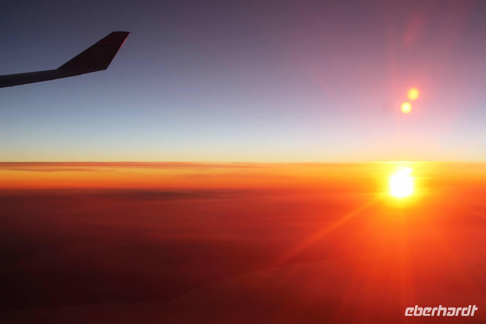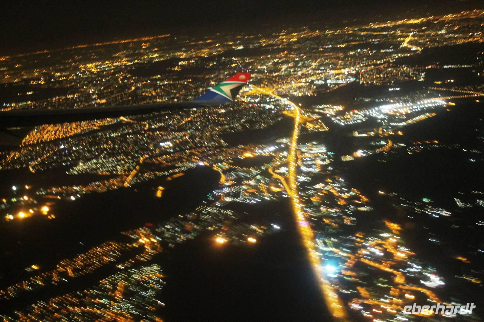Am Nachmittag stand ich, Eberhardt-Reisebegleiterin sehr einsam am Flughafen in Dresden und wartete. Durch Ferienbeginn und Bahnstreik steckten unsere 5 Reisegäste ab Dresden im Stau! Nun begann das Bangen. Während der Eberhardt-Notdienst die Transfers koordinierte, versuchte ich die LH-Mitarbeiter am Check In zu bezirzen. Durch den Online-Check-In am Vorabend hatte ich schon alle Bordkarten und so ging es dann rasend schnell: Sicherheitskontrolle und ab in den Flieger. Ich war diesmal die letzte, da meine Kameratasche dem obligatorischen Test unterzogen wurde (warum immer ich?). Nach dieser Aufregung fielen wir auf unsere Plätze im Flieger. Ein Gläschen Sekt baute den erlebten Stress schnell ab, zumal die nette Stewardess uns animierte, keine Restbestände in der eigens für uns geöffneten Flasche zurück zu lassen. In München trafen wir auf 8 weitere Reisegäste, die von Leipzig geflogen waren. Komplett bestiegen wir den Flieger, der uns über Nacht nach Johannesburg brachte. Die Wartezeit am nächsten Morgen auf unseren Weiterflug nach Windhoek verbrachten wir im Flughafen Johannesburg, tauschten günstig Geld, verkosteten diverse Flüssigkeiten und erfreuten unseren Gaumen mit einem leckeren Käsekuchen.