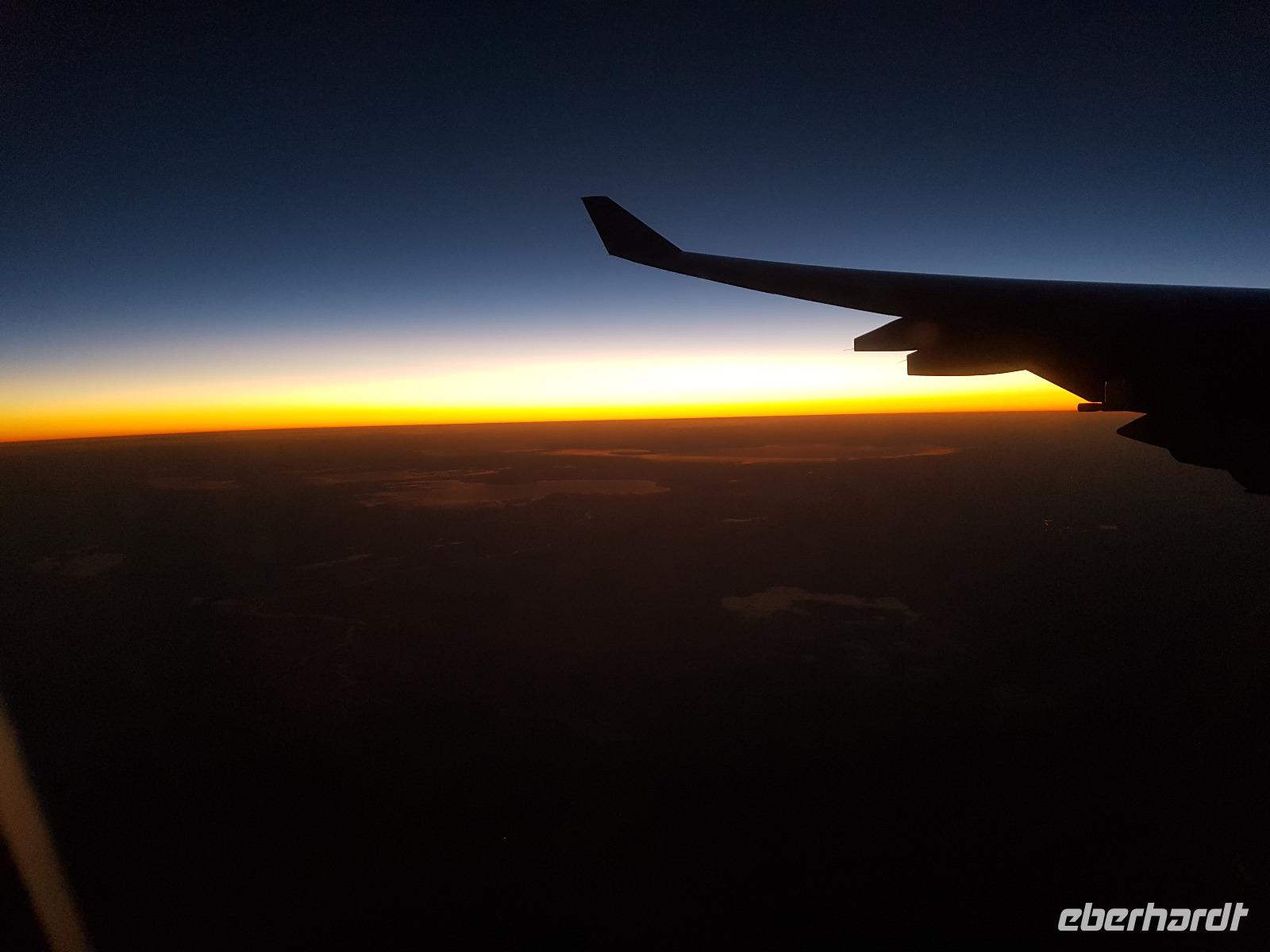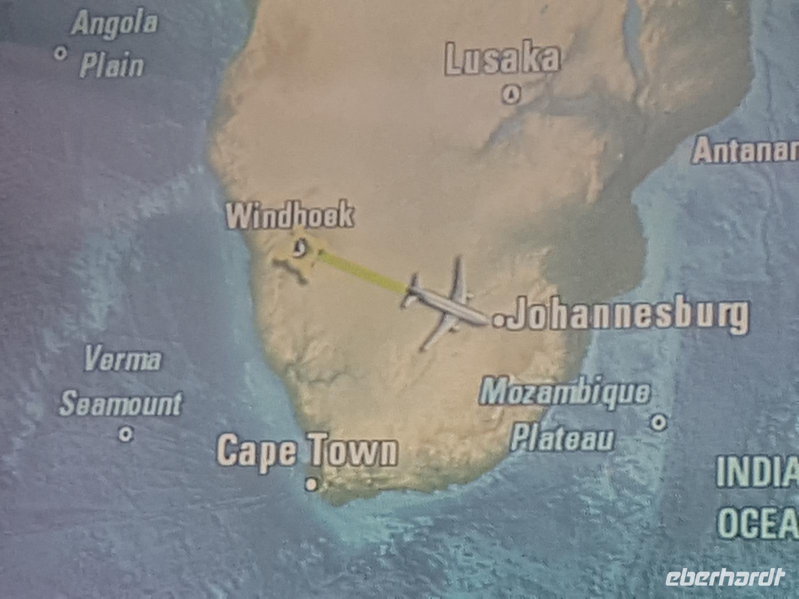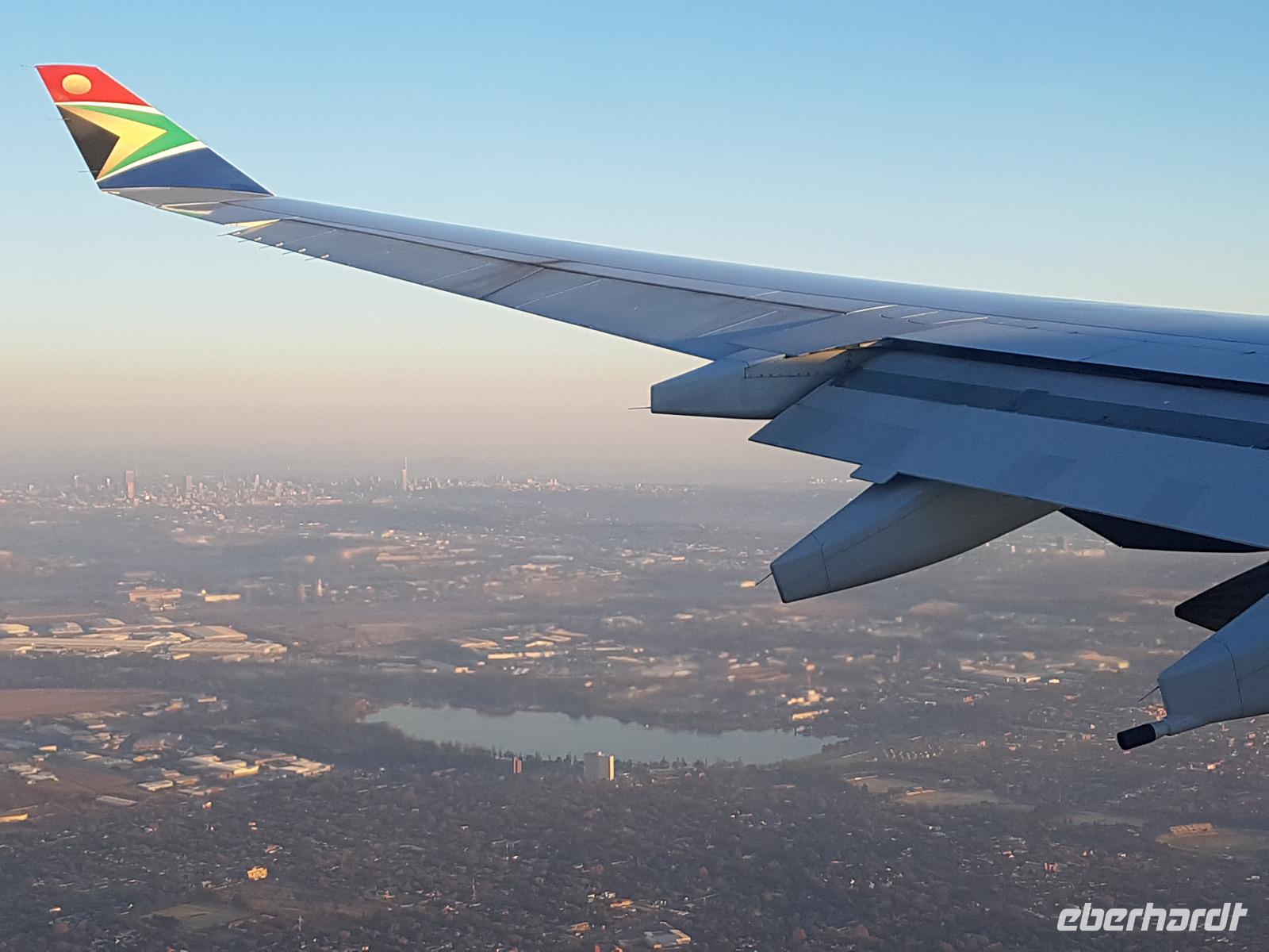 Ein Traum geht heute in Erfüllung. Einige von uns wurden von zu Hause abgeholt und andere kamen oder parkten ihr Auto selbst am Flughafen Dresden, wo sich 8 Gäste plus Benjamin mit Freude trafen und gemeinsam nach Frankfurt flogen . Dort kamen noch 4 Gäste aus Leipzig dazu und so waren wir alle Mann an Bord. 12 + 1 =13. Acht Gäste kannte ich schon von anderen Reisen wie Island, Venezuela, Barcelona oder Andalusien und es war wieder eine Ehre für mich, sie begleiten zu dürfen. Mit einem Airbus 340-600 flogen wir mit Southafrican Airlines via Johannesburg nach Windhoek. Es war ein ruhiger Nachtflug und viele von uns konnten einigermaßen schlafen. Von oben sahen wir unseren ersten afrikanischen Sonnenaufgang und bei der Landung konnte man die Hochhäuser von Johannesburg fotografieren.
