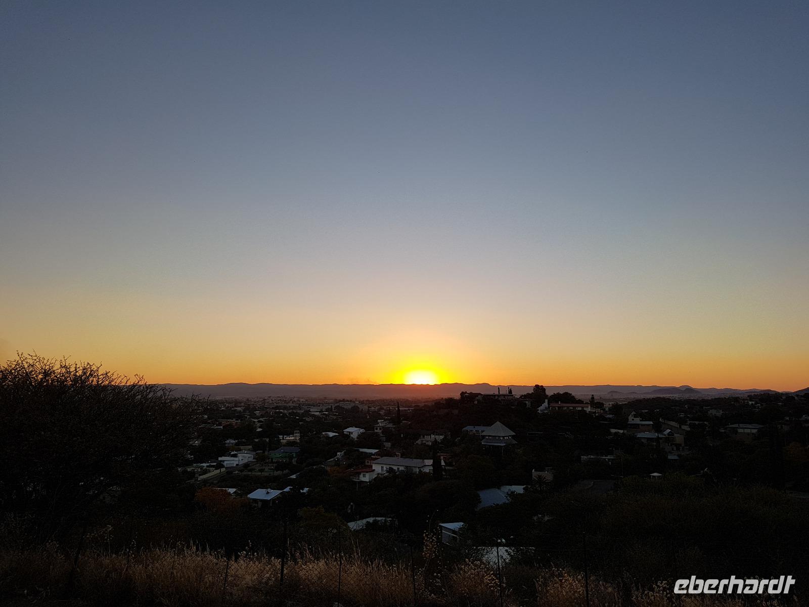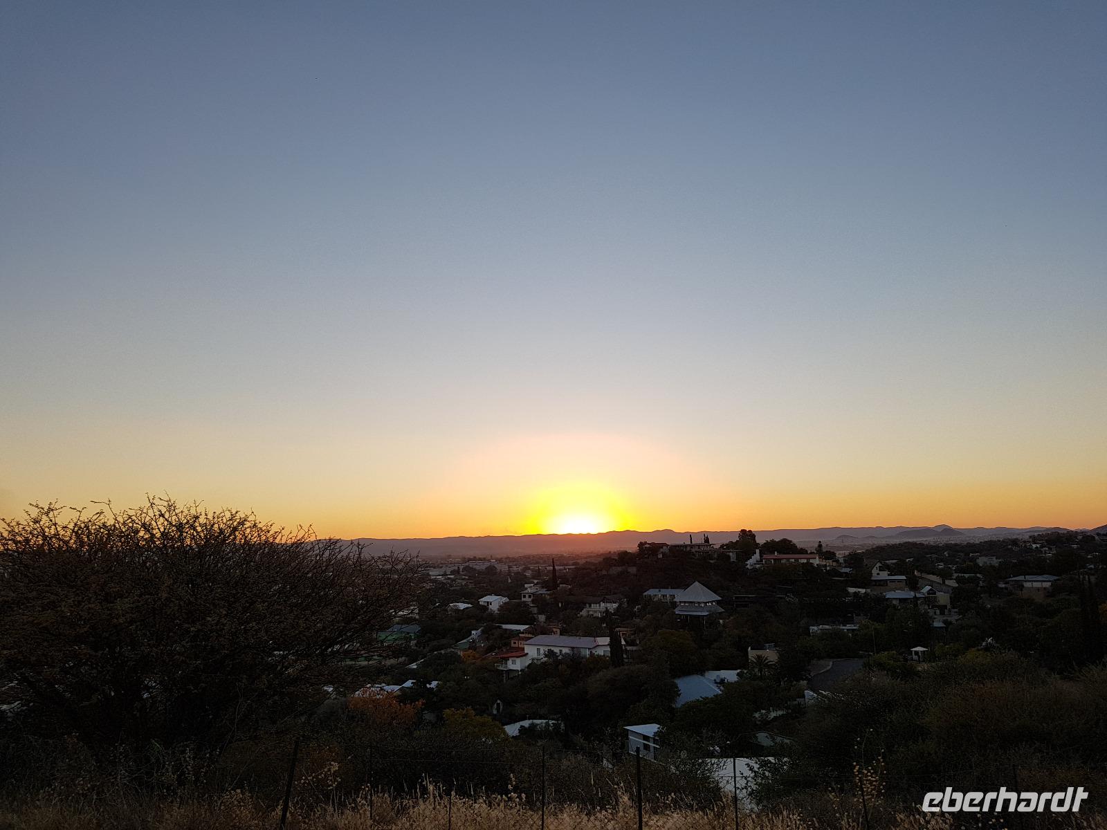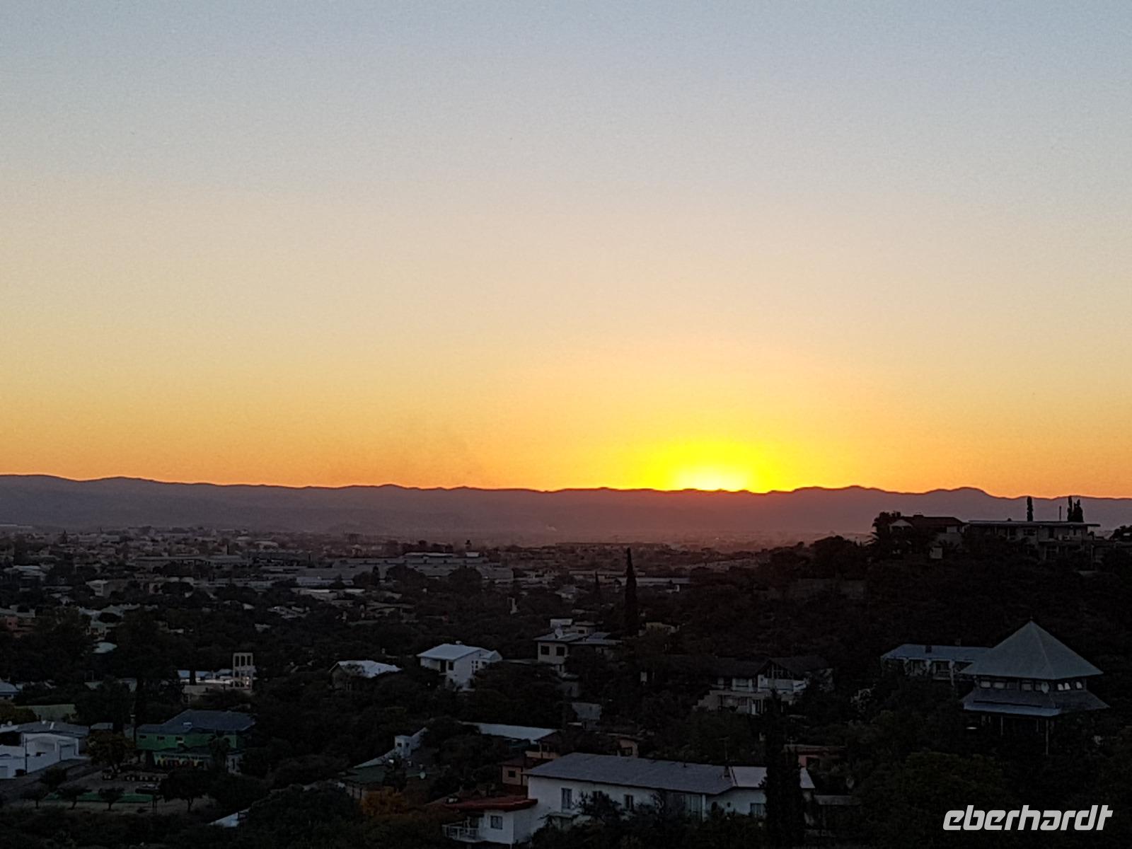 Ein Traum geht heute in Erfüllung. Einige von uns wurden von zu Hause abgeholt und andere kamen oder parkten ihr Auto selbst am Flughafen Dresden, wo sich 8 Gäste plus Benjamin mit Freude trafen und gemeinsam nach Frankfurt flogen . Dort kamen noch 4 Gäste aus Leipzig dazu und so waren wir alle Mann an Bord. 12 + 1 =13. Acht Gäste kannte ich schon von anderen Reisen wie Island, Venezuela, Barcelona oder Andalusien und es war wieder eine Ehre für mich, sie begleiten zu dürfen. Mit einem Airbus 340-600 flogen wir mit Southafrican Airlines via Johannesburg nach Windhoek. Es war ein ruhiger Nachtflug und viele von uns konnten einigermaßen schlafen. Von oben sahen wir unseren ersten afrikanischen Sonnenaufgang und bei der Landung konnte man die Hochhäuser von Johannesburg fotografieren.