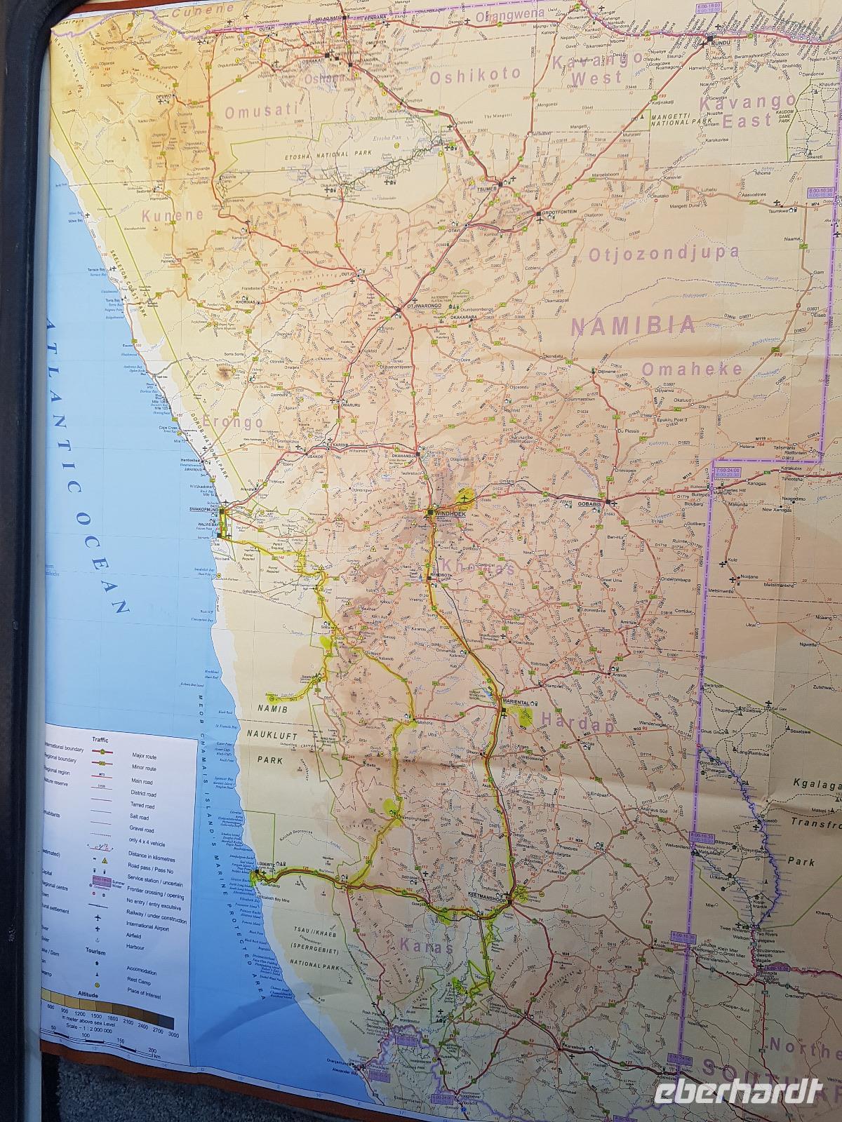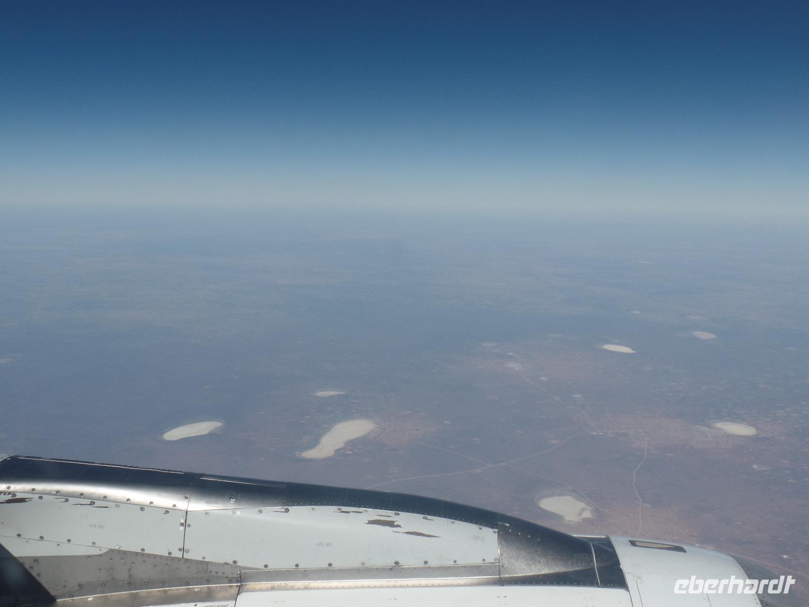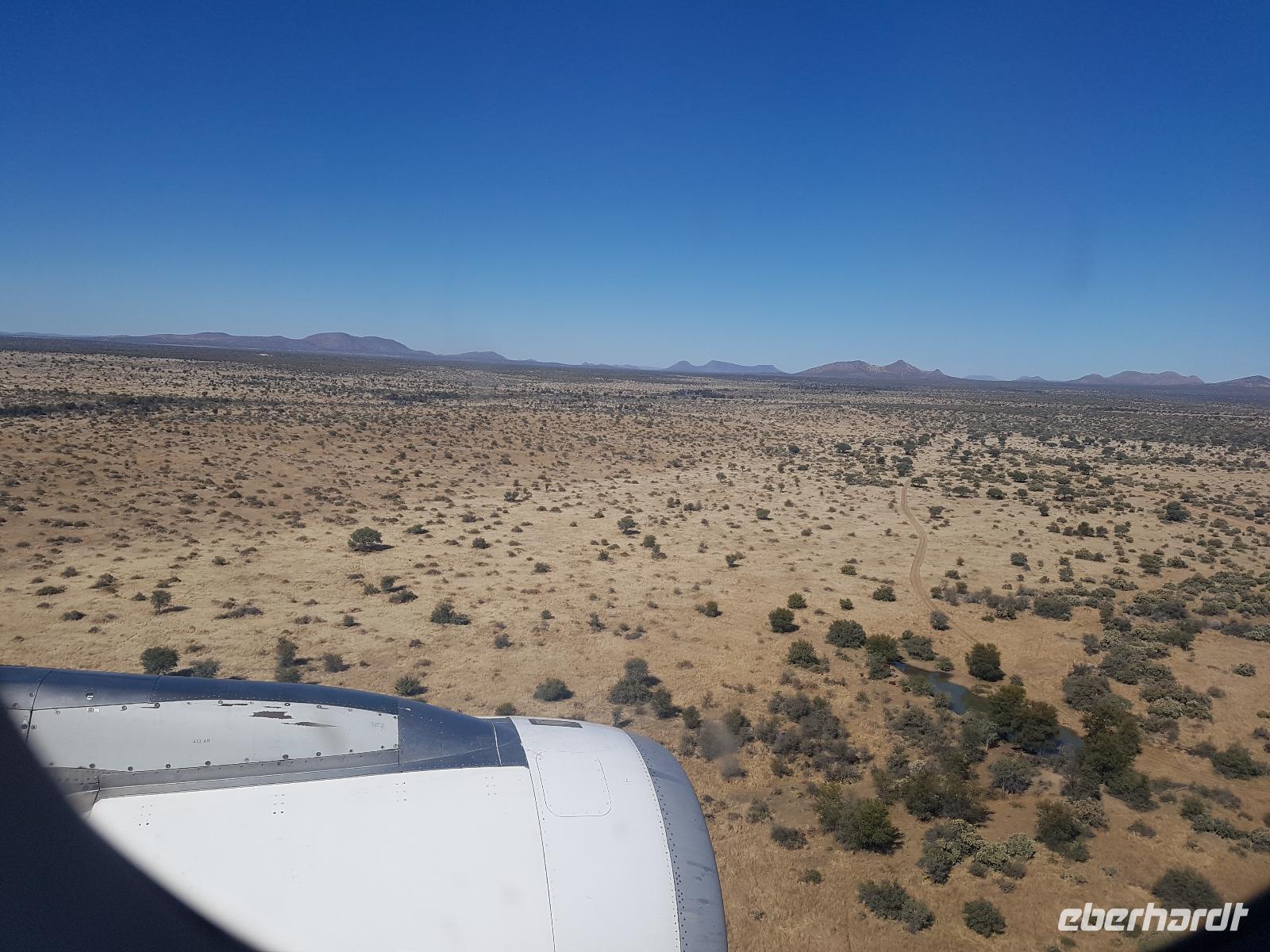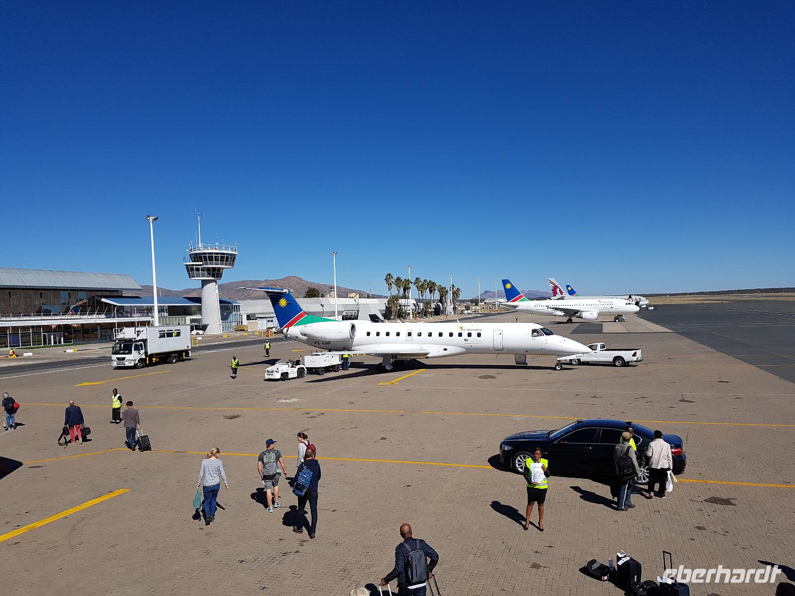 Immer Richtung Transit machten wir die Sicherheitskontrolle durch und bekamen einen Stempel von Südafrika sogar für den Reisepass?? Wir flogen noch mal weniger als 2 Stunden nach Windhoek und bei der Landung konnten wir sehen warum es Windhoek hieß, da es plötzlich windig wurde. Herrlich. Wir gingen zu Fuß von der Maschine bis zum Terminal und da Benjamin schon im Flieger die notwendigen Formulare für alle Gäste bereits ausgefüllt hatte, konnten wir easy und schnell die Reisepasskontrolle erledigen.