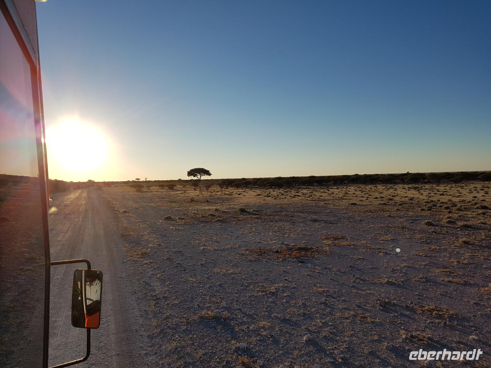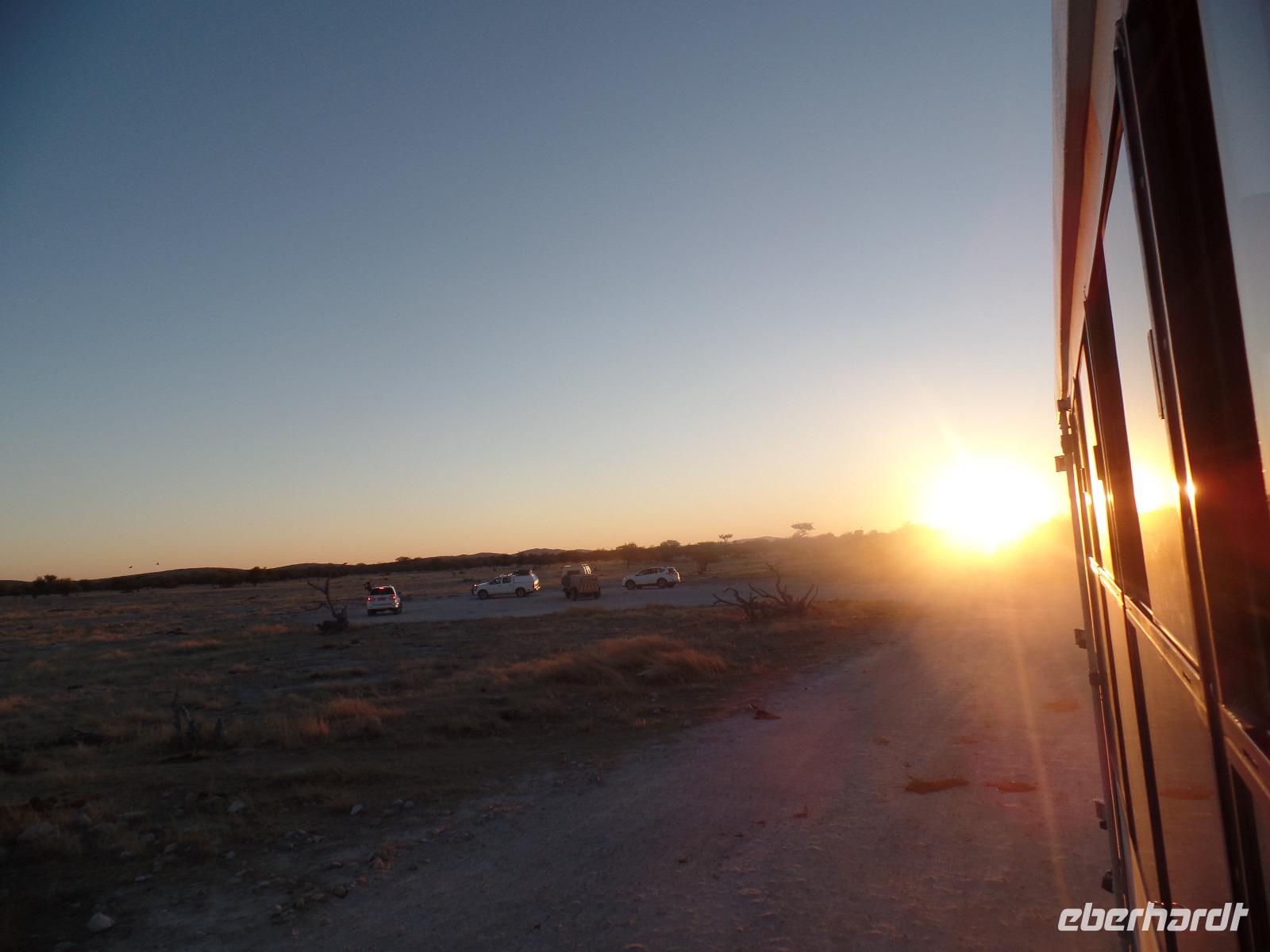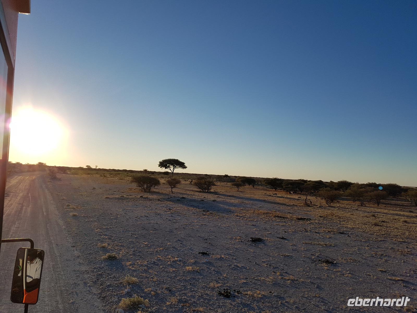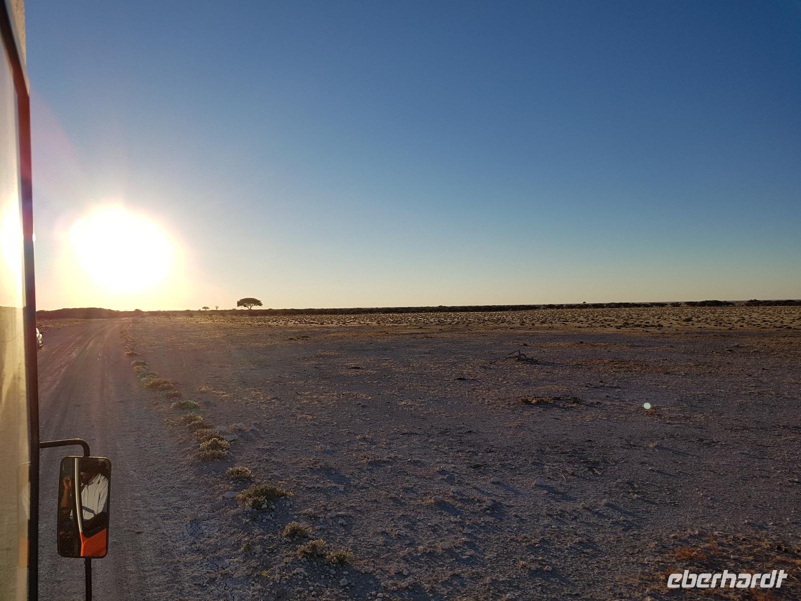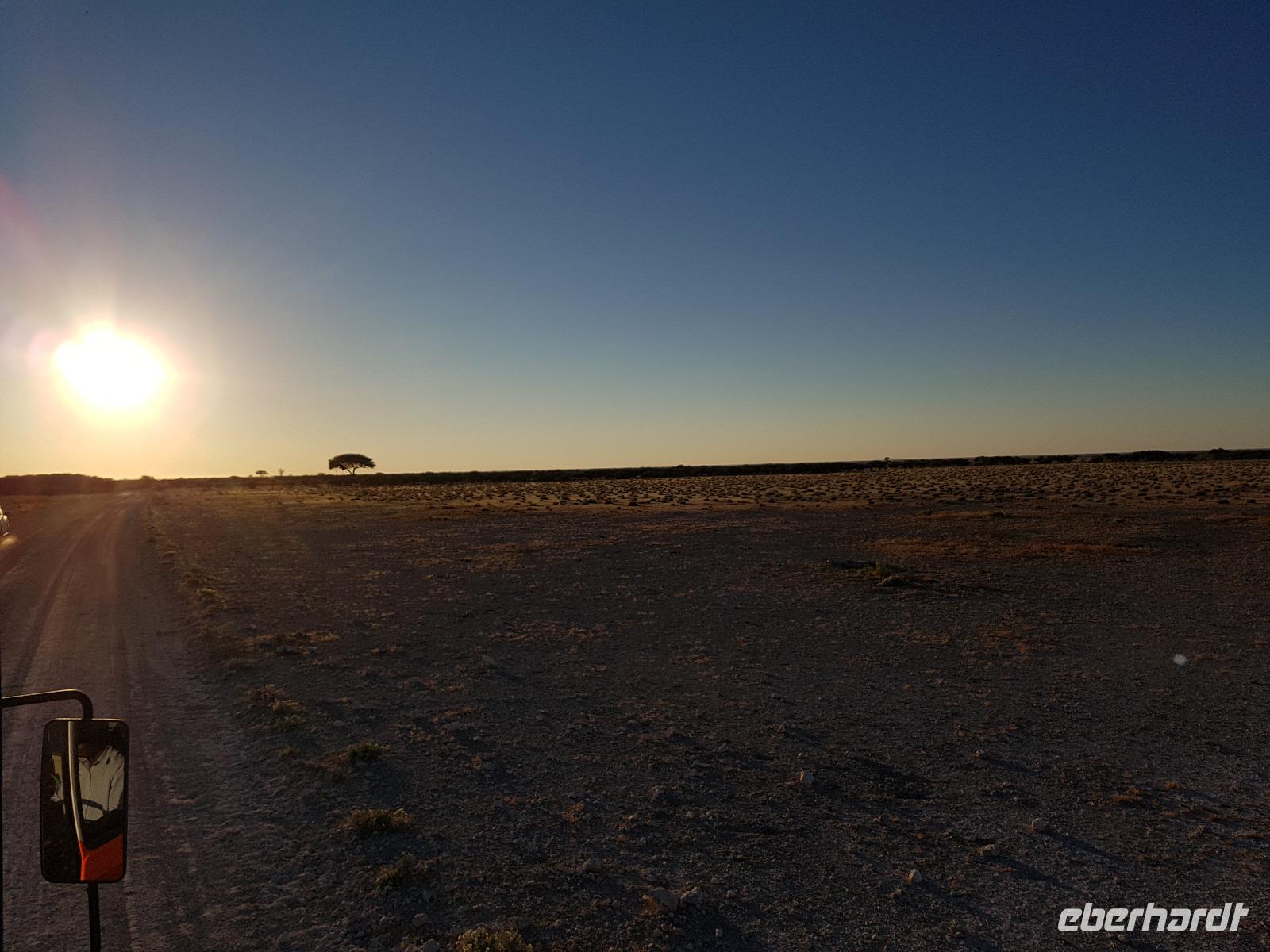 Fast noch in der Dunkelheit gingen wir zum Frühstück, da wir den Sonnenaufgang erleben wollten. Bereits am frühen Morgen starten wir zur ganztägigen Pirschfahrt durch den Etosha Nationalpark. Auf unserem „Safari-Truck" sitzen wir angenehm erhöht, zum Fotografieren der einzigartigen Tierwelt und wie immer konnten wir die Fenster öffnen, um jeder Zeit Fotos machen zu können. Unterwegs beobachten wir wie gestern riesige Zebra- und Springbockherden, die durch die Savanne ziehen.